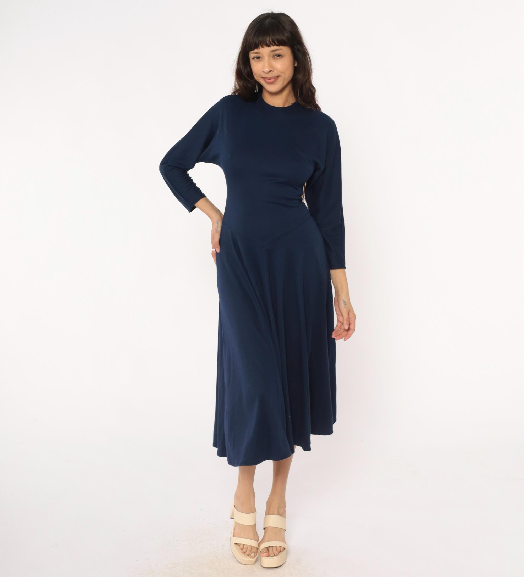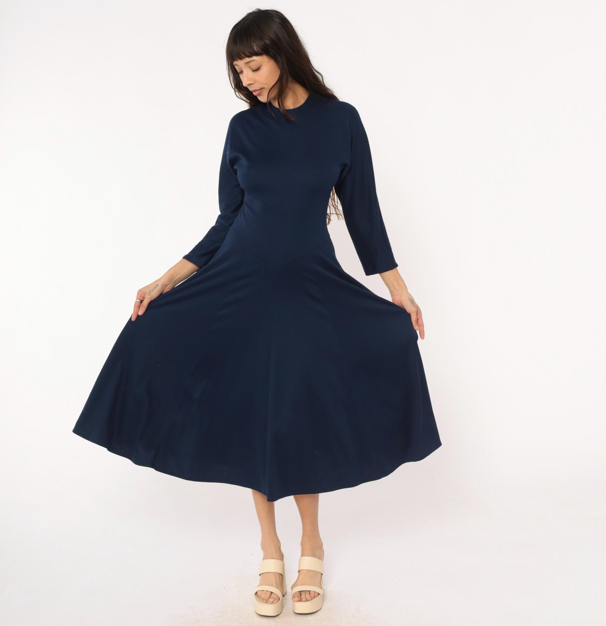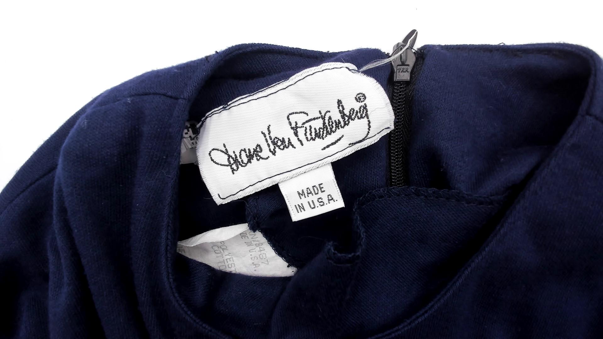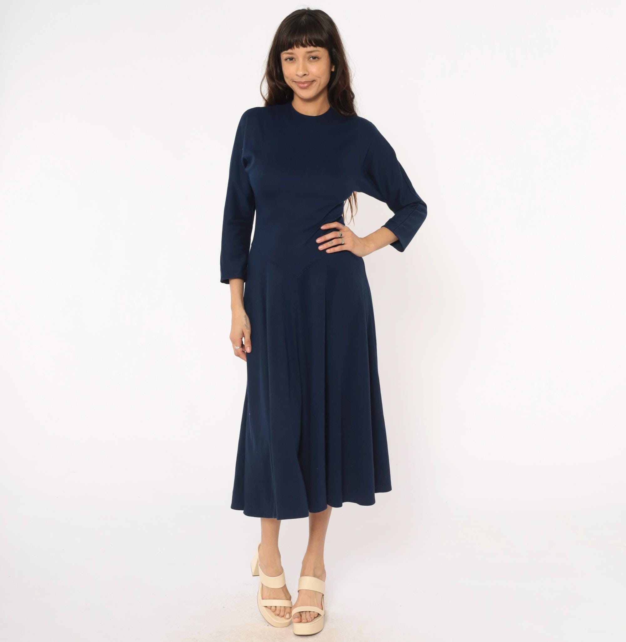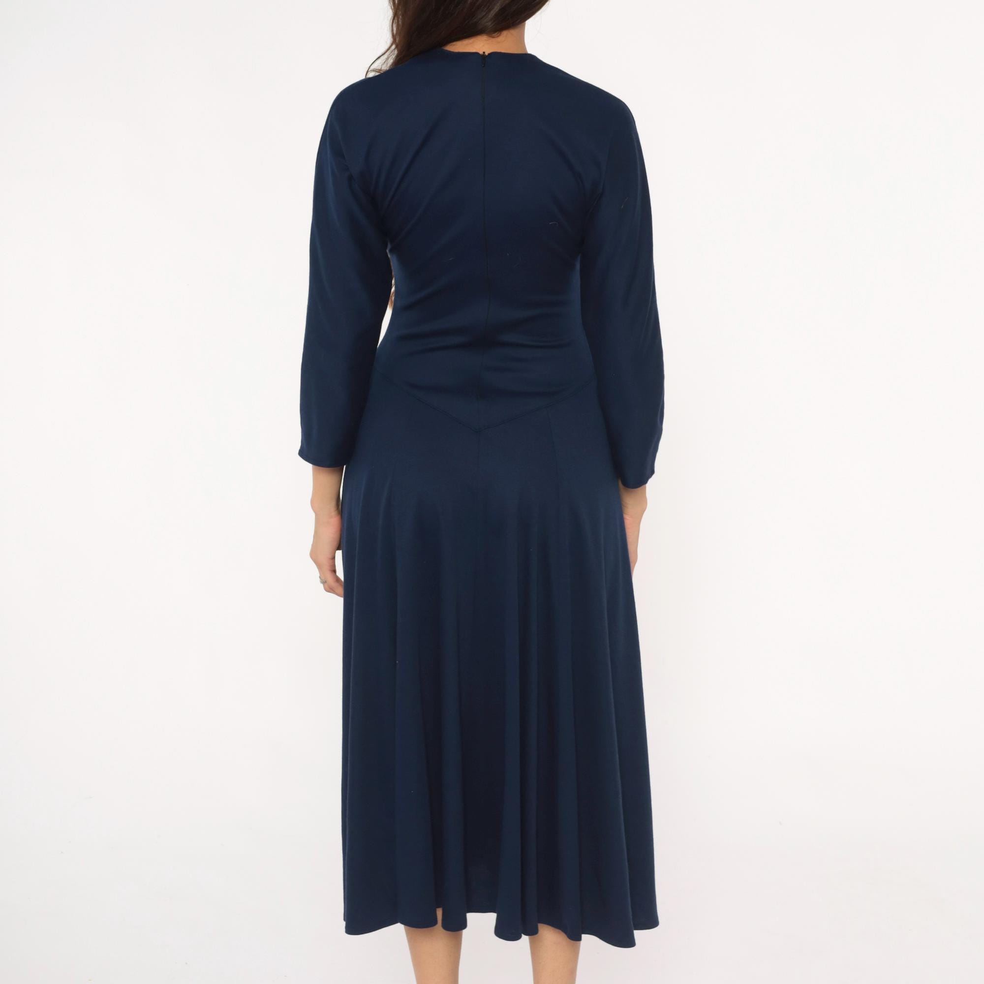 80s navy blue midi dress from Diane von Furstenberg with crew neckline and long sleeves. Fitted bodice with A-line skirt, invisible back zipper closure.
