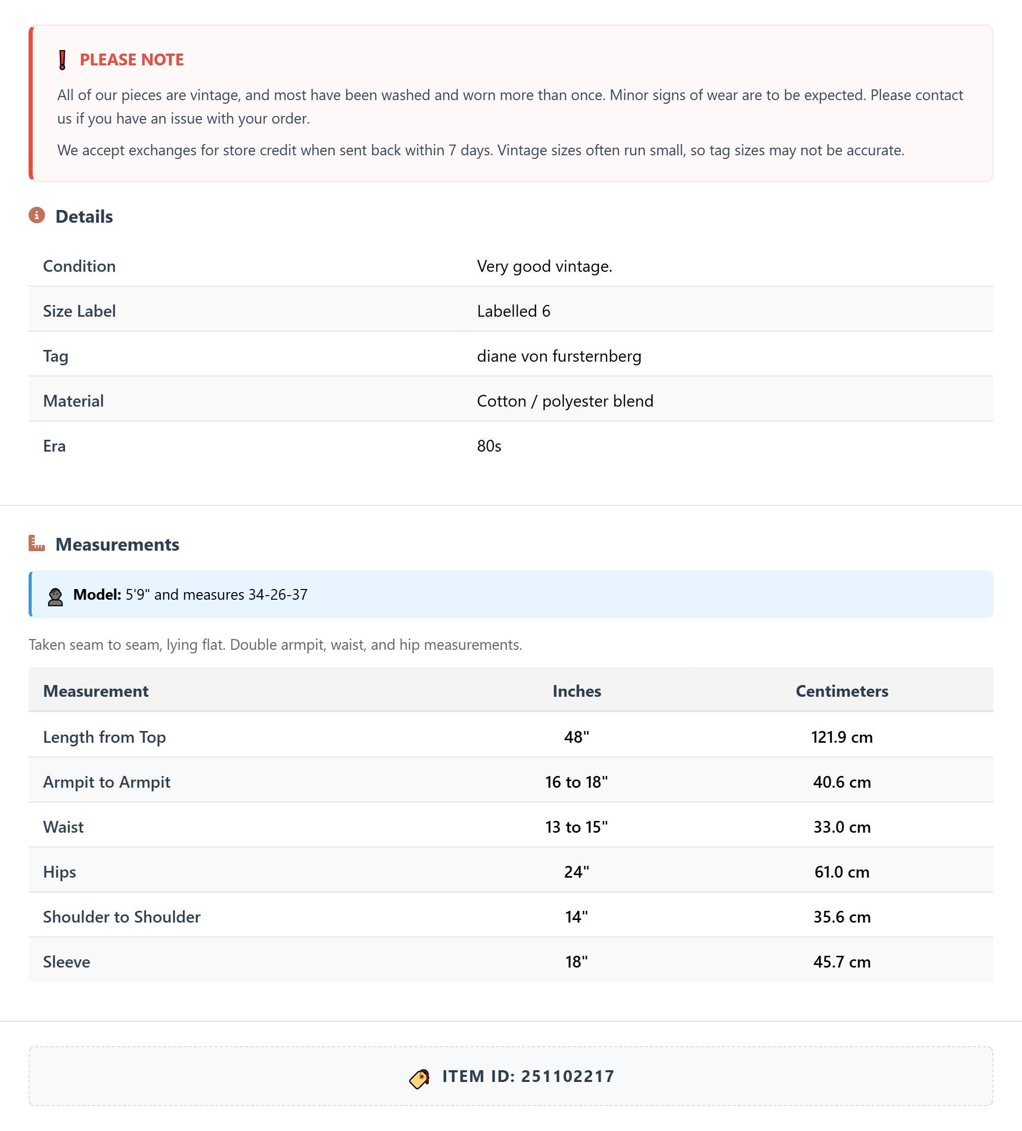 All of our pieces are vintage, and most have been washed and worn more than once. Minor signs of wear are to be expected. Please contact us if you have an issue with your order. We accept exchanges for store credit when sent back within 7 days.