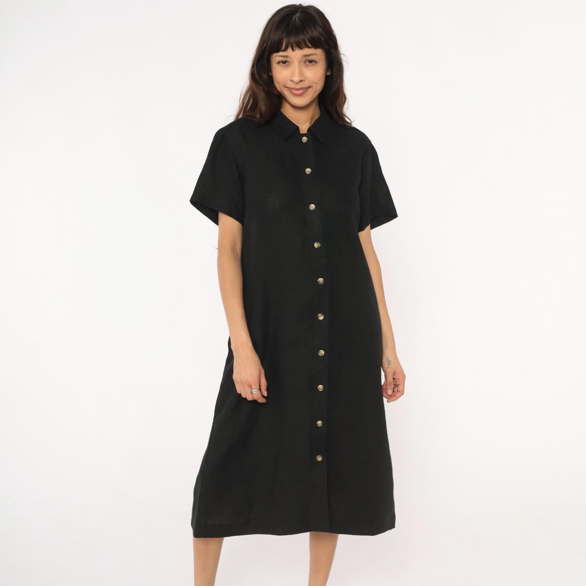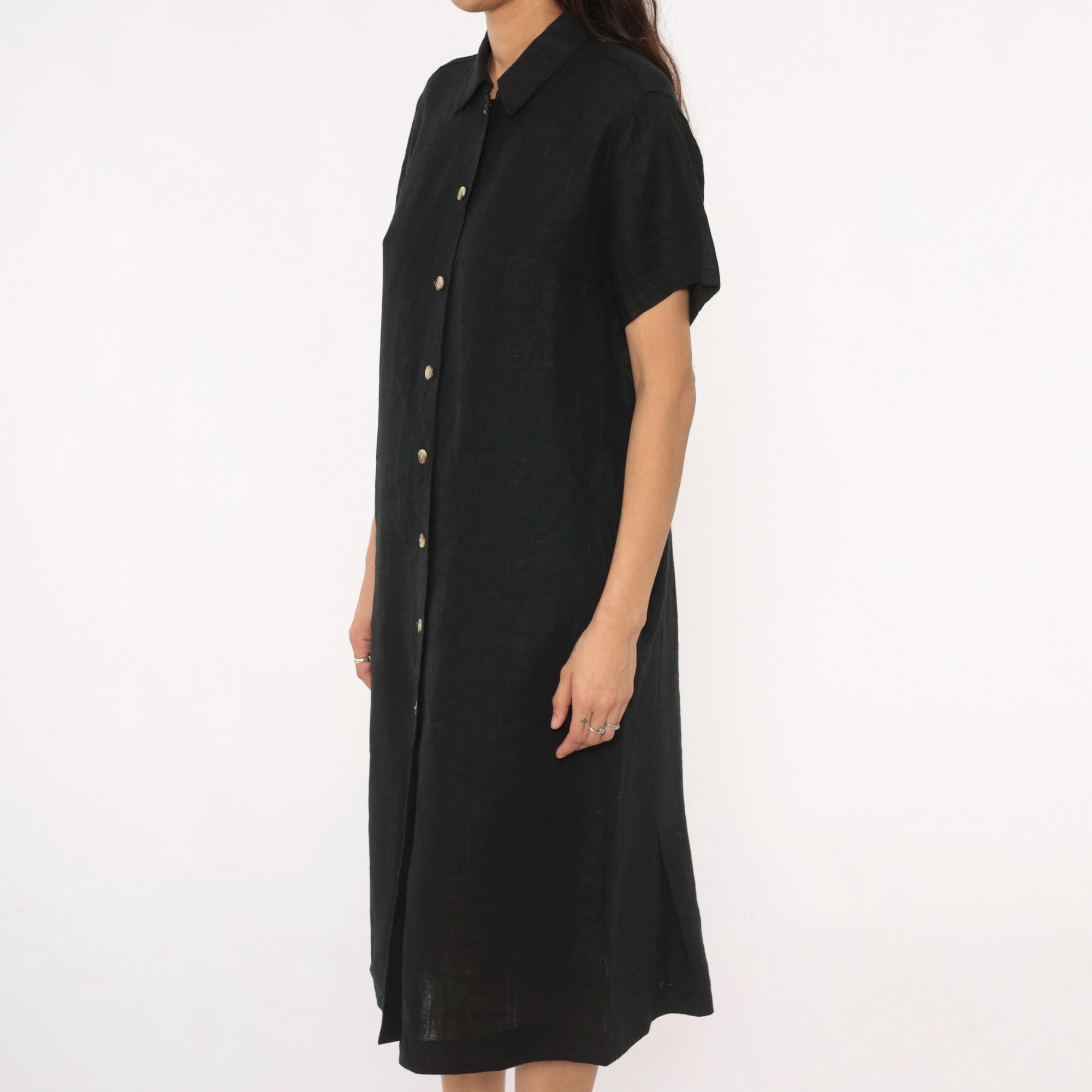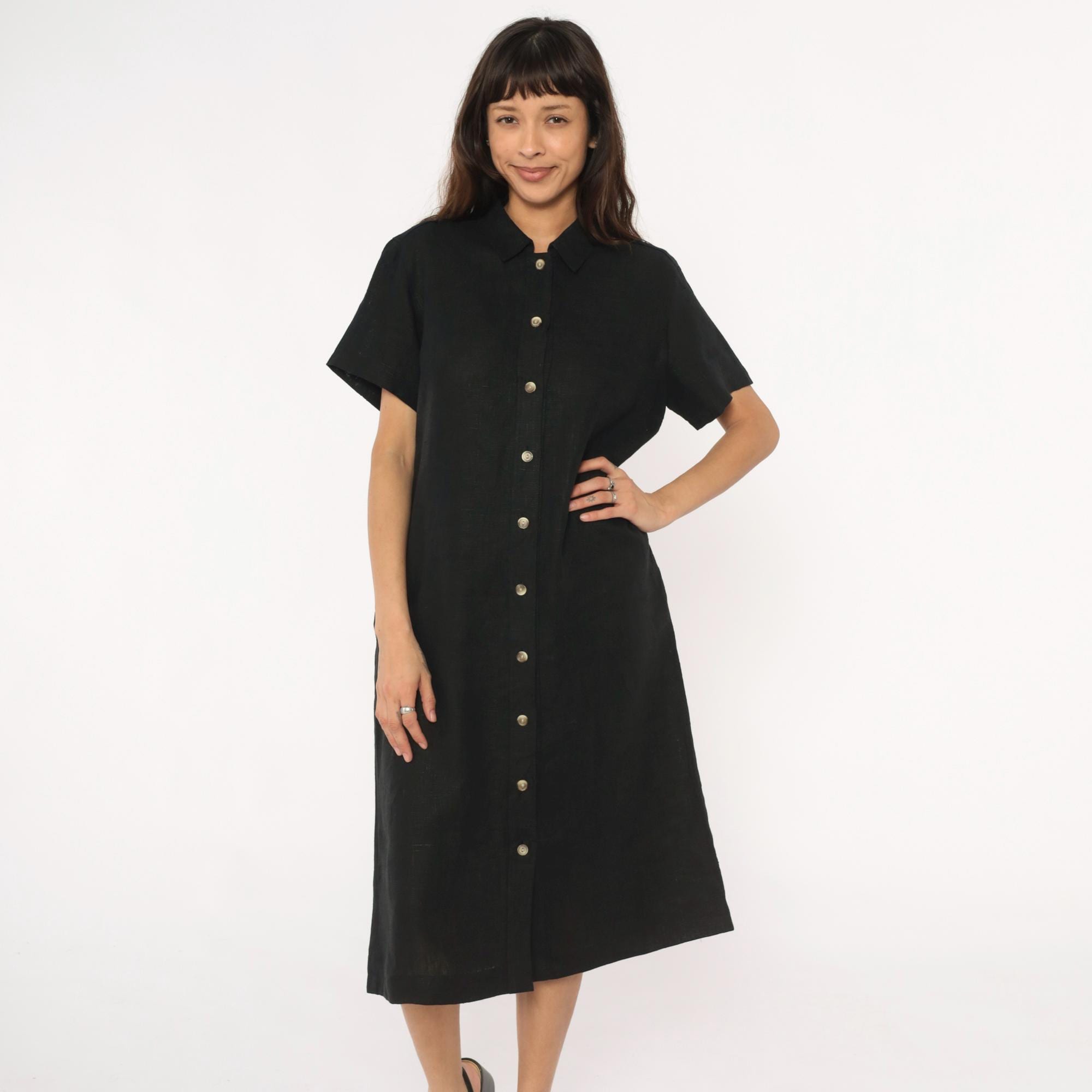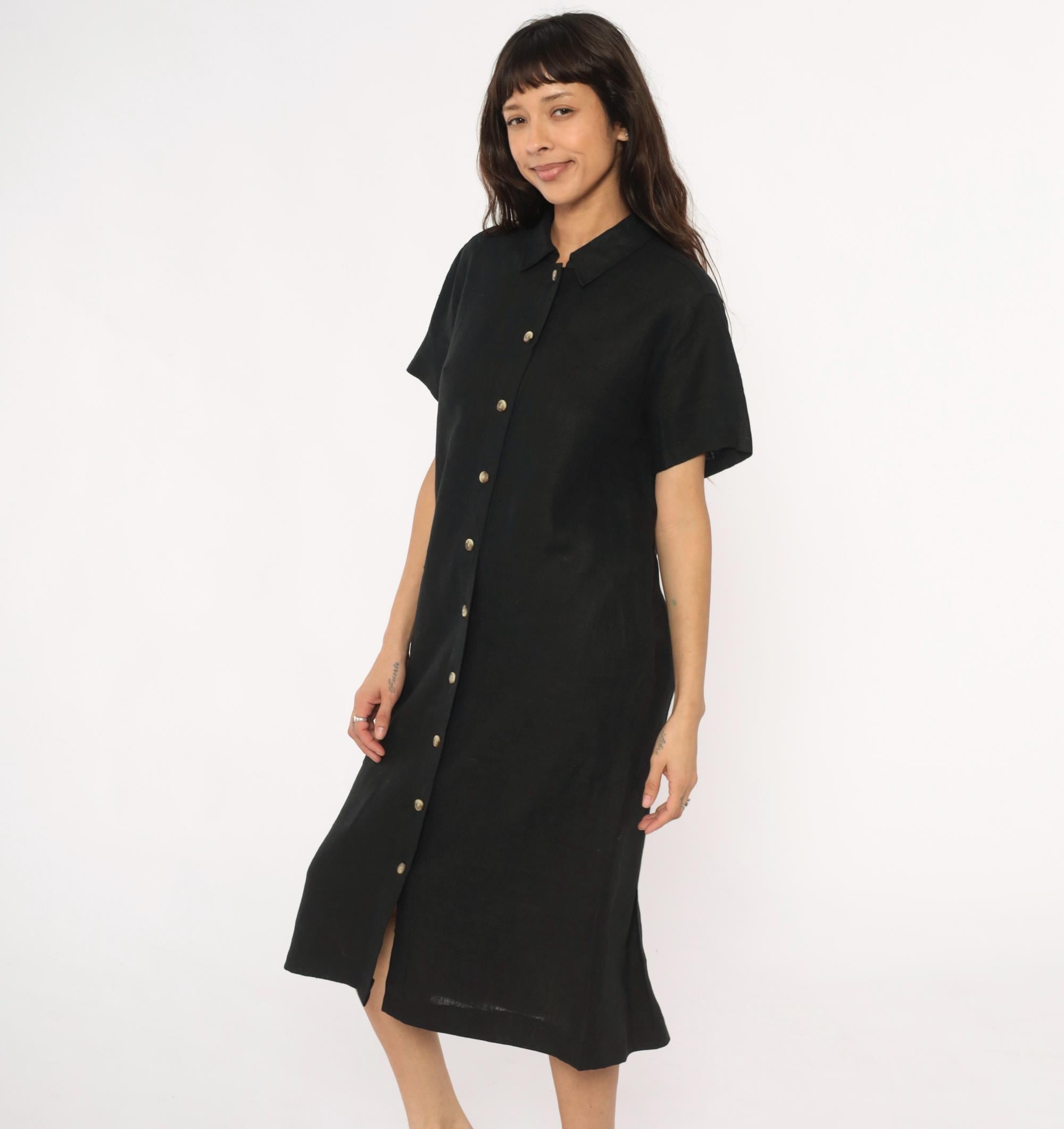 90s black midi dress from harve benard with pointed collar and short sleeves. Button front closure with metal snap buttons, straight silhouette, mid-calf length.