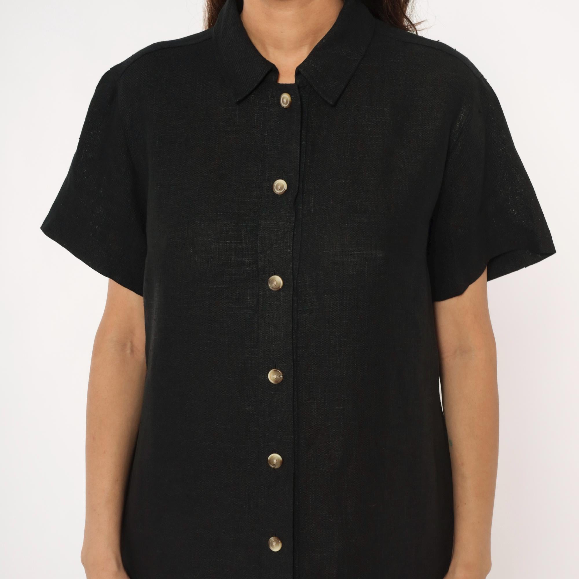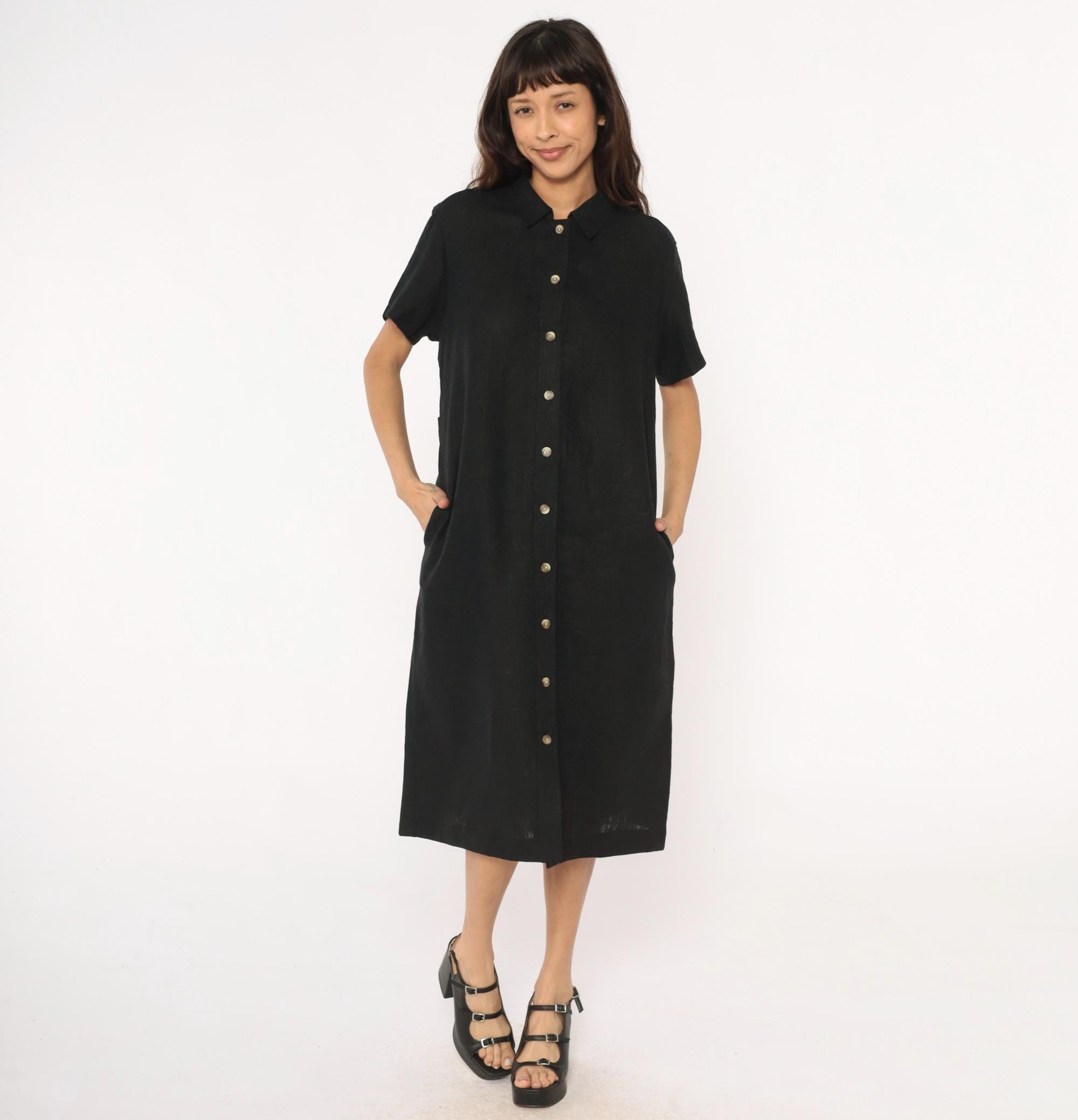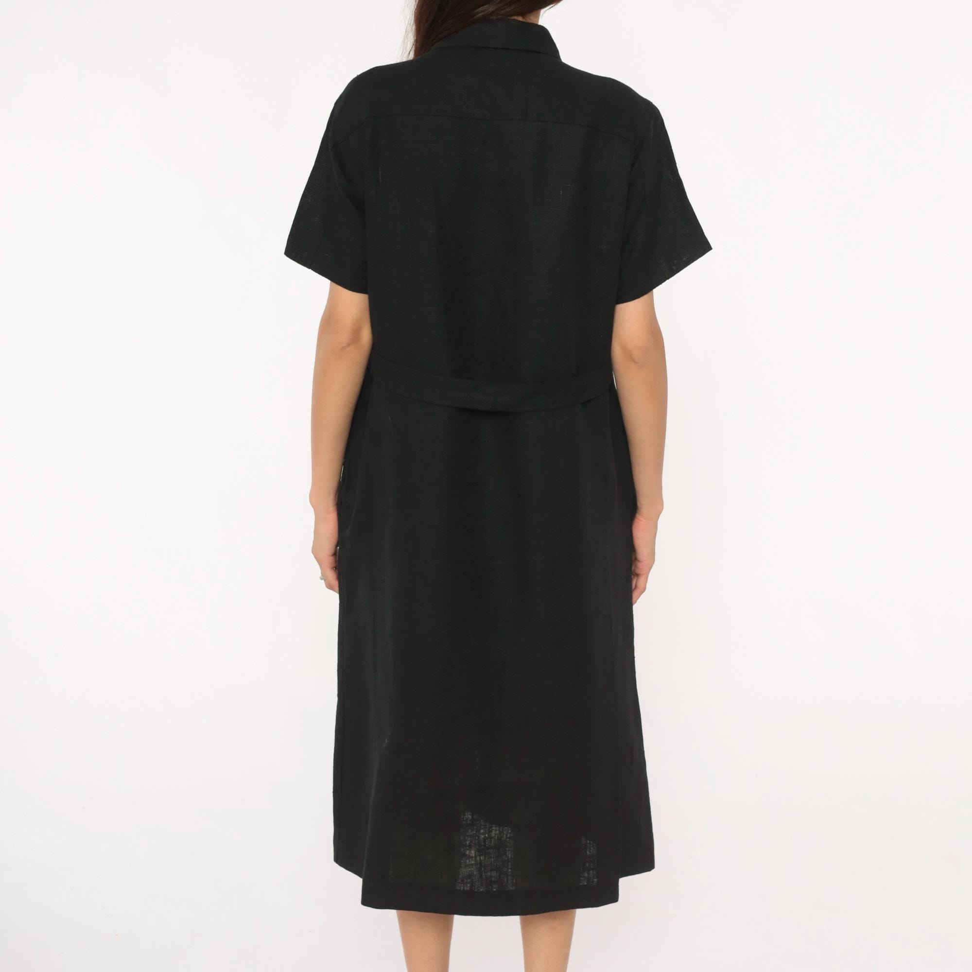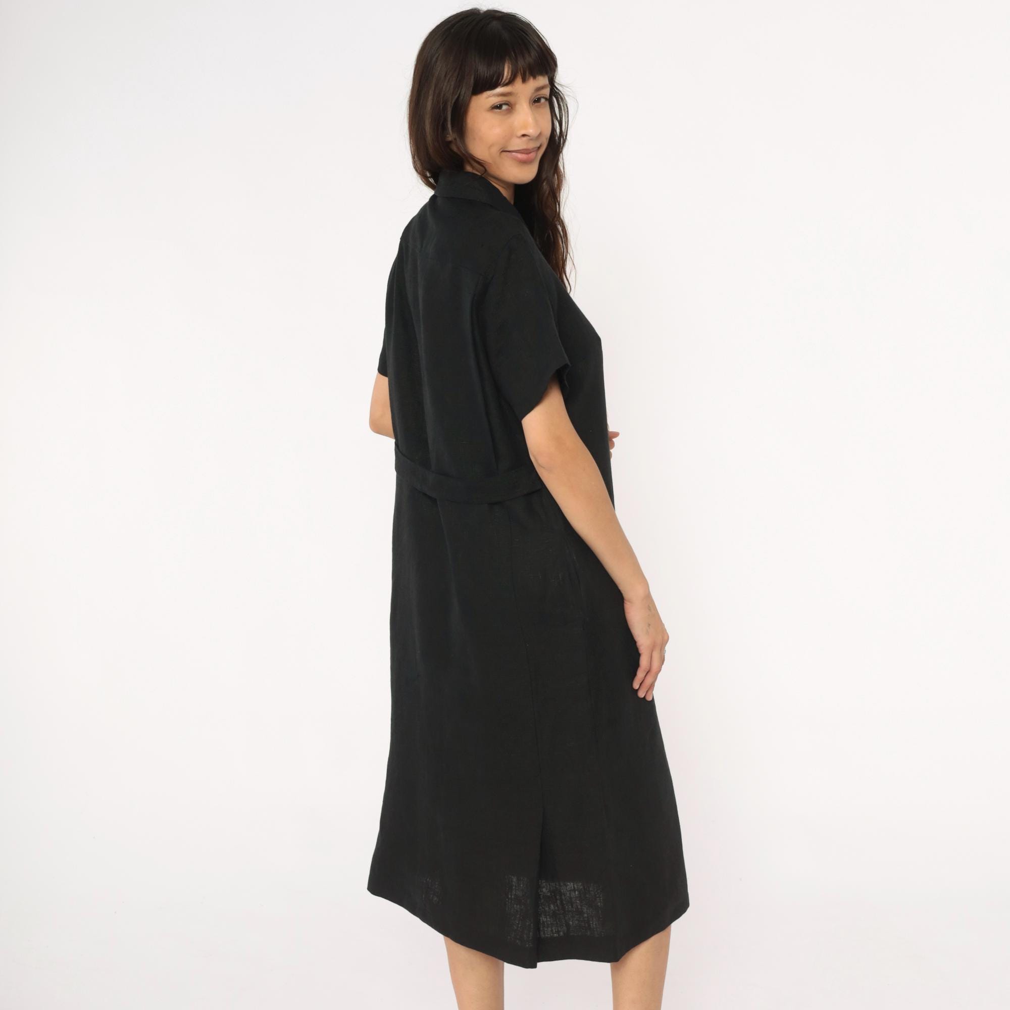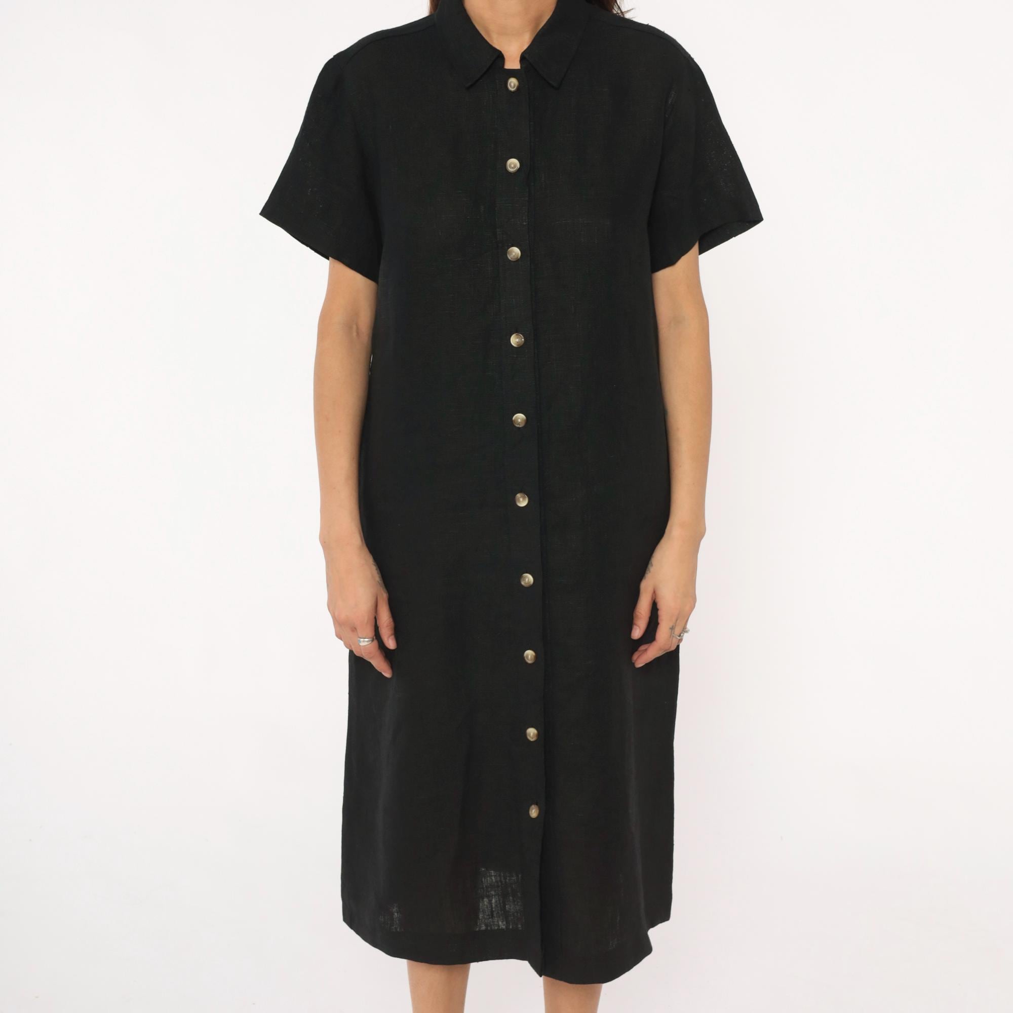 90s black midi dress from harve benard with pointed collar and short sleeves. Button front closure with metal snap buttons, straight silhouette, mid-calf length.