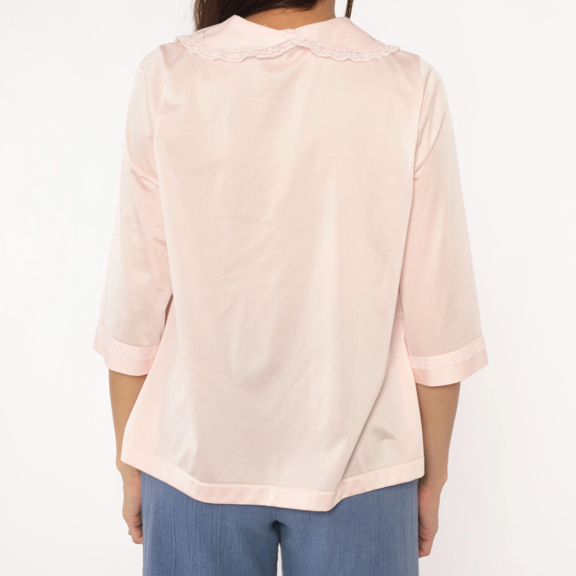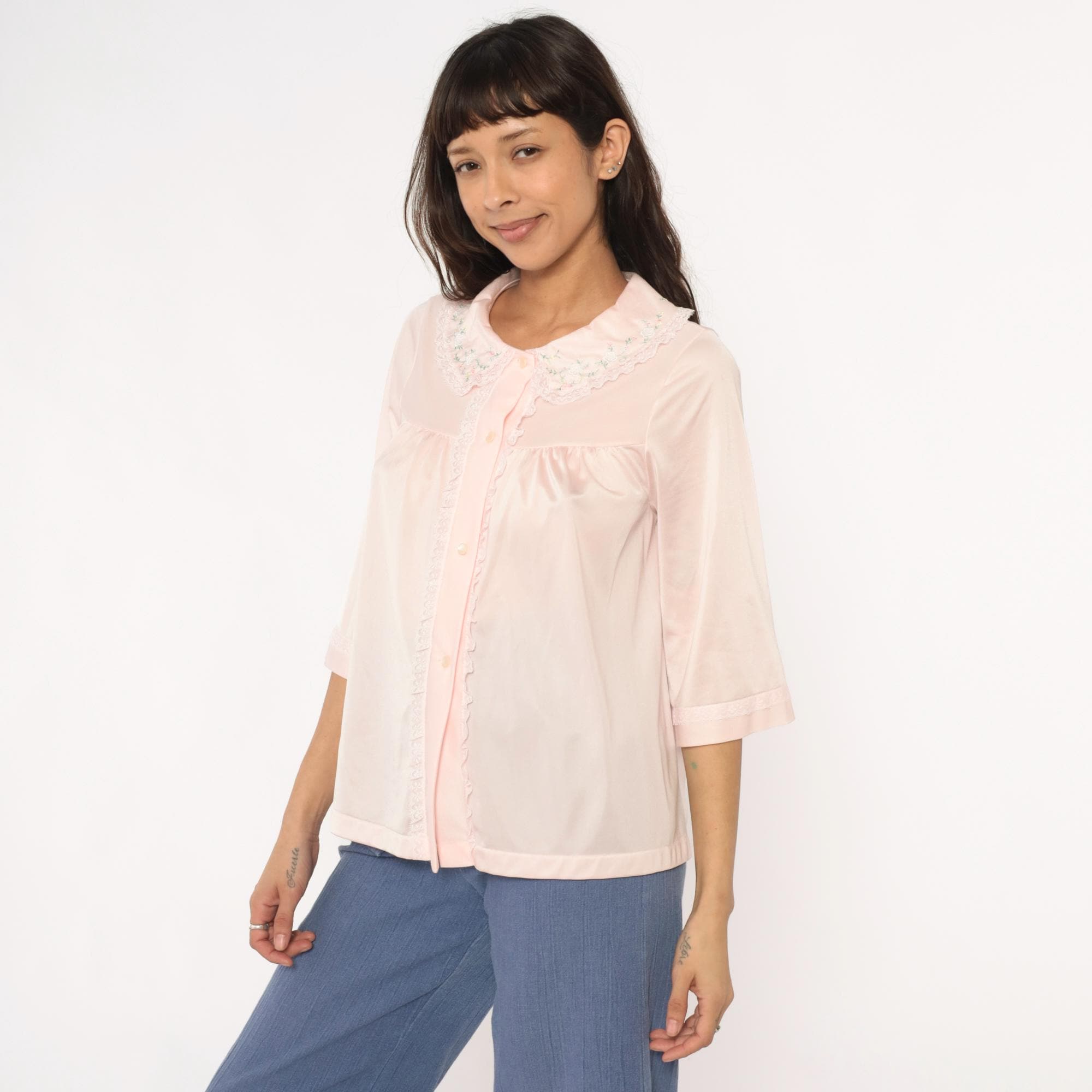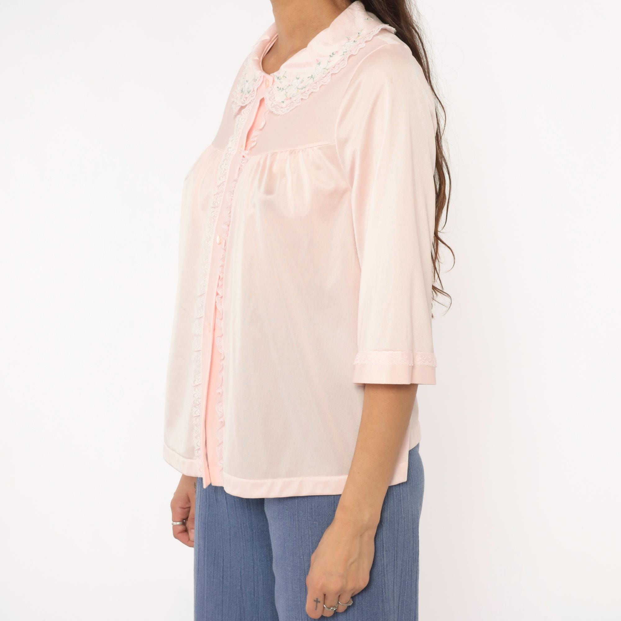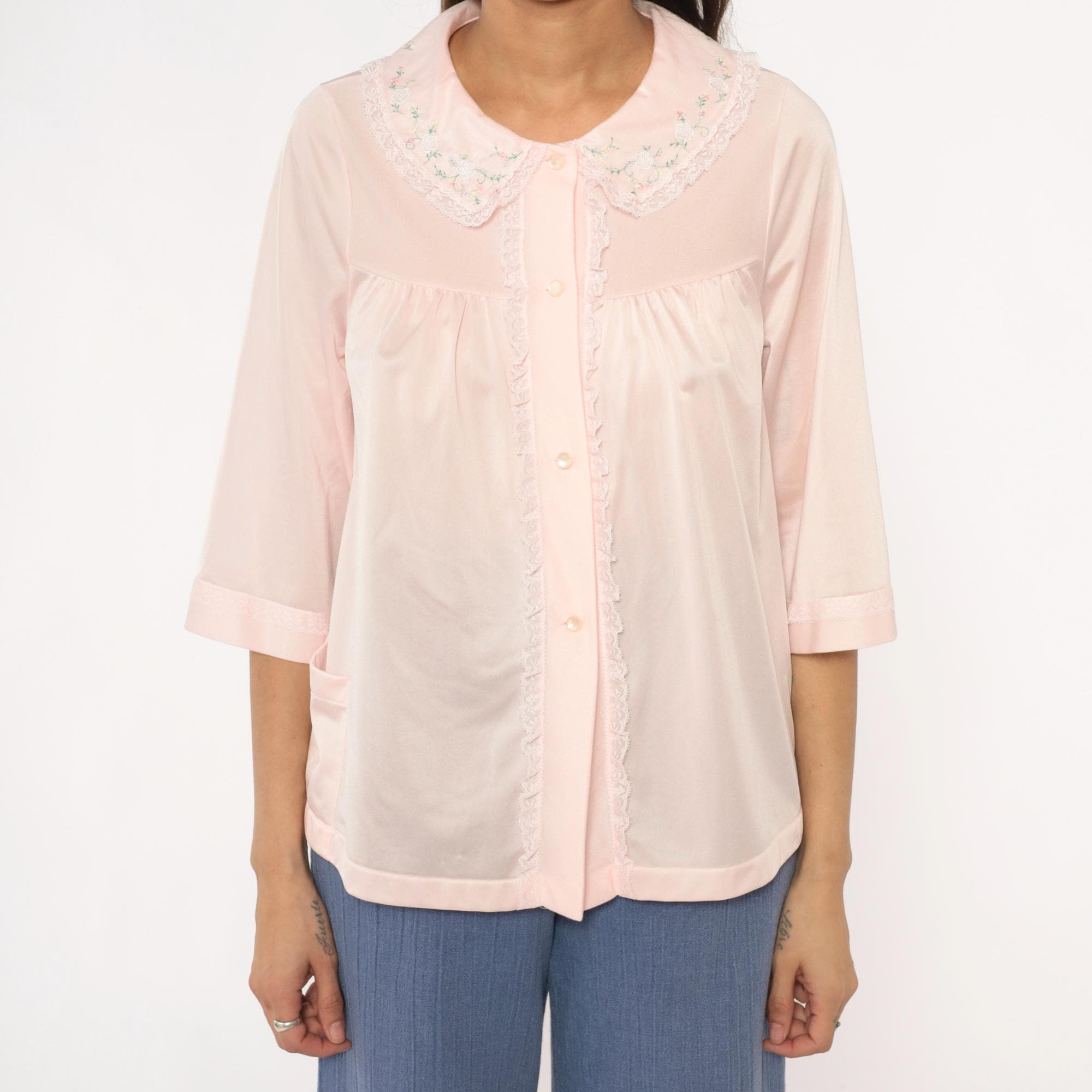 80s pale pink nylon shirt from shadowline with embroidered floral Peter Pan collar and lace trim along the button front placket. Small multicolored flowers accent the collar in pink, blue, yellow, and green. Three-quarter sleeves with cuffed hems, relaxed boxy fit.