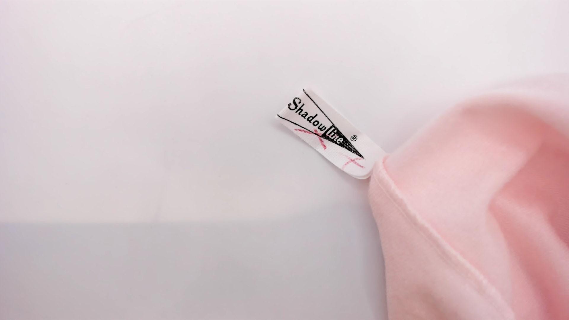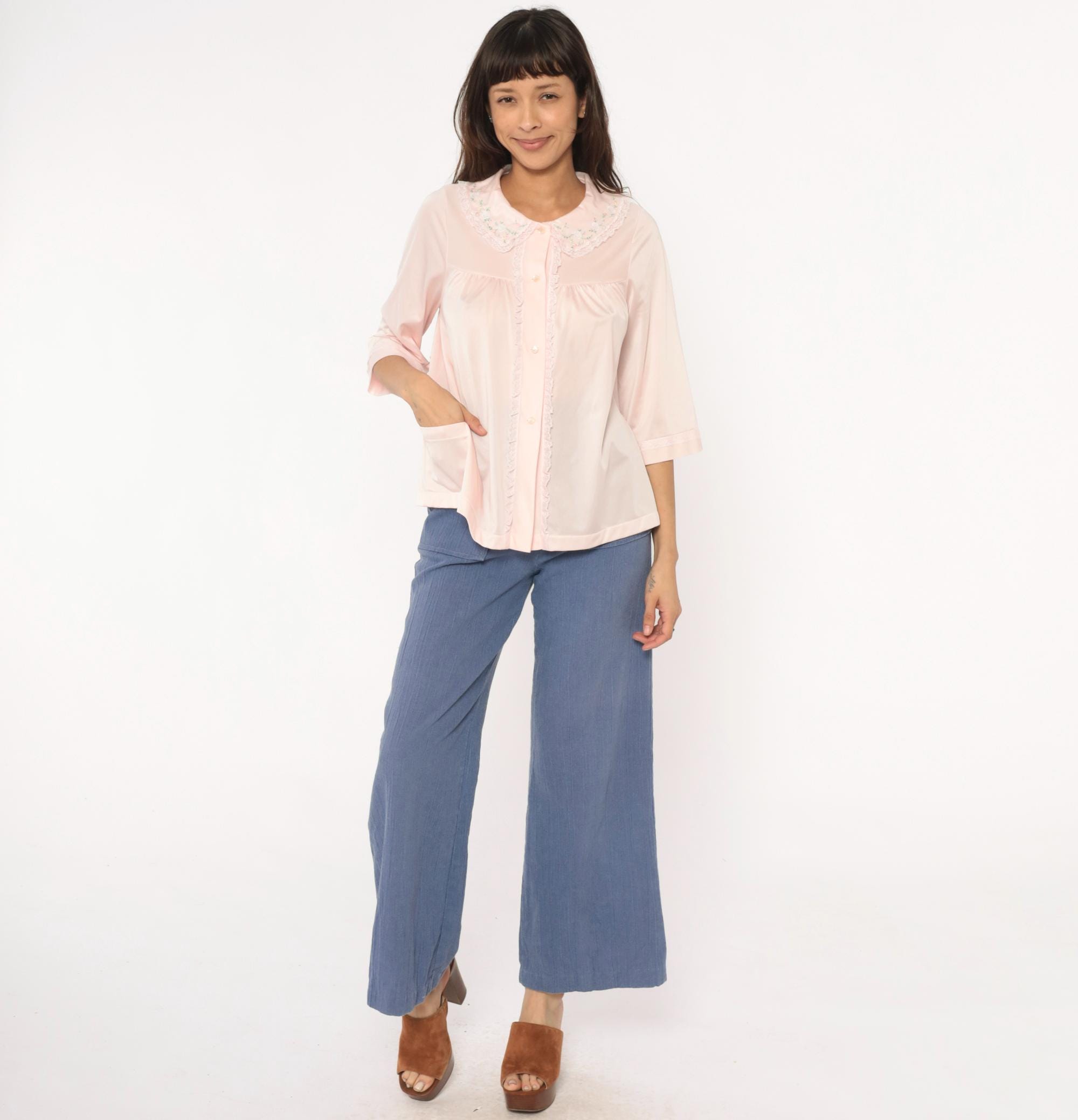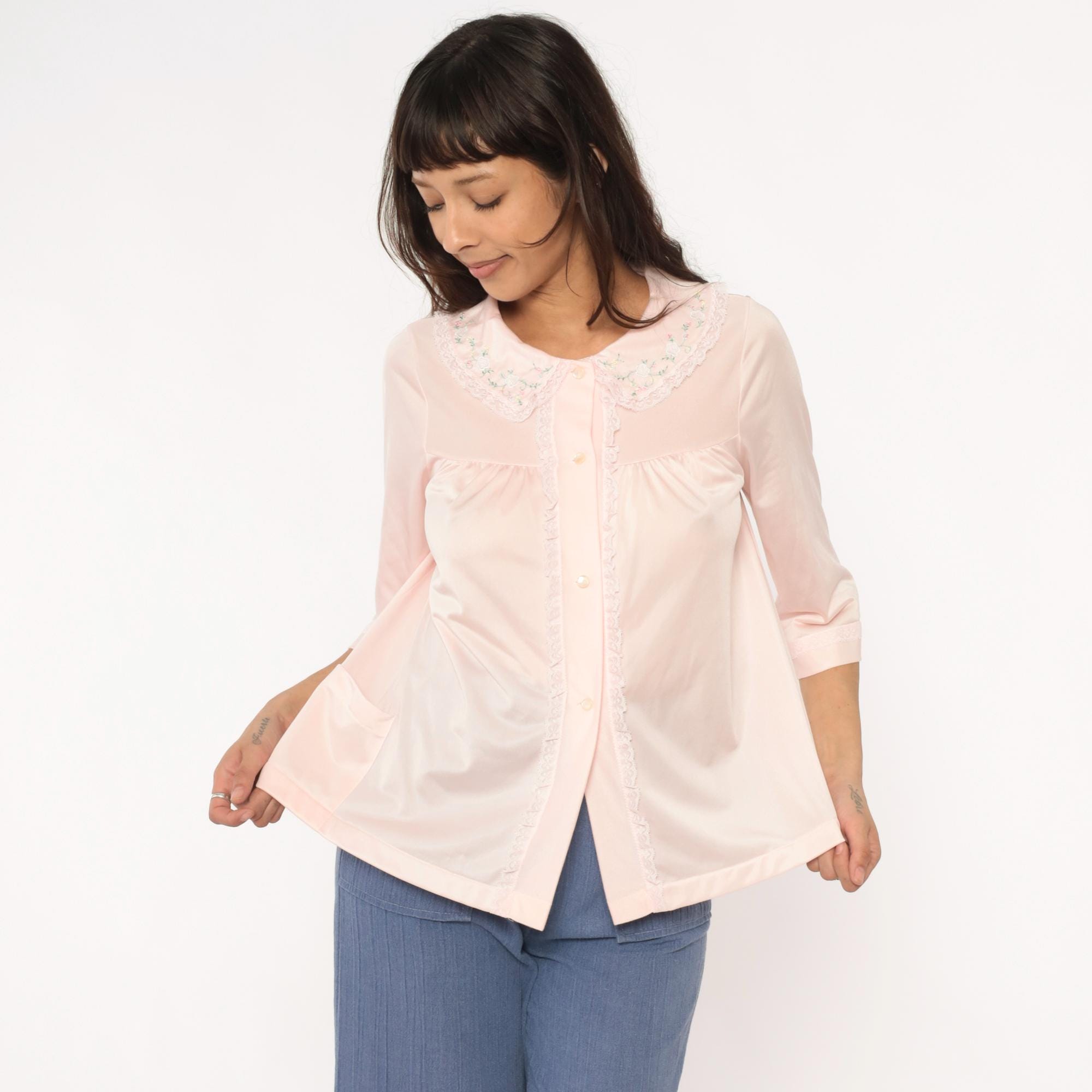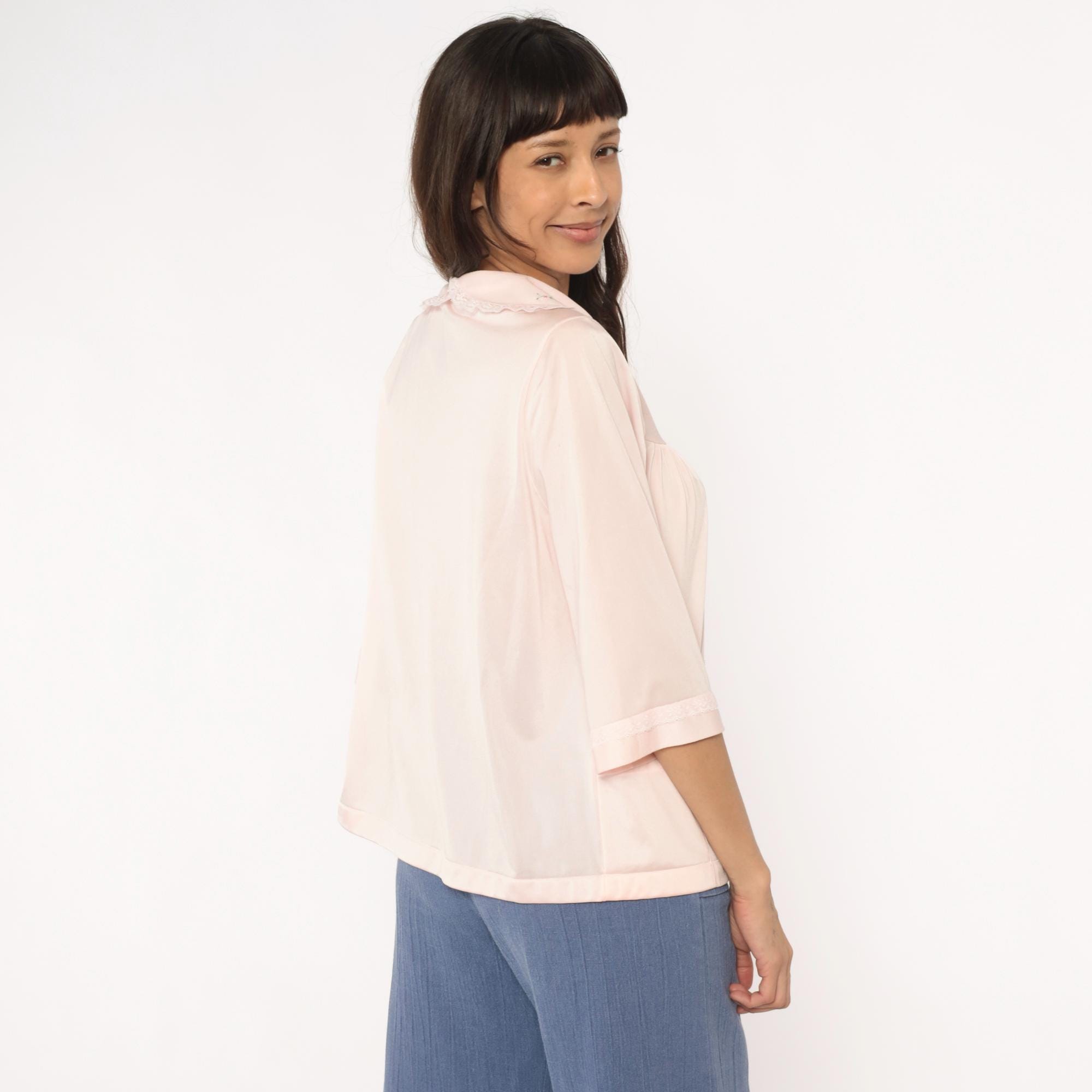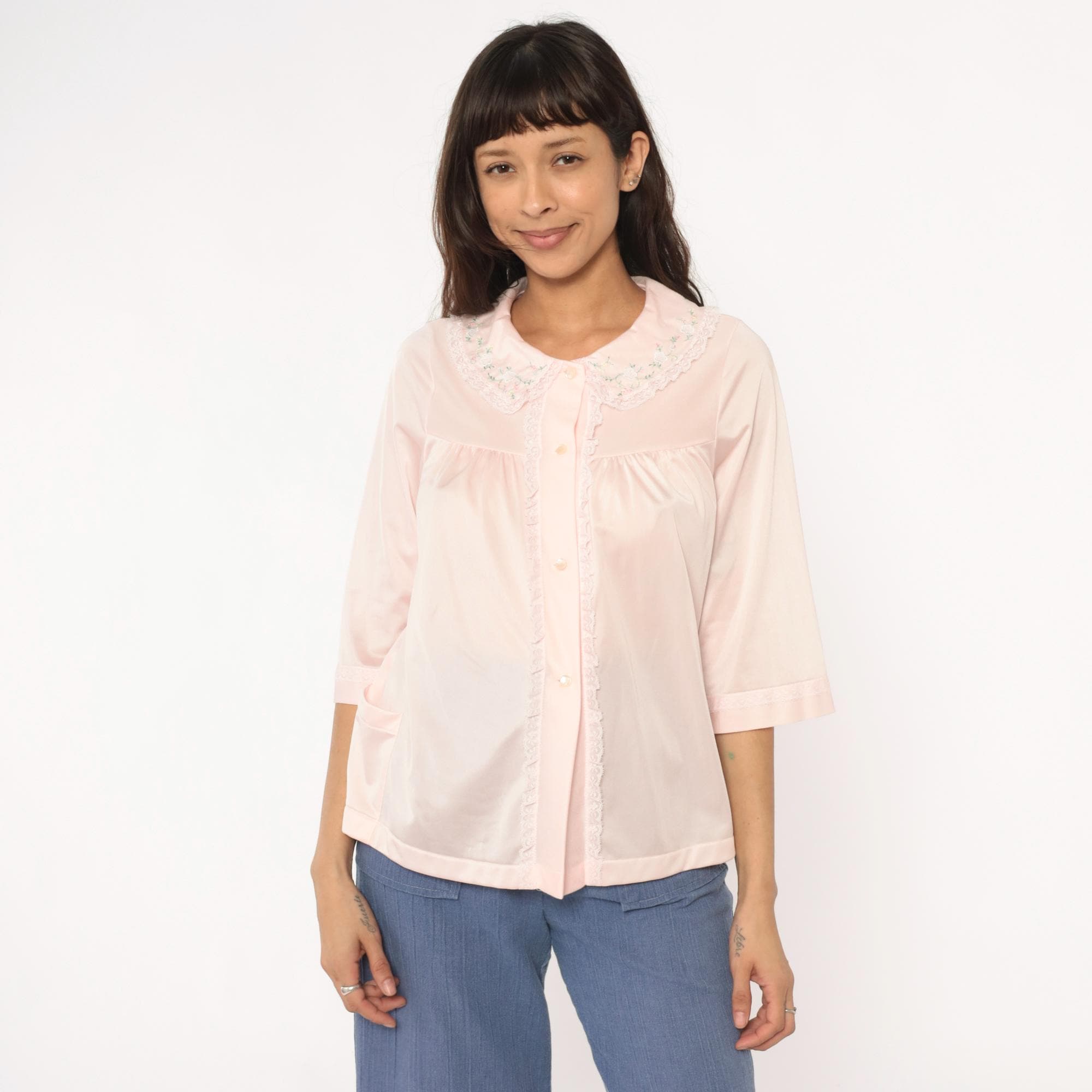 80s pale pink nylon shirt from shadowline with embroidered floral Peter Pan collar and lace trim along the button front placket. Small multicolored flowers accent the collar in pink, blue, yellow, and green. Three-quarter sleeves with cuffed hems, relaxed boxy fit.