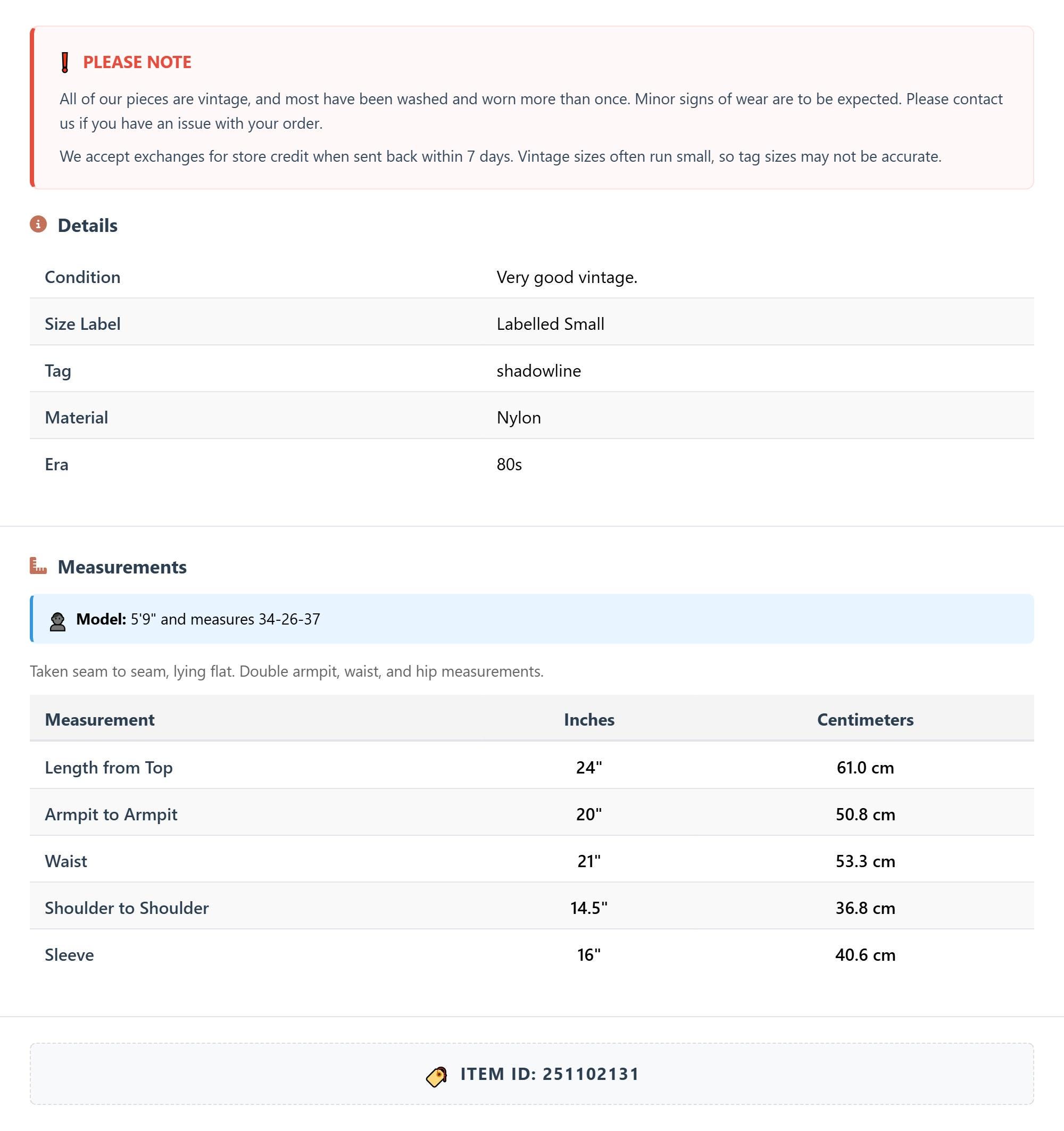All of our pieces are vintage, and most have been washed and worn more than once. Minor signs of wear are to be expected. Please contact us if you have an issue with your order. We accept exchanges for store credit when sent back within 7 days.