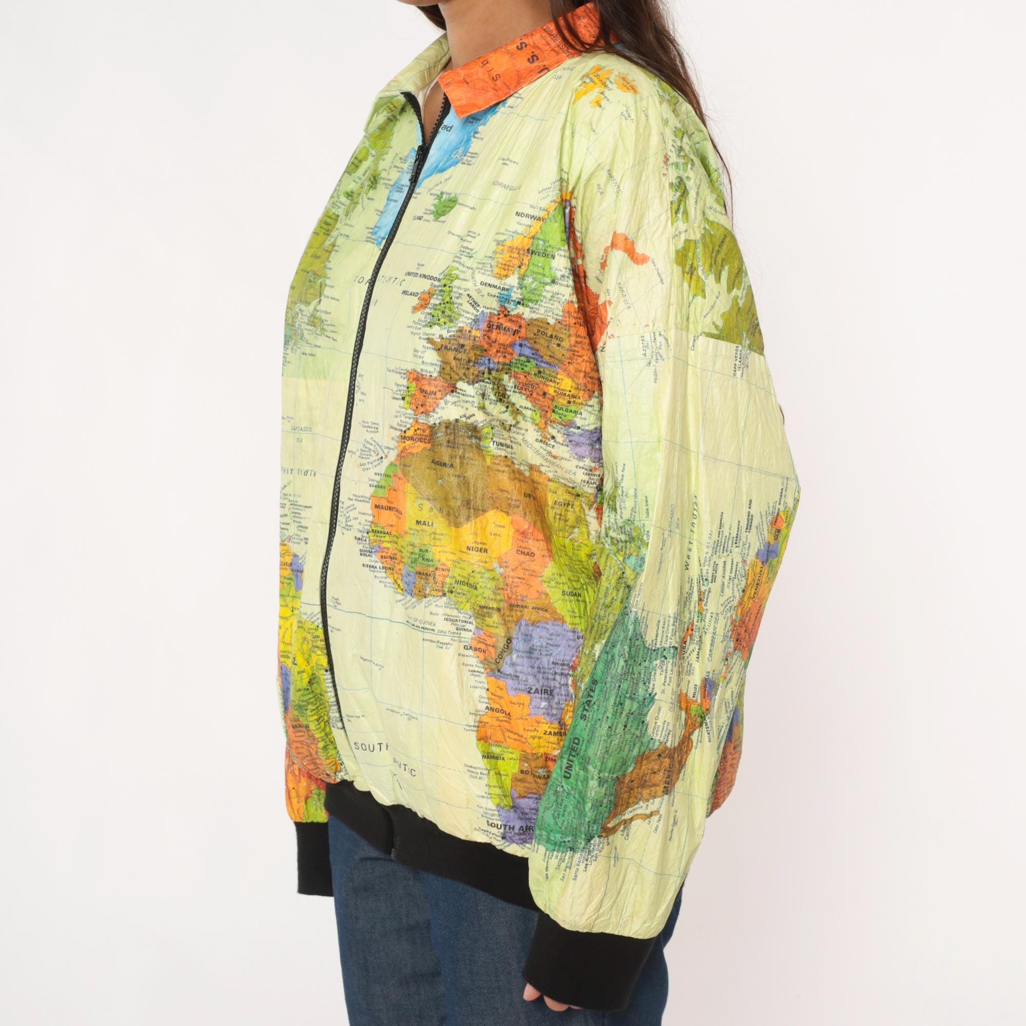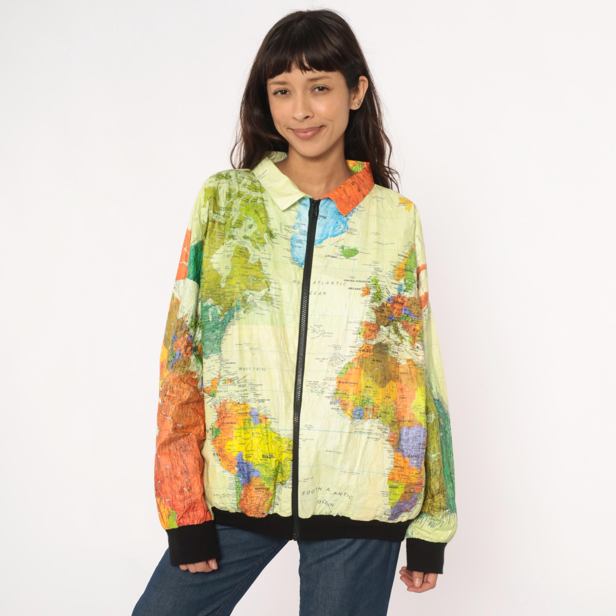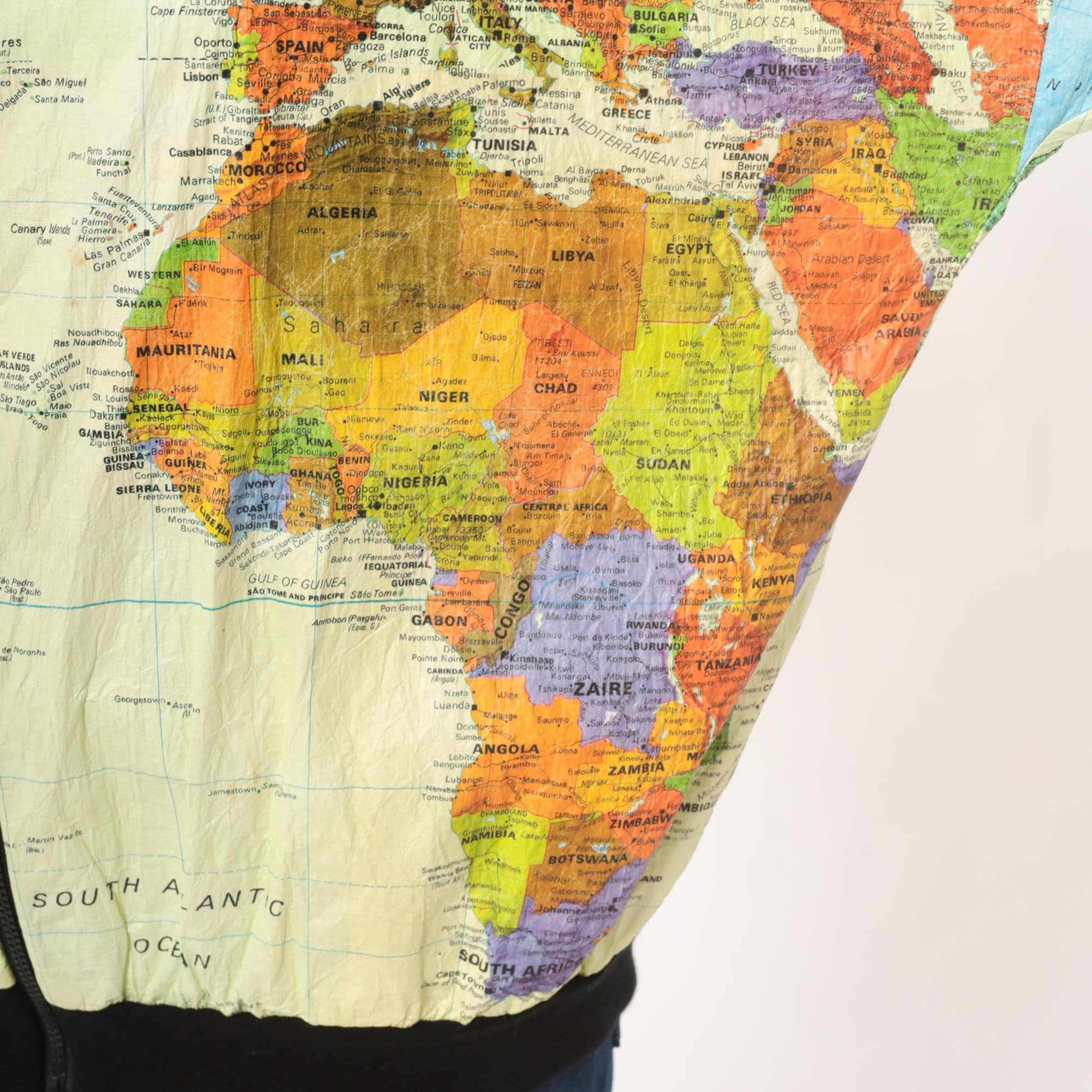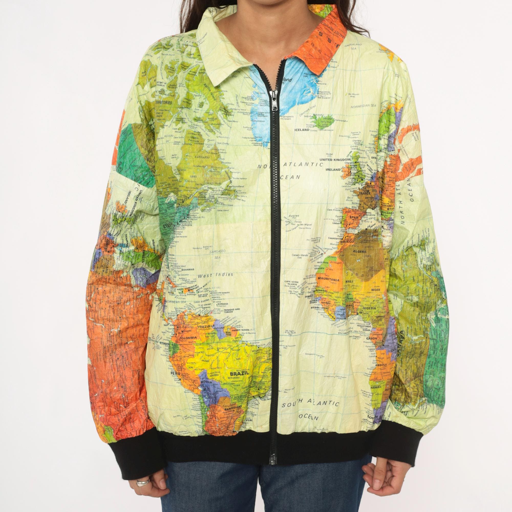90s world map print zip-up jacket from admiral ty with all-over geographic print showing continents, countries, and oceans in orange, yellow, green, blue, and purple regions across cream base. Full front black zipper closure, collared neckline, black ribbed cuffs and hem. Long sleeves with map print continuing across entire garment including sleeves and back.