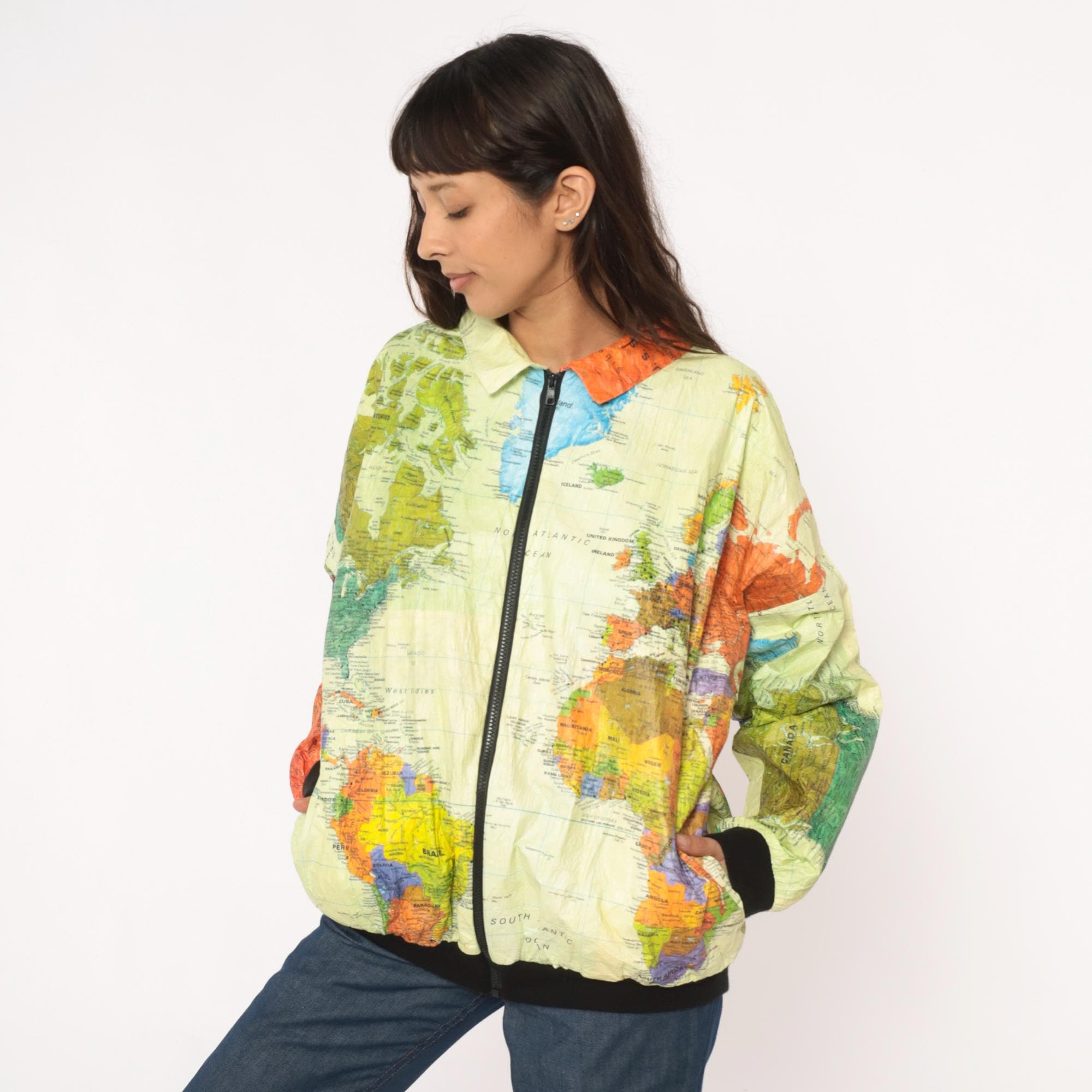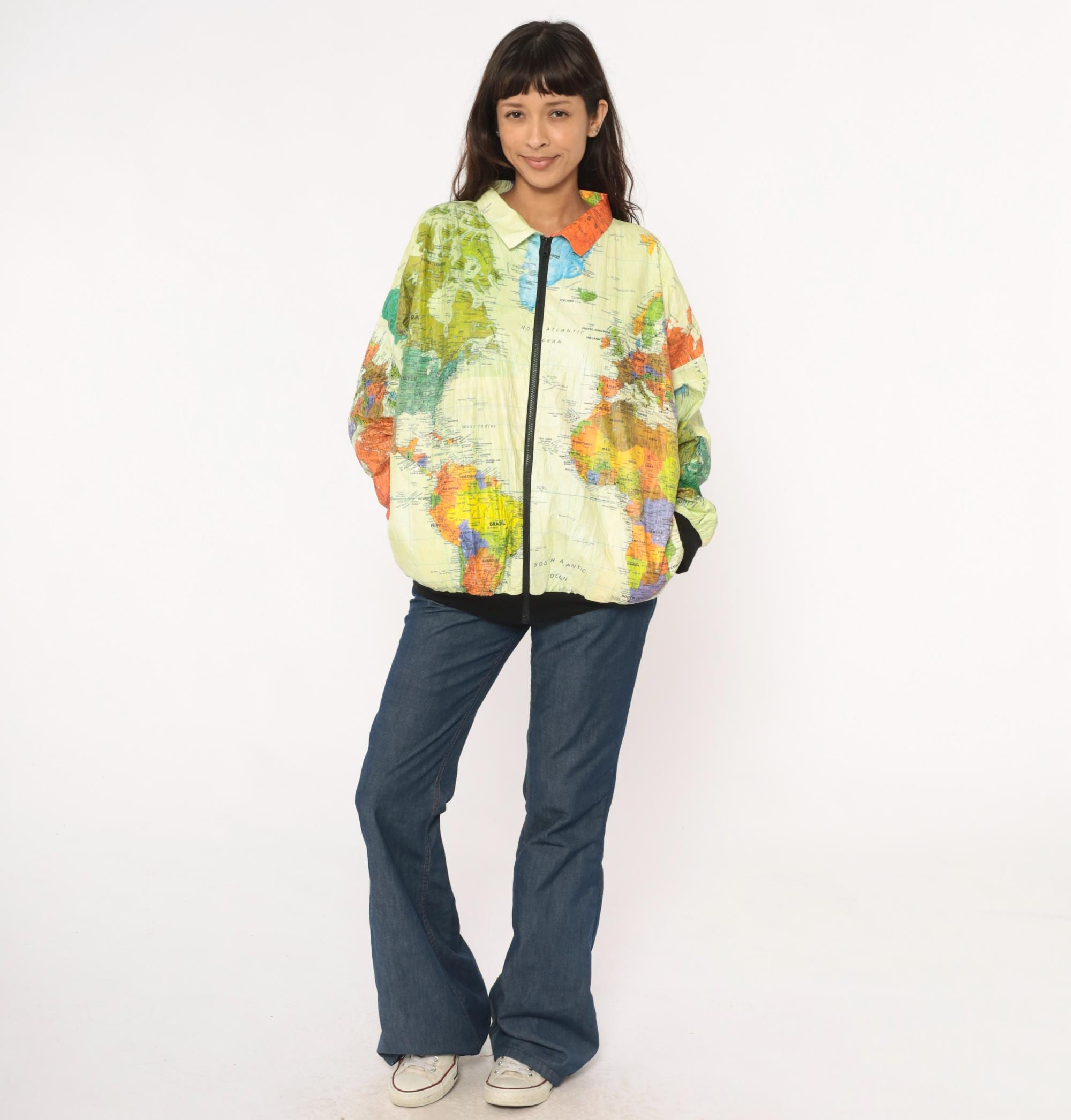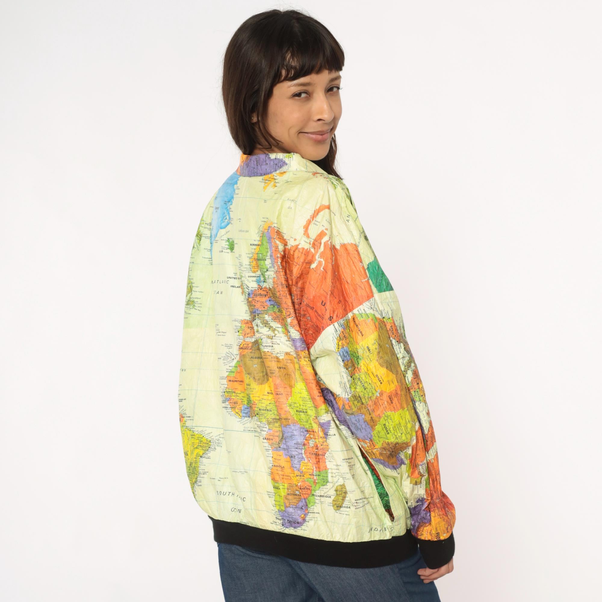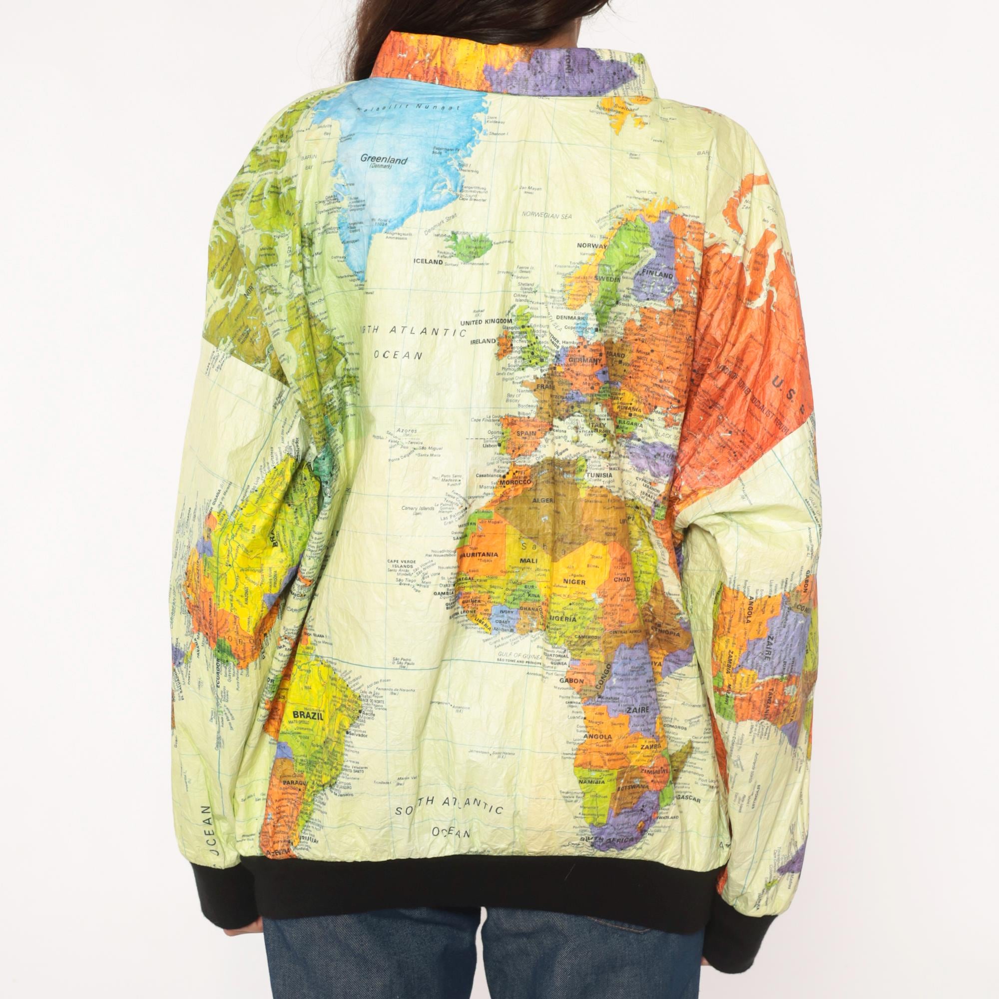90s world map print zip-up jacket from admiral ty with all-over geographic print showing continents, countries, and oceans in orange, yellow, green, blue, and purple regions across cream base. Full front black zipper closure, collared neckline, black ribbed cuffs and hem. Long sleeves with map print continuing across entire garment including sleeves and back.