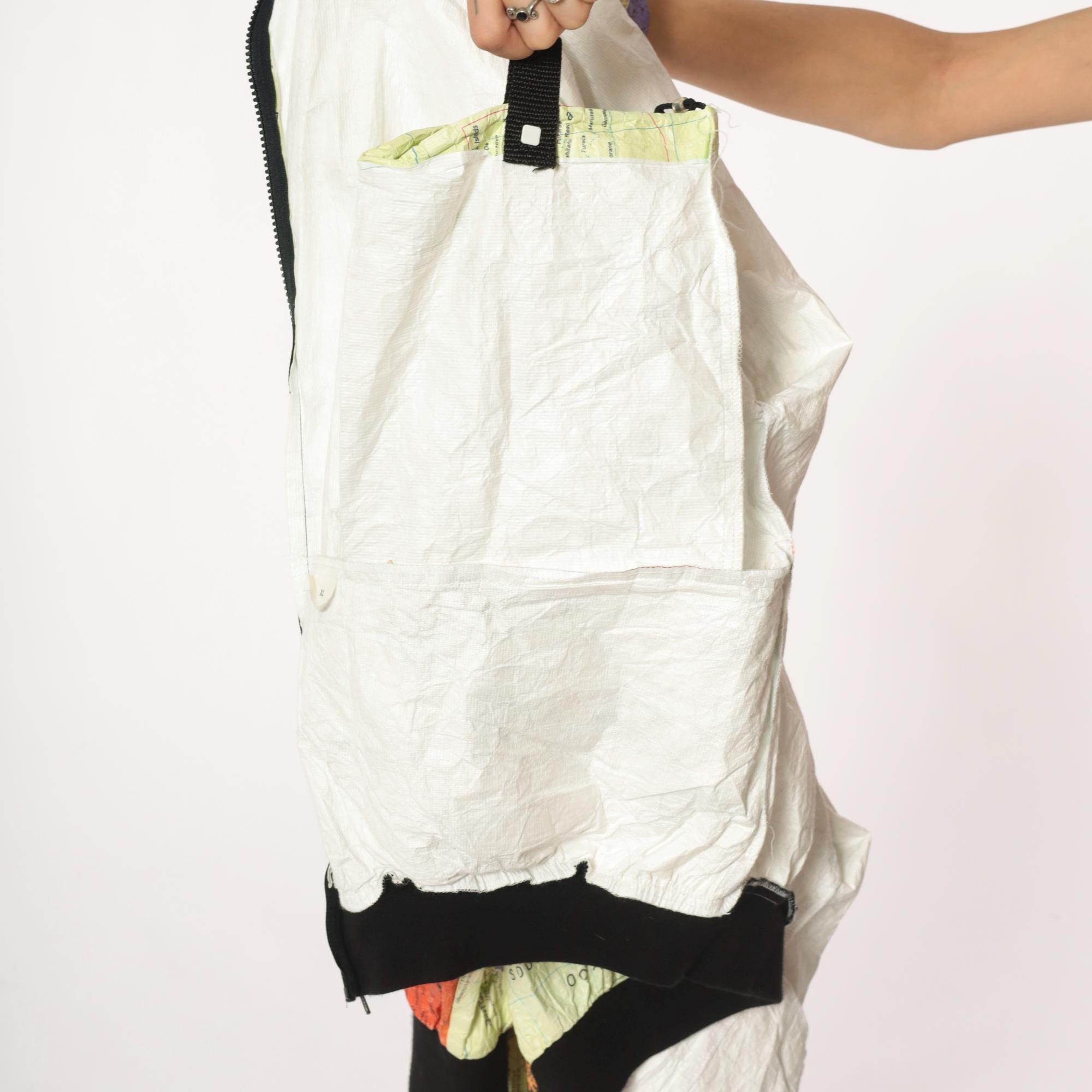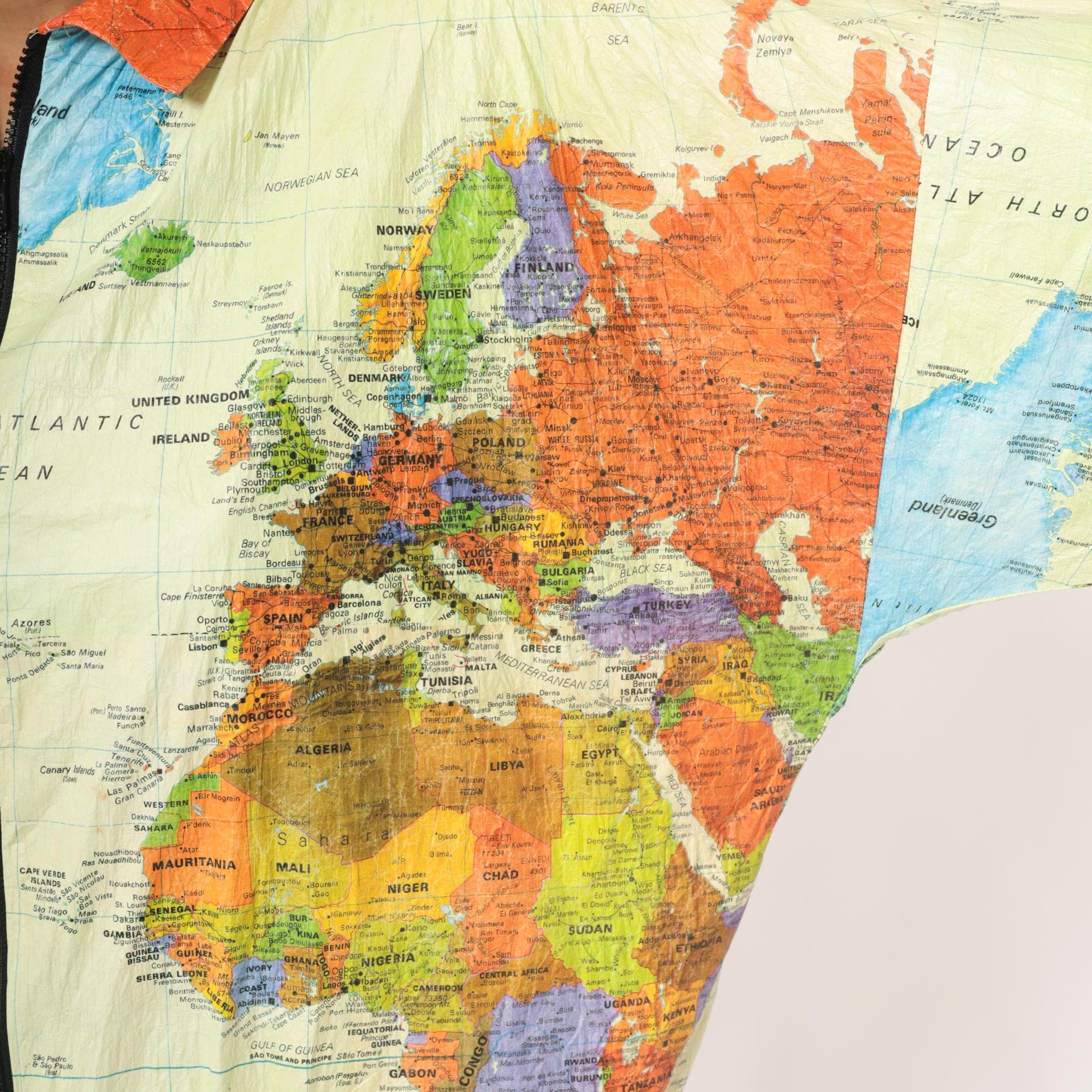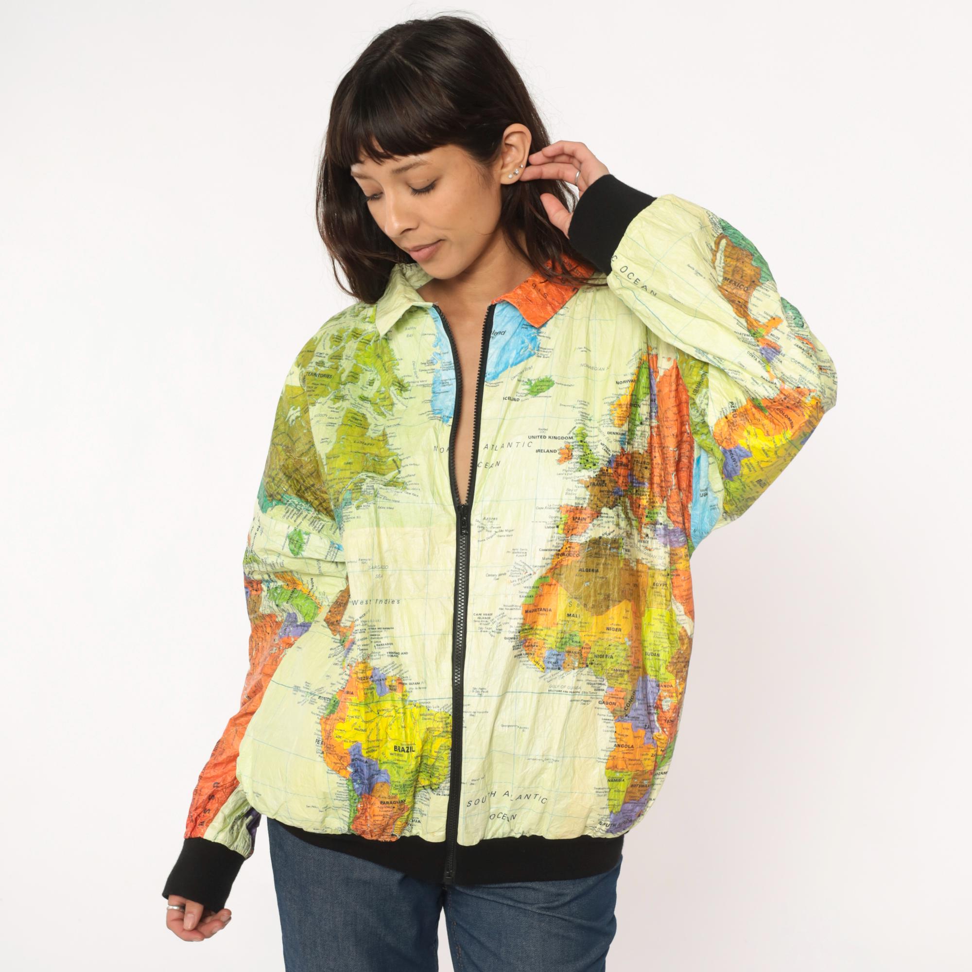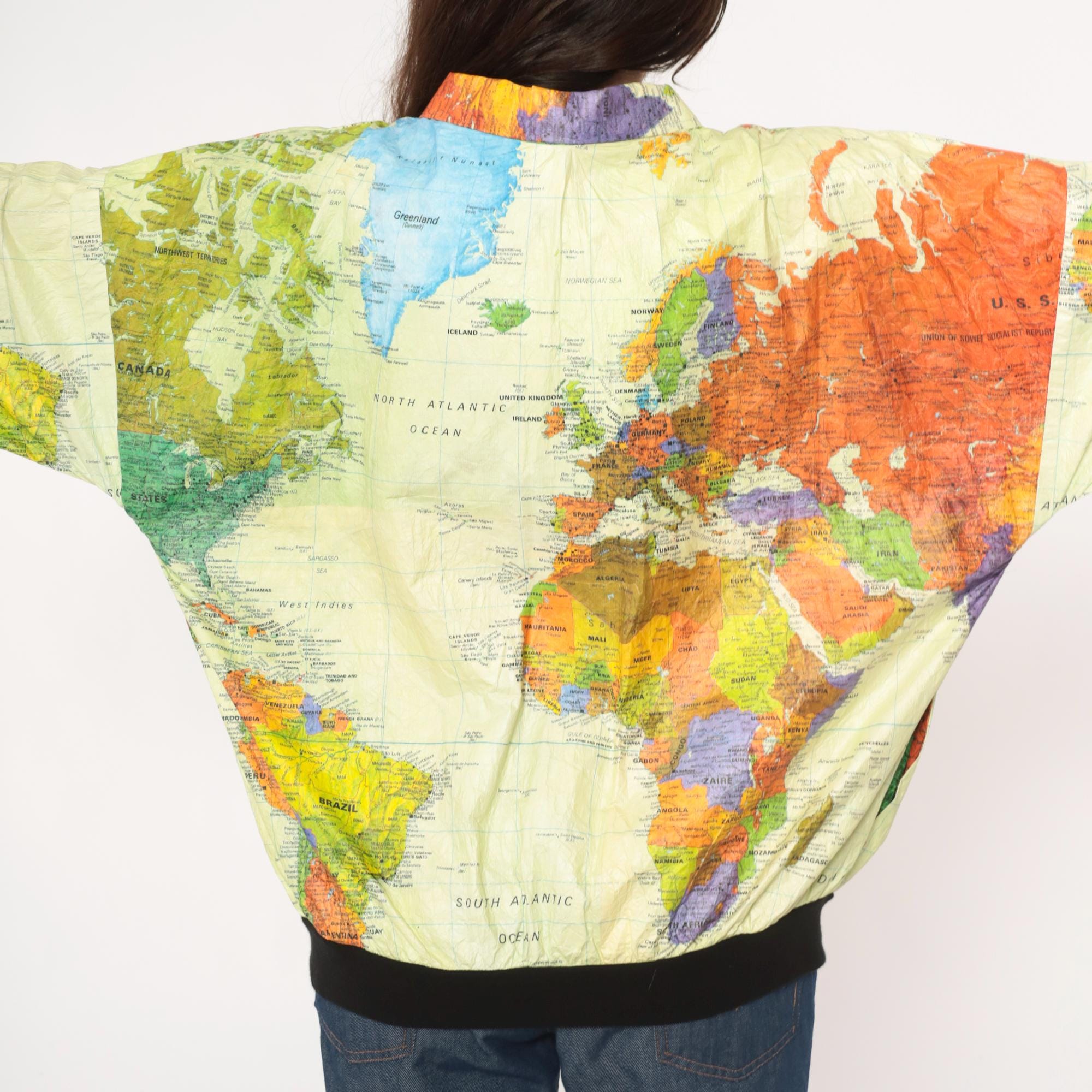 90s world map print zip-up jacket from admiral ty with all-over geographic print showing continents, countries, and oceans in orange, yellow, green, blue, and purple regions across cream base. Full front black zipper closure, collared neckline, black ribbed cuffs and hem. Long sleeves with map print continuing across entire garment including sleeves and back.