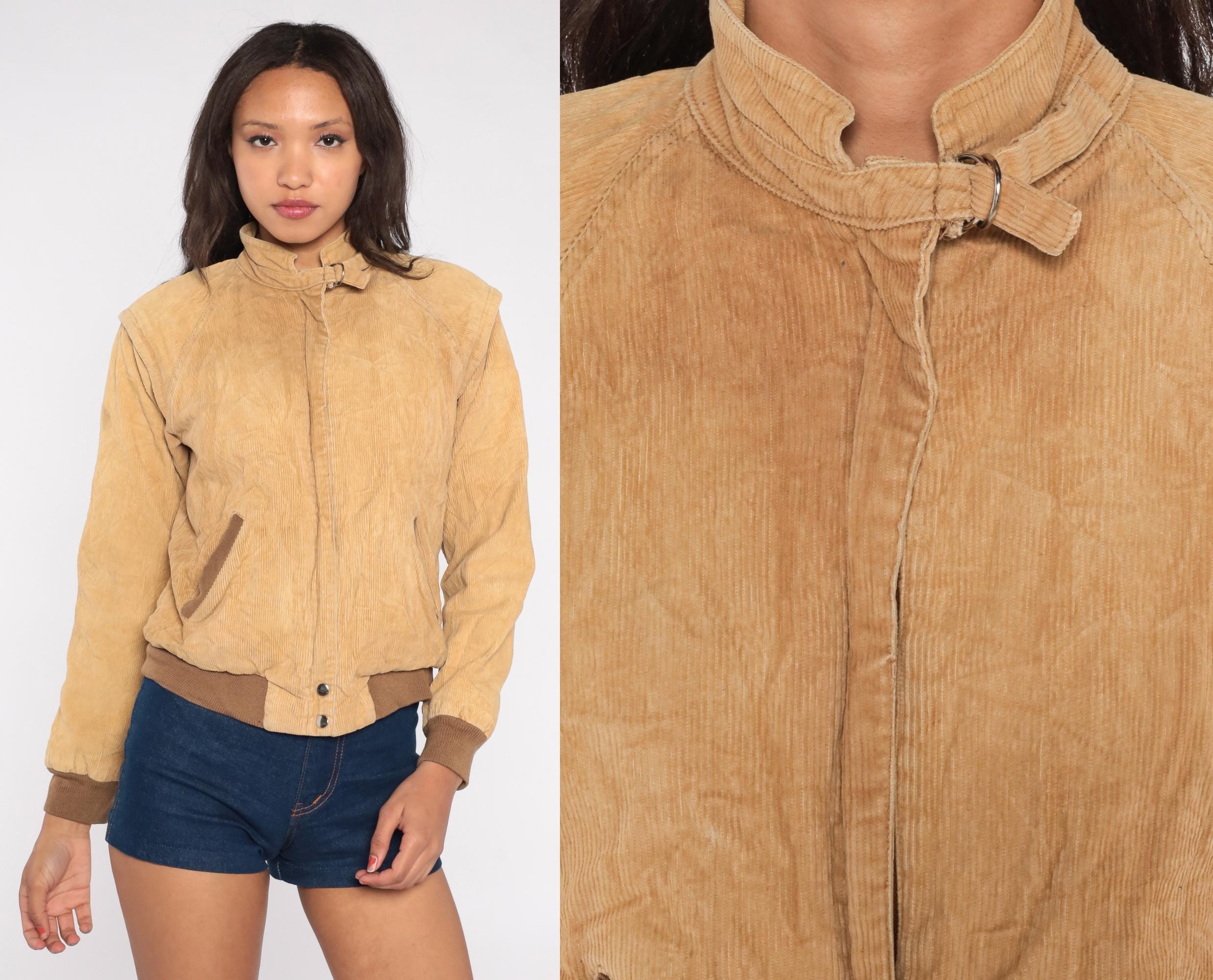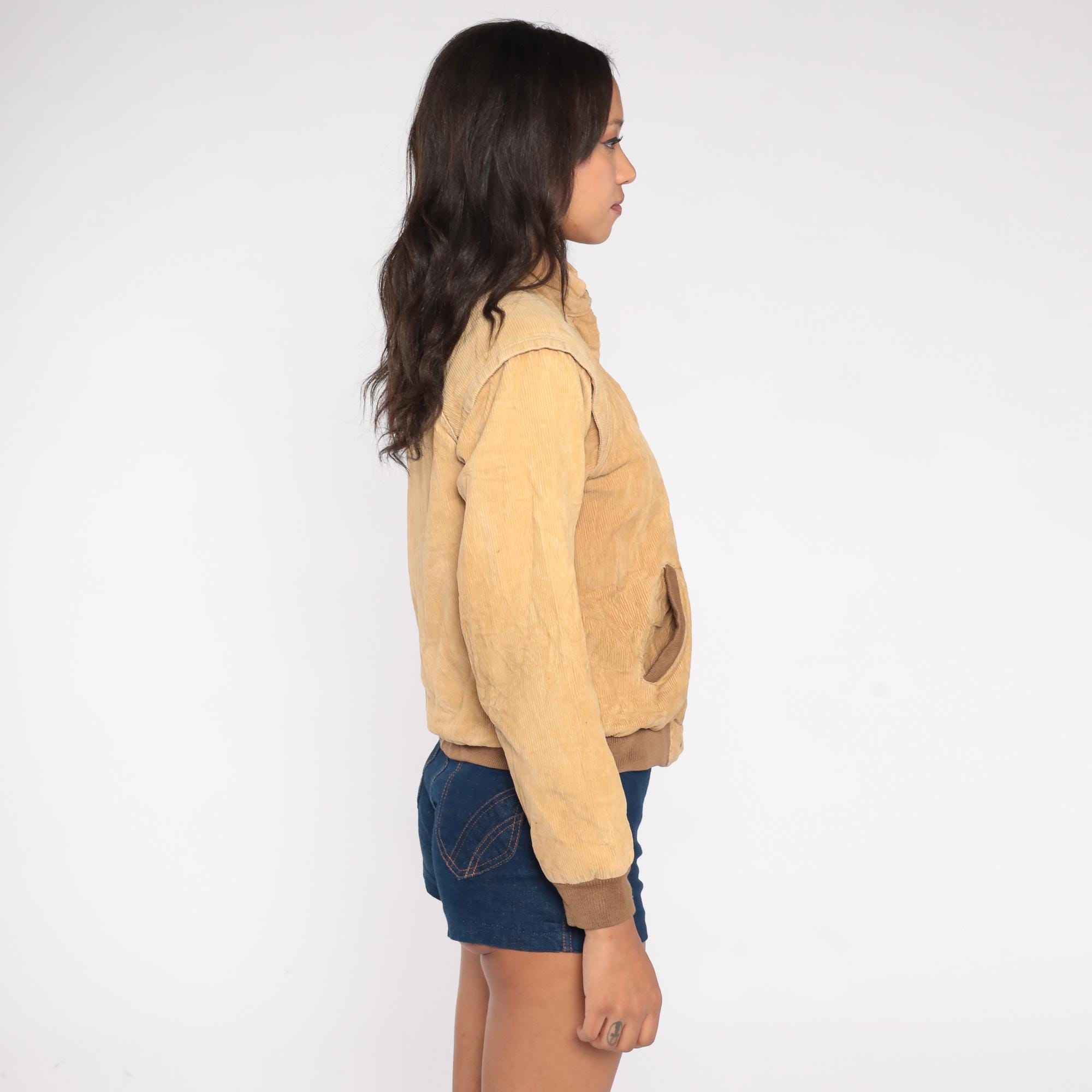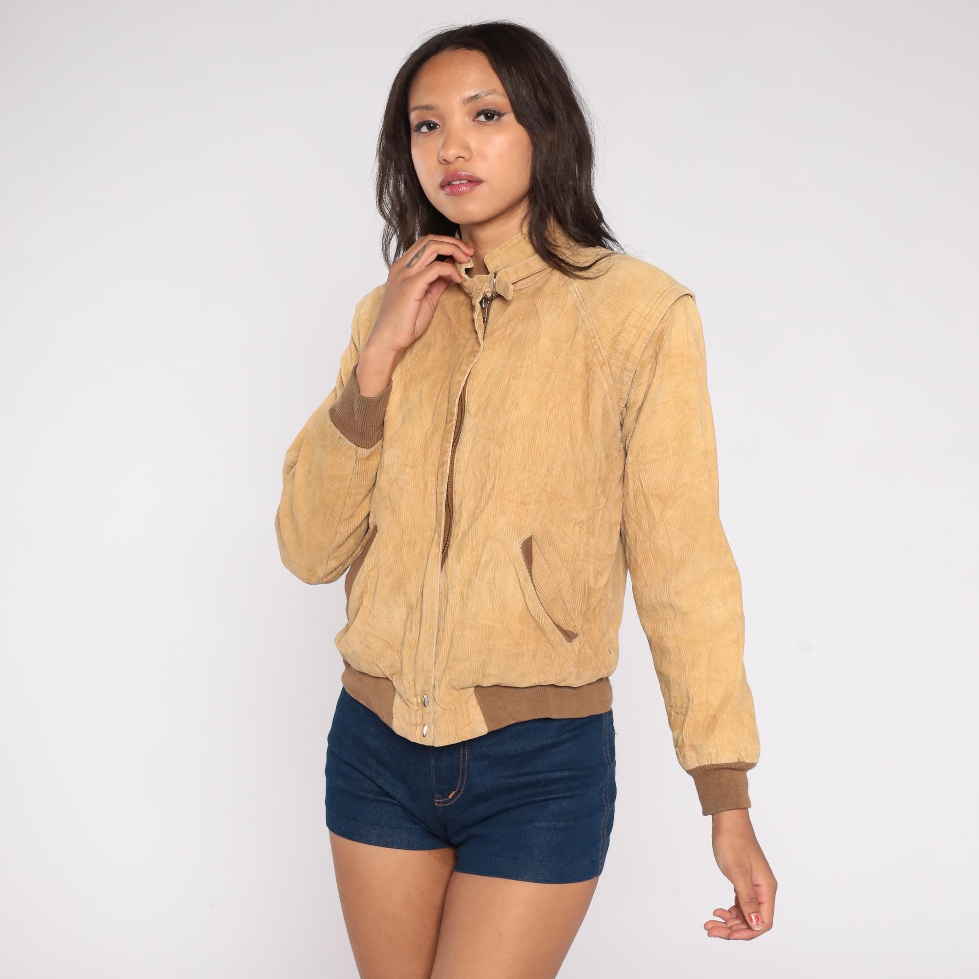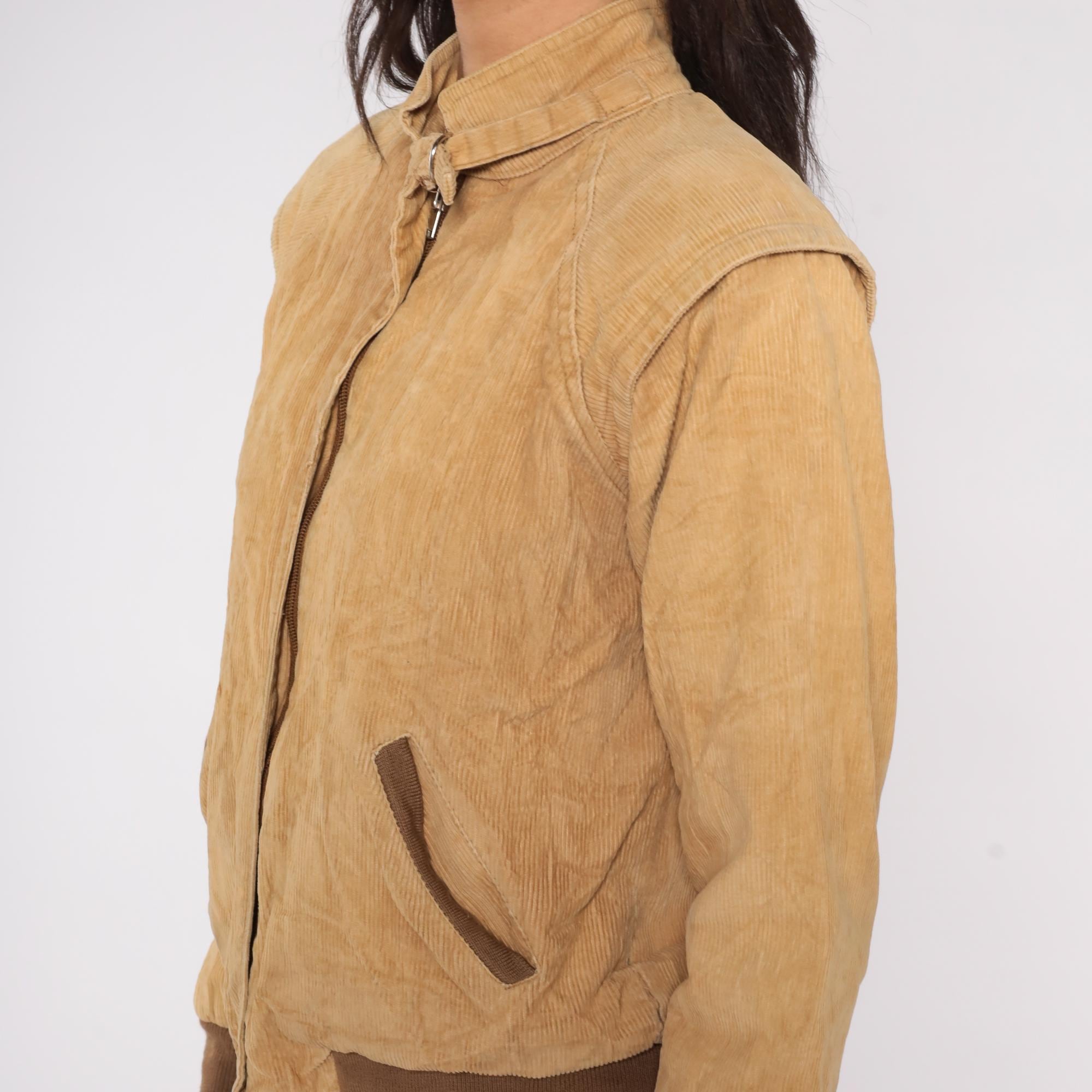 80s tan corduroy bomber jacket with ribbed brown knit collar, cuffs, and waistband. Front zip closure with snap button hem, buckle detail at collar, side slash pockets.