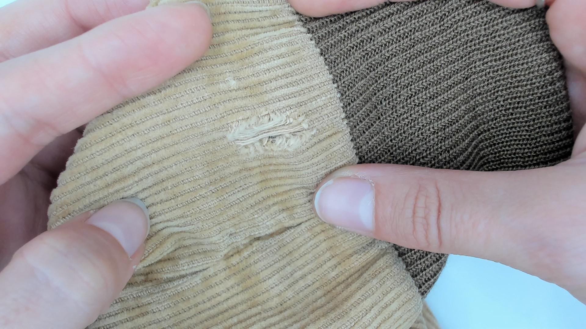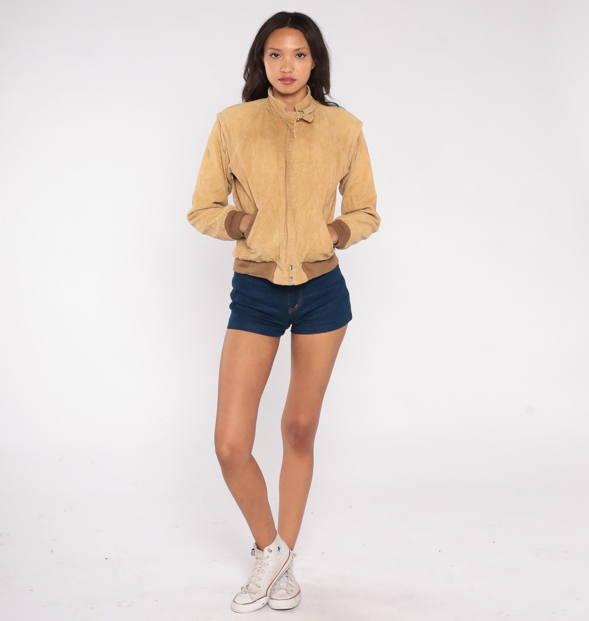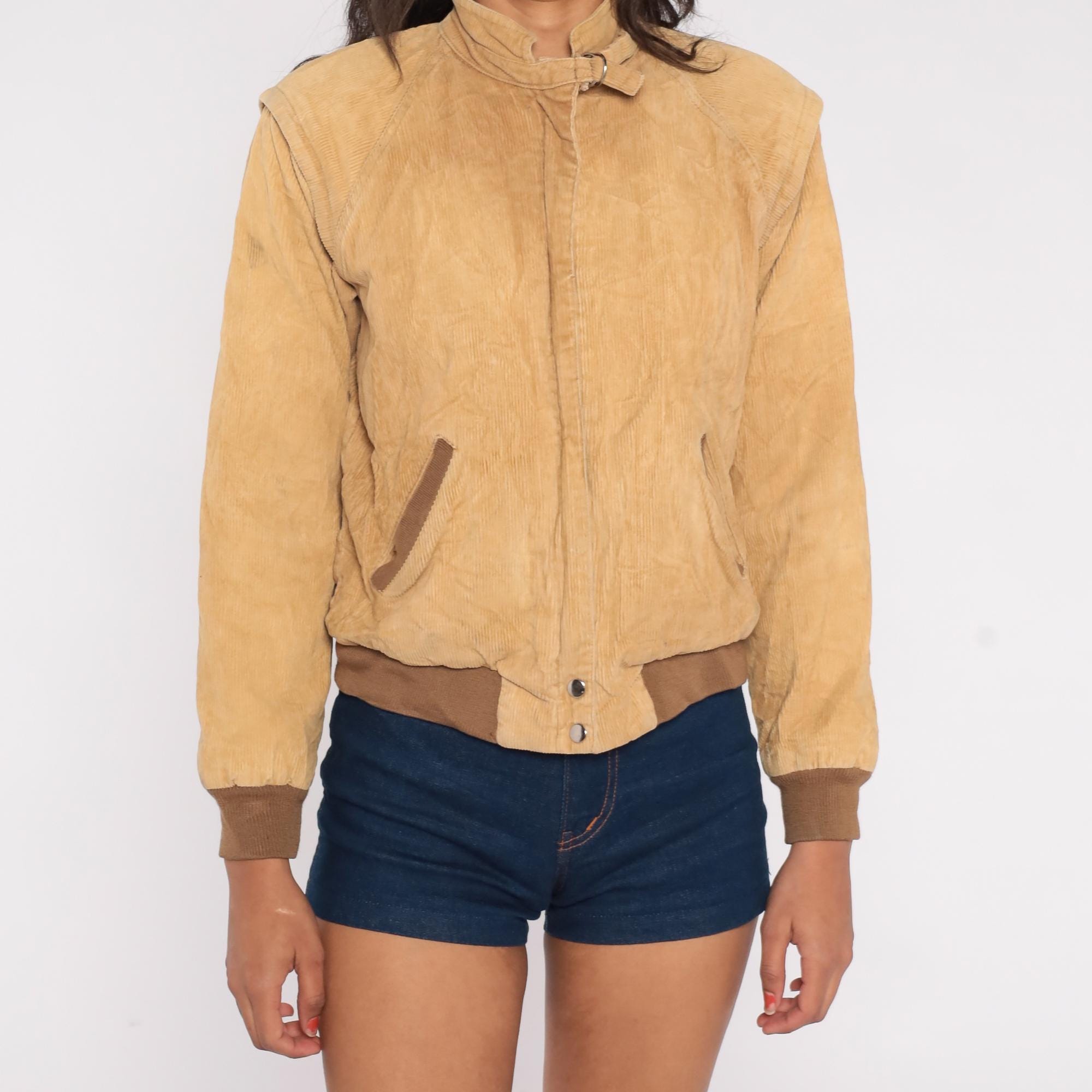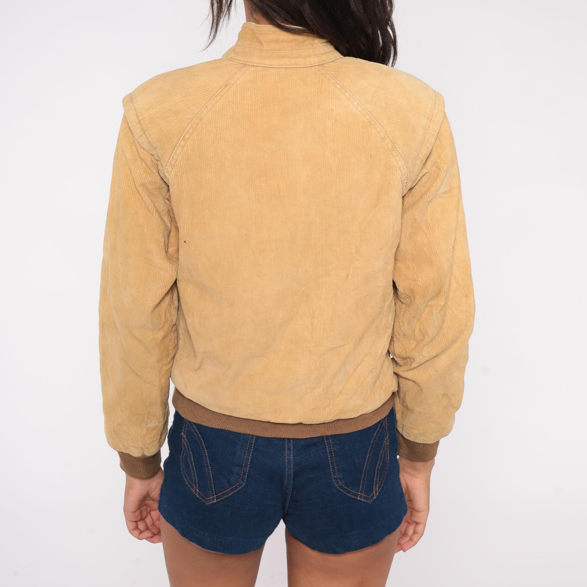 80s tan corduroy bomber jacket with ribbed brown knit collar, cuffs, and waistband. Front zip closure with snap button hem, buckle detail at collar, side slash pockets.