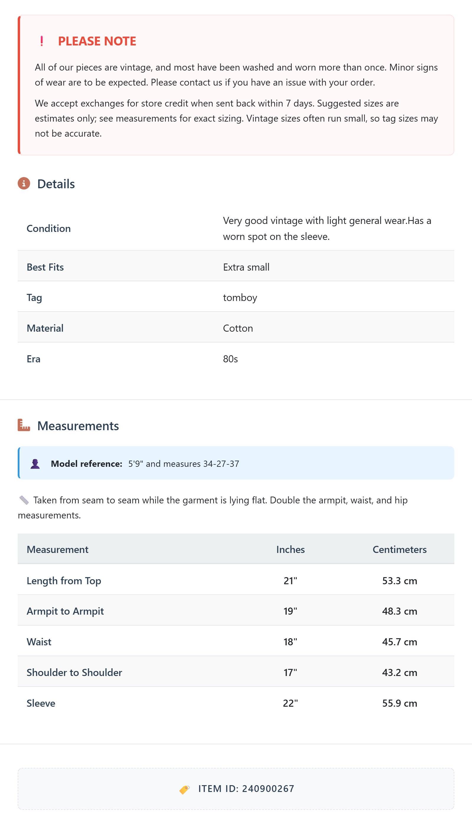 All of our pieces are vintage, and most have been washed and worn more than once. Minor signs of wear are to be expected. Please contact us if you have an issue with your order. We accept exchanges for store credit when sent back within 7 days.