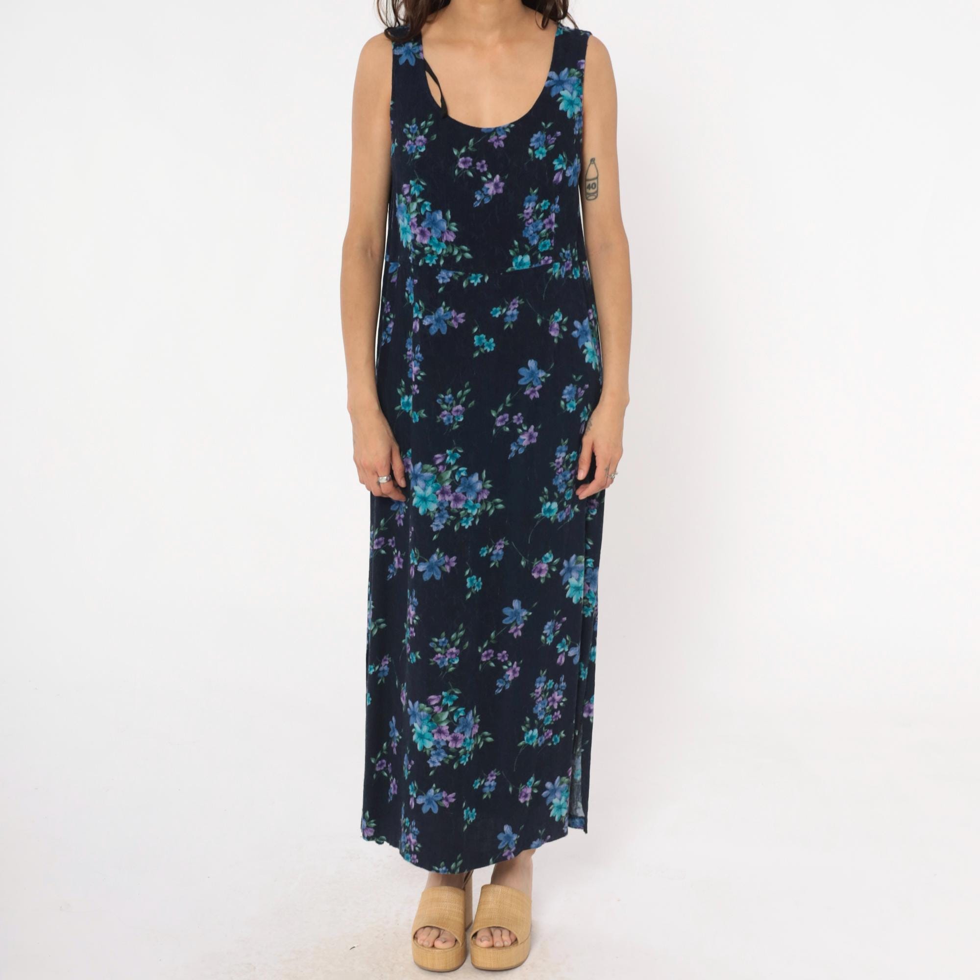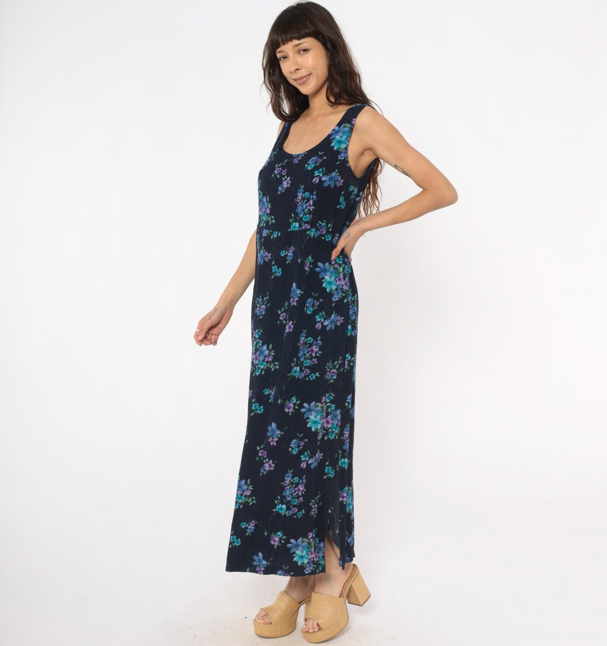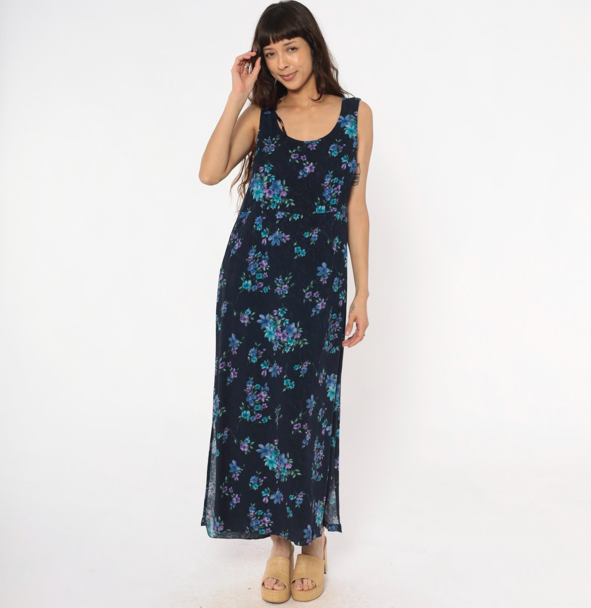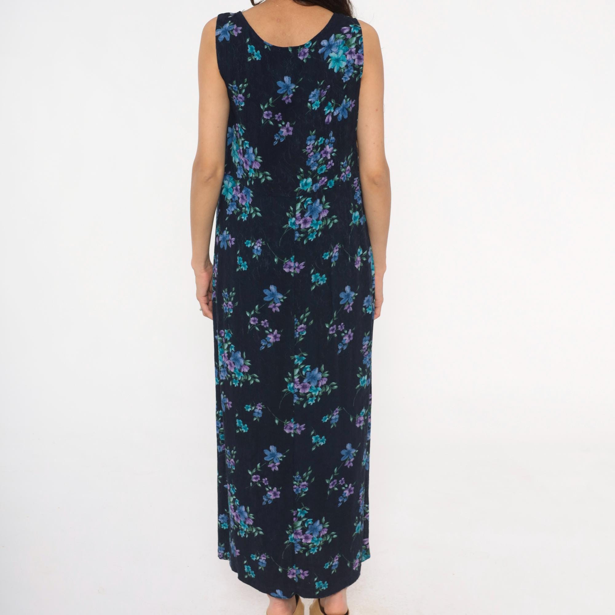 90s dark blue floral maxi dress from karin stevens with scattered blue, purple, and teal flowers across the fabric. Sleeveless tank style with scoop neckline and relaxed fit through the body.
