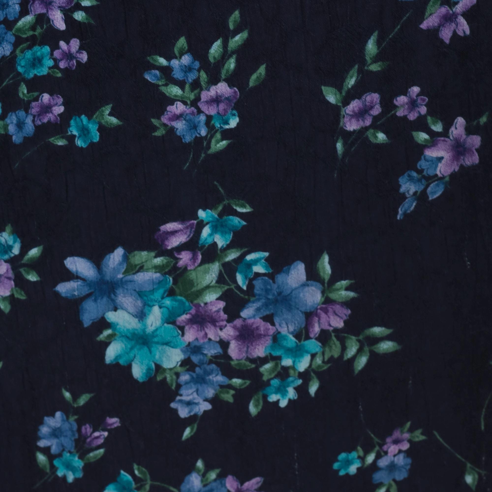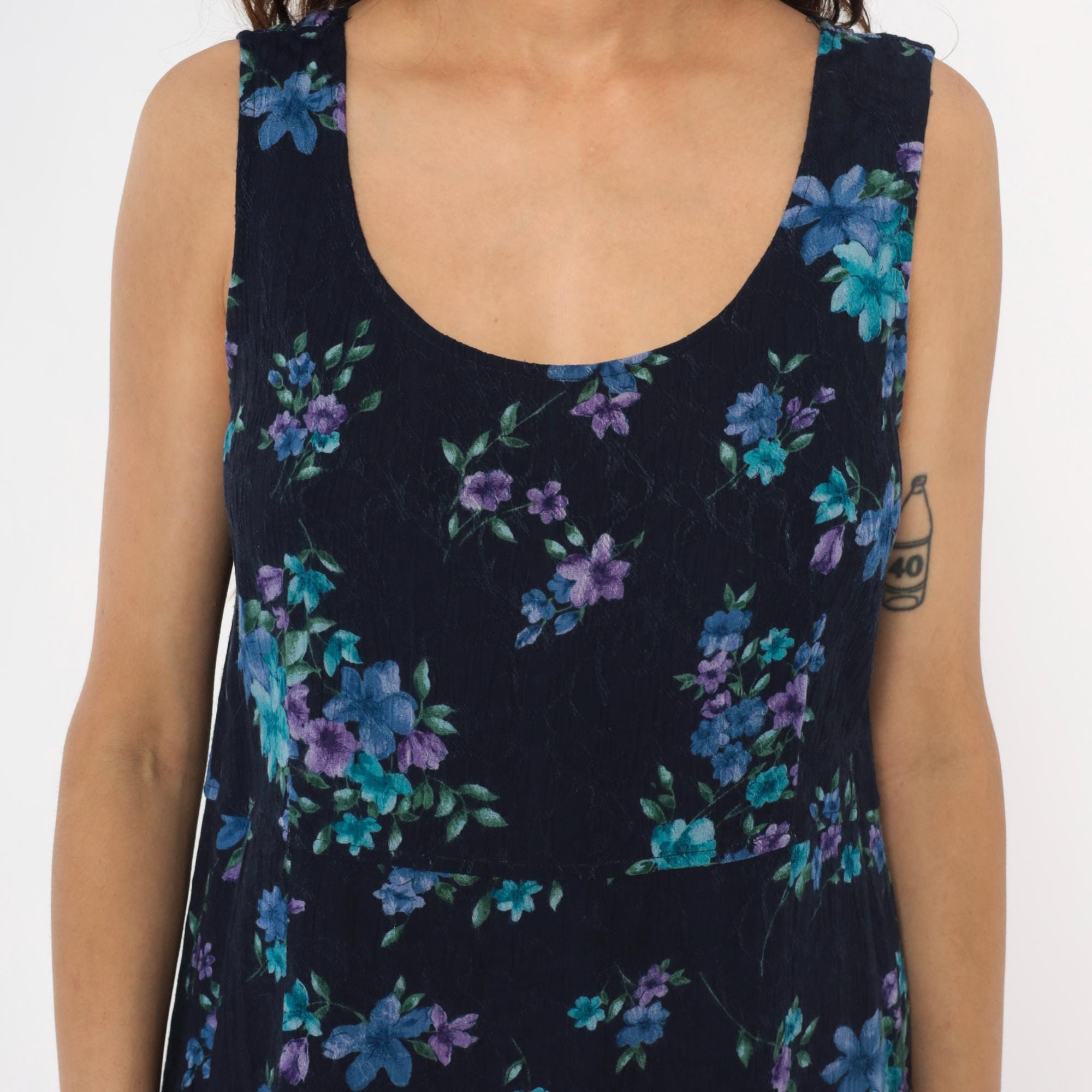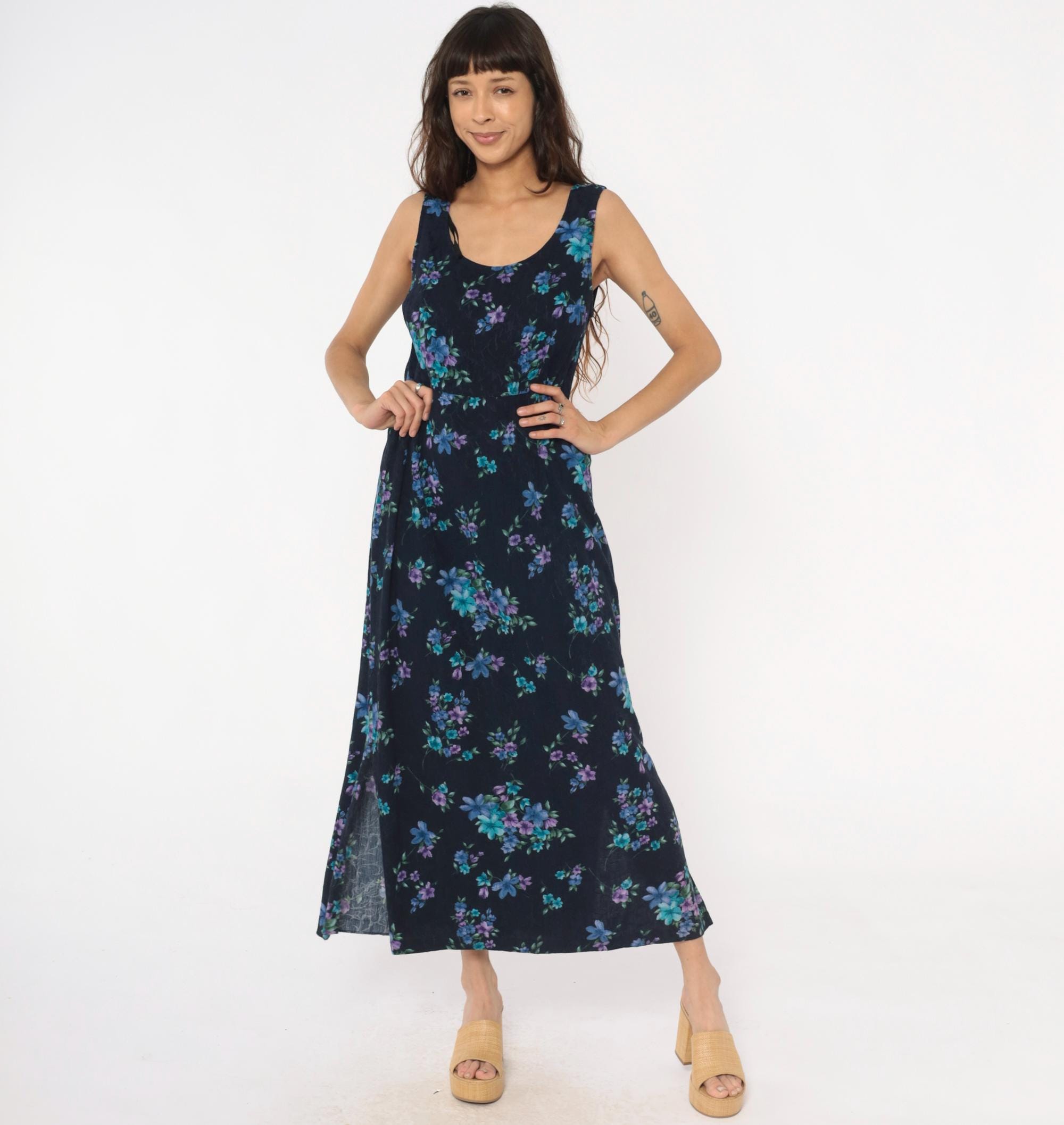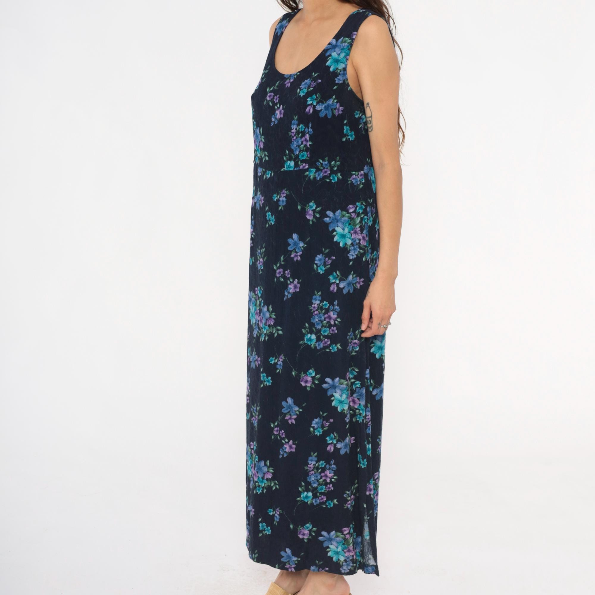 90s dark blue floral maxi dress from karin stevens with scattered blue, purple, and teal flowers across the fabric. Sleeveless tank style with scoop neckline and relaxed fit through the body.