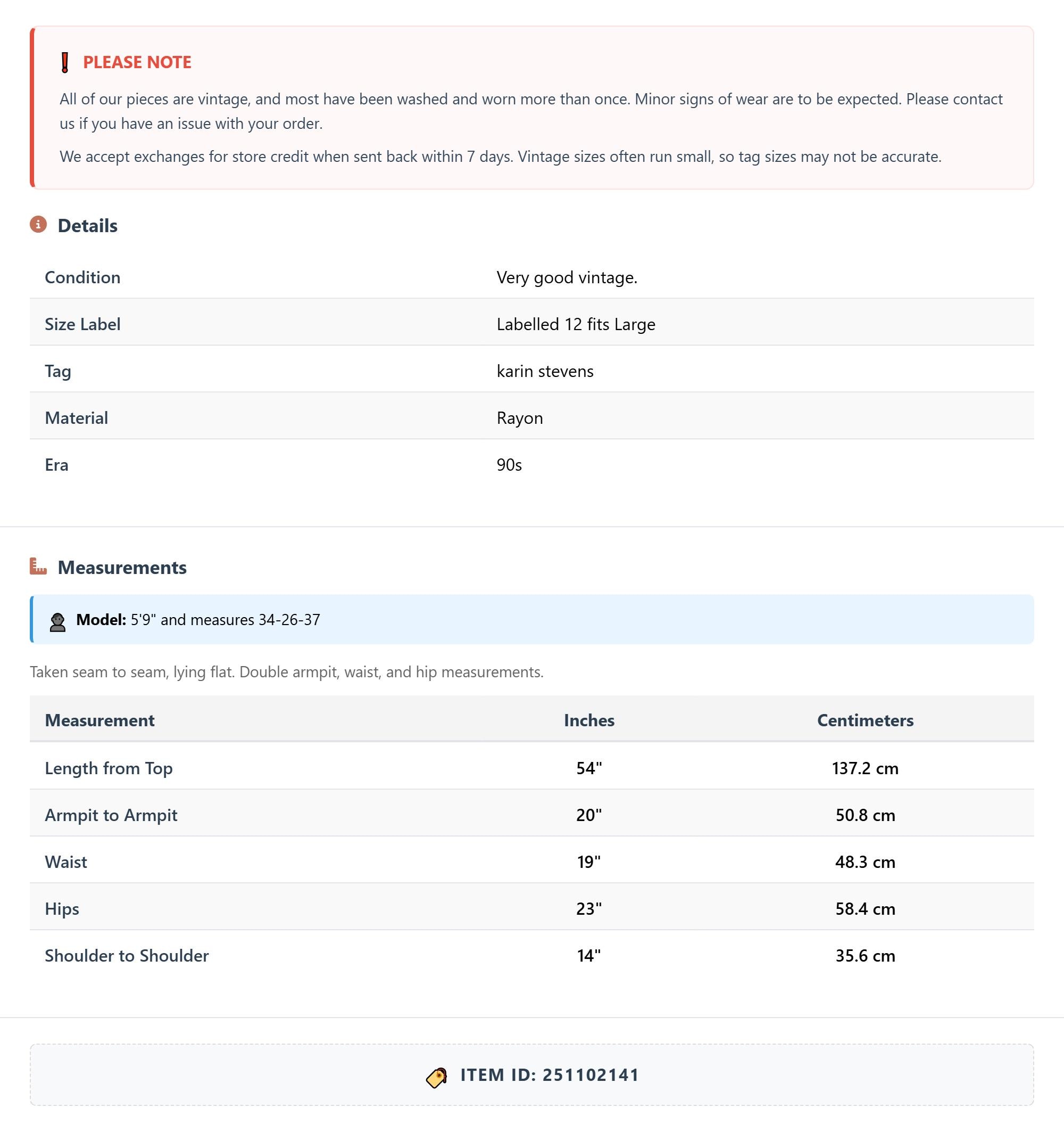 Measurements are taken laying flat and should be doubled where applicable. The "best fits" size is just an estimate, and vintage sizing can vary from modern sizing. Please use measurements to ensure proper fit. The best thing to do is measure a similar item of your own, and compare. When an item has stretch, we will list the unstretched dimensions with the stretched measurement afterwards.