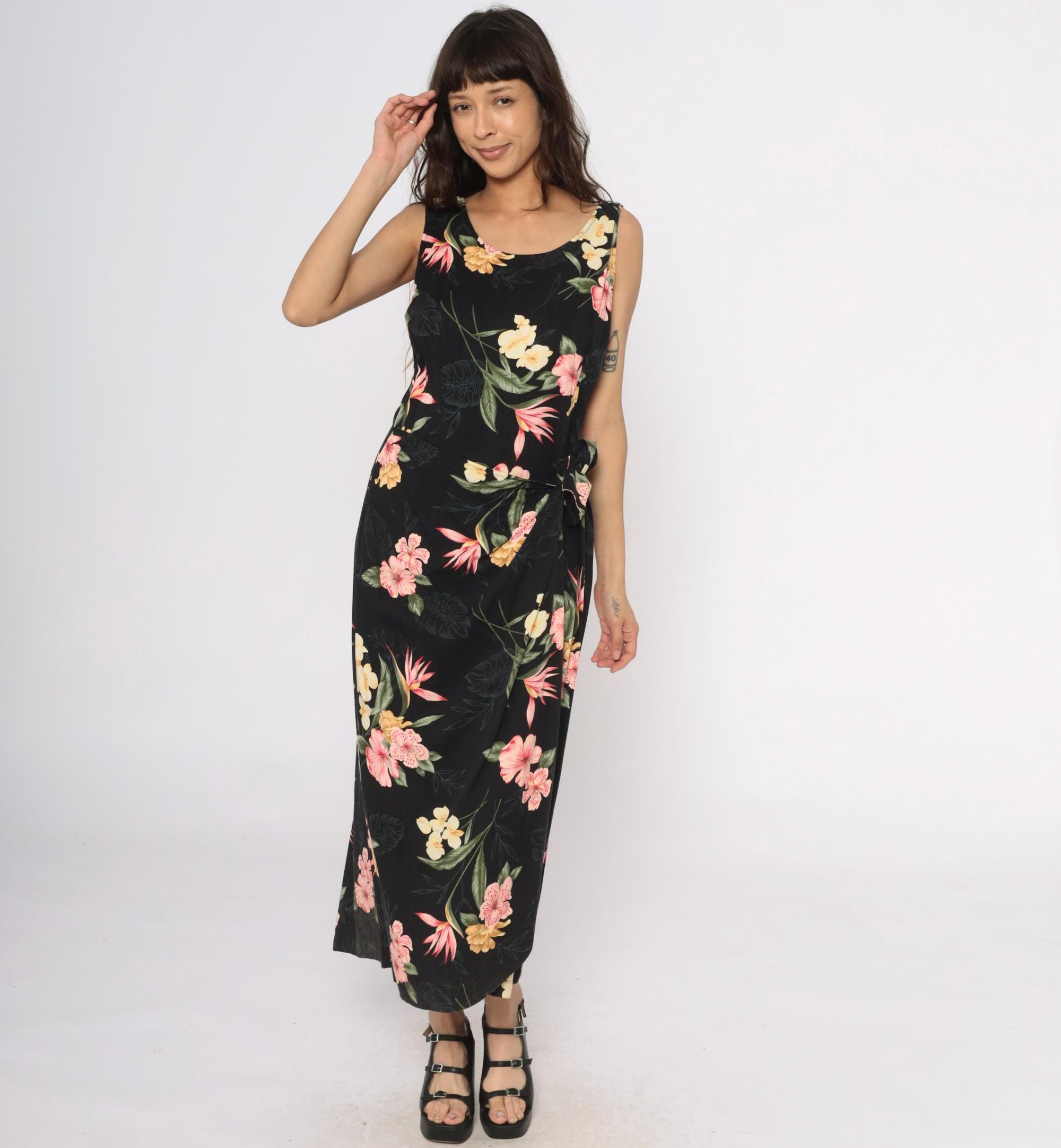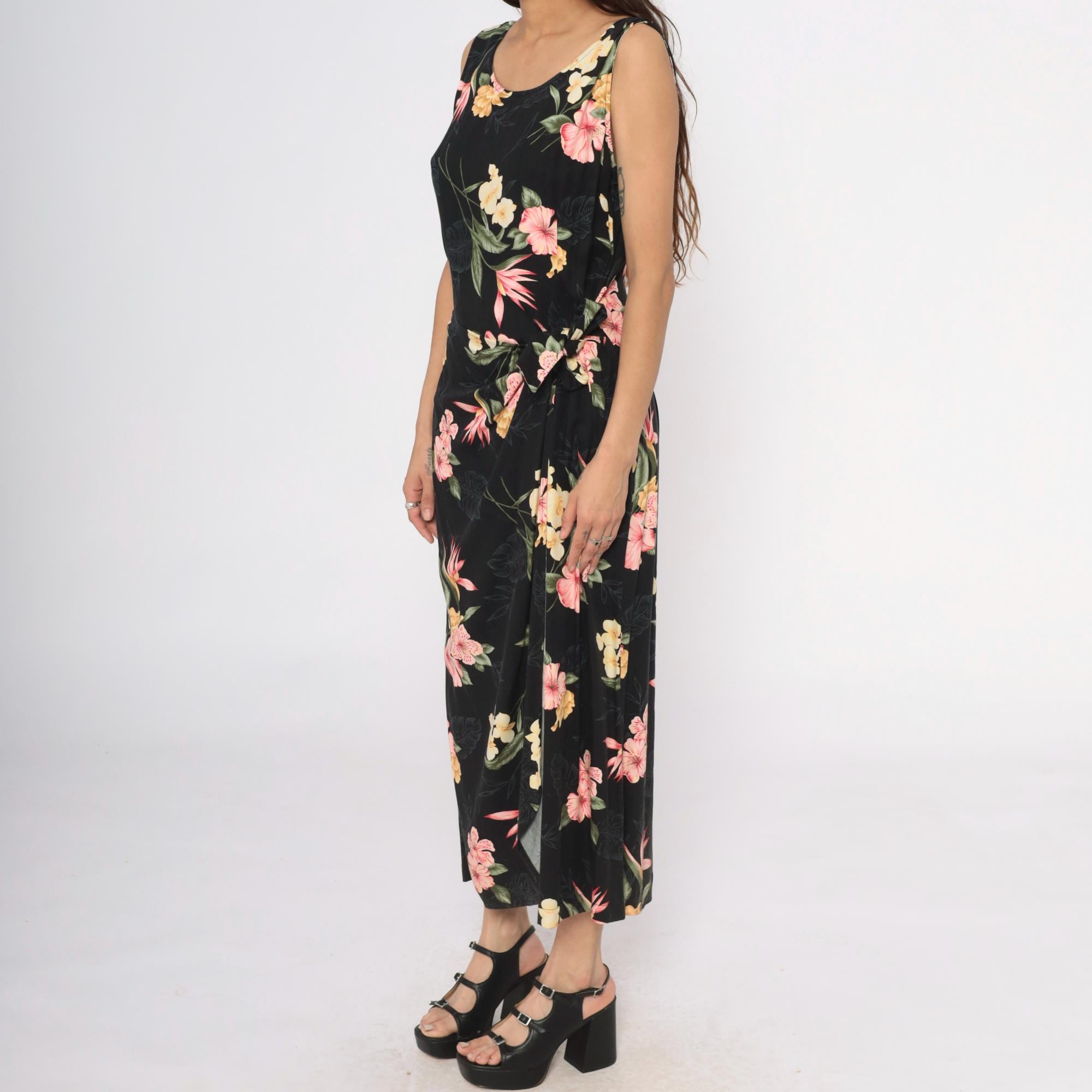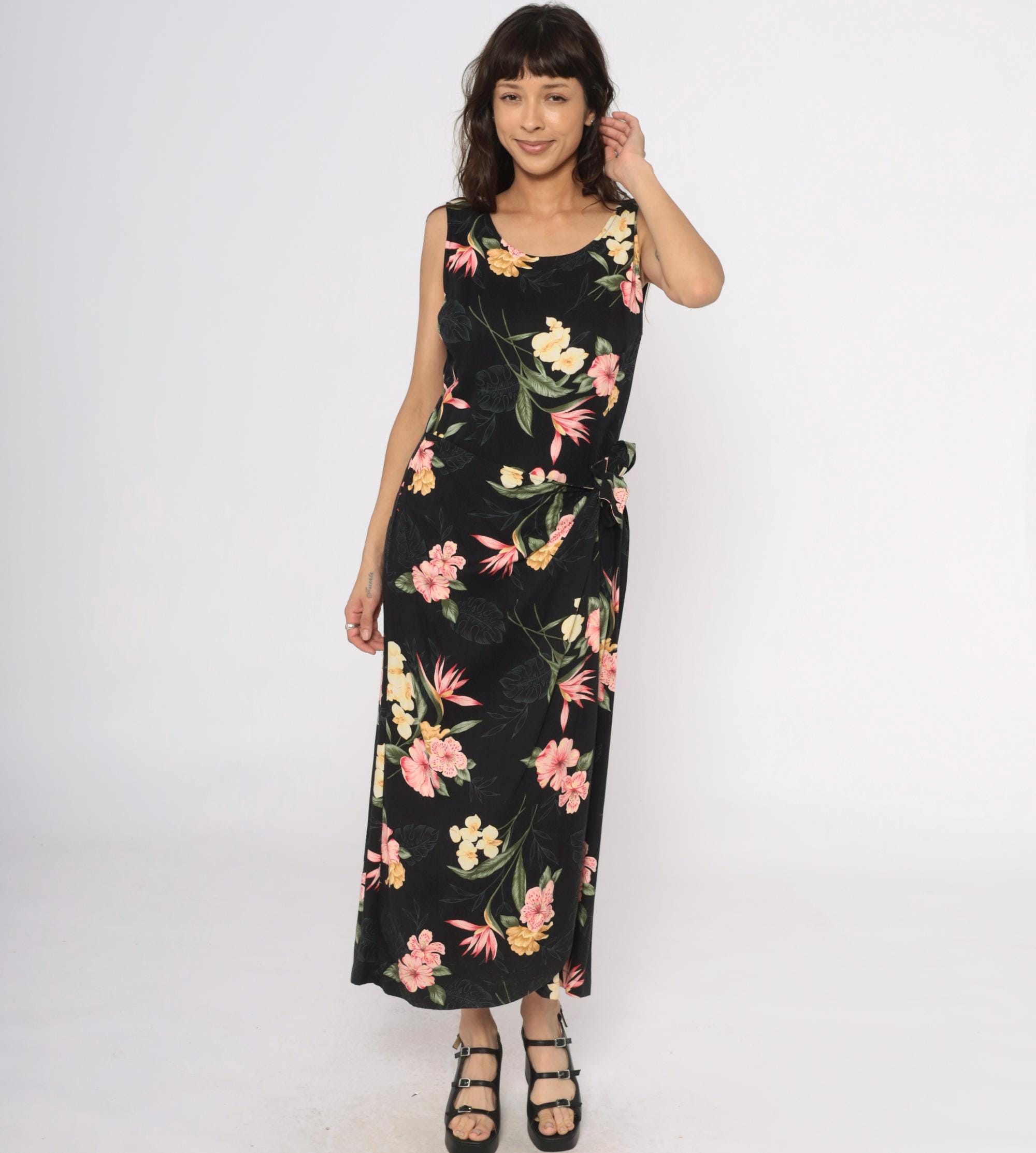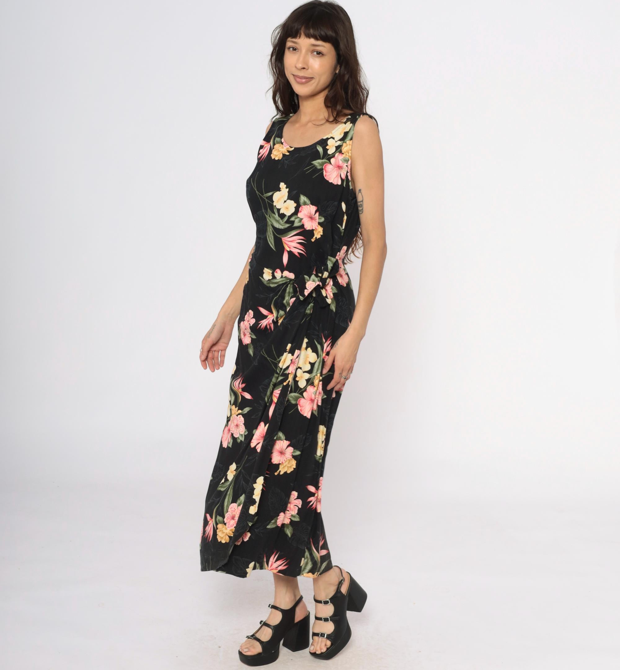 90s black floral maxi dress from caribbean joe with tropical print in pink, yellow, and green. Sleeveless design with scoop neckline front and back, side tie closure at waist.