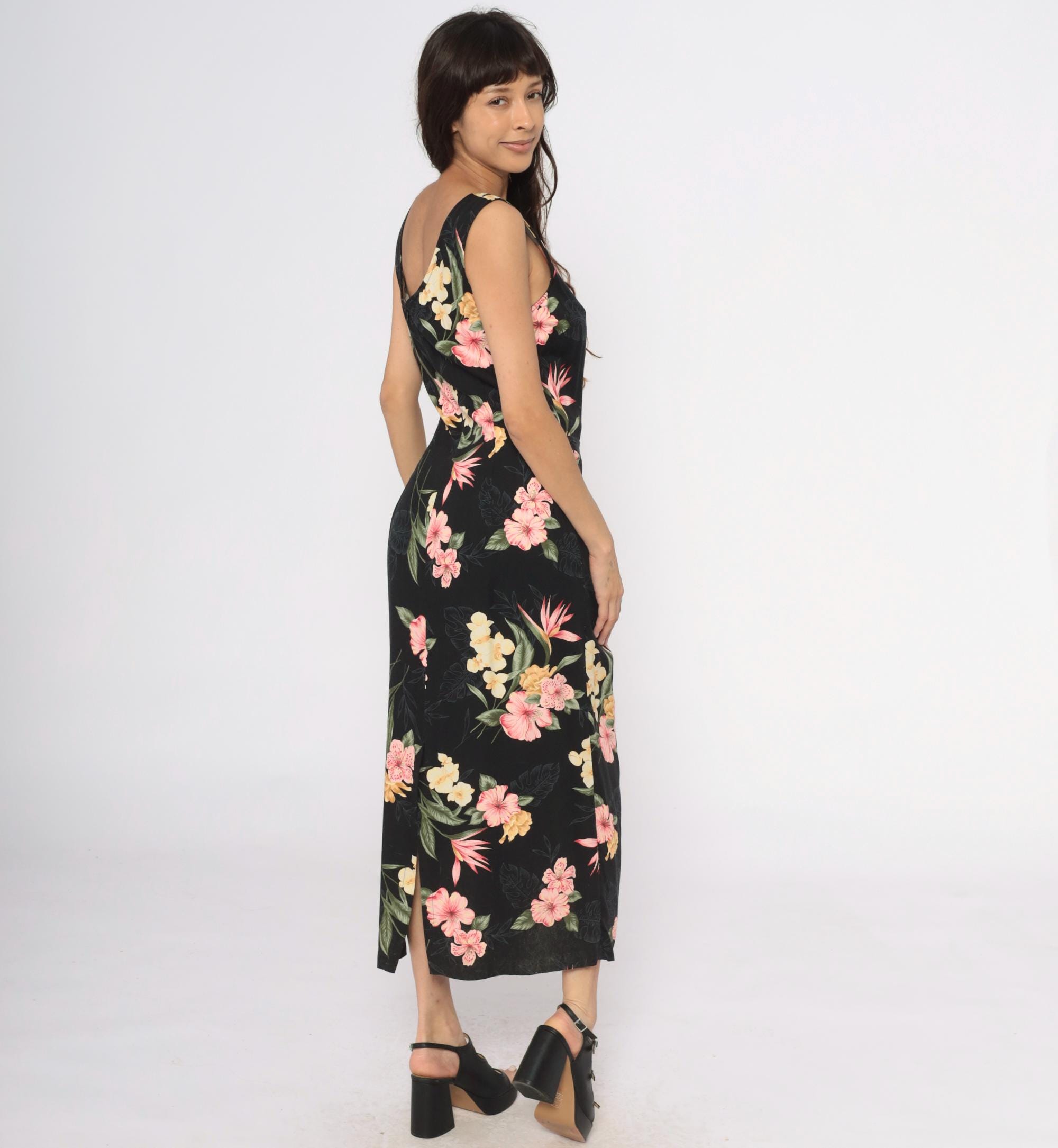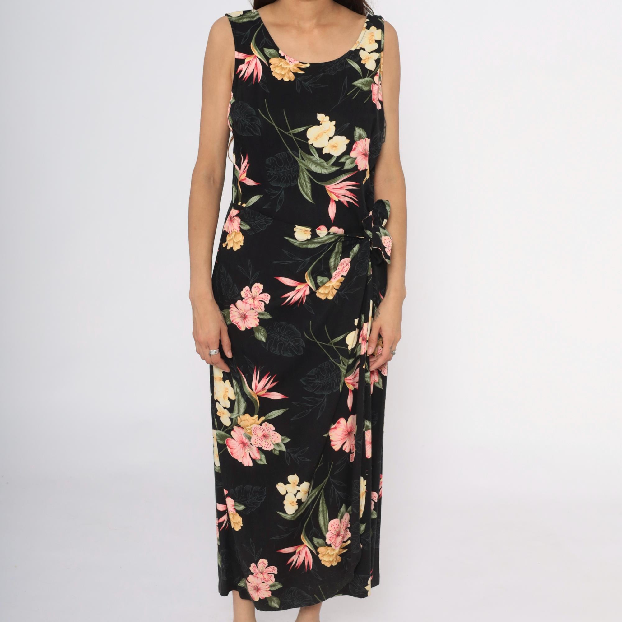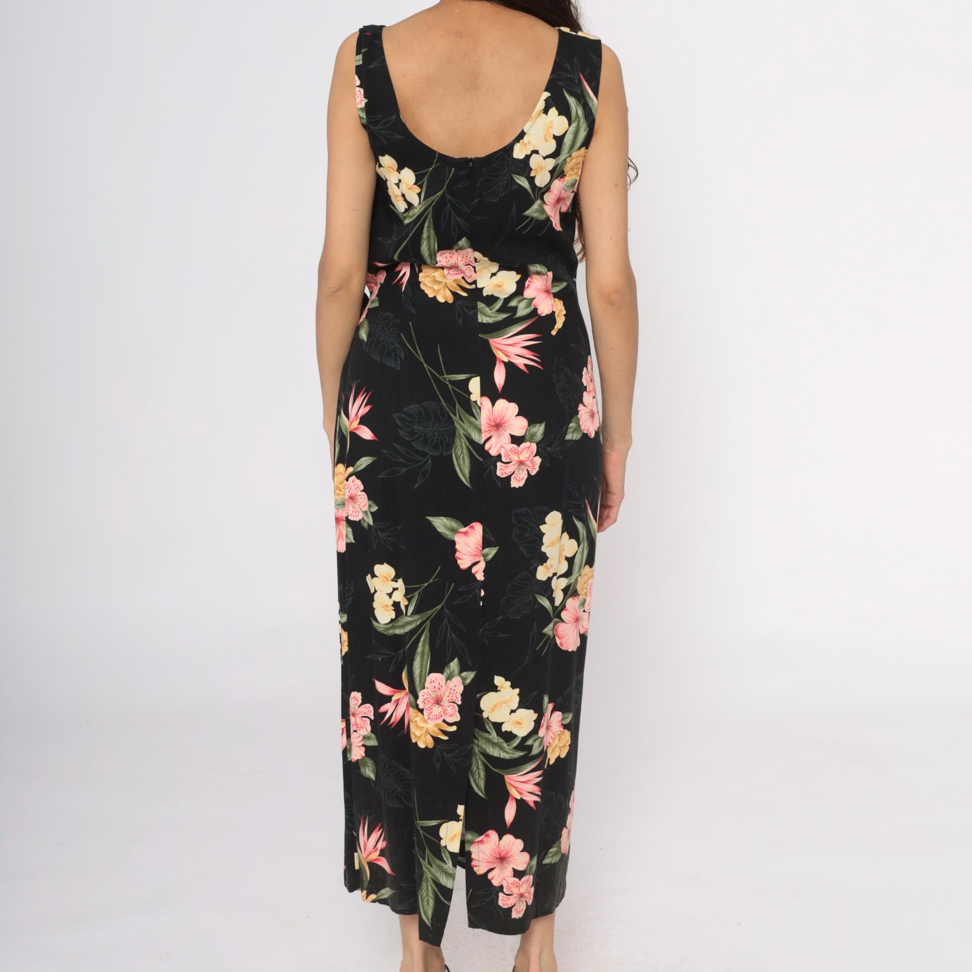 90s black floral maxi dress from caribbean joe with tropical print in pink, yellow, and green. Sleeveless design with scoop neckline front and back, side tie closure at waist.