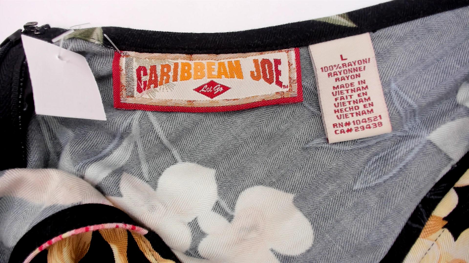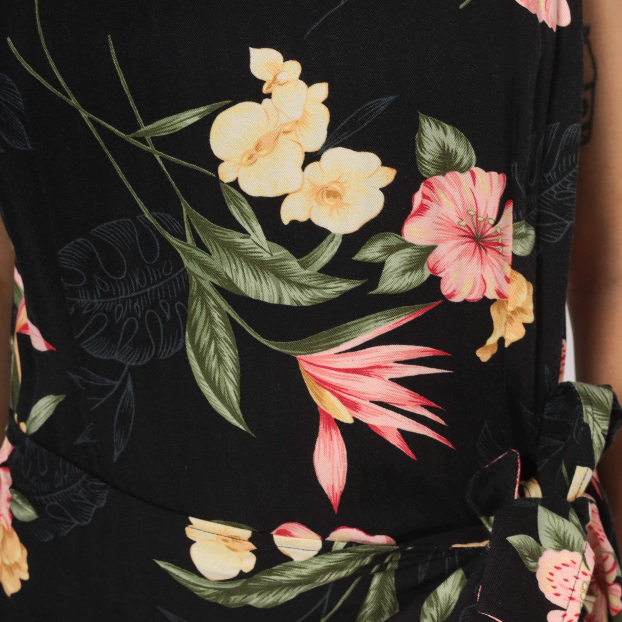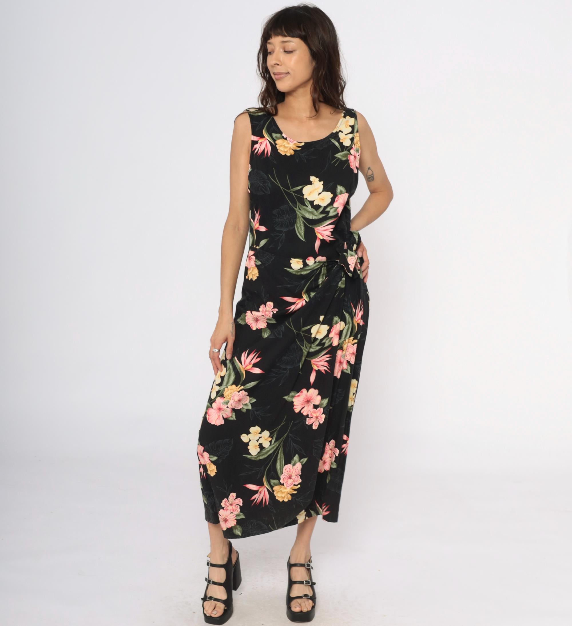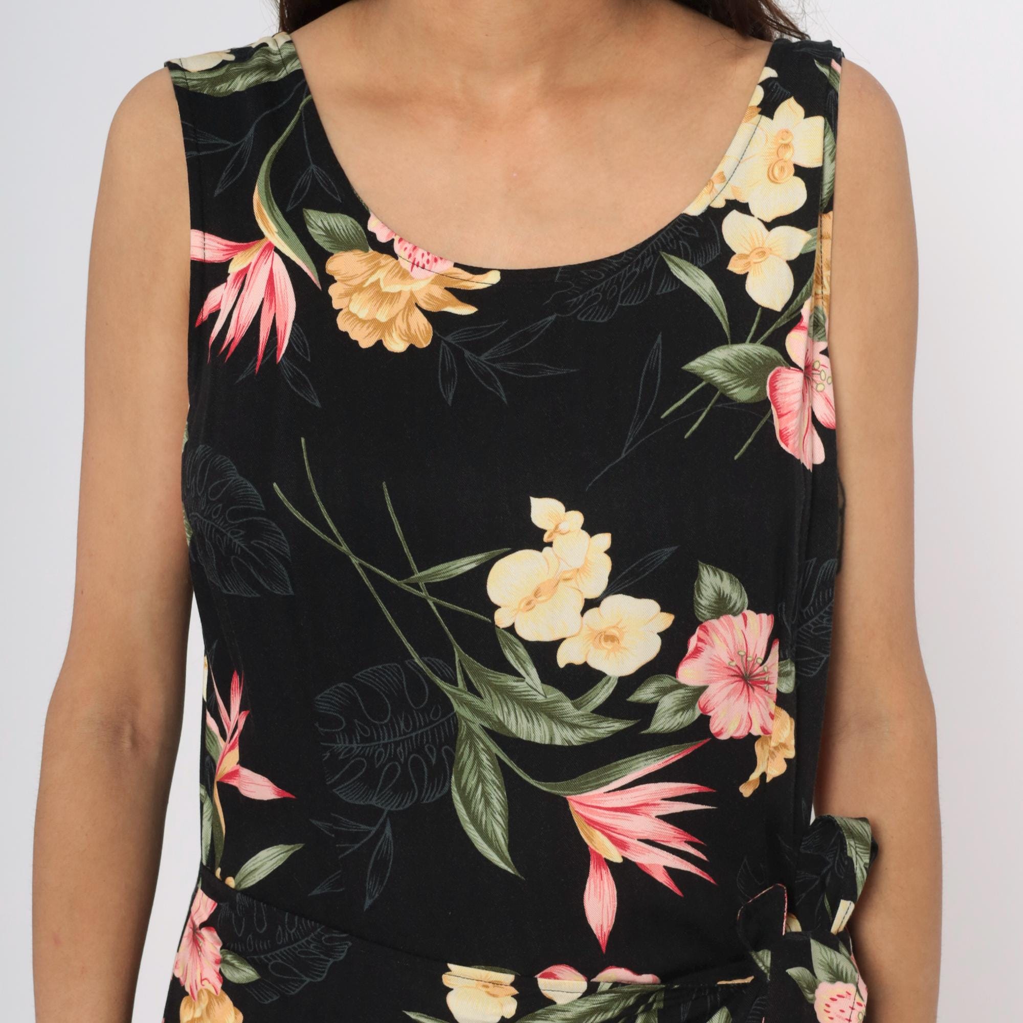 90s black floral maxi dress from caribbean joe with tropical print in pink, yellow, and green. Sleeveless design with scoop neckline front and back, side tie closure at waist.
