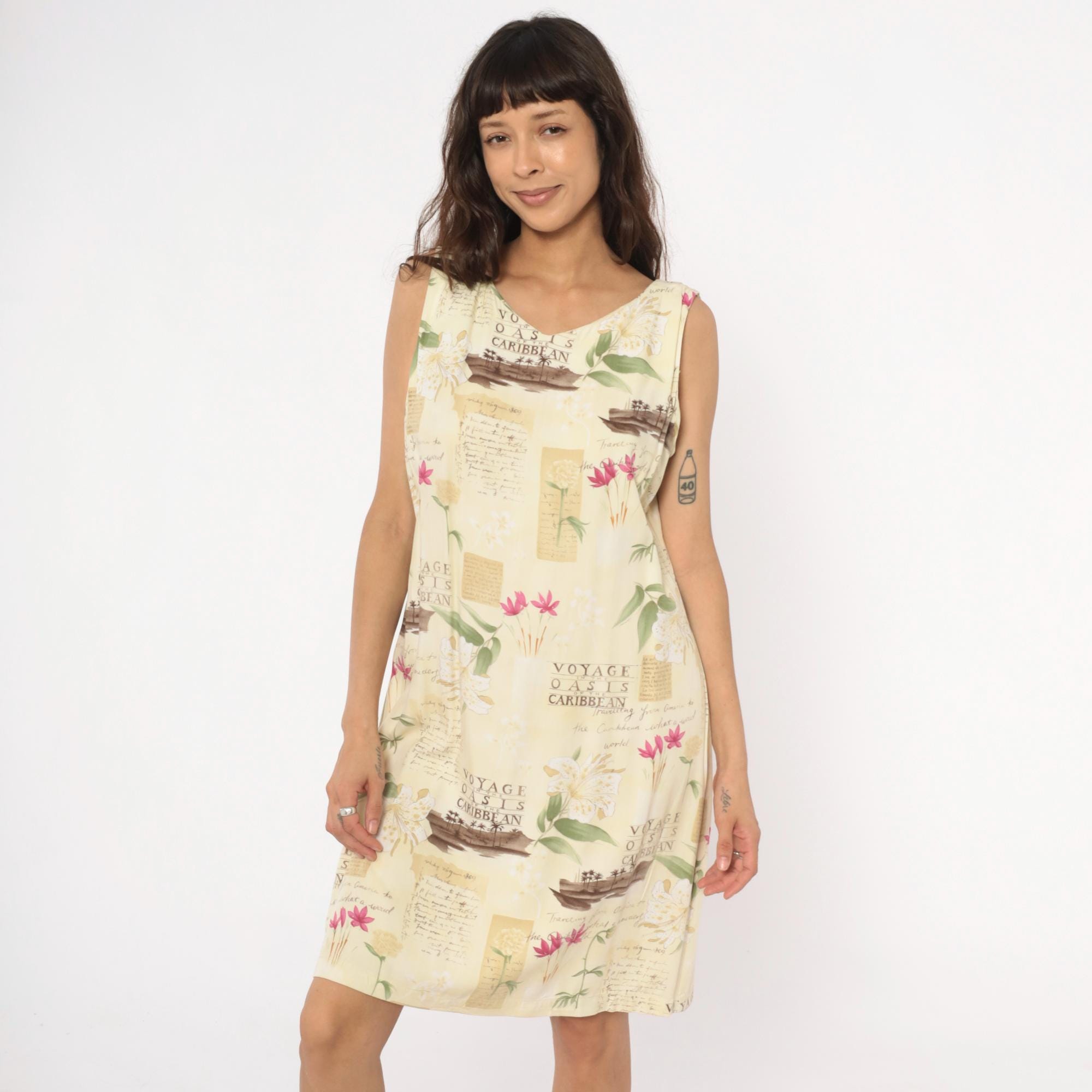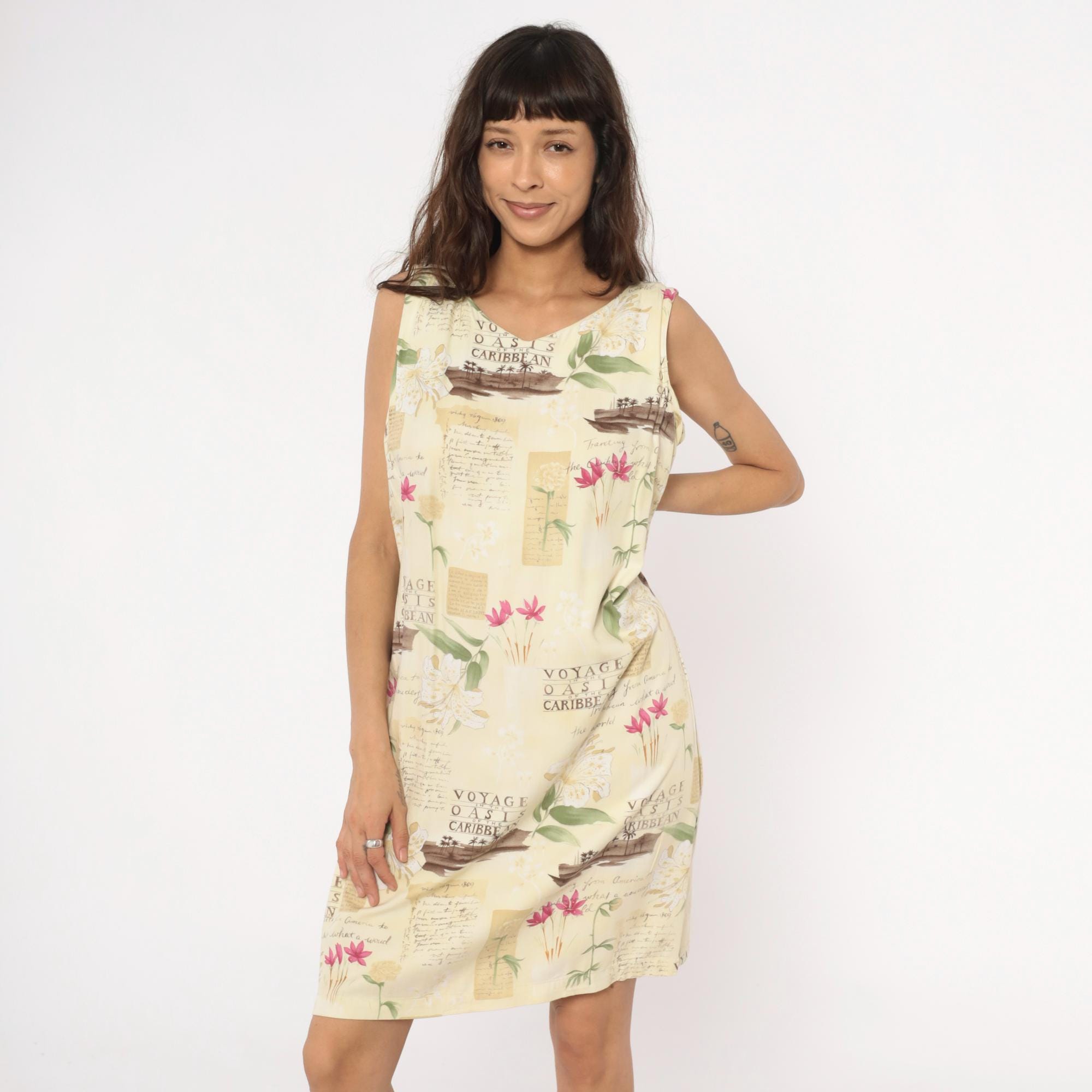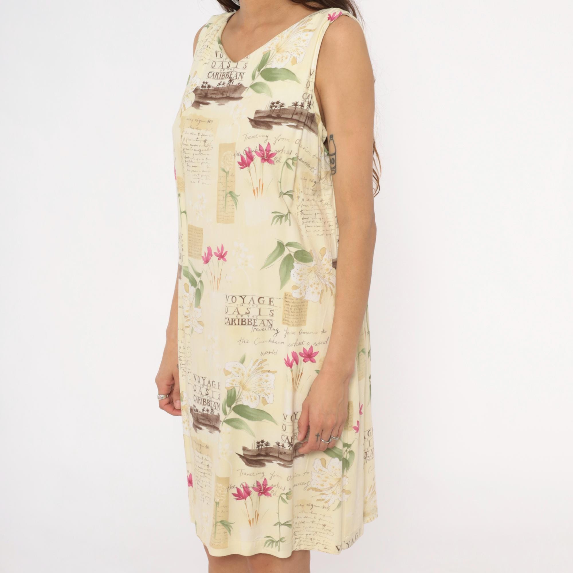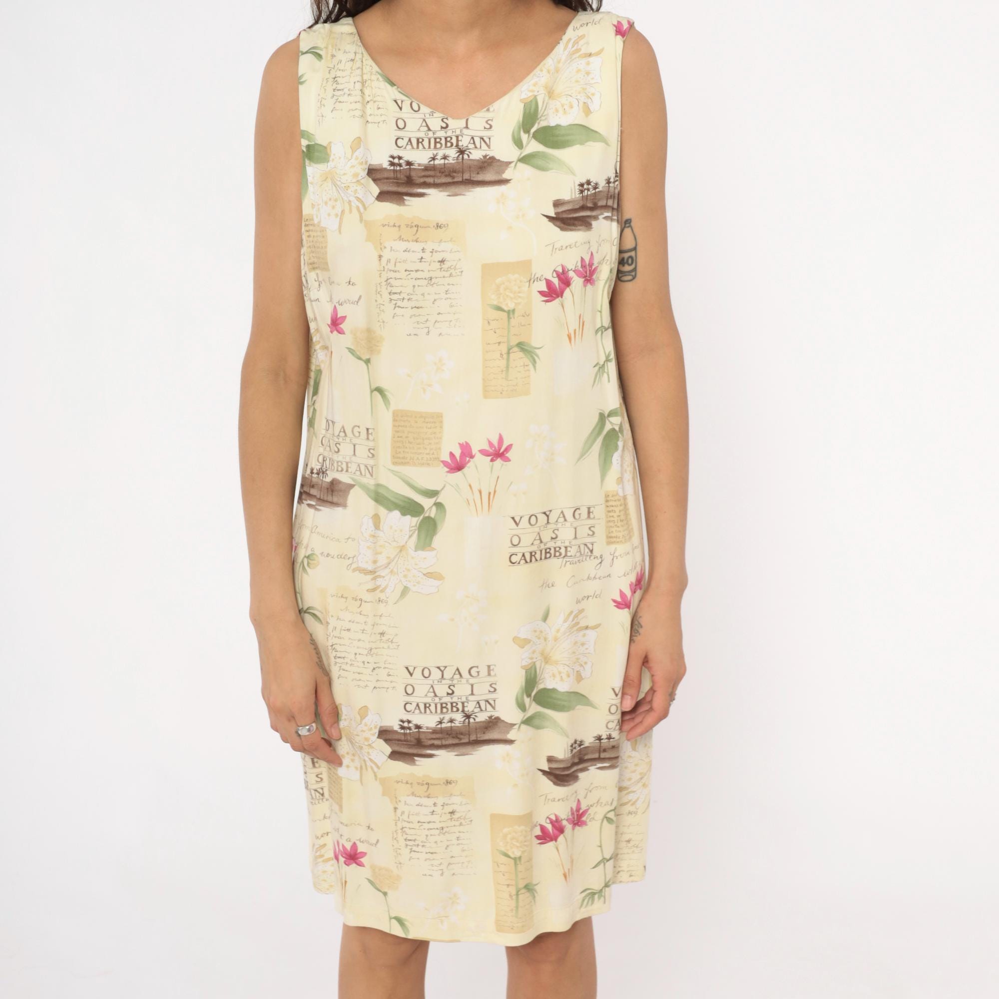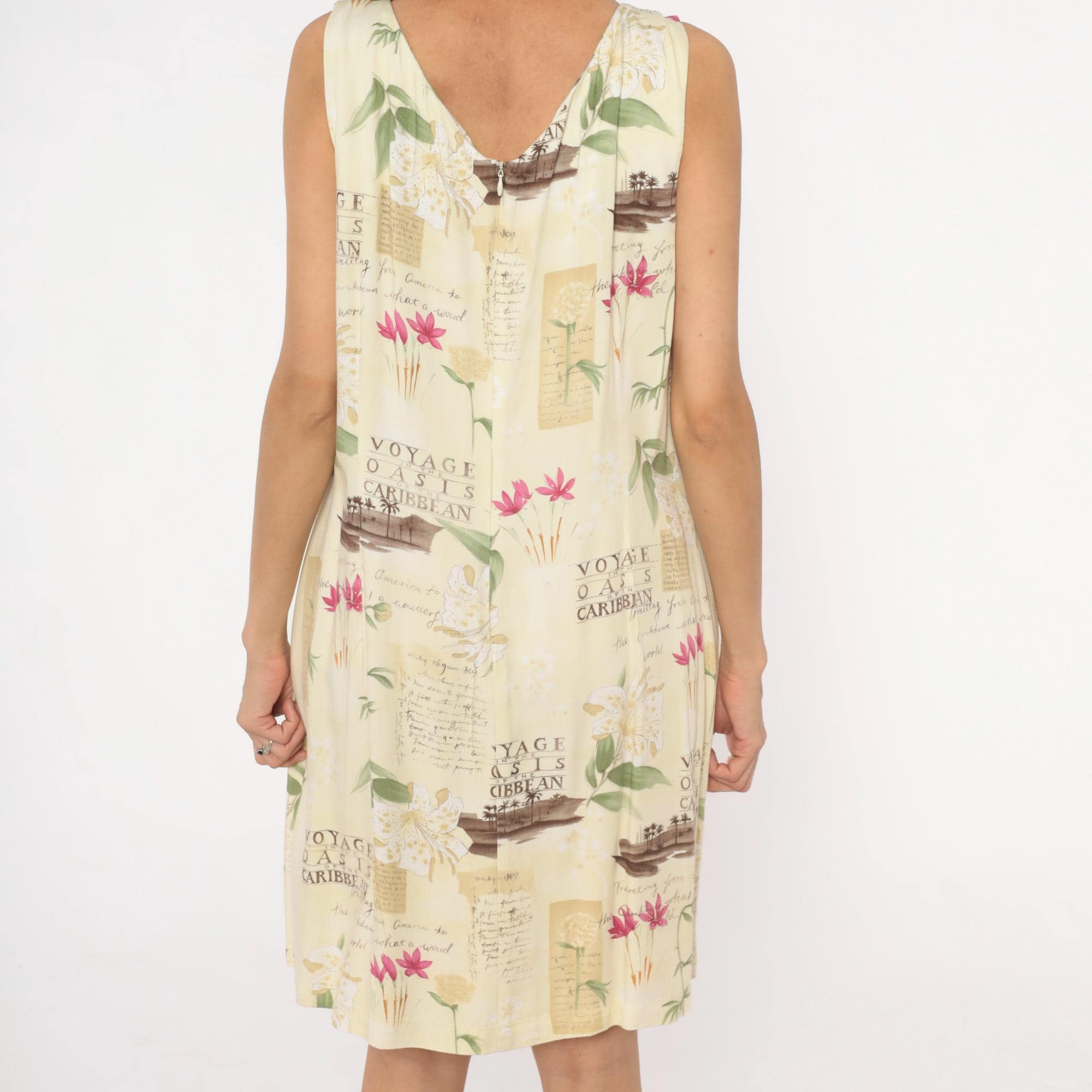 90s cream shift dress from Caribbean Joe with tropical novelty print featuring "Voyage Oasis of the Caribbean" text, sepia-toned boats, pink and white tropical flowers, and vintage postcard-style lettering across the fabric.
