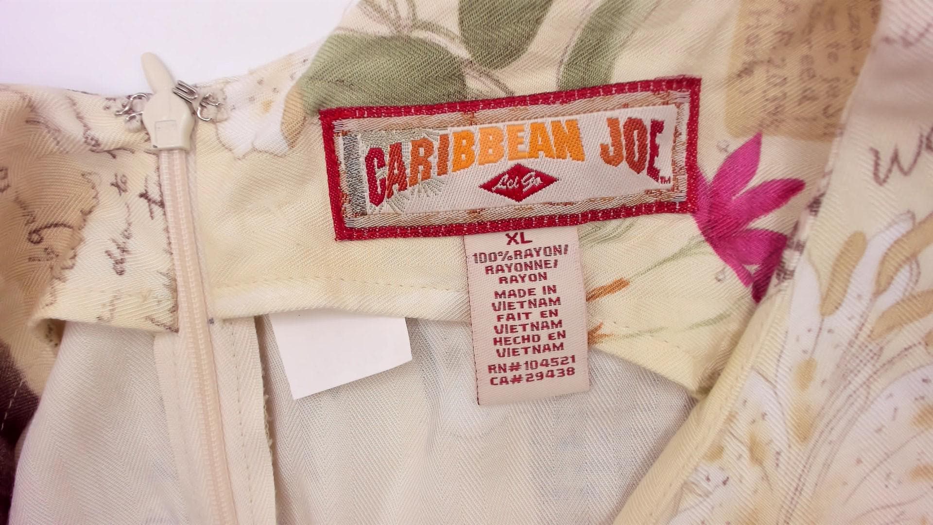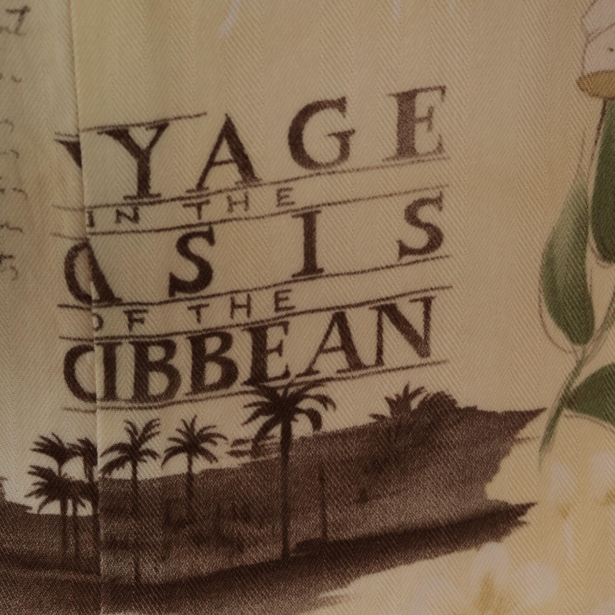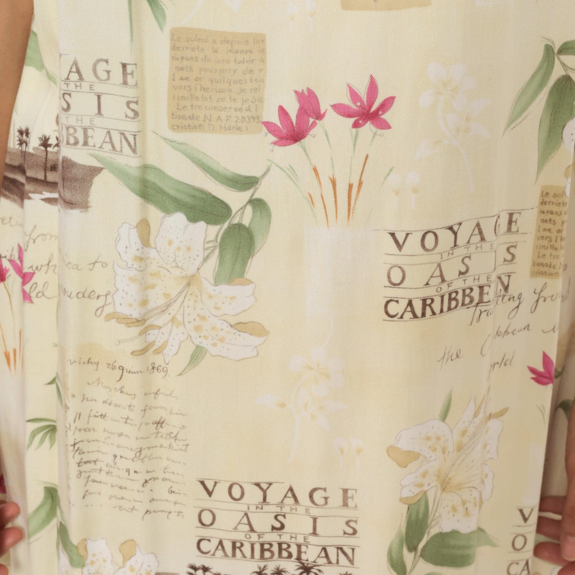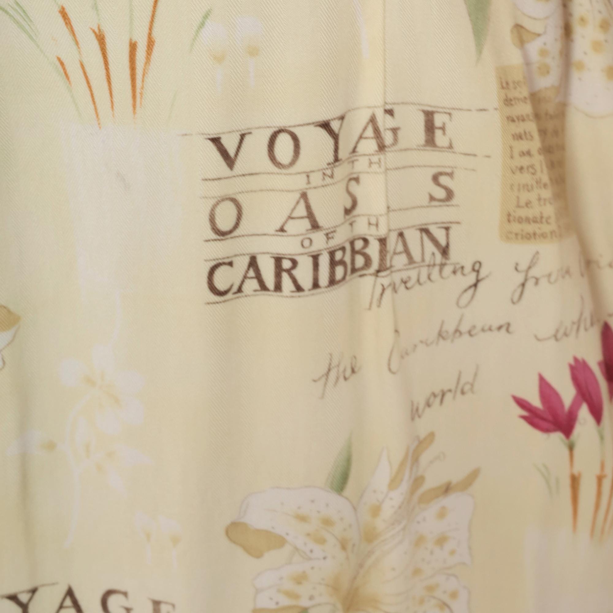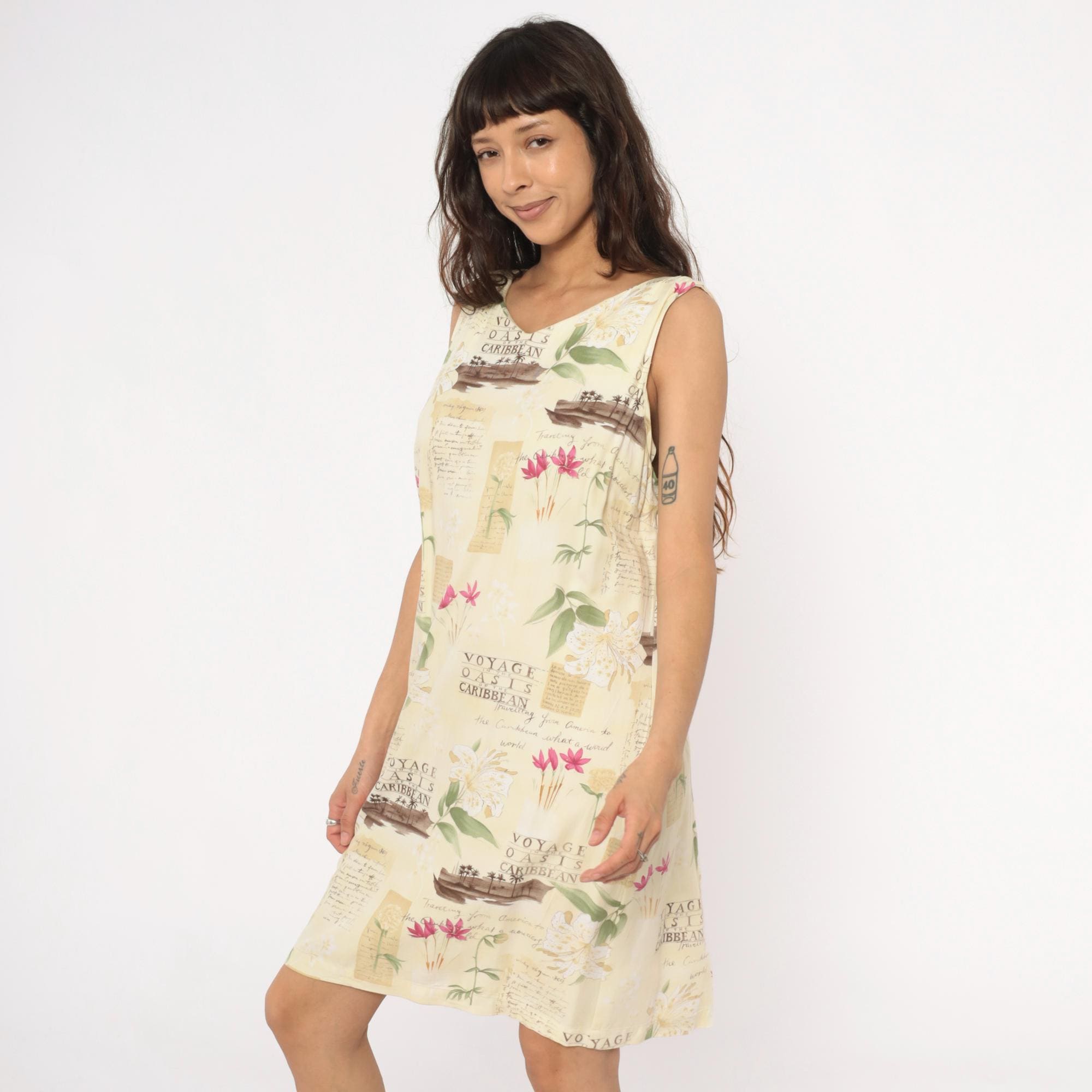90s cream shift dress from Caribbean Joe with tropical novelty print featuring "Voyage Oasis of the Caribbean" text, sepia-toned boats, pink and white tropical flowers, and vintage postcard-style lettering across the fabric.
