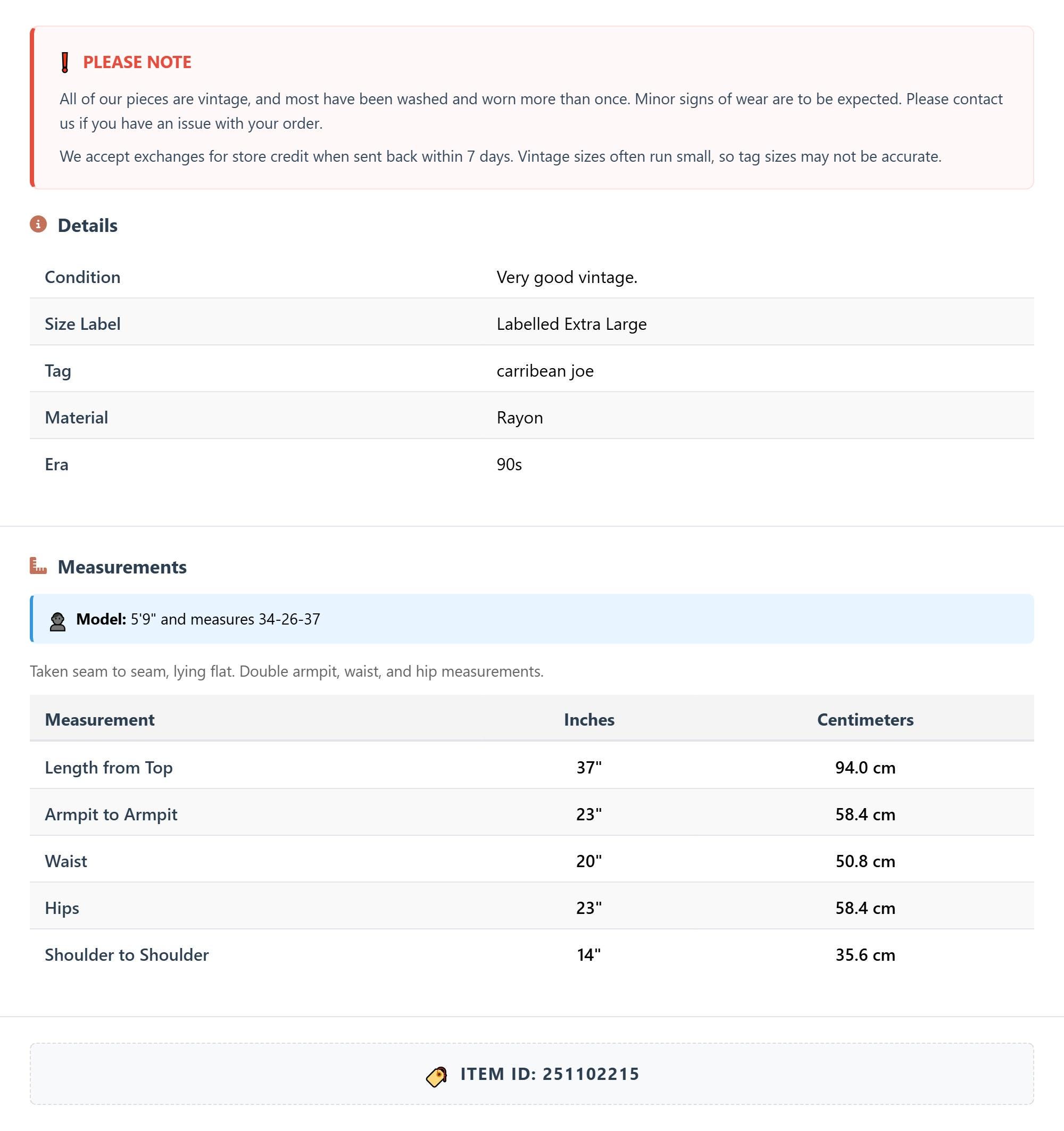 All of our pieces are vintage, and most have been washed and worn more than once. Minor signs of wear are to be expected. Please contact us if you have an issue with your order. We accept exchanges for store credit when sent back within 7 days.