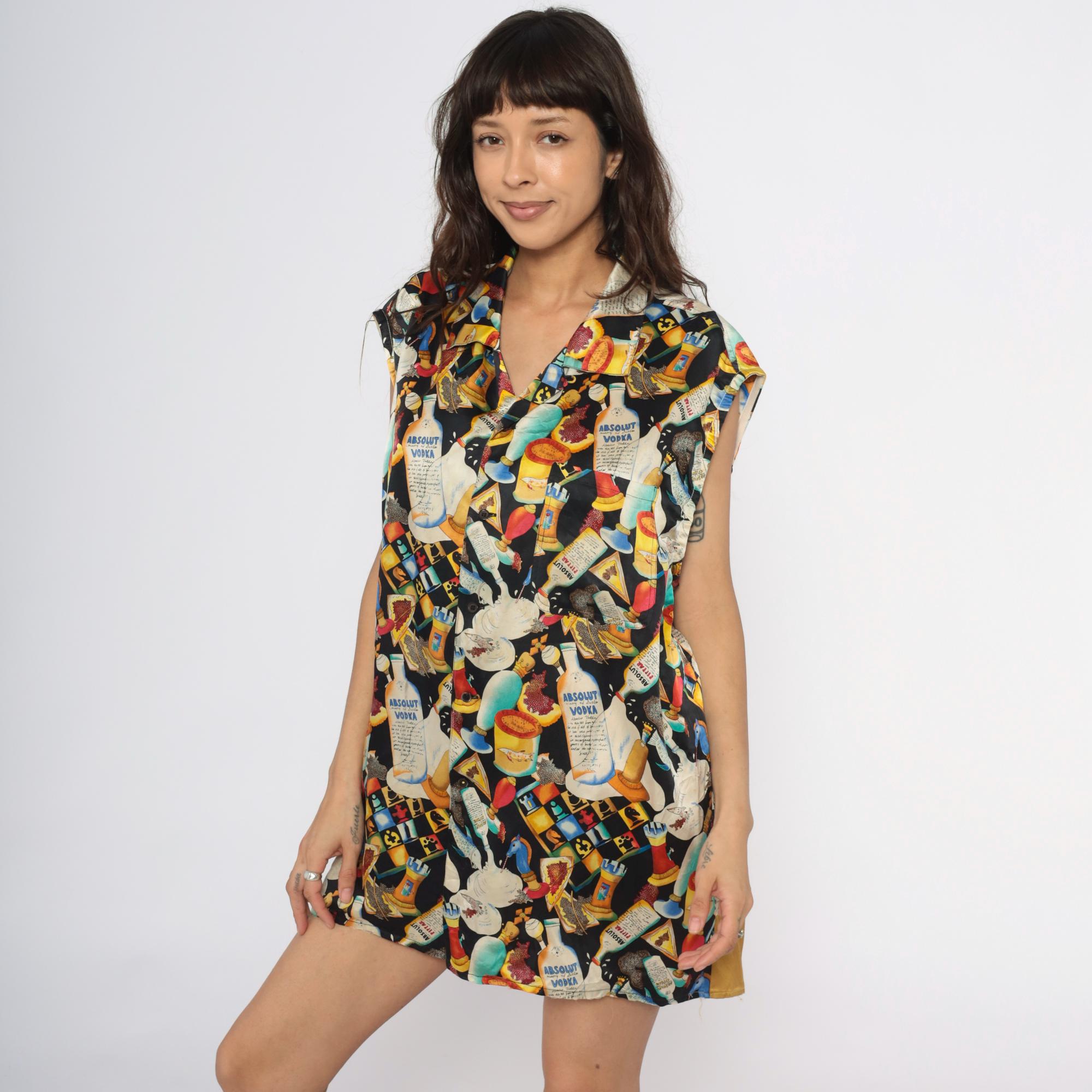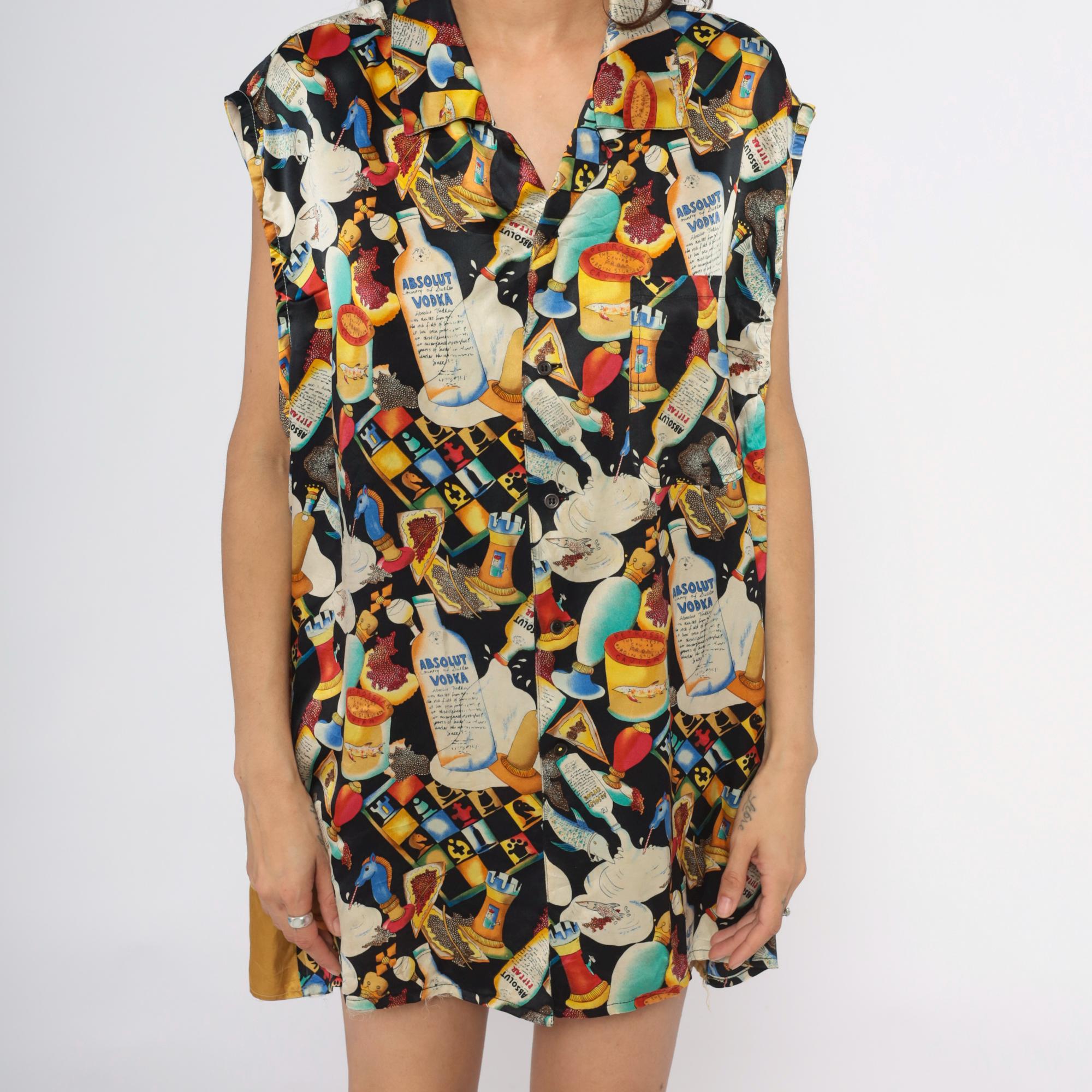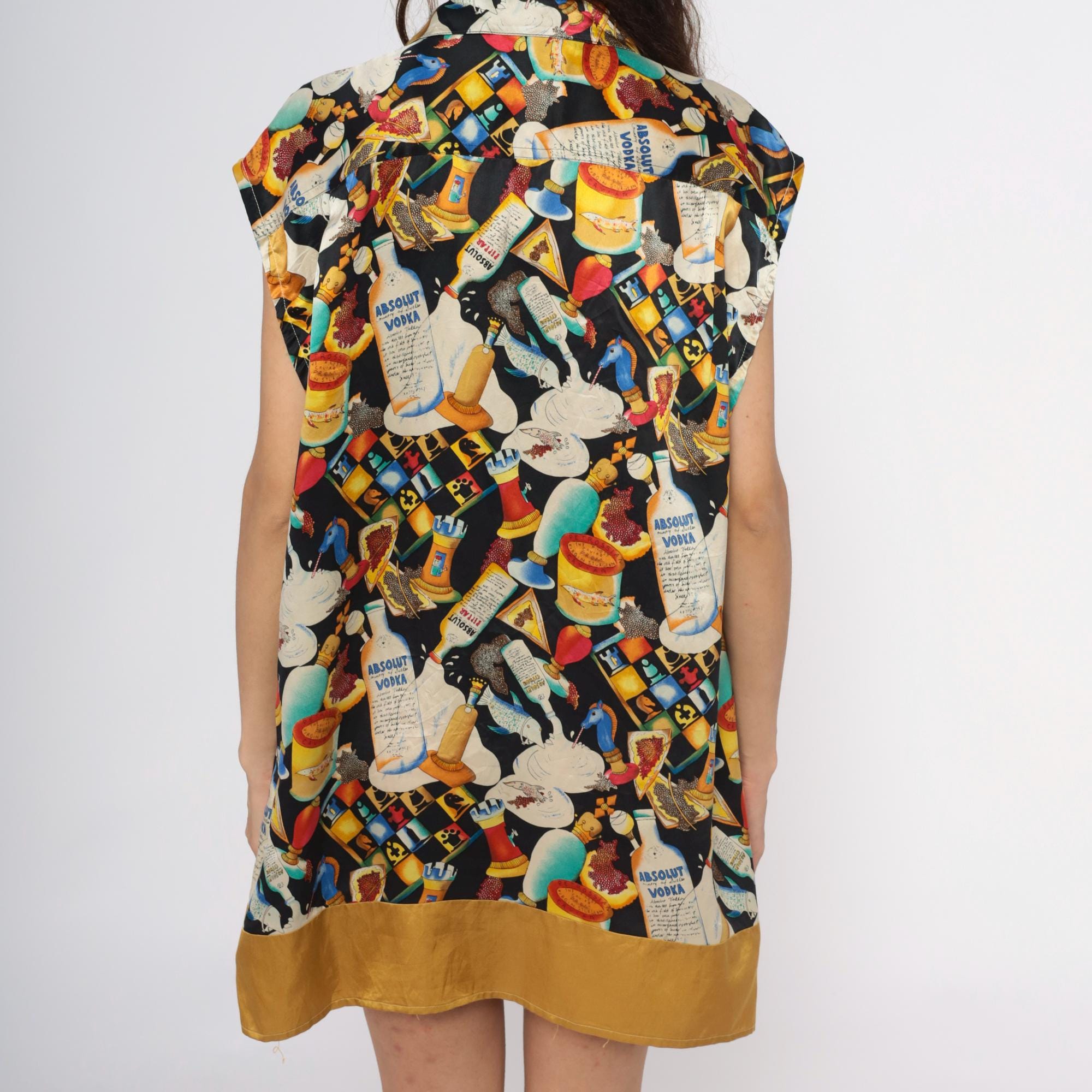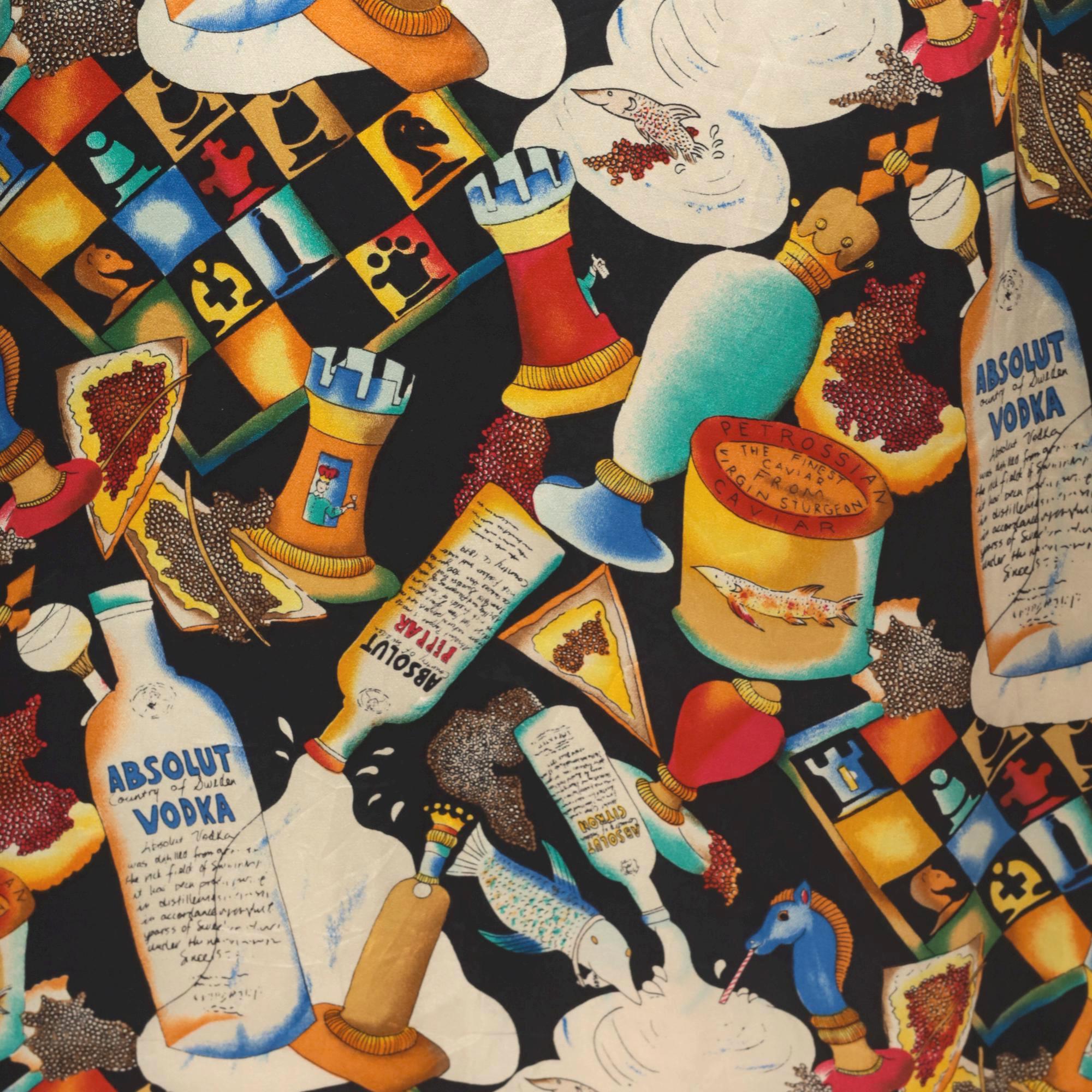 90s novelty print silk tunic from Nicole Miller featuring Absolut Vodka bottles, cocktails in various glasses, playing cards, caviar tins, and ice cream imagery scattered across a black background. Sleeveless with collar and lapels, button front closure, contrast gold hem band at bottom.