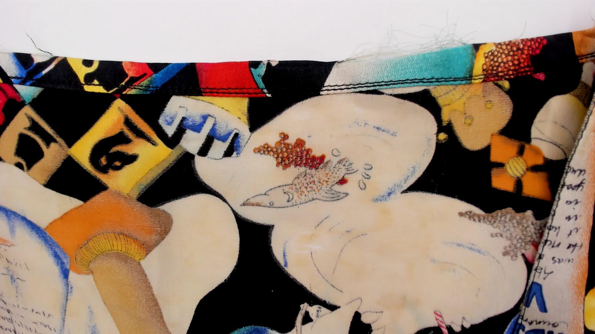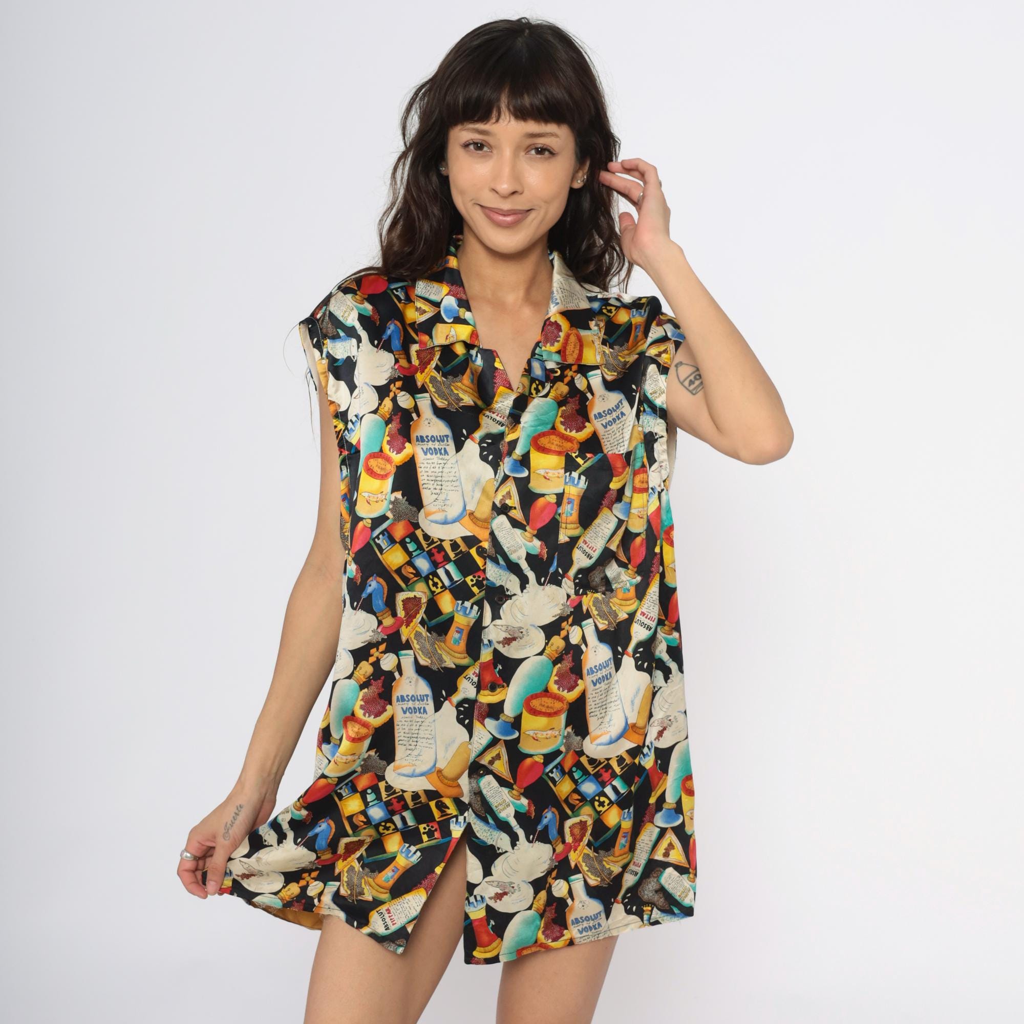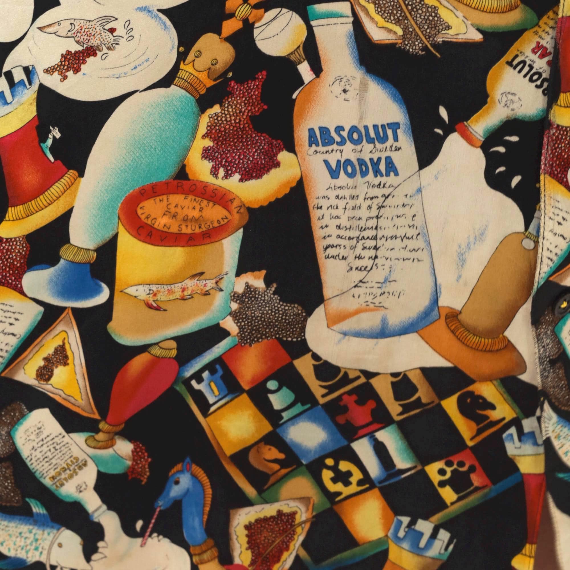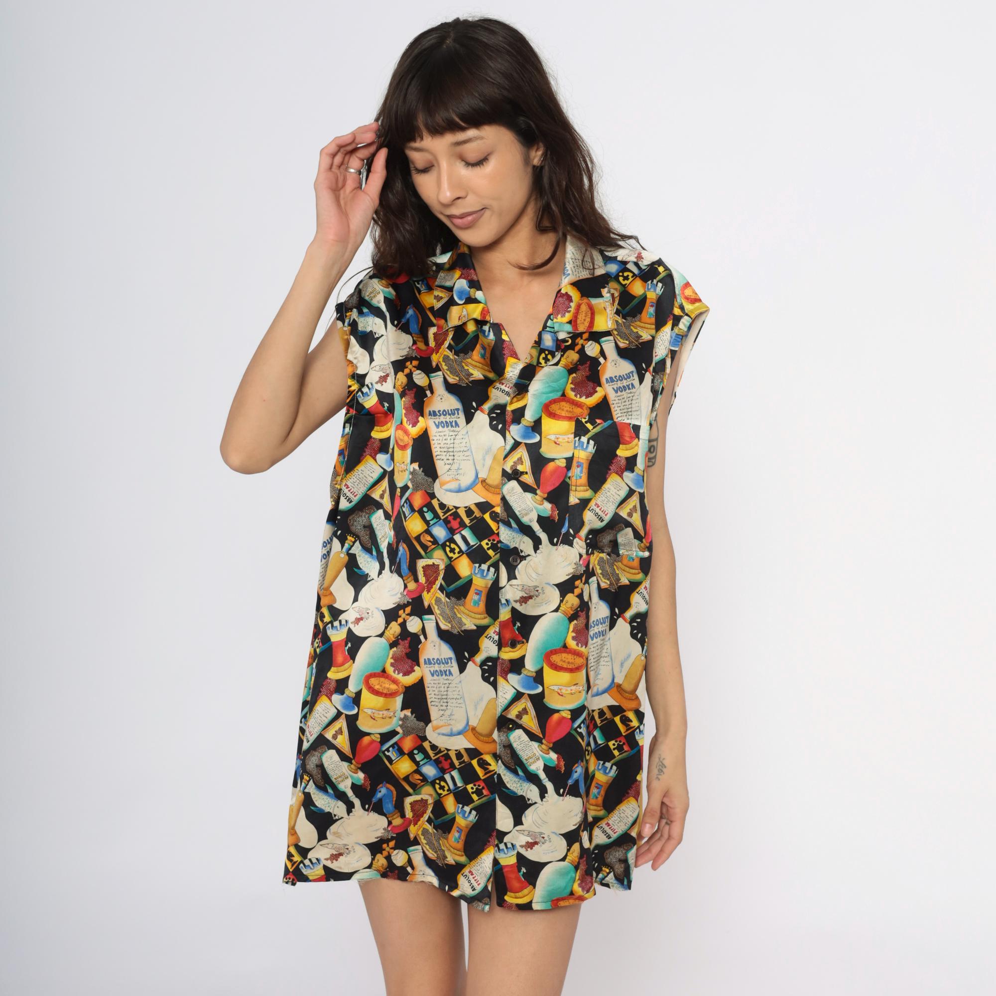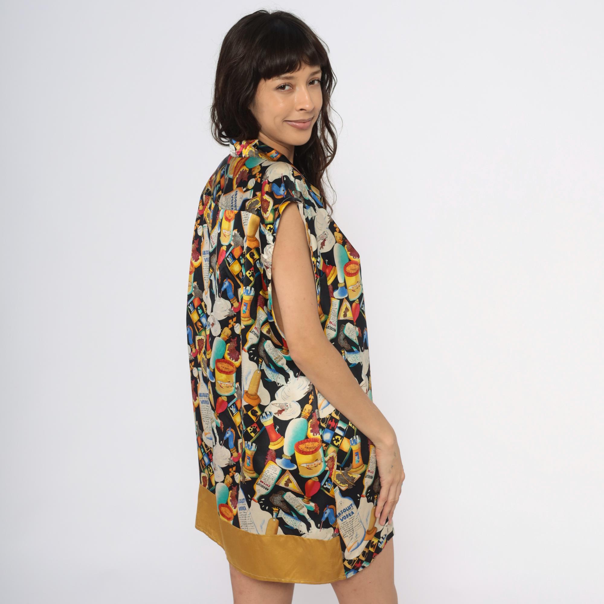 90s novelty print silk tunic from Nicole Miller featuring Absolut Vodka bottles, cocktails in various glasses, playing cards, caviar tins, and ice cream imagery scattered across a black background. Sleeveless with collar and lapels, button front closure, contrast gold hem band at bottom.