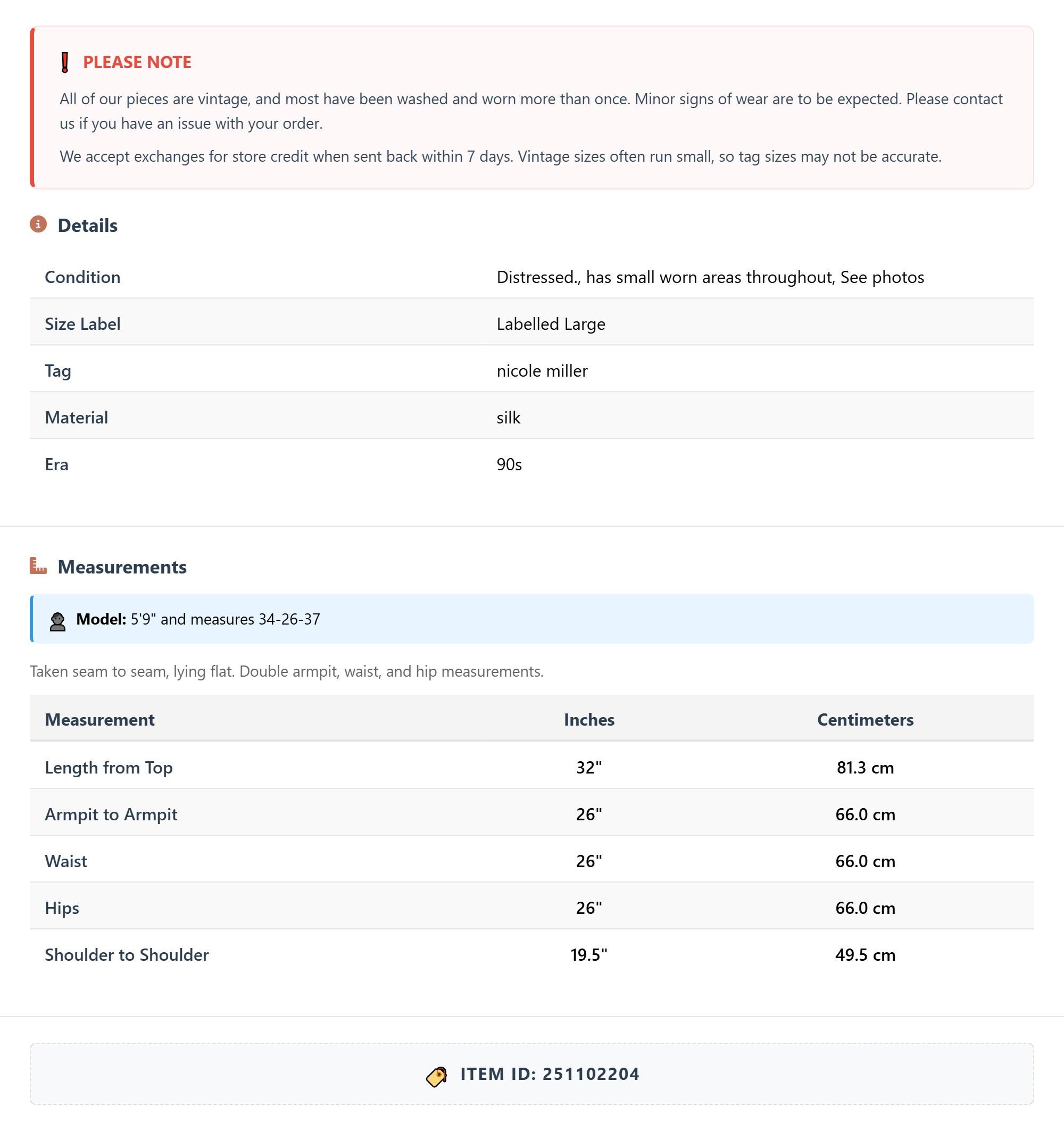 All of our pieces are vintage, and most have been washed and worn more than once. Minor signs of wear are to be expected. Please contact us if you have an issue with your order. We accept exchanges for store credit when sent back within 7 days.