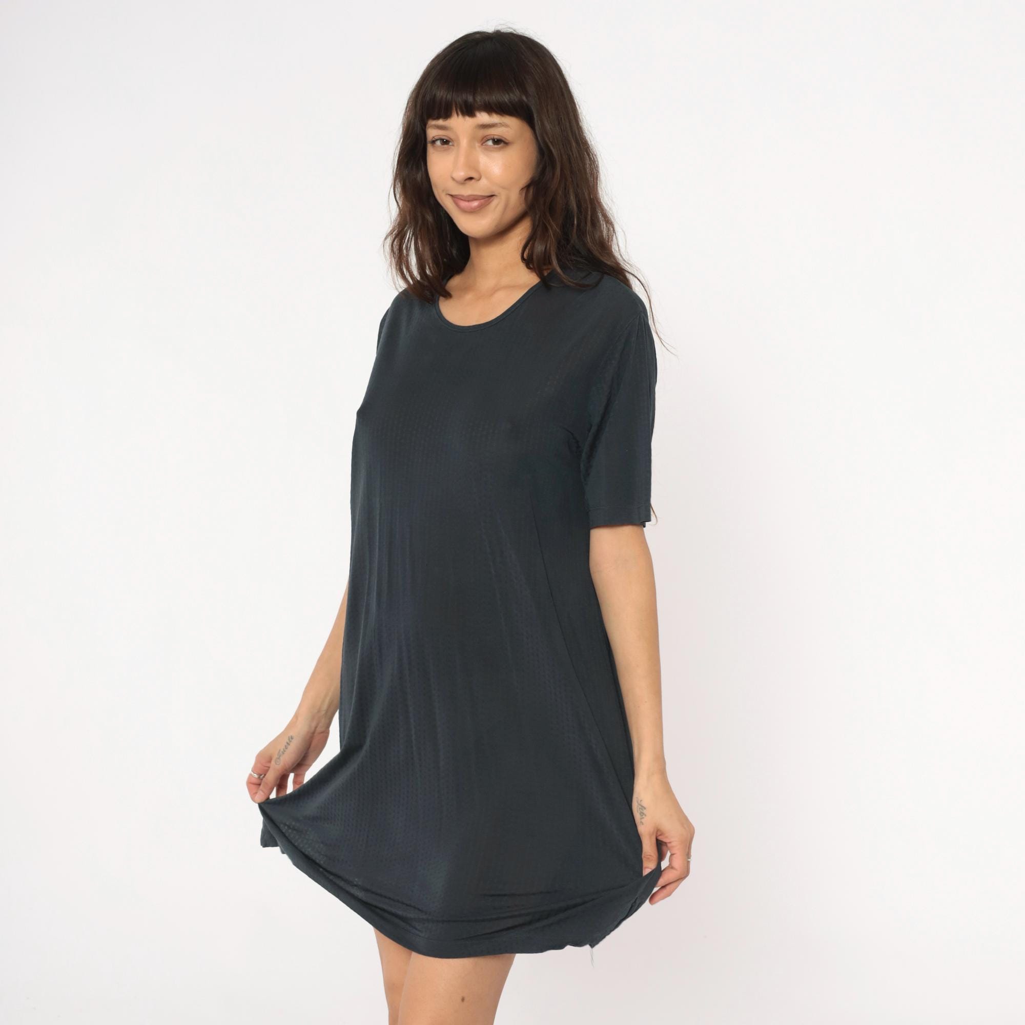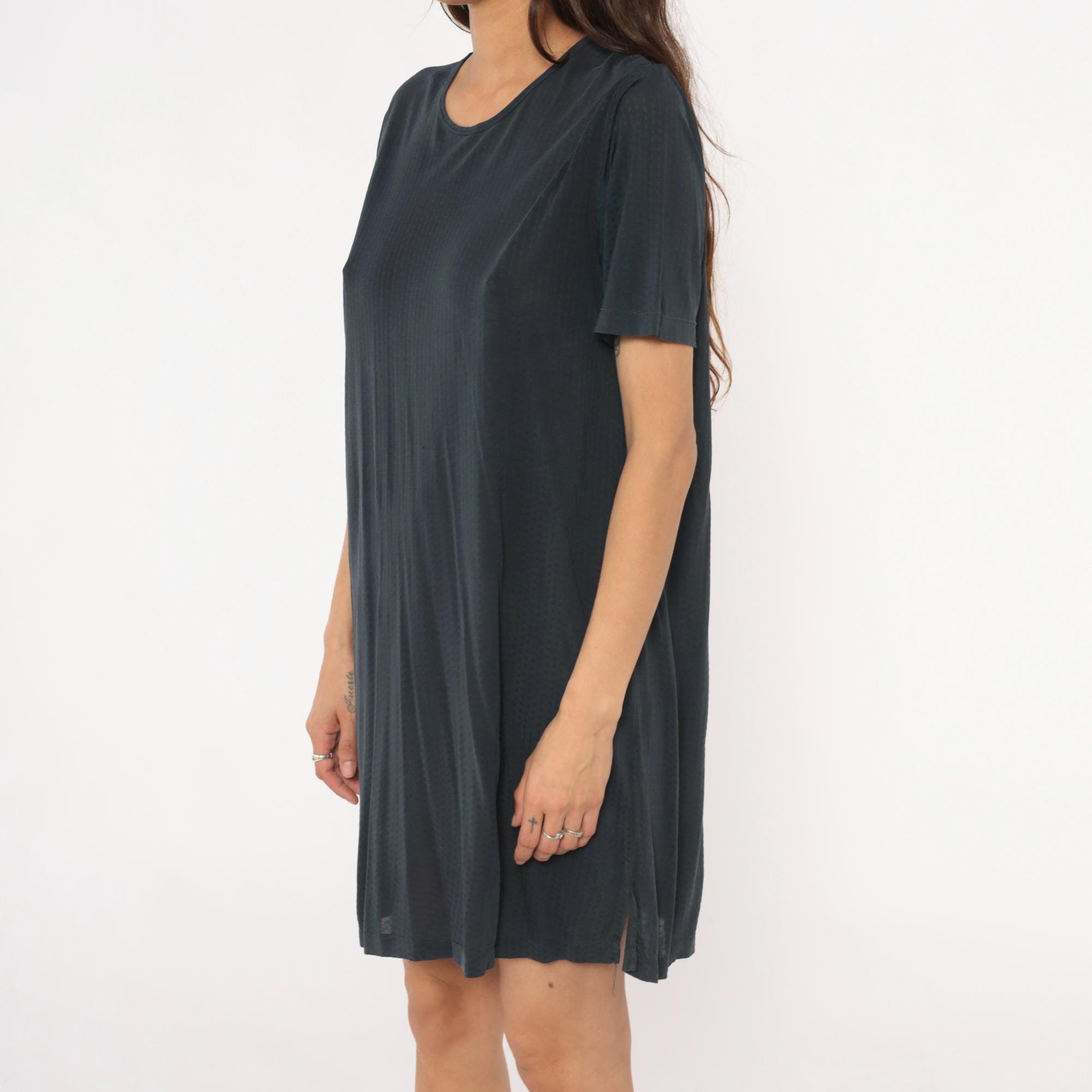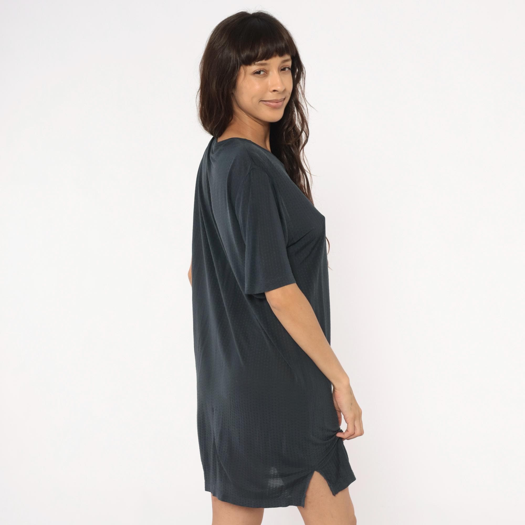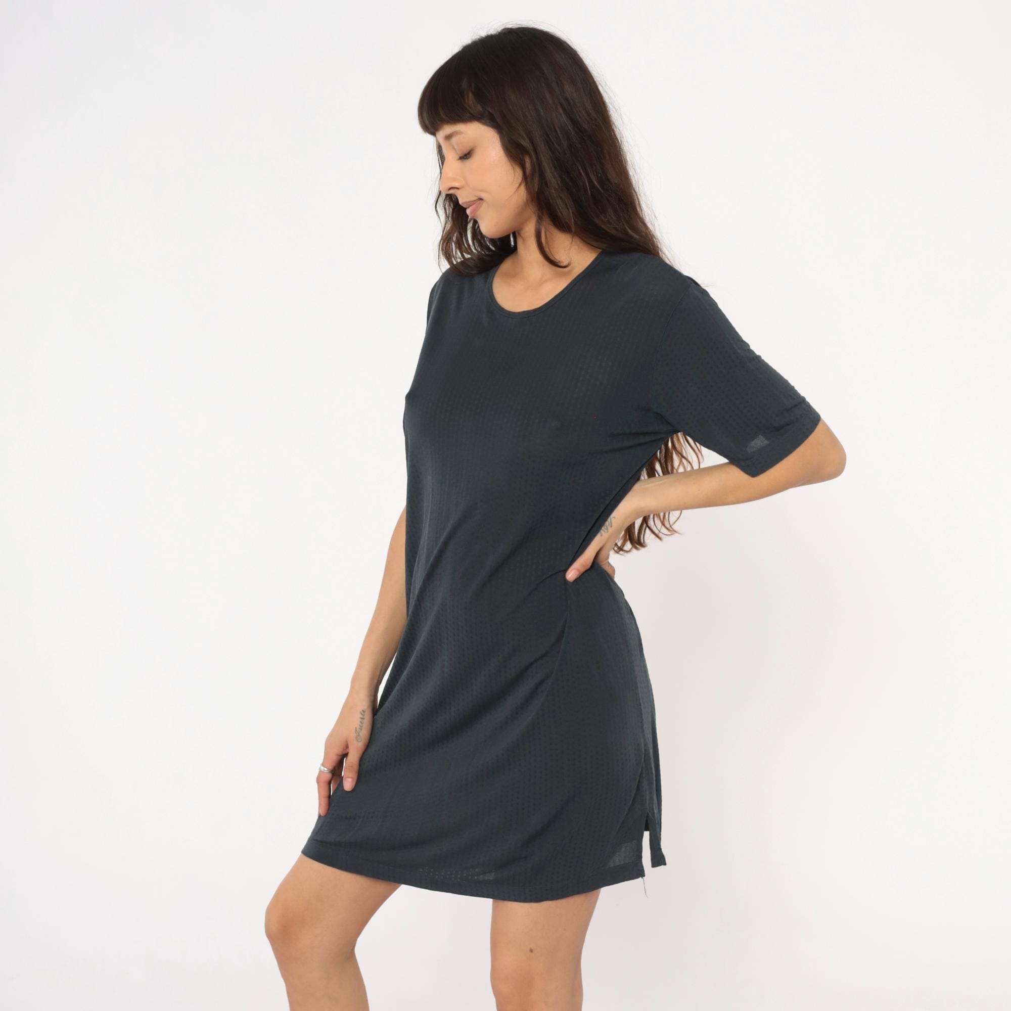 90s gray shift dress from Cabelas with crew neckline and short sleeves. Straight, loose-fitting silhouette with minimal detailing.