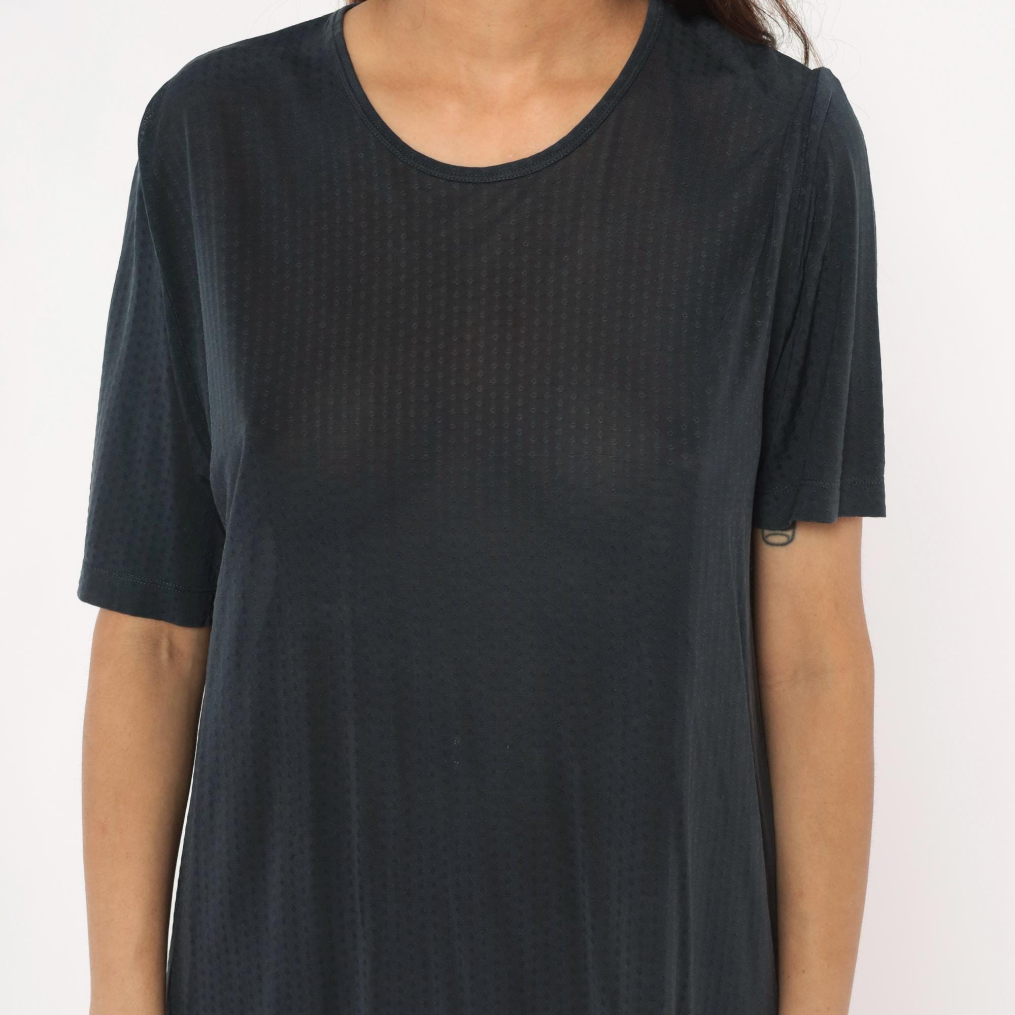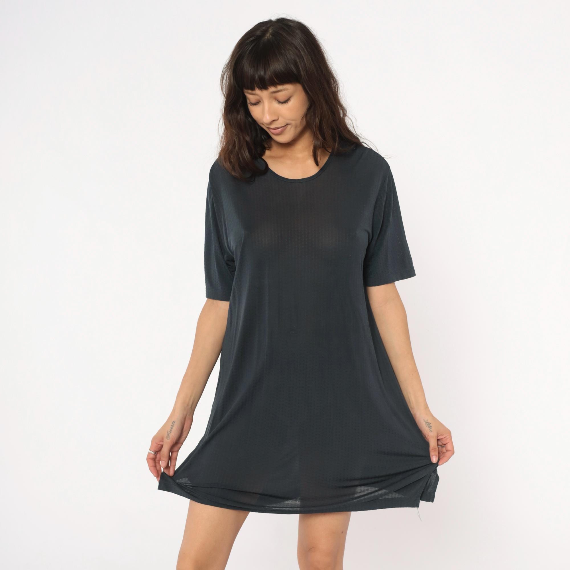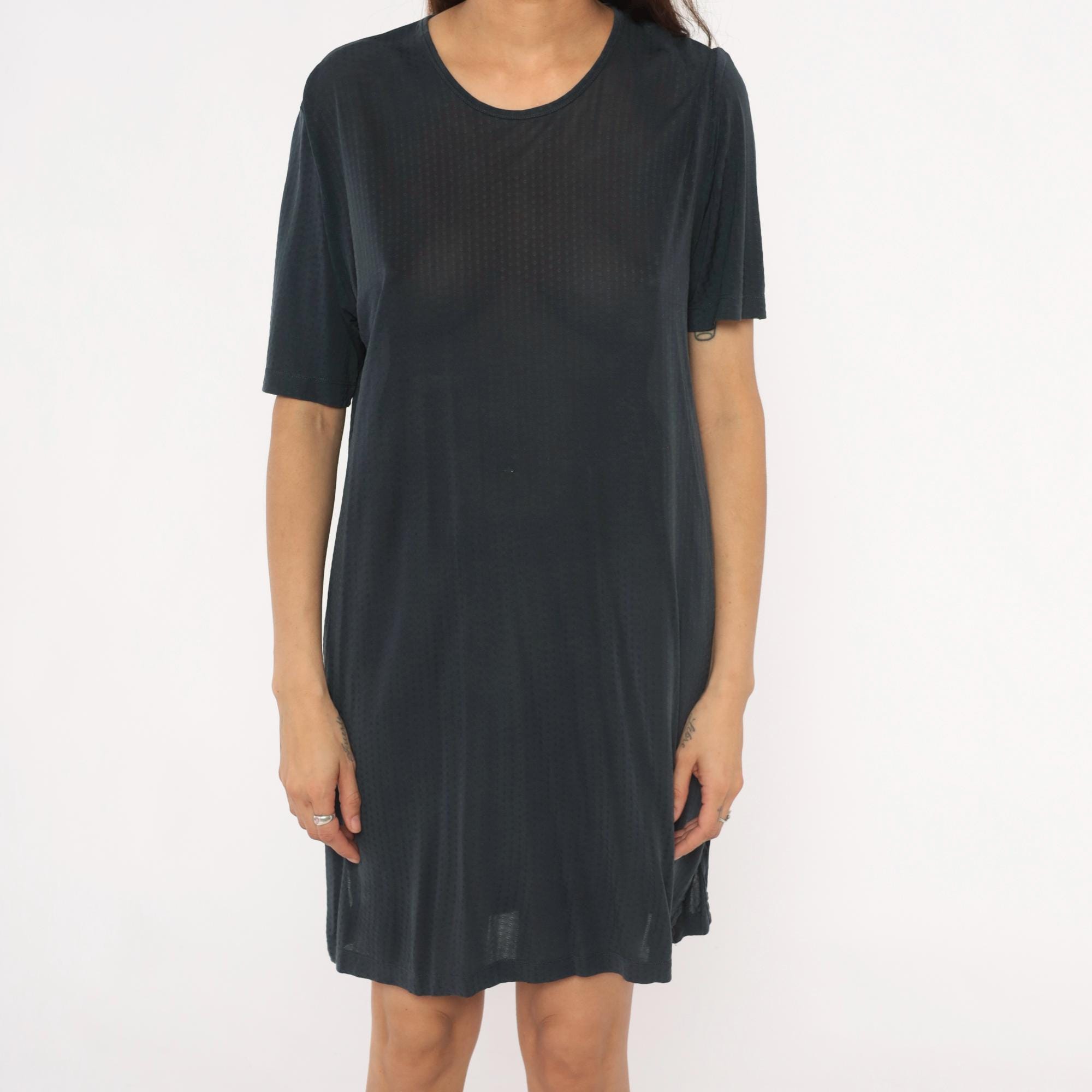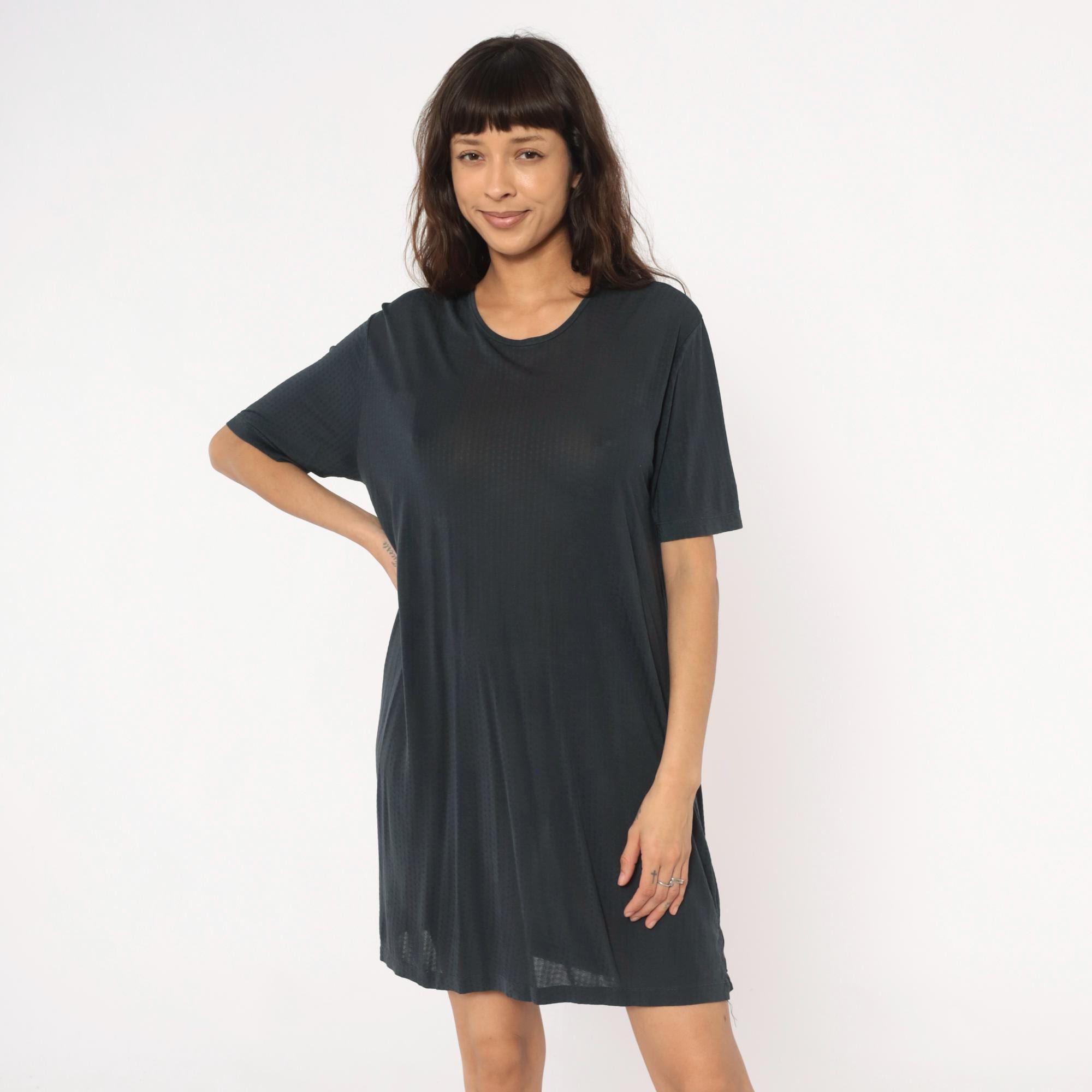 90s gray shift dress from Cabelas with crew neckline and short sleeves. Straight, loose-fitting silhouette with minimal detailing.