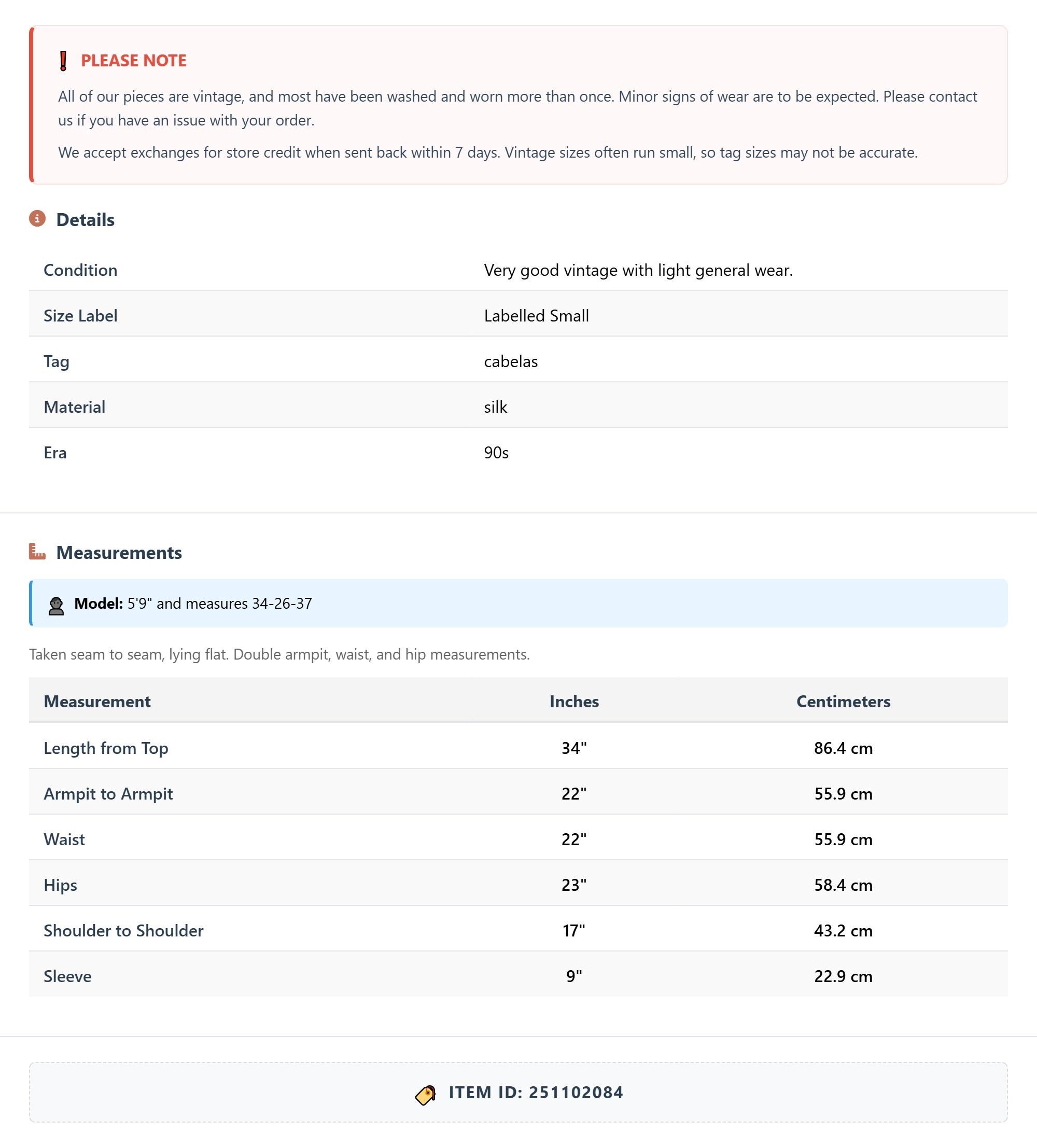 All of our pieces are vintage, and most have been washed and worn more than once. Minor signs of wear are to be expected. Please contact us if you have an issue with your order. We accept exchanges for store credit when sent back within 7 days.