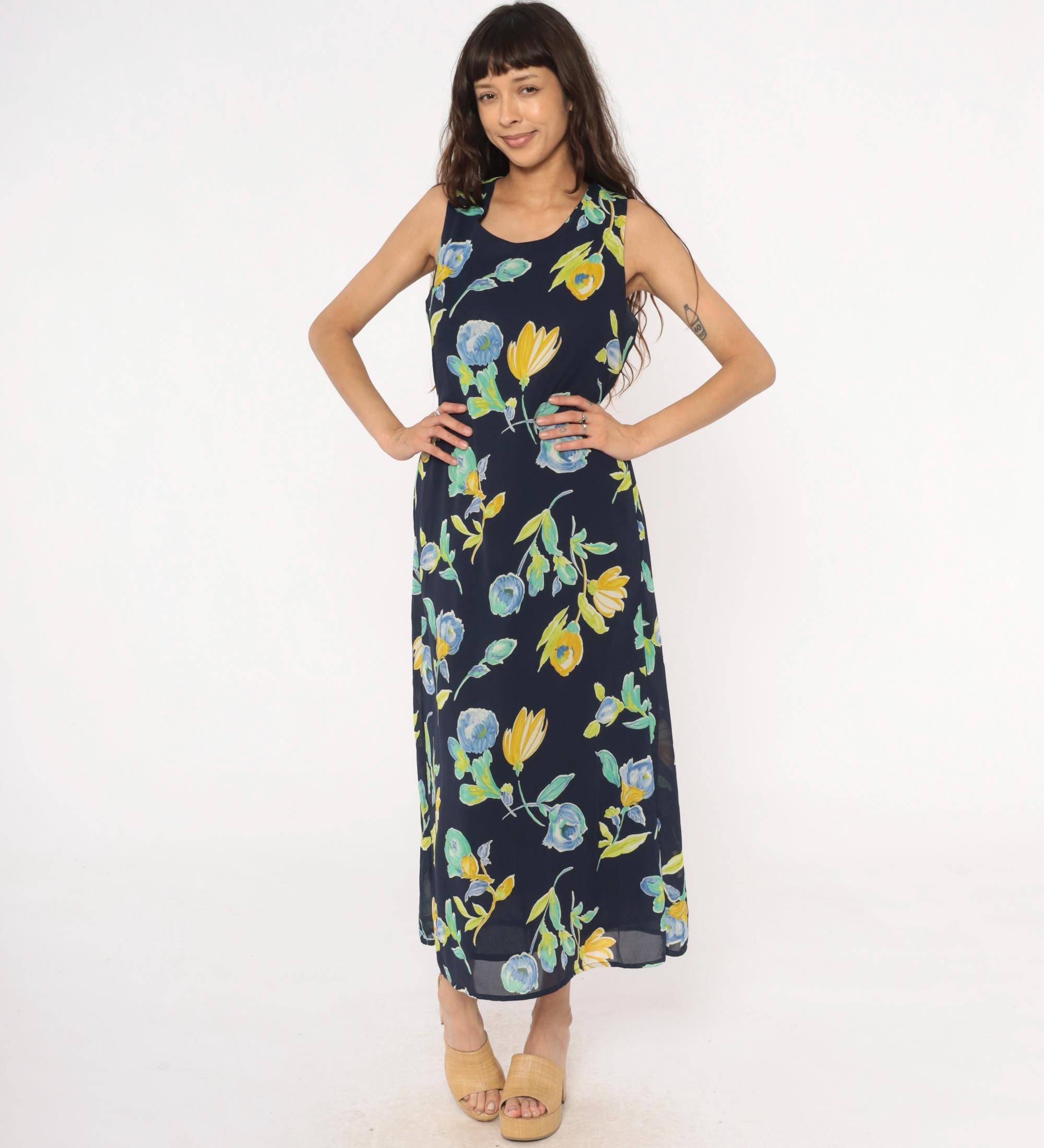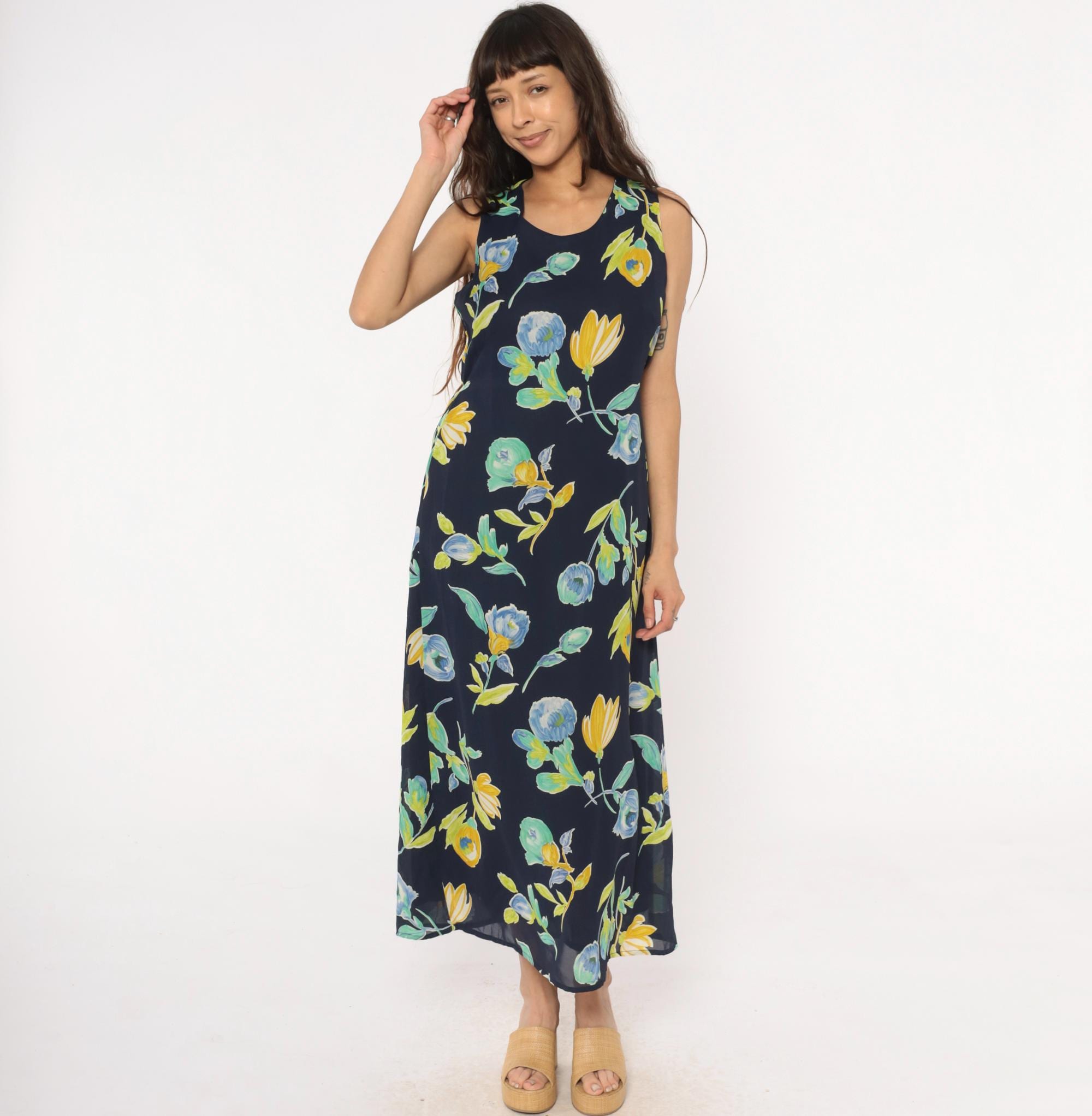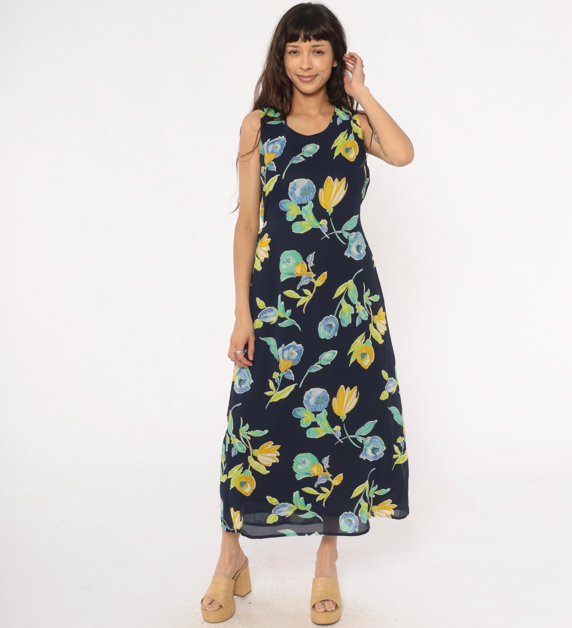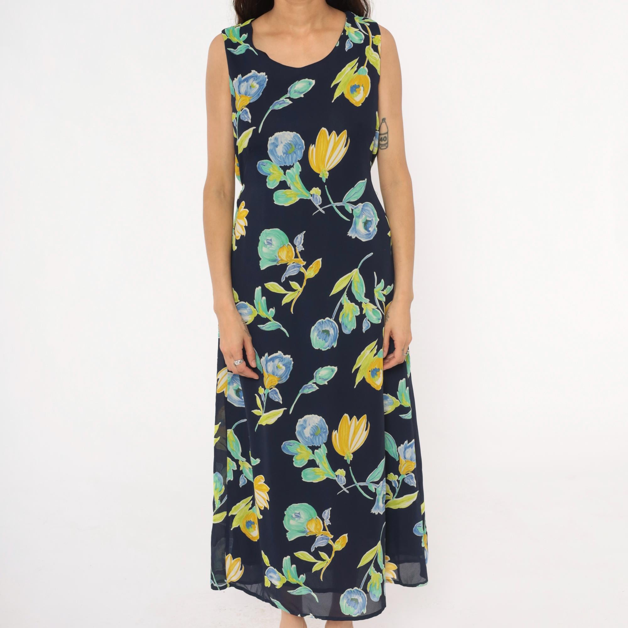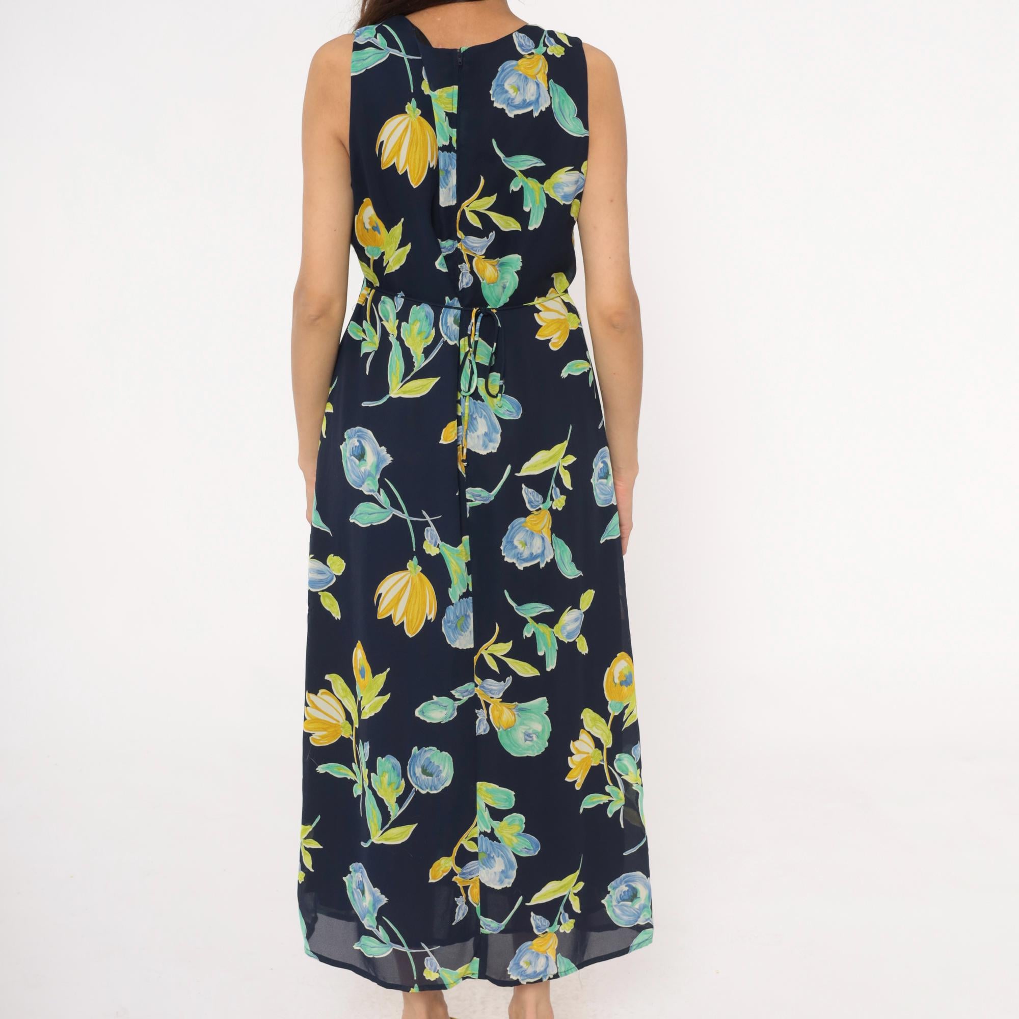 90s navy blue floral maxi dress from Bentley with yellow and blue flowers and green leaves throughout. Sleeveless with scoop neckline and button closure at back neck, gathered elastic waist.