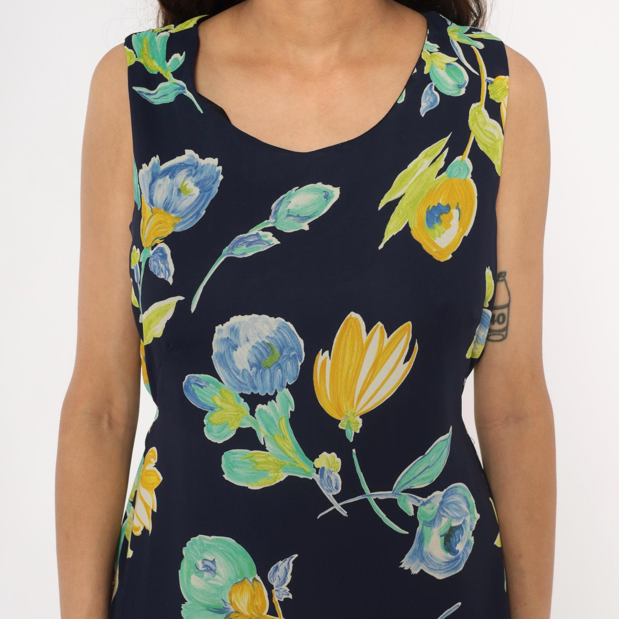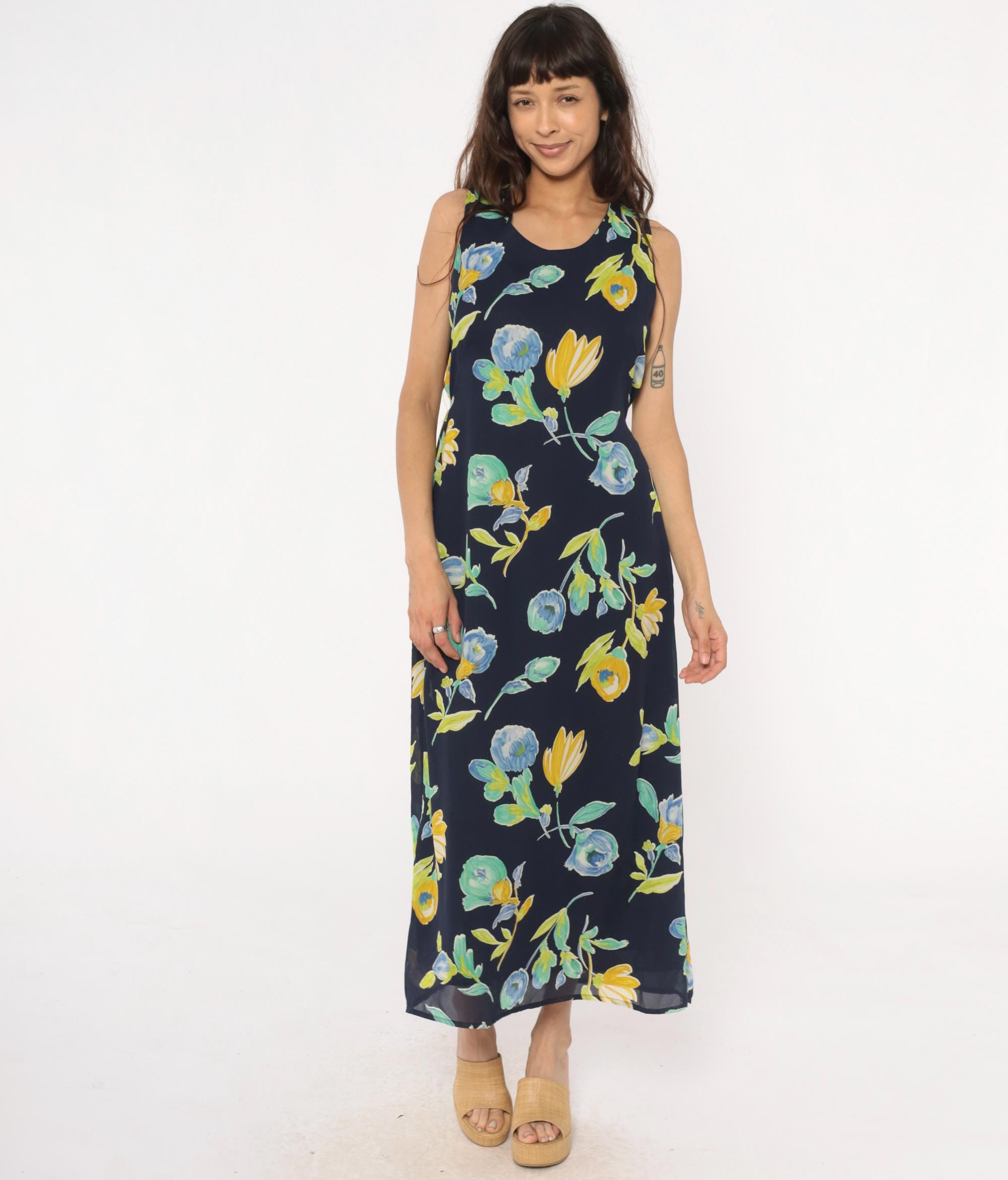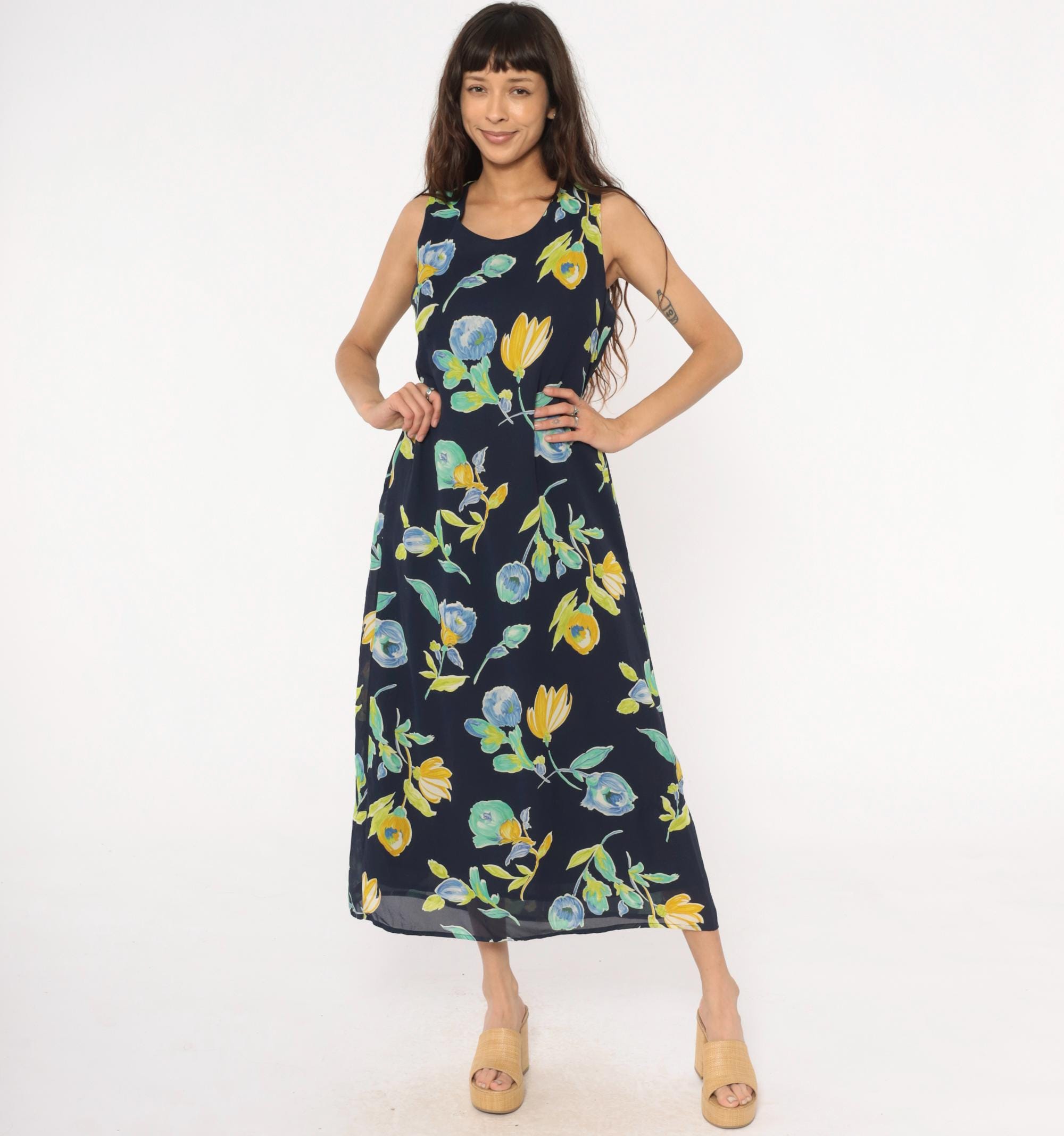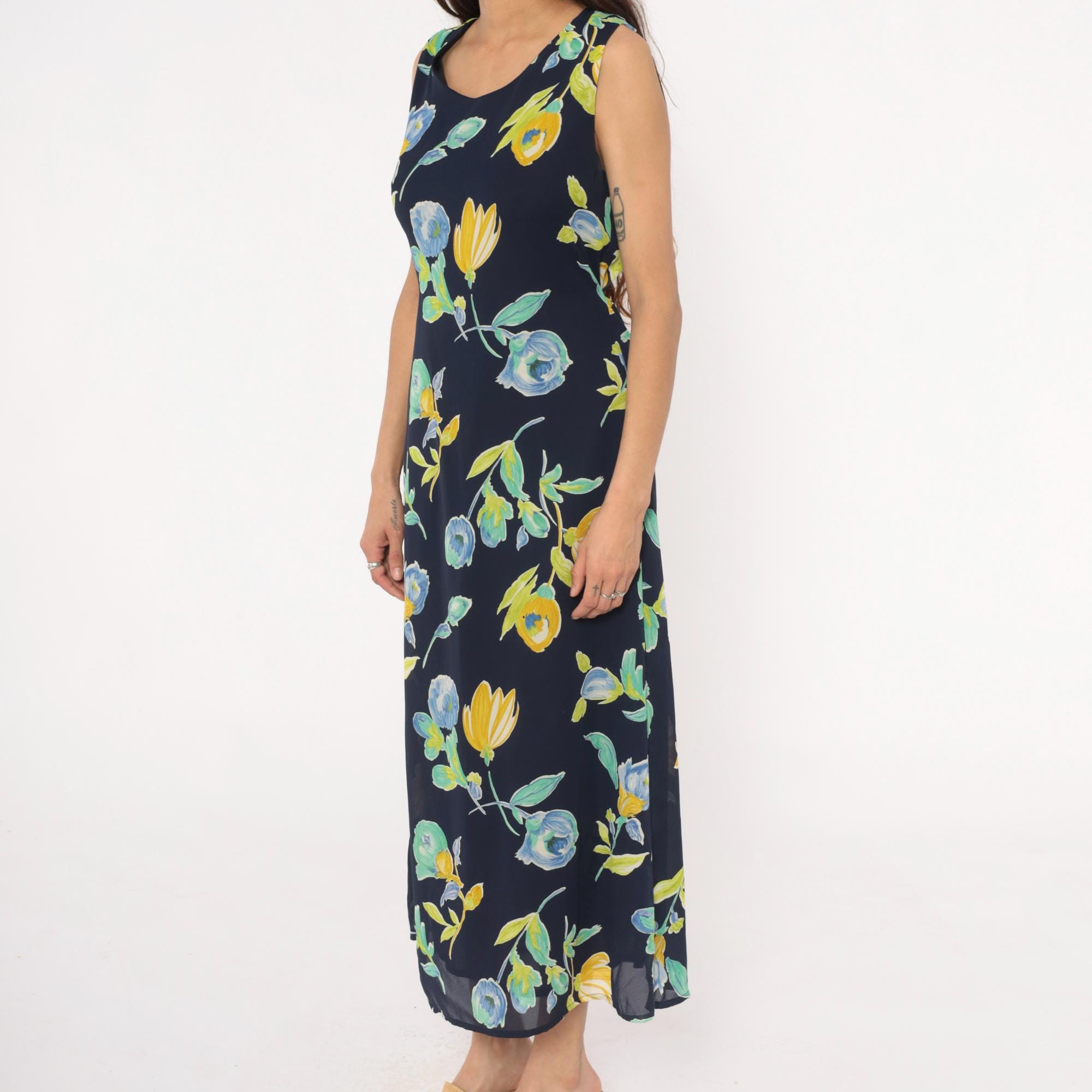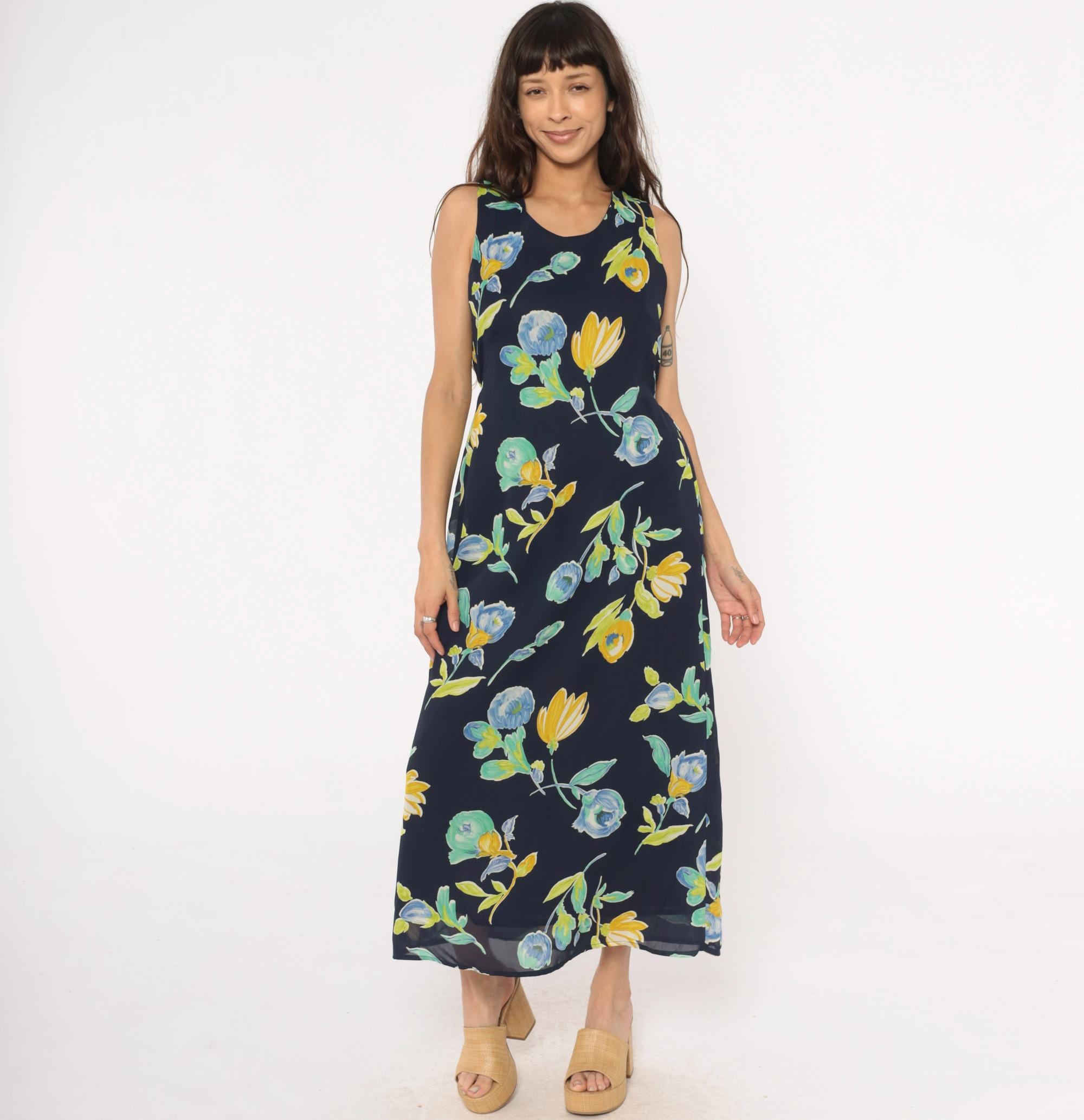 90s navy blue floral maxi dress from Bentley with yellow and blue flowers and green leaves throughout. Sleeveless with scoop neckline and button closure at back neck, gathered elastic waist.