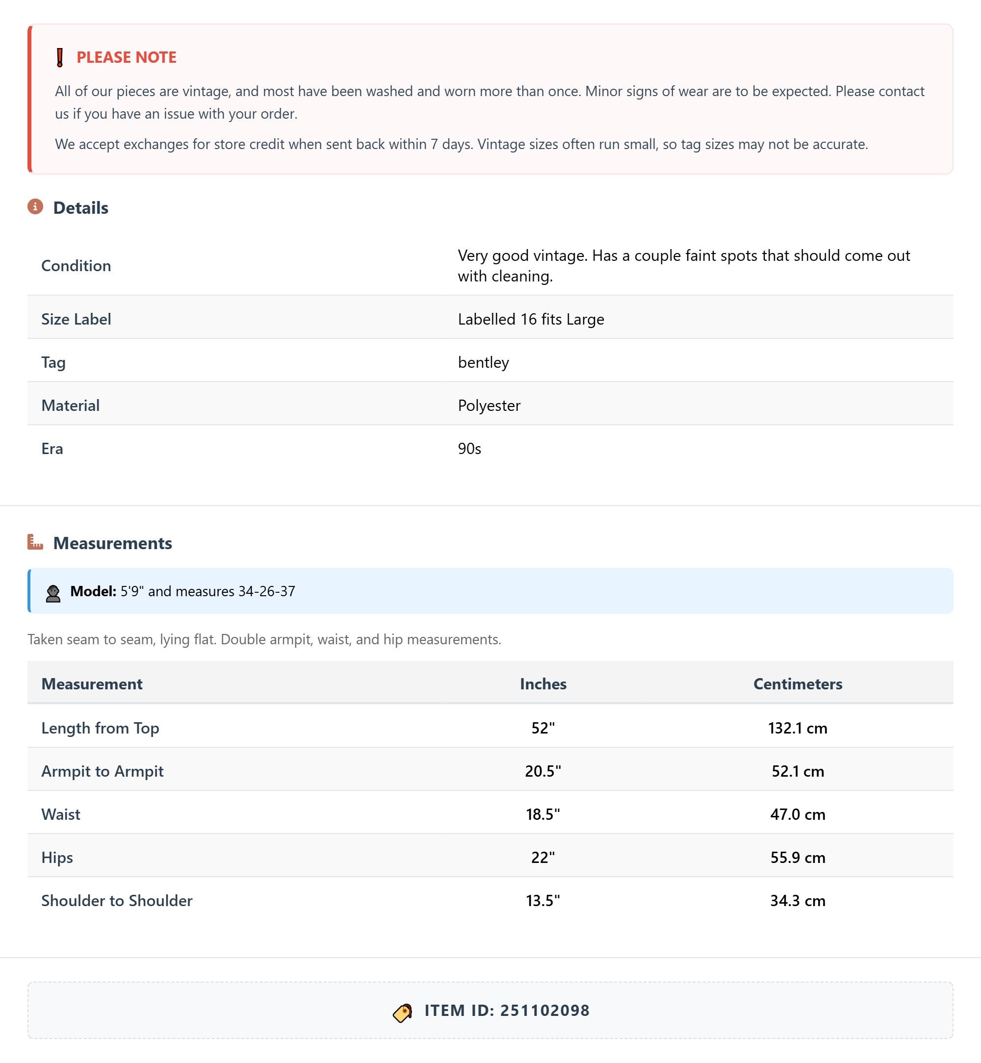 All of our pieces are vintage, and most have been washed and worn more than once. Minor signs of wear are to be expected. Please contact us if you have an issue with your order. We accept exchanges for store credit when sent back within 7 days.
