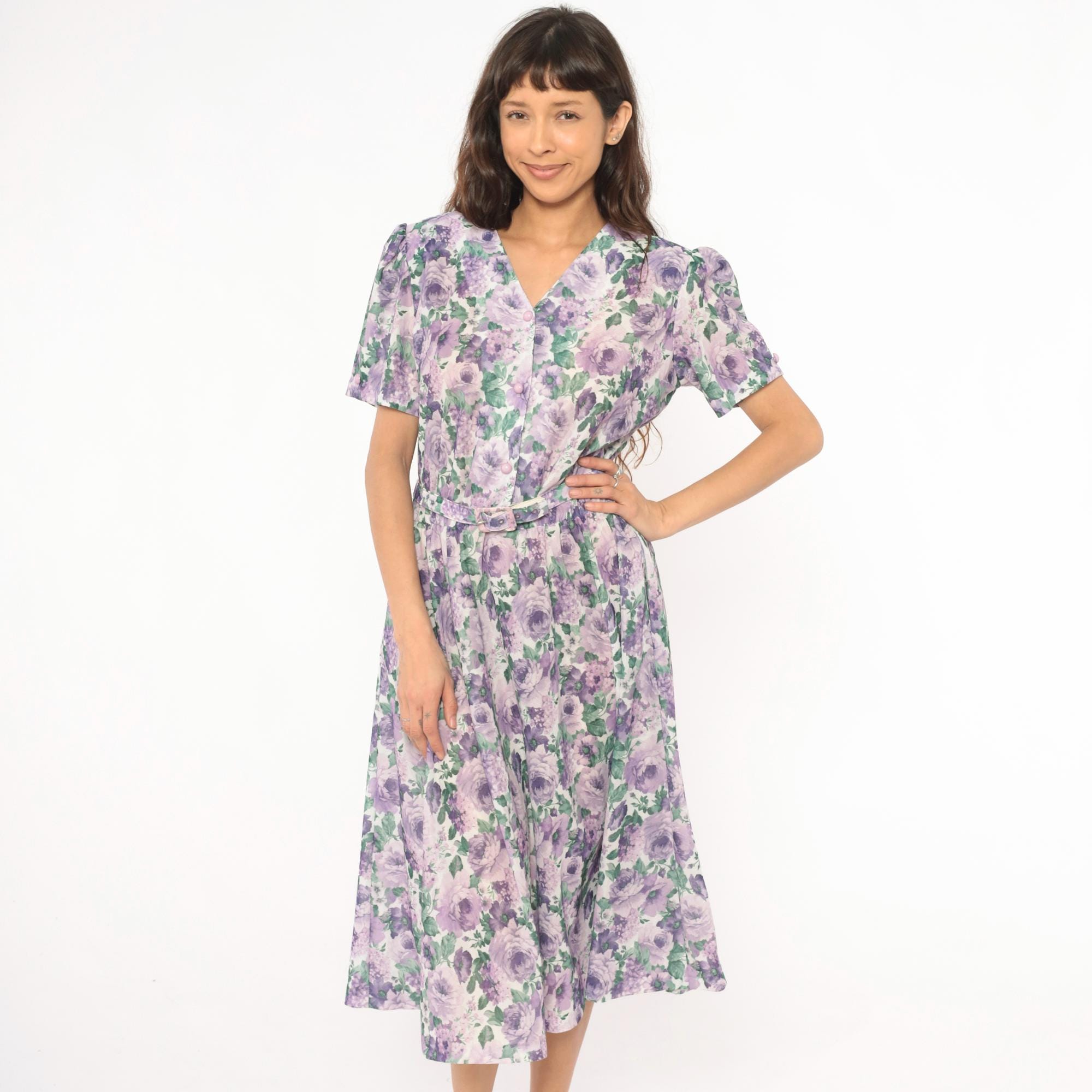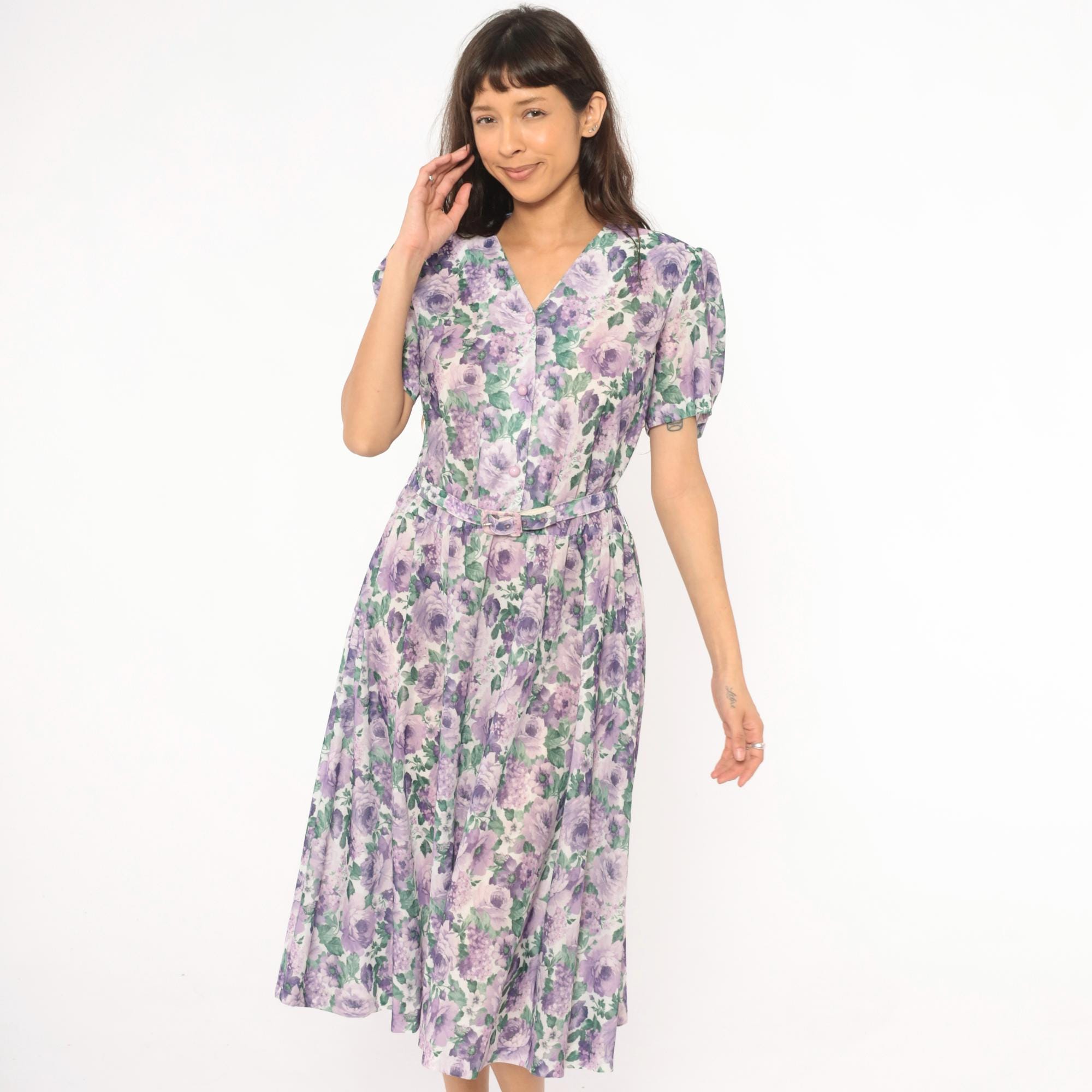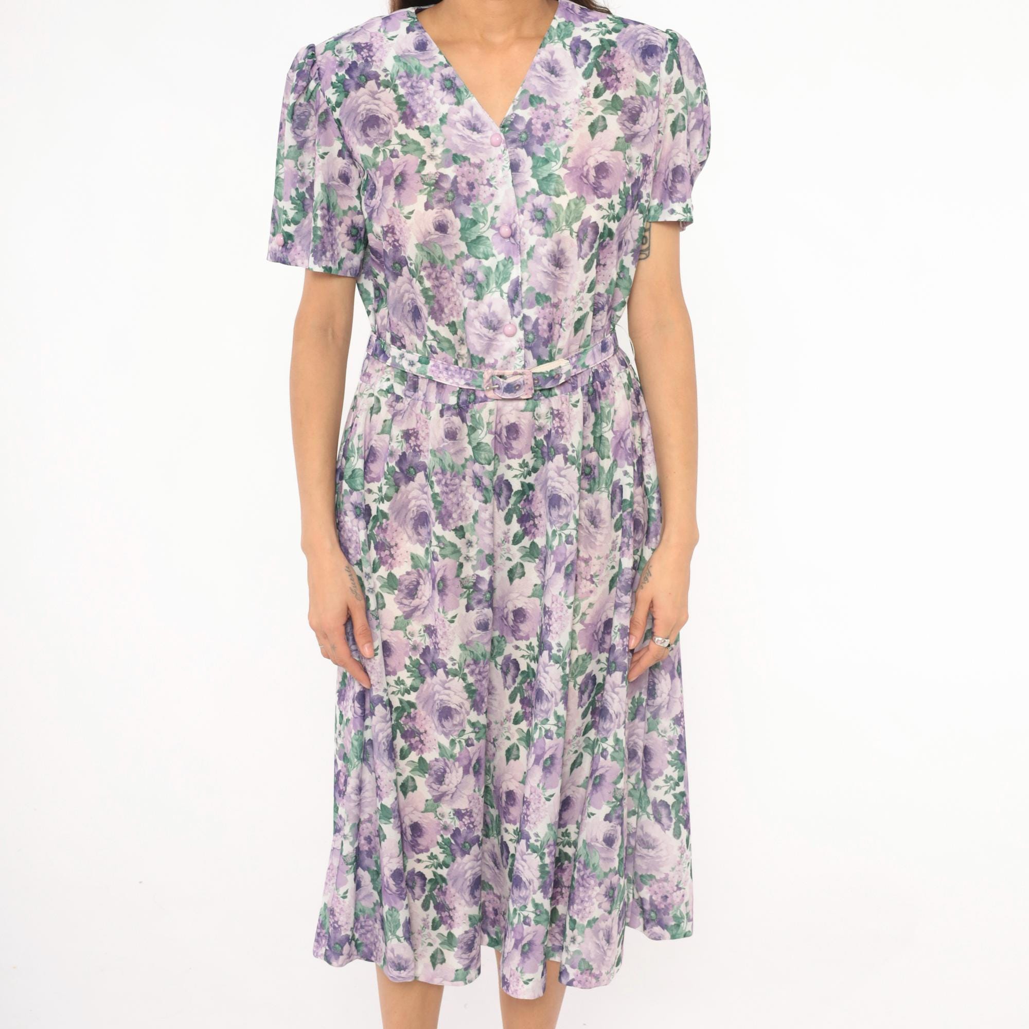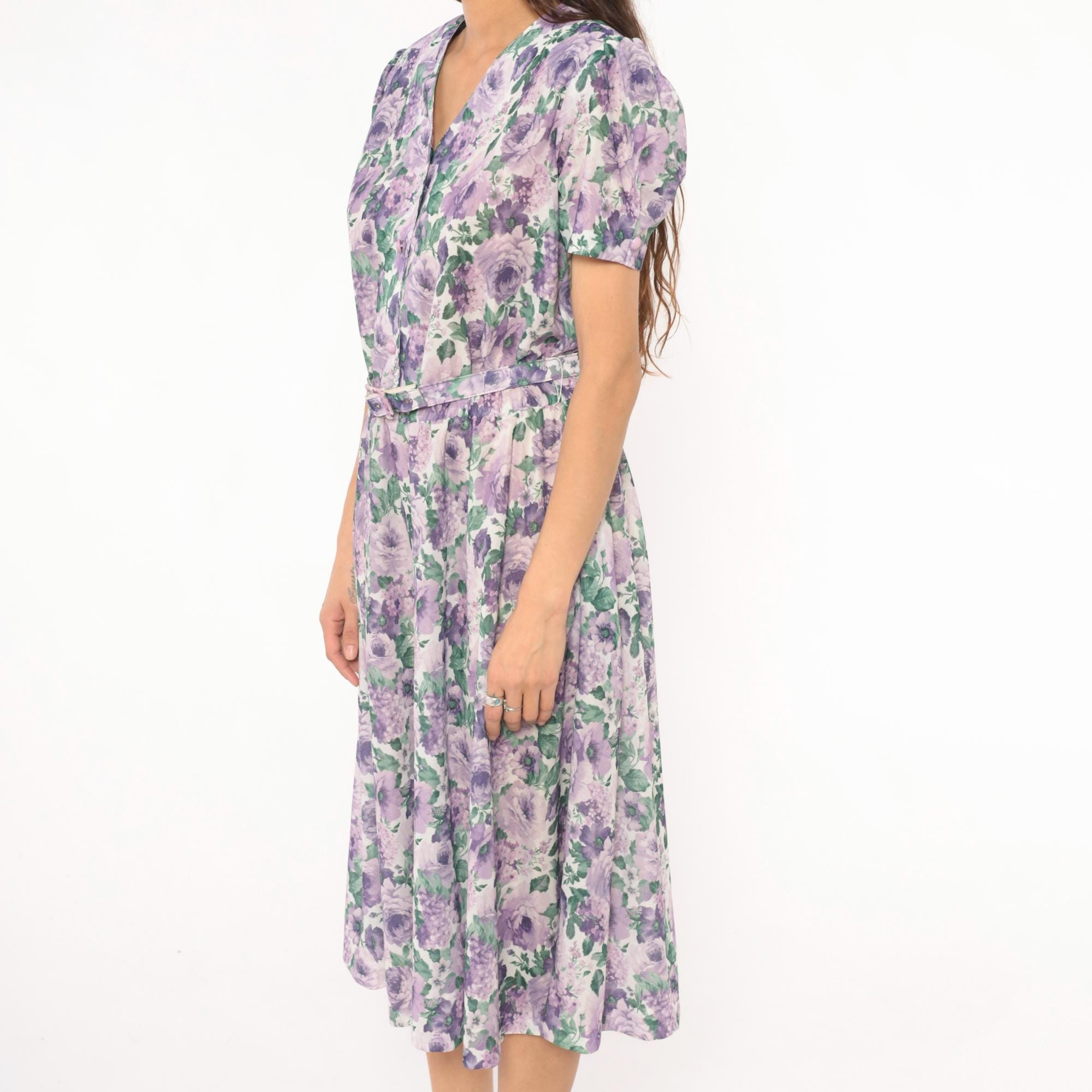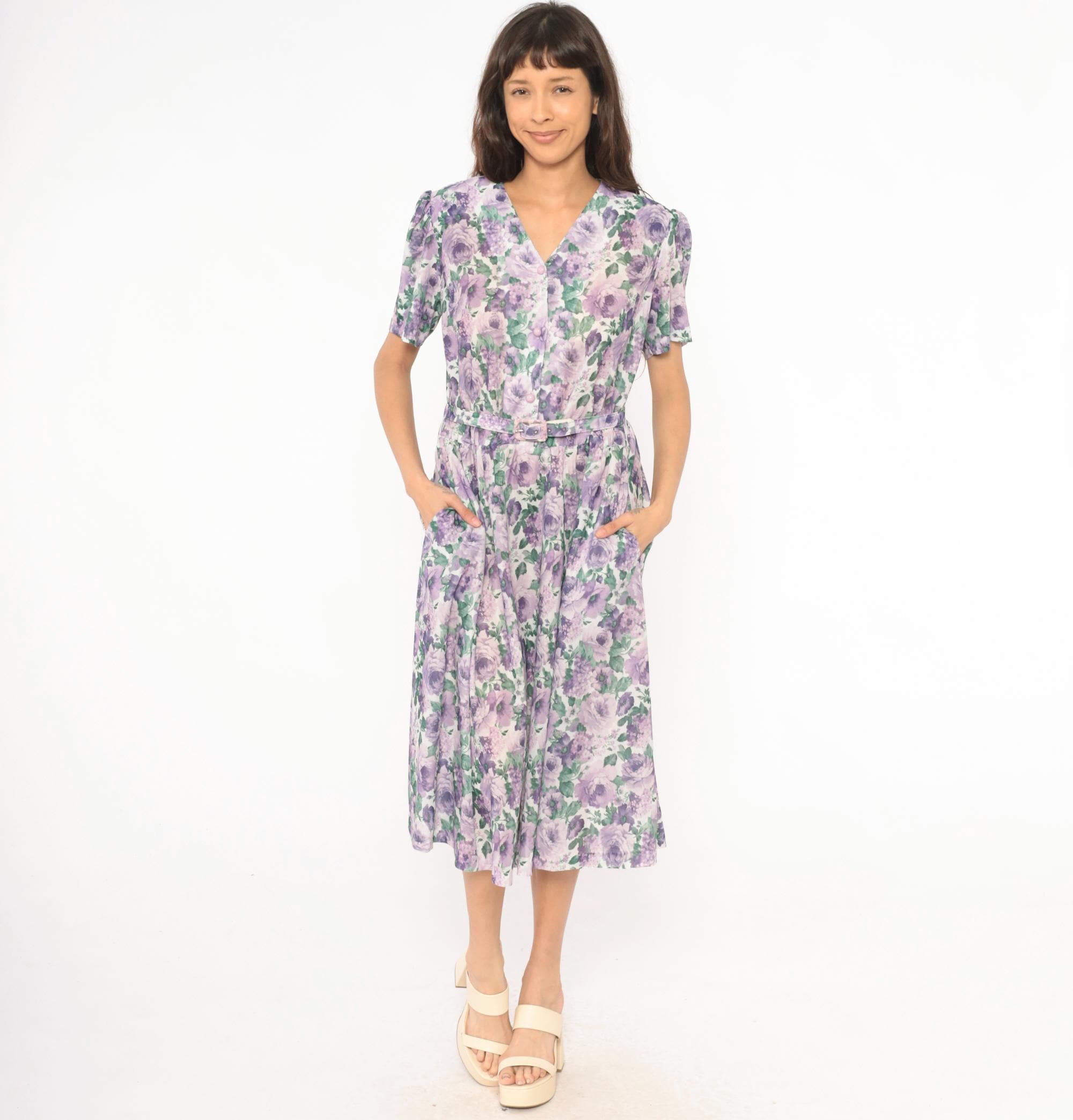 80s purple floral dress from Anthony Richards with watercolor rose pattern in lavender, lilac, and violet with green leaves throughout. V-neckline with button front closure, short puff sleeves, self-belt at waist, and full A-line skirt.