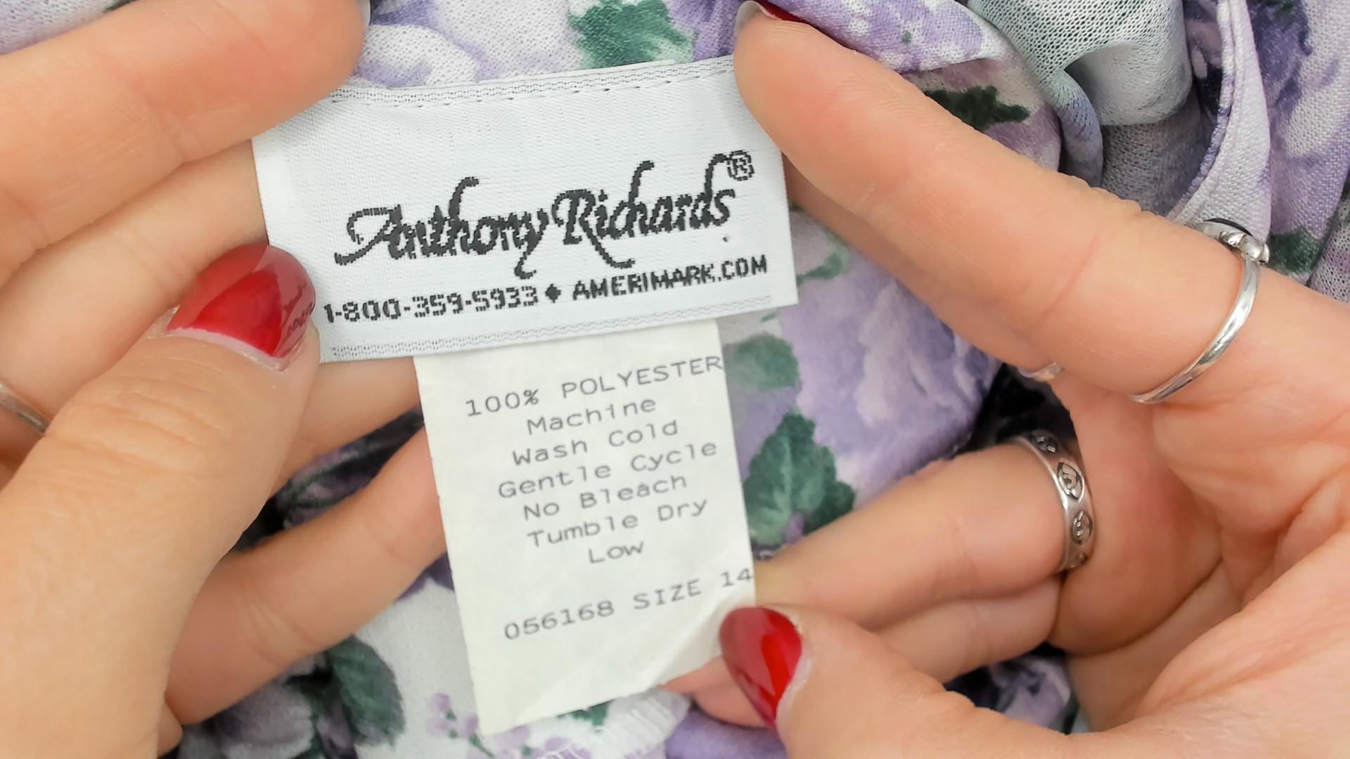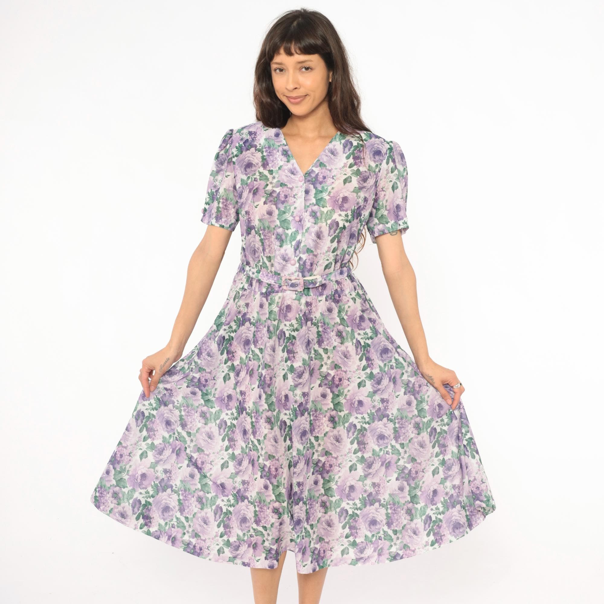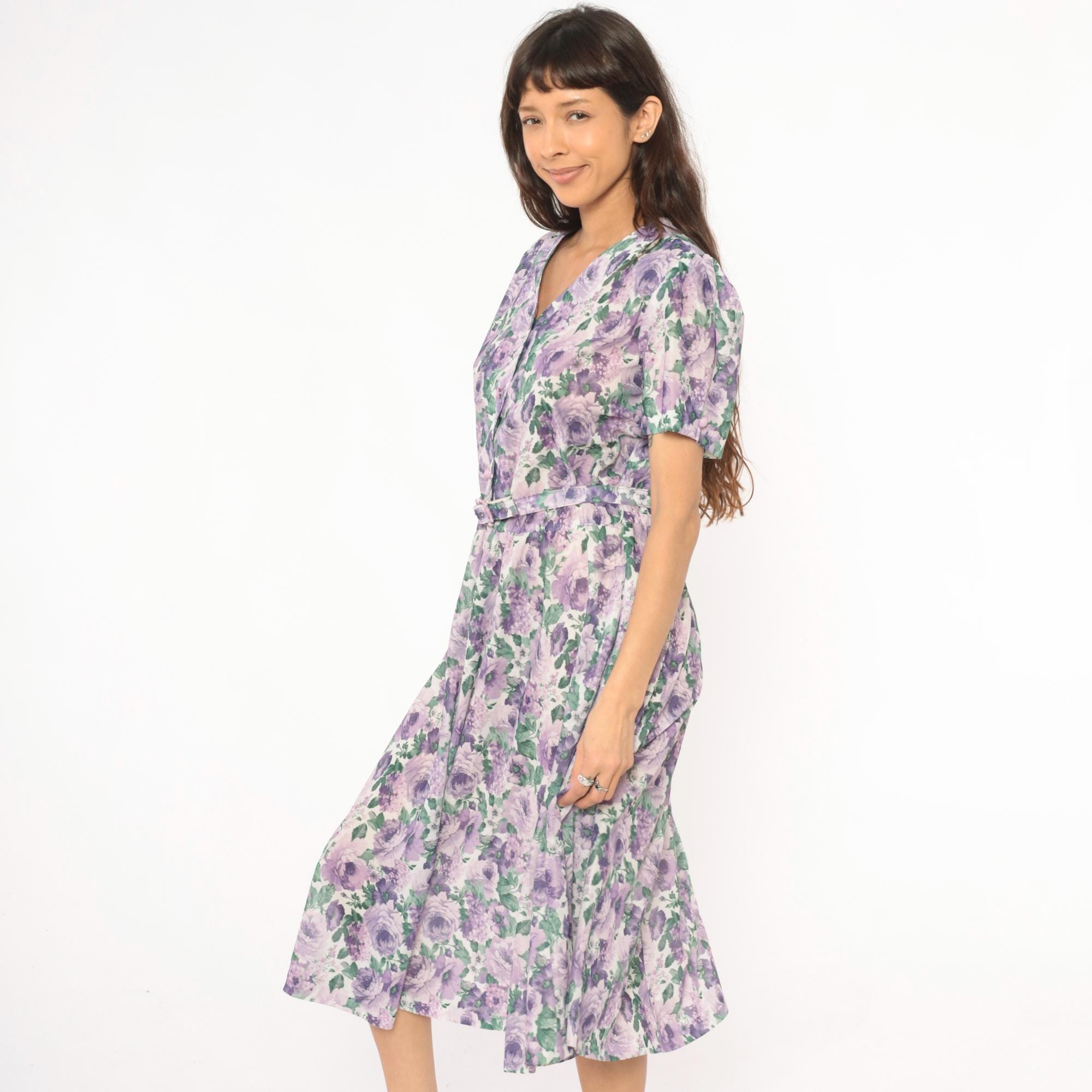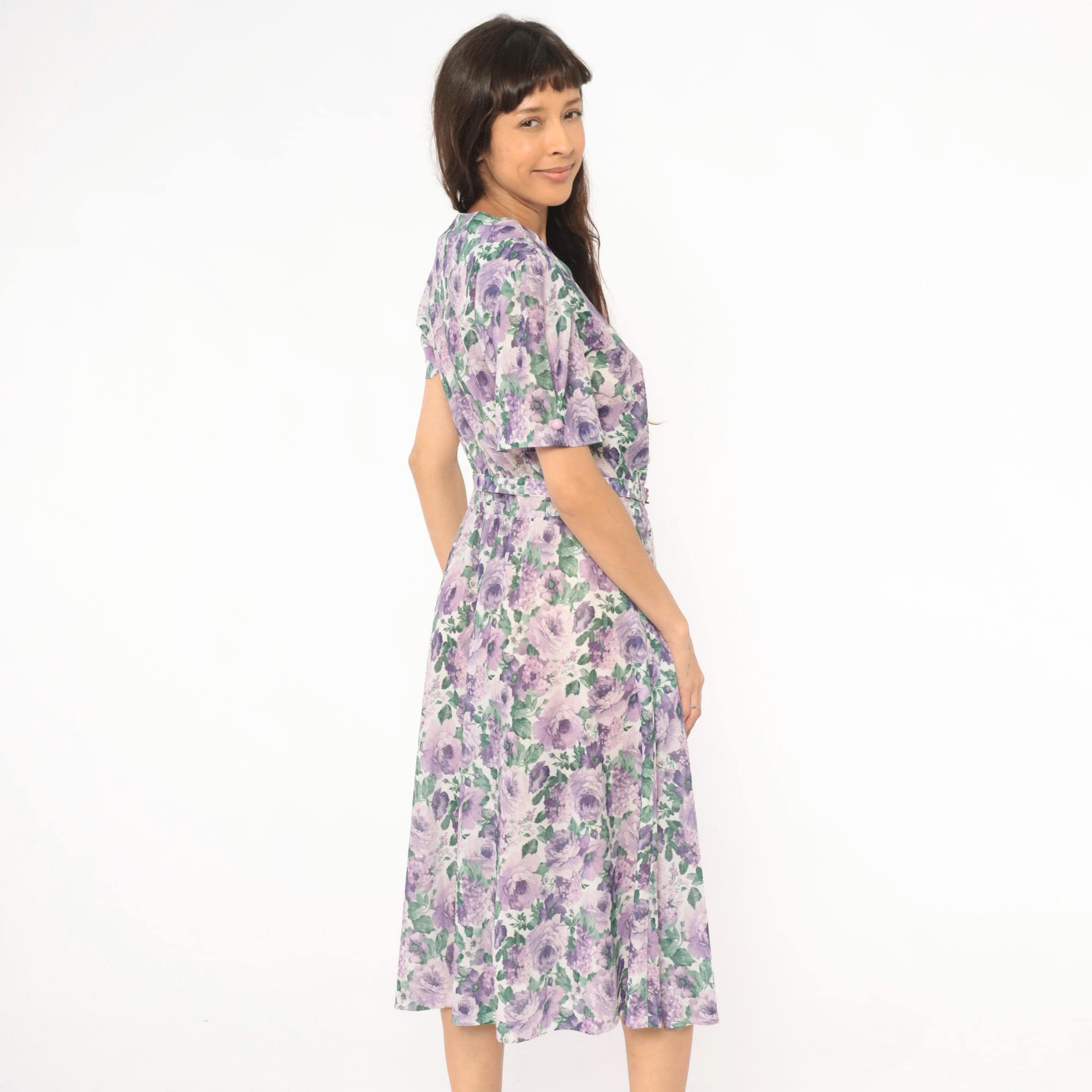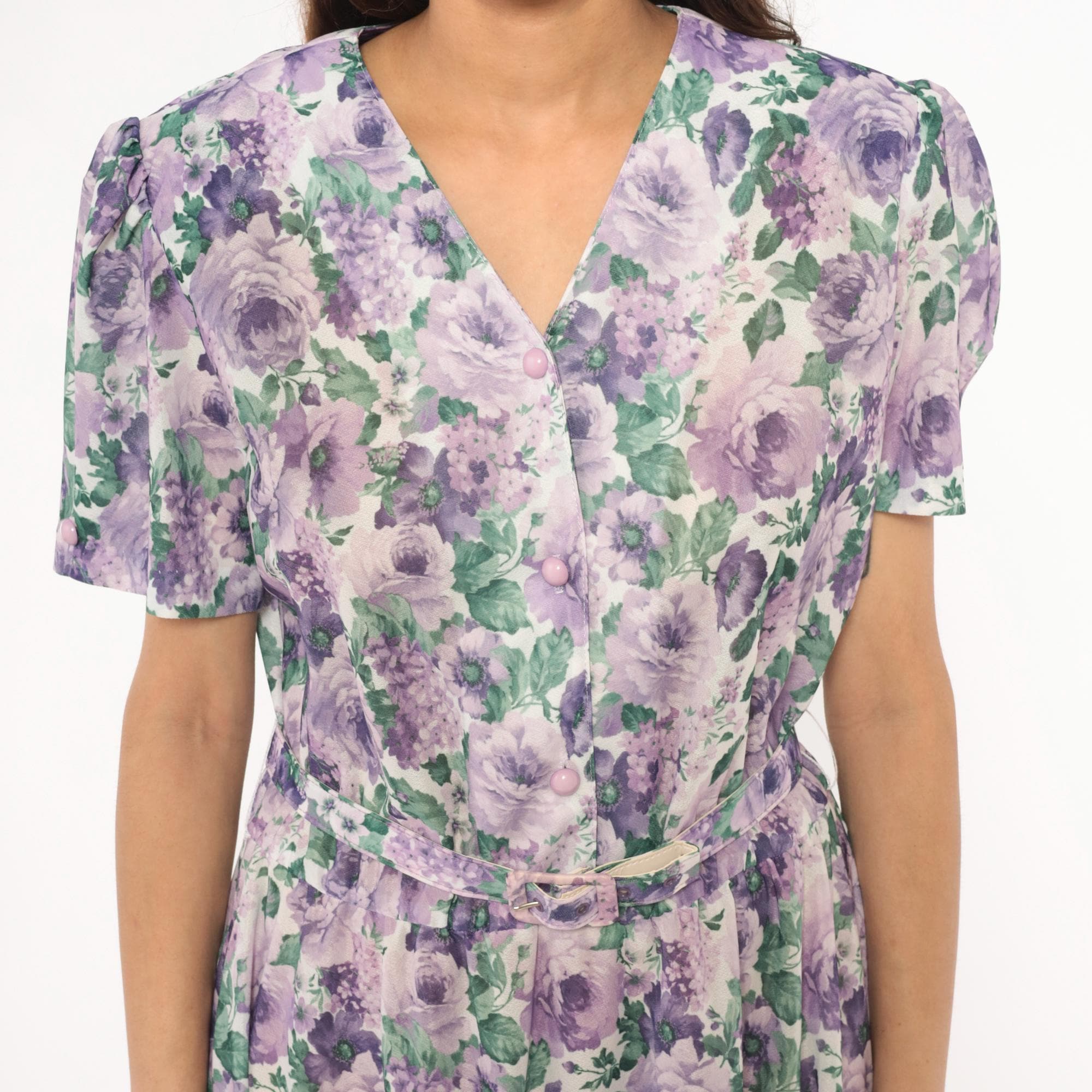 80s purple floral dress from Anthony Richards with watercolor rose pattern in lavender, lilac, and violet with green leaves throughout. V-neckline with button front closure, short puff sleeves, self-belt at waist, and full A-line skirt.