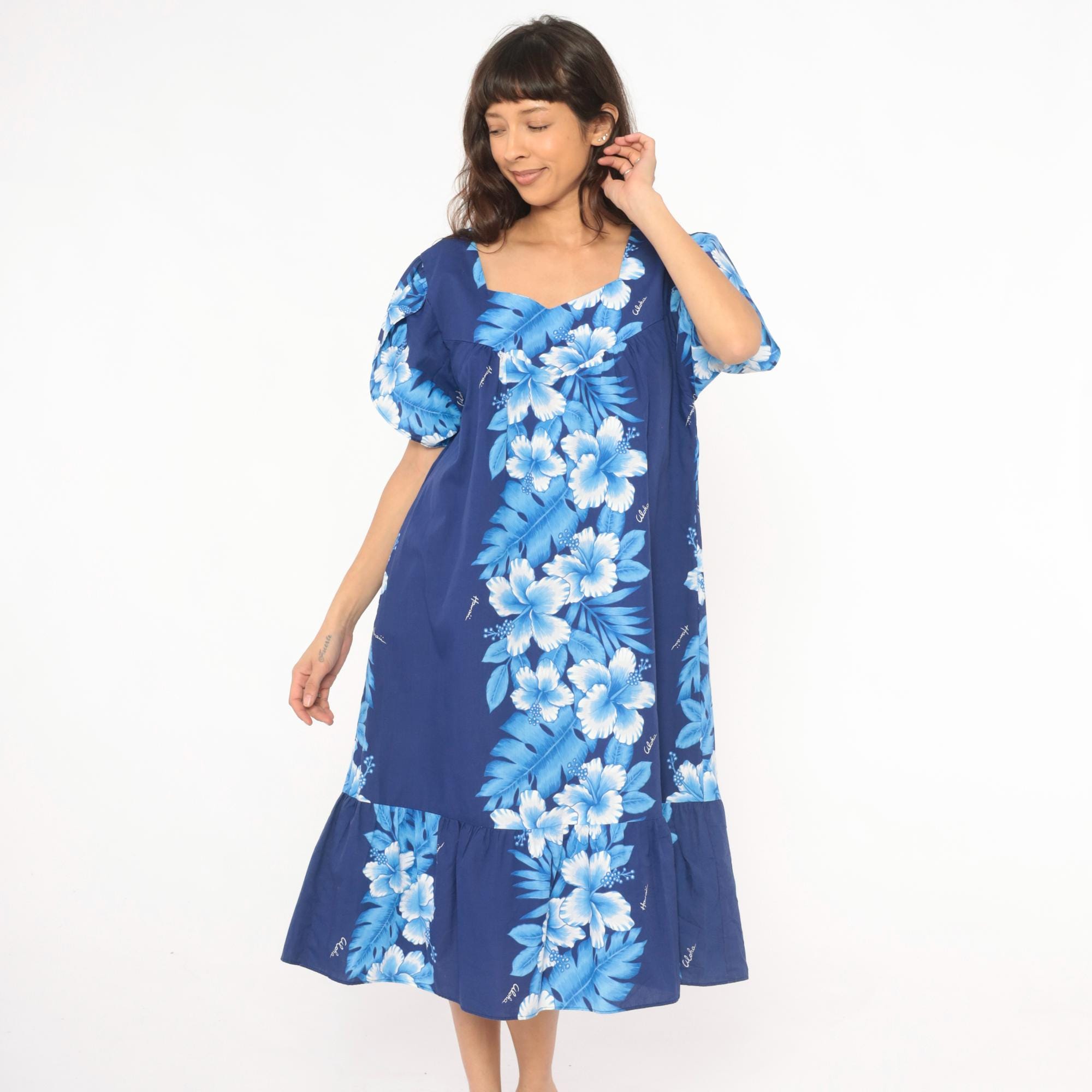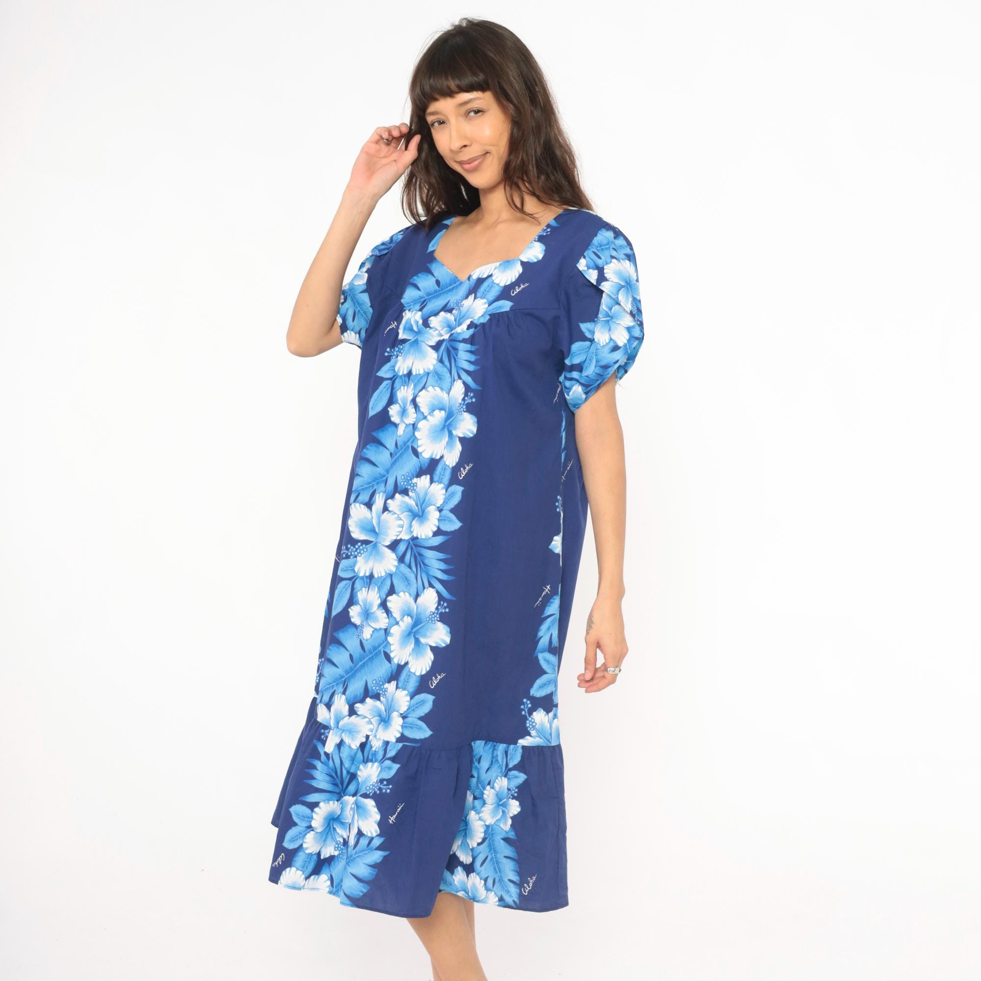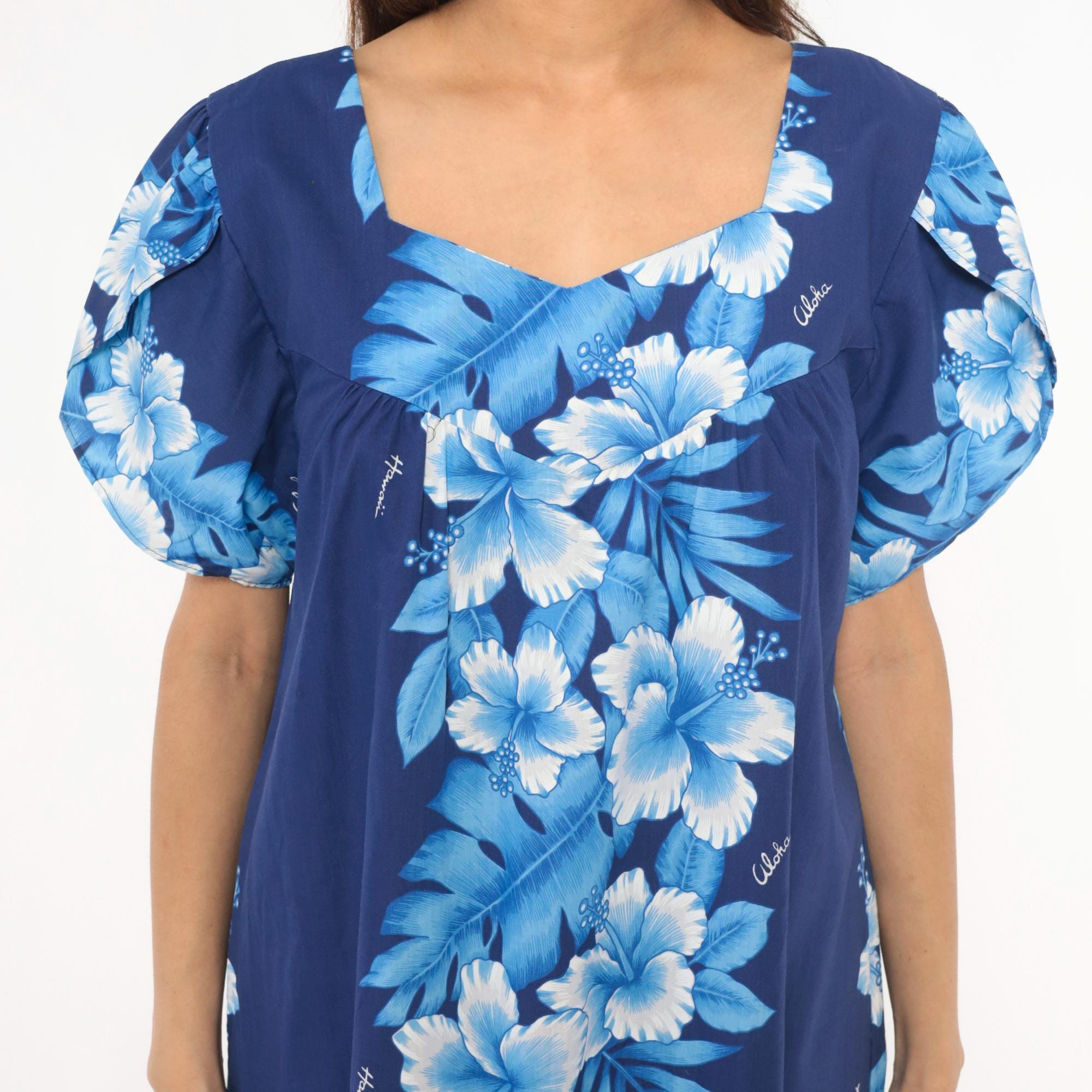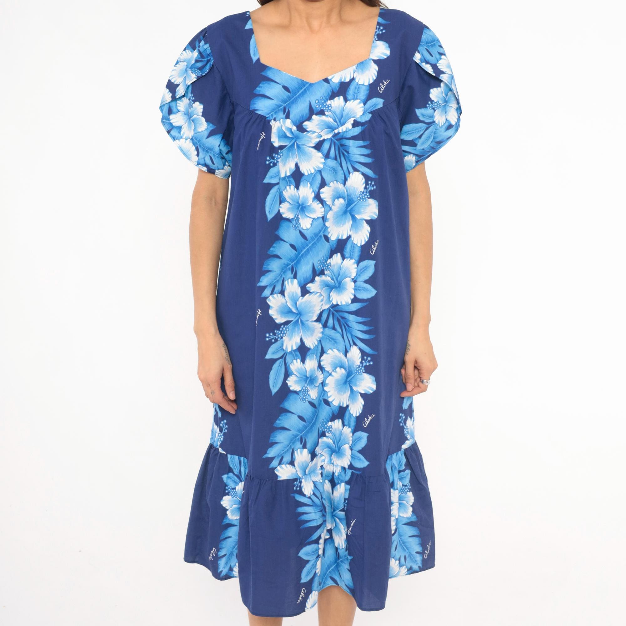 80s Hawaiian muumuu dress from Kalena Fashions in navy blue with a cascading hibiscus floral panel in white and powder blue tones down the center front and back. V-shaped sweetheart neckline with gathered bodice, short puff sleeves, and a wide ruffle hem at the bottom.