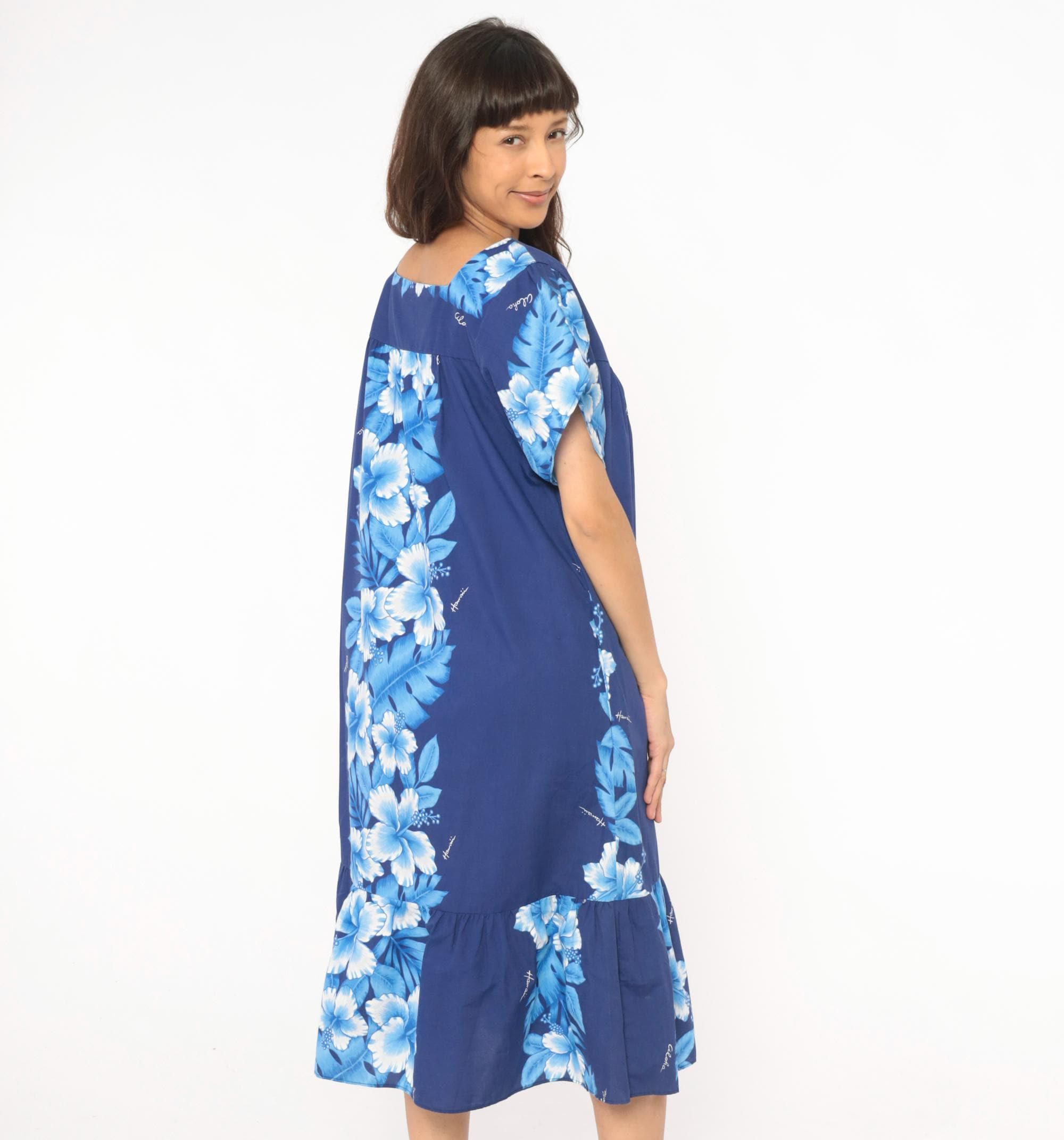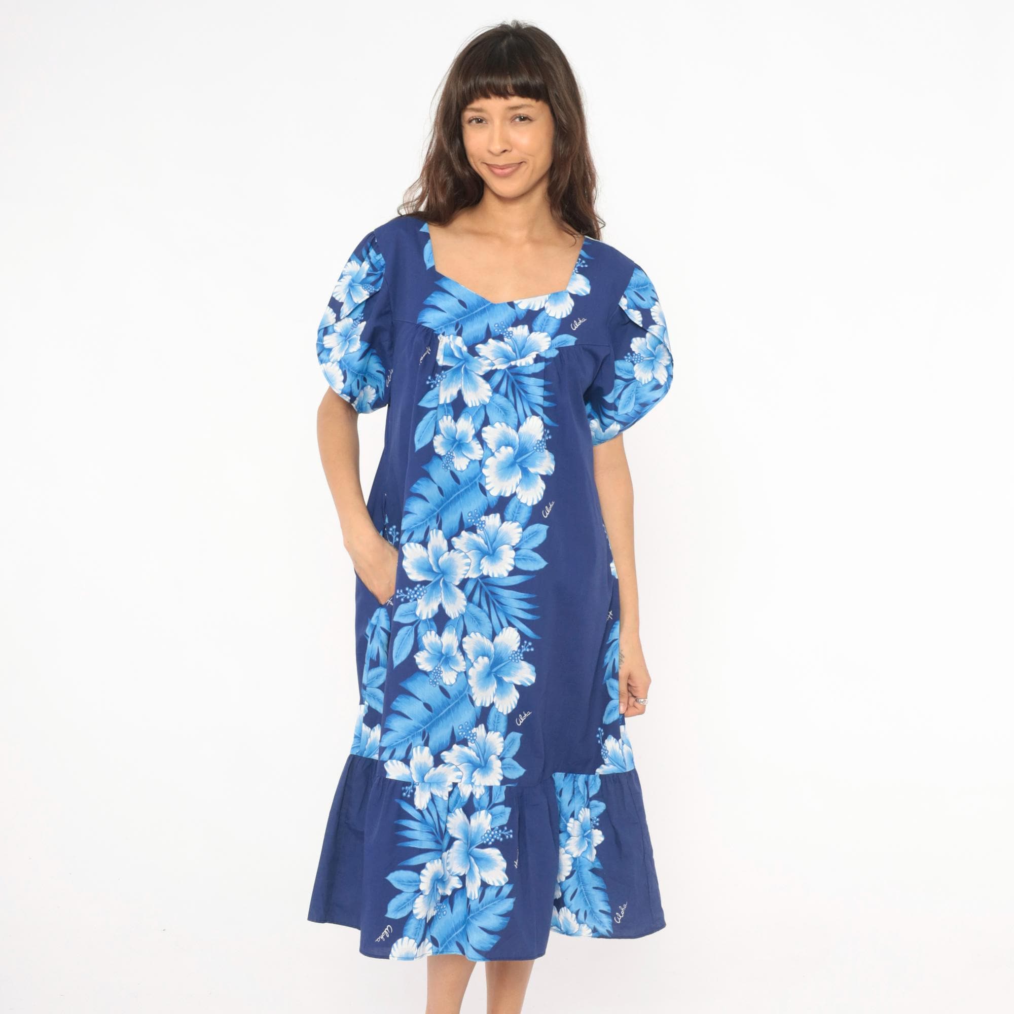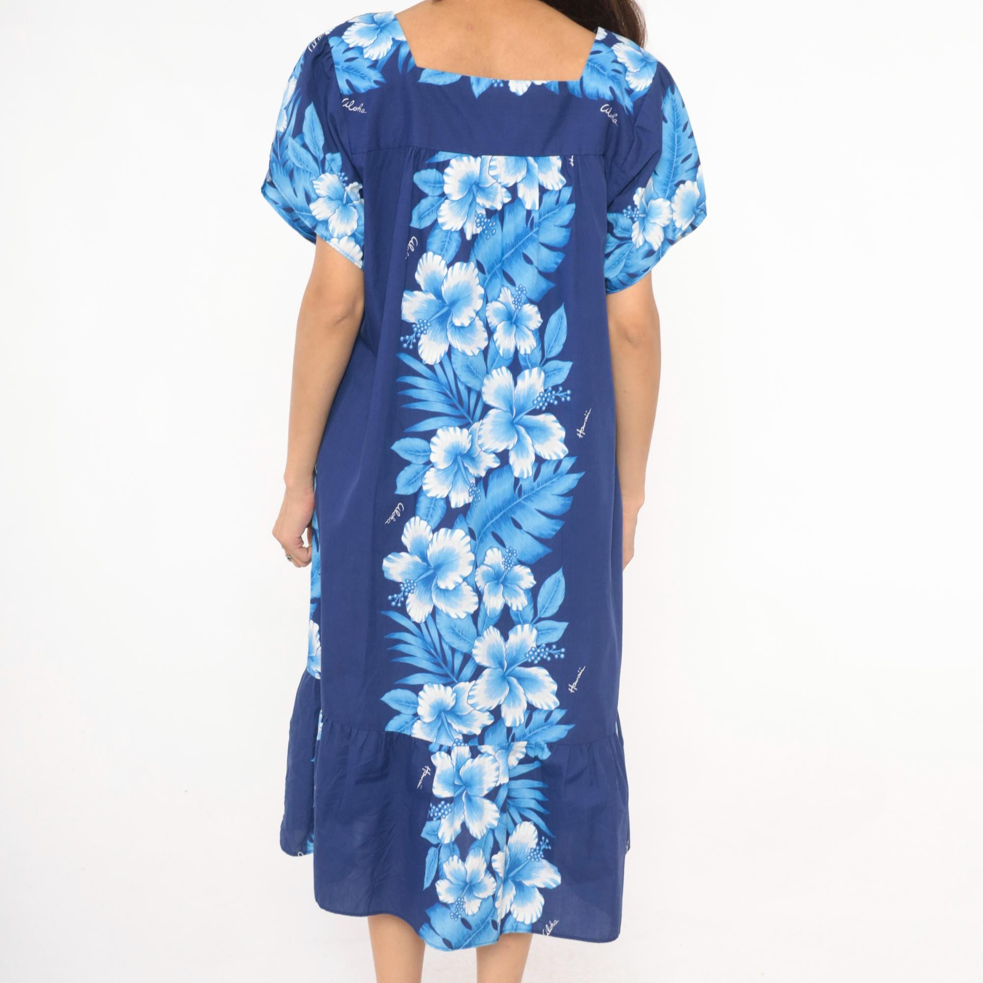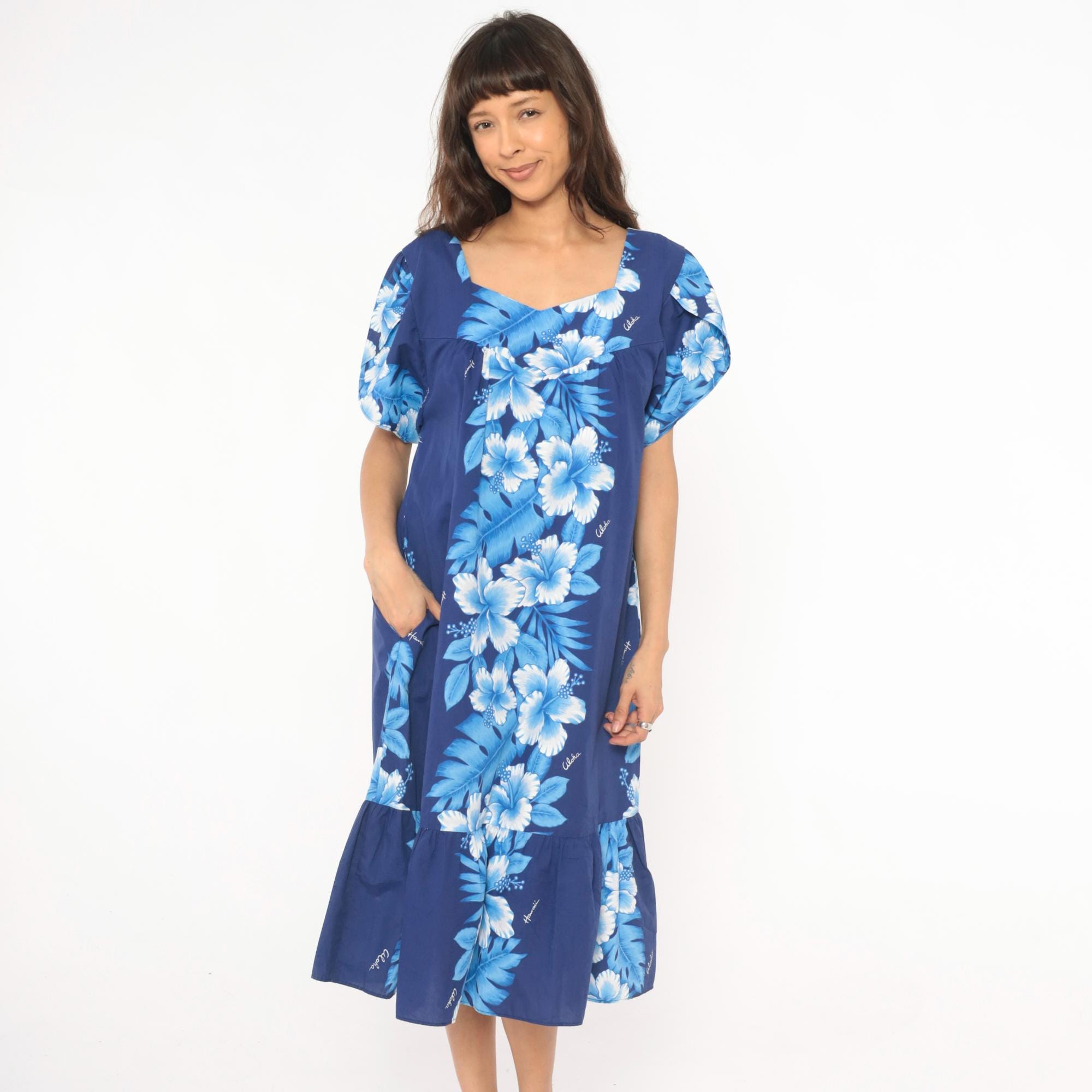 80s Hawaiian muumuu dress from Kalena Fashions in navy blue with a cascading hibiscus floral panel in white and powder blue tones down the center front and back. V-shaped sweetheart neckline with gathered bodice, short puff sleeves, and a wide ruffle hem at the bottom.