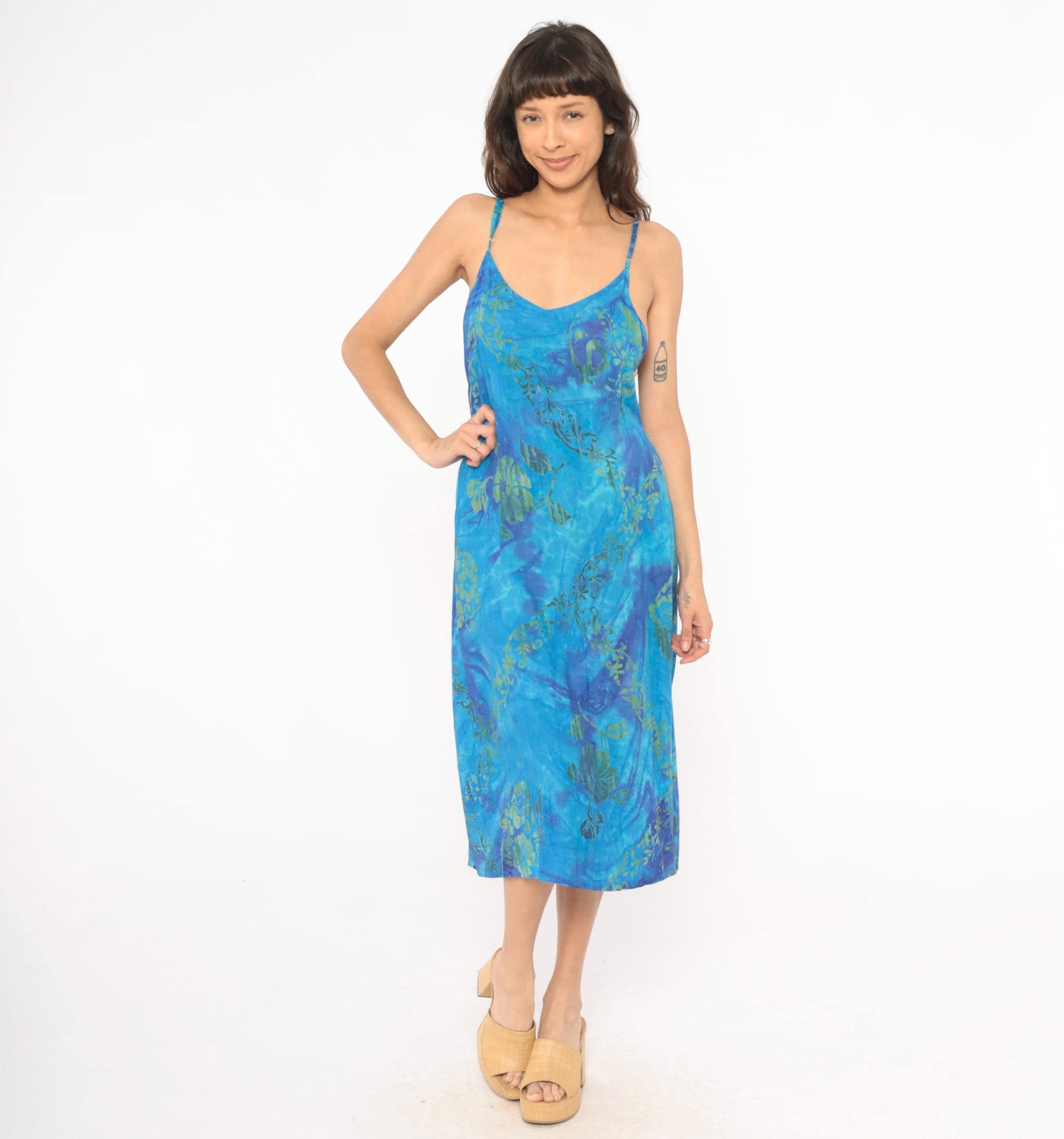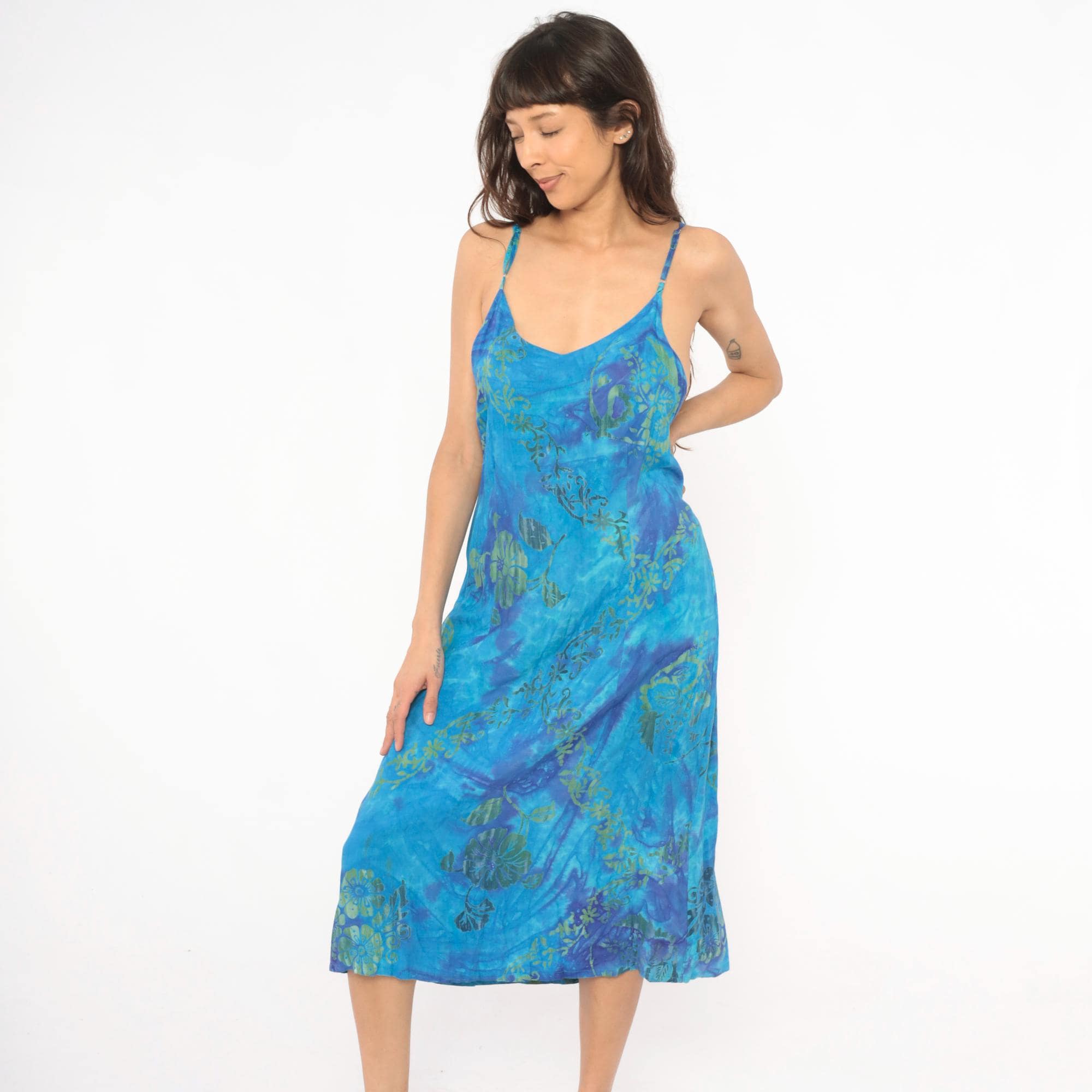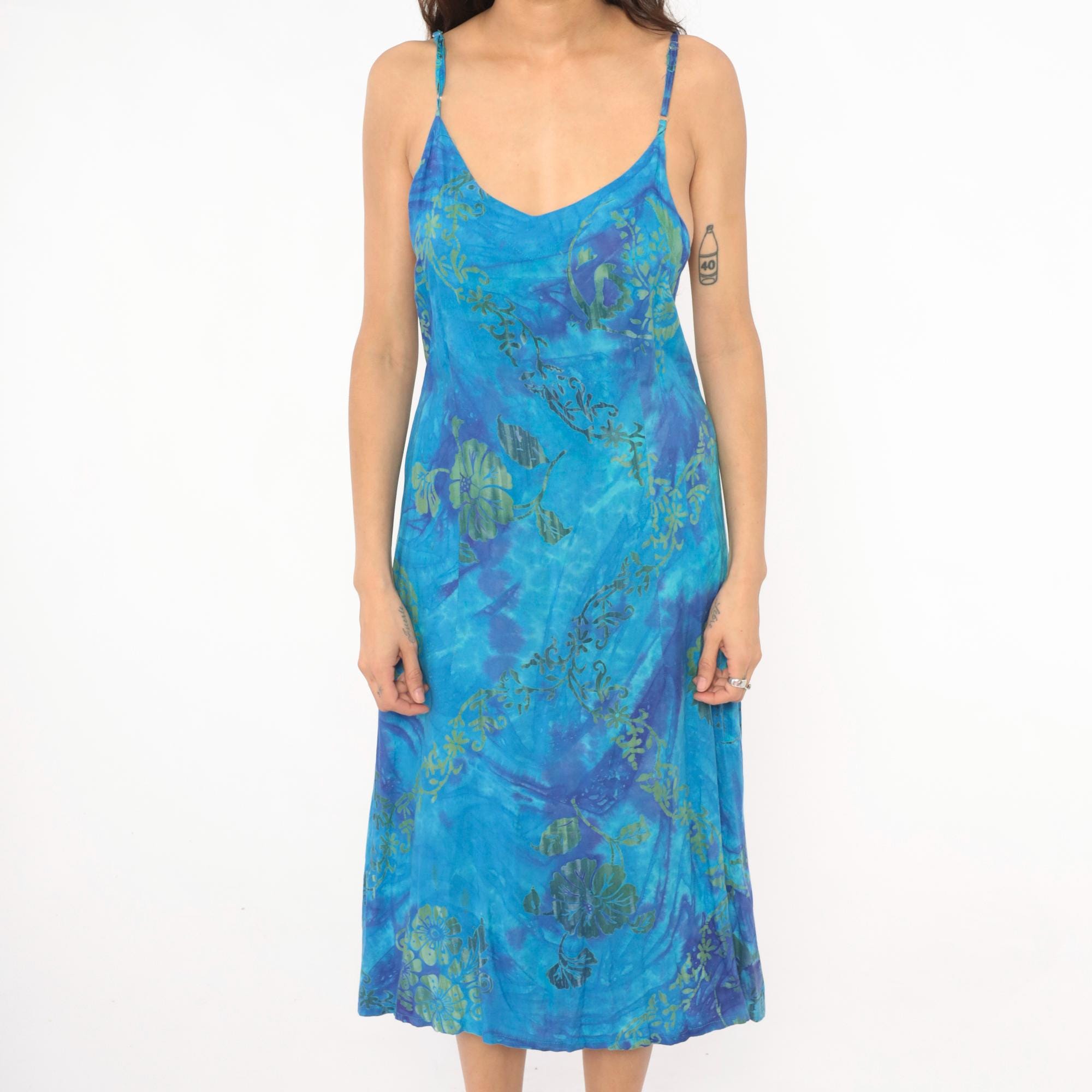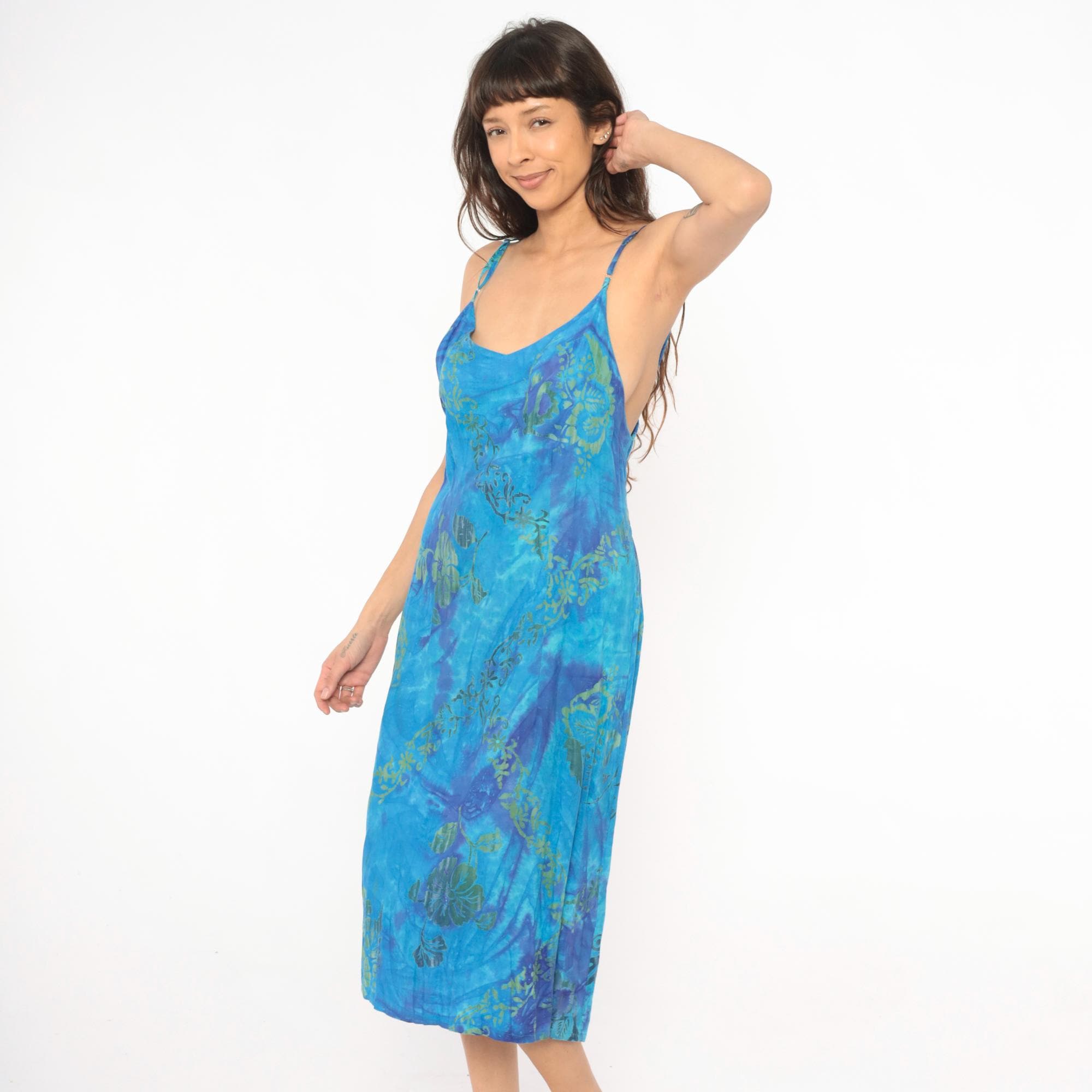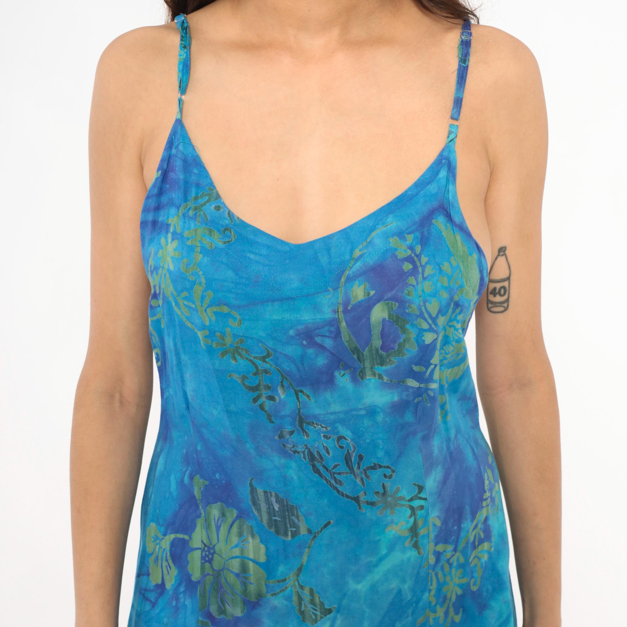 2000s tie dye slip dress from Hand Kreation in shades of cerulean blue, purple, and green with hibiscus florals and leaf motifs throughout. Spaghetti straps, V-neckline at front, and smocked elasticized back bodice.
