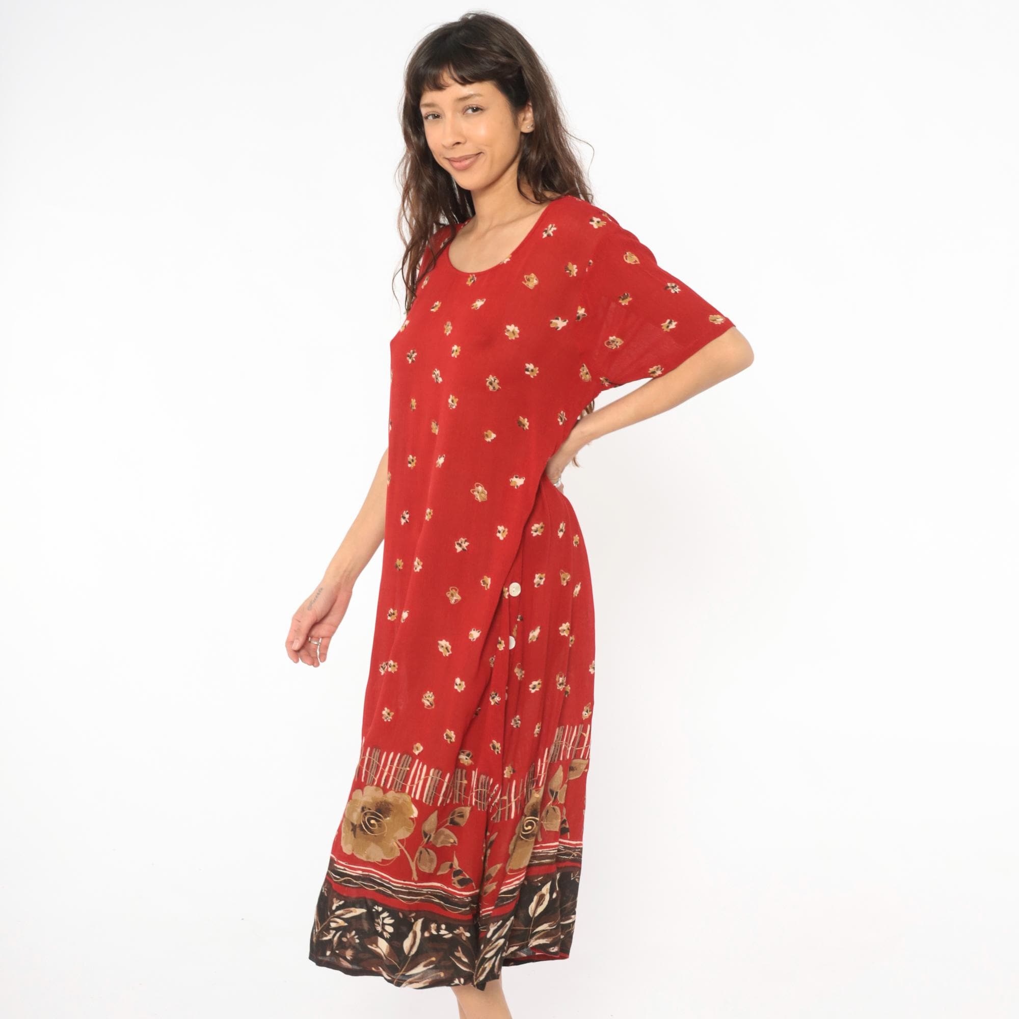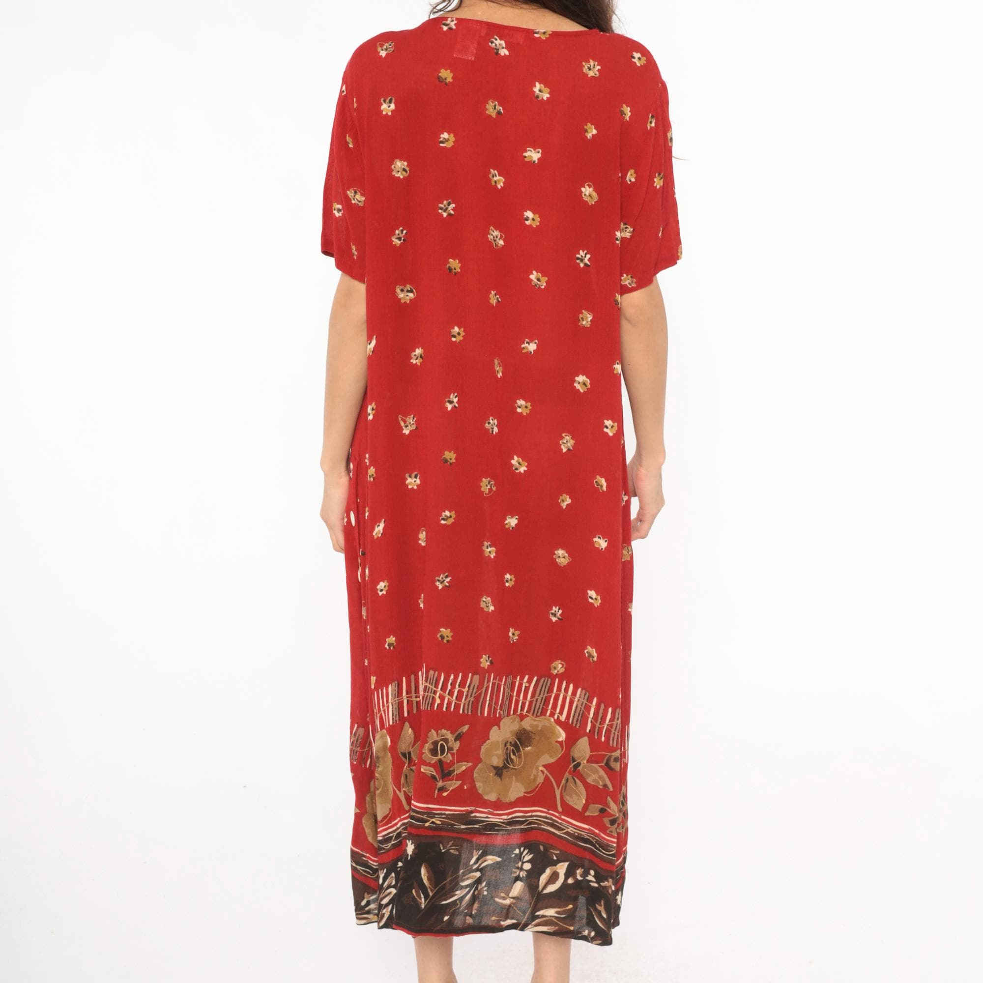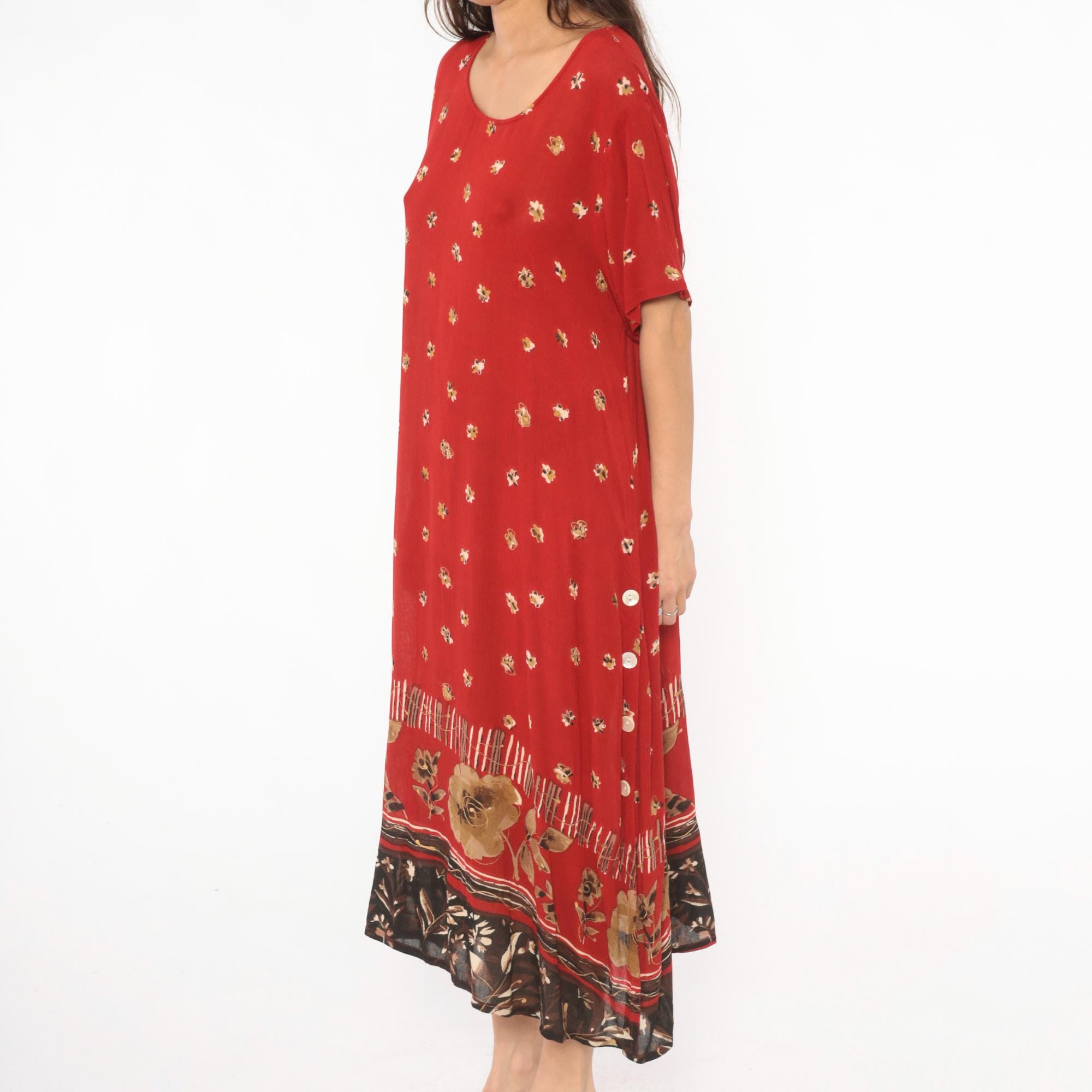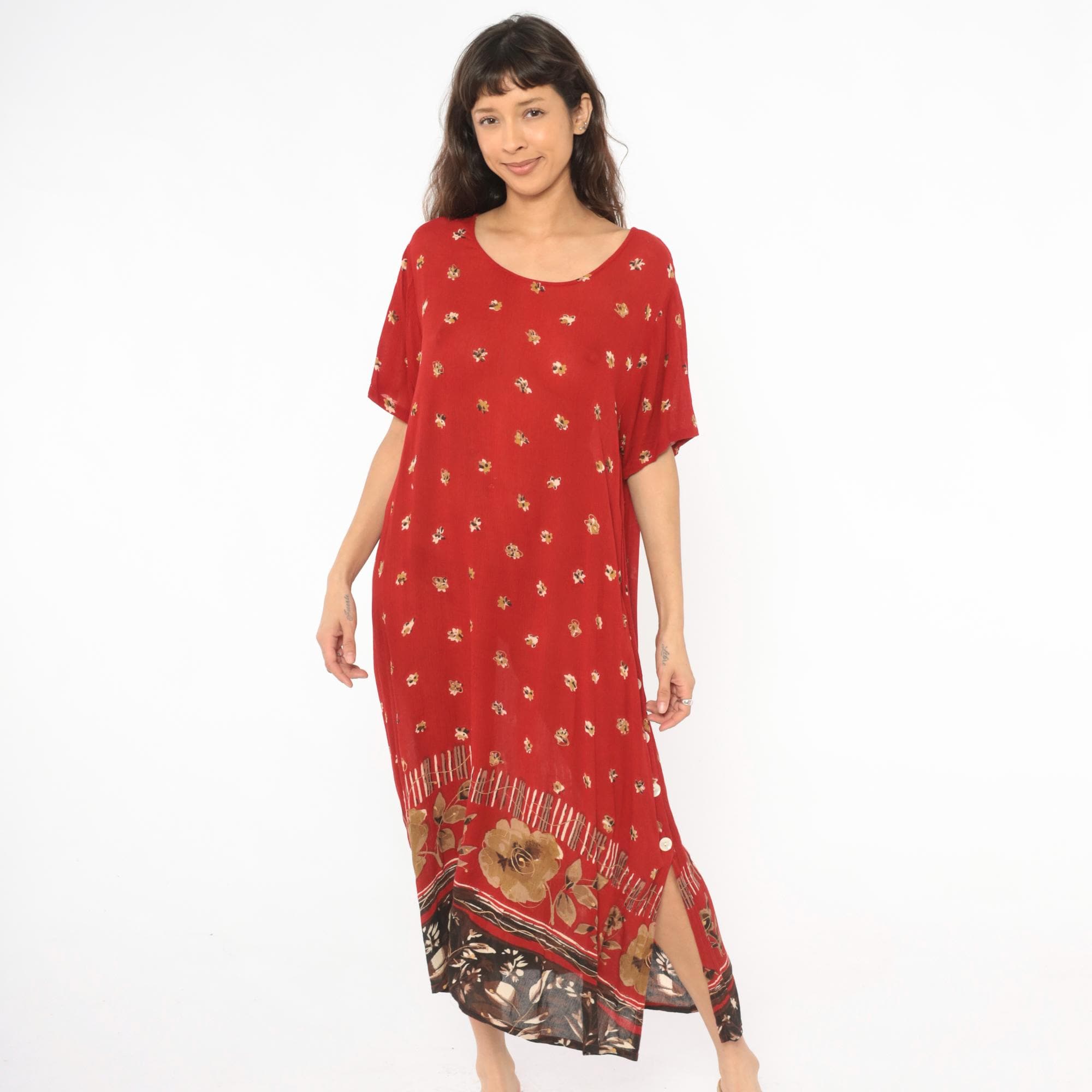 Deep red 90s maxi dress with scattered small floral motifs across the body in gold and cream tones. Scoop neckline, short sleeves, and a relaxed straight silhouette with button-accented side slits near the hem.