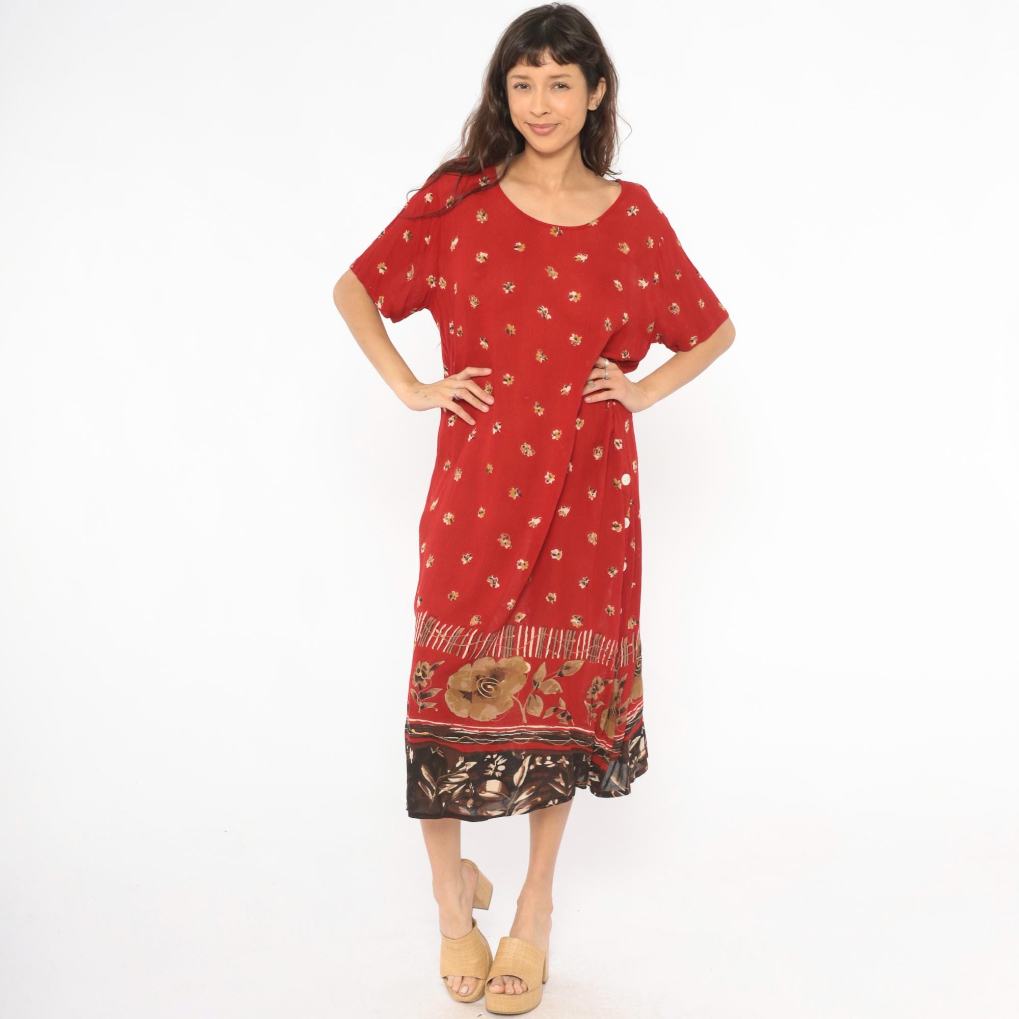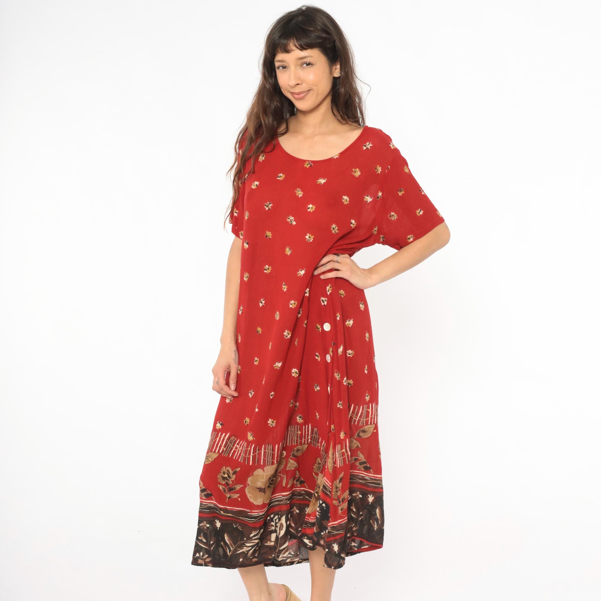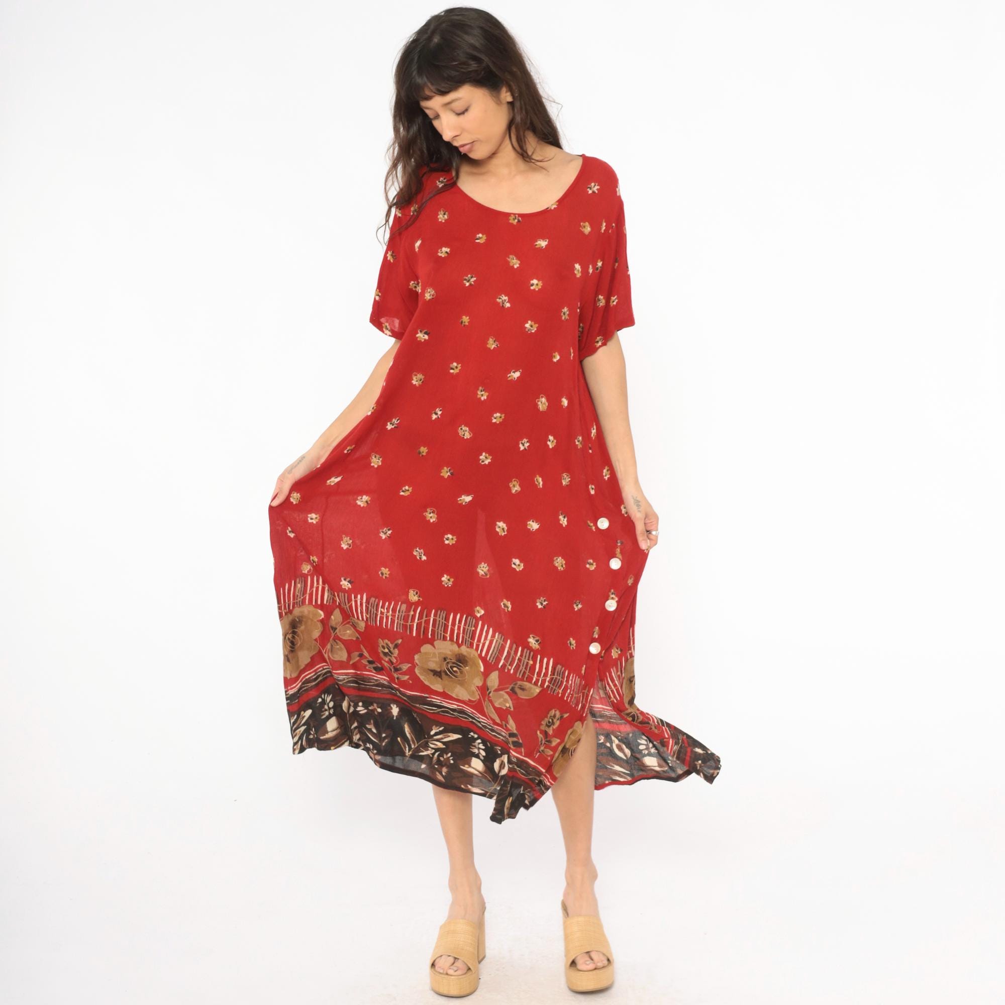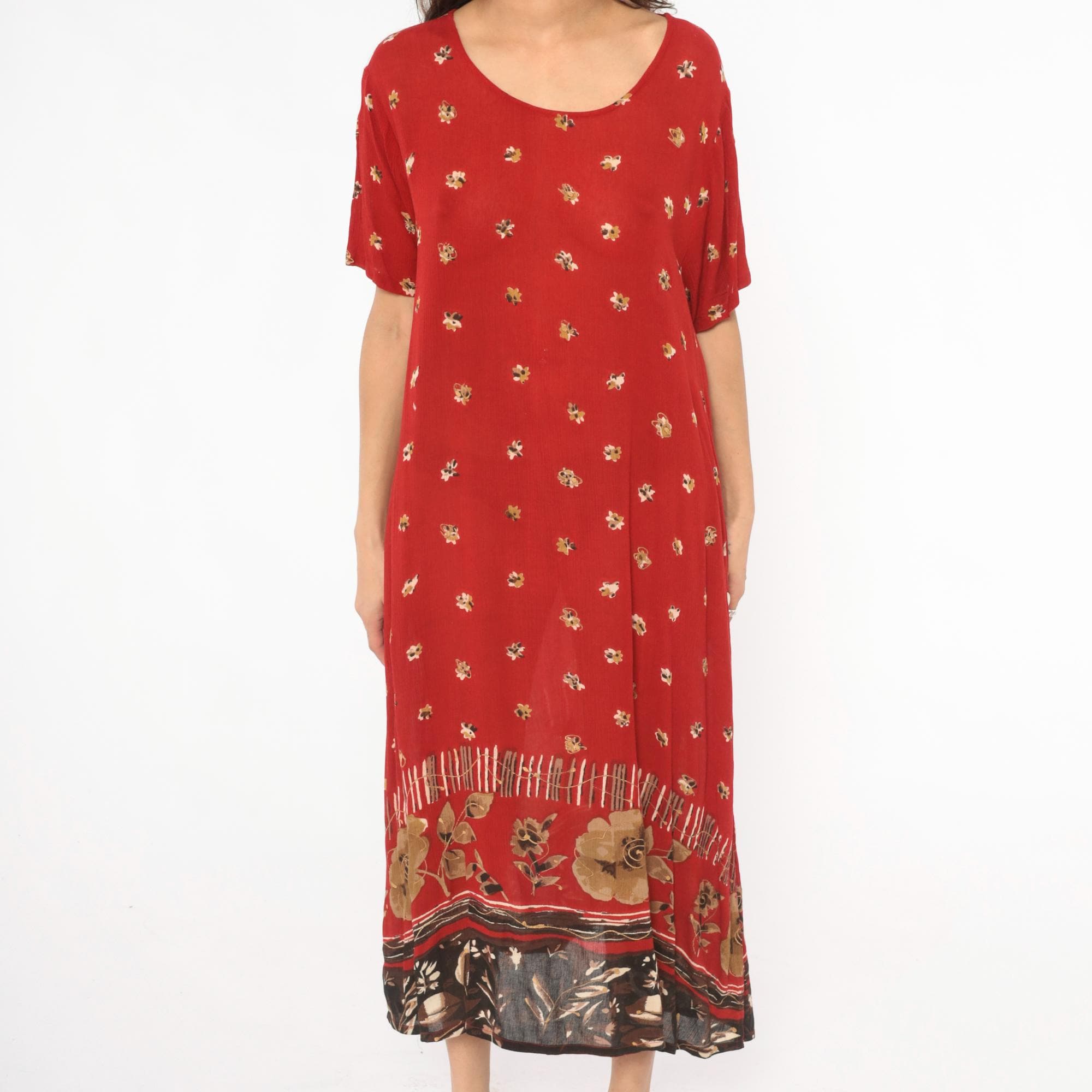 Deep red 90s maxi dress with scattered small floral motifs across the body in gold and cream tones. Scoop neckline, short sleeves, and a relaxed straight silhouette with button-accented side slits near the hem.