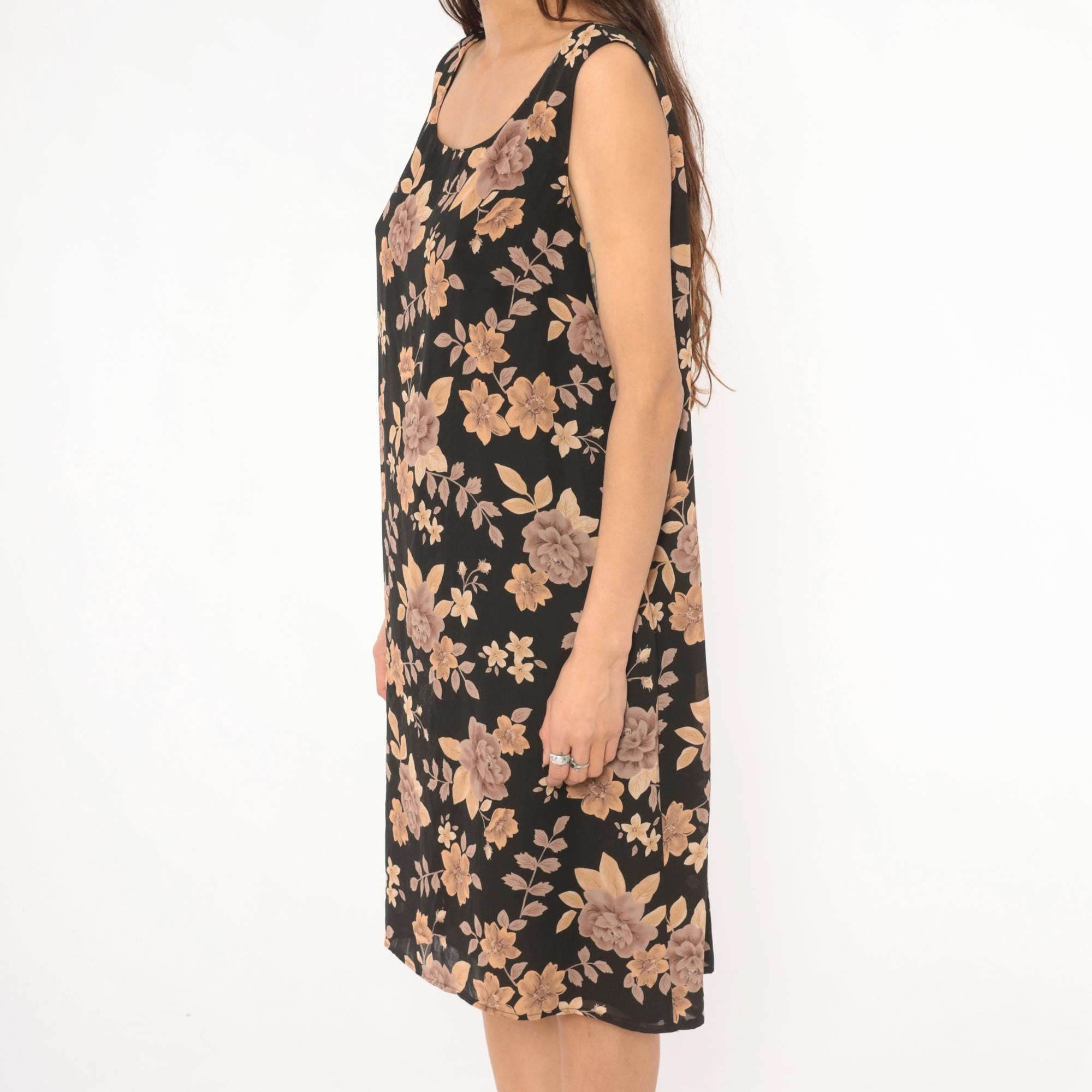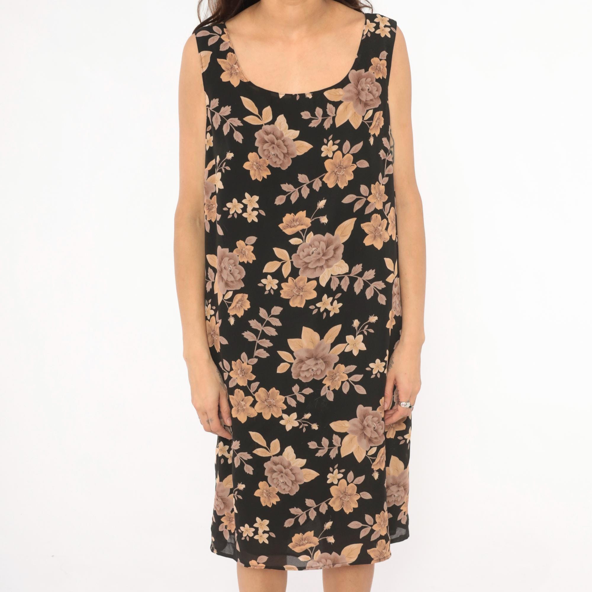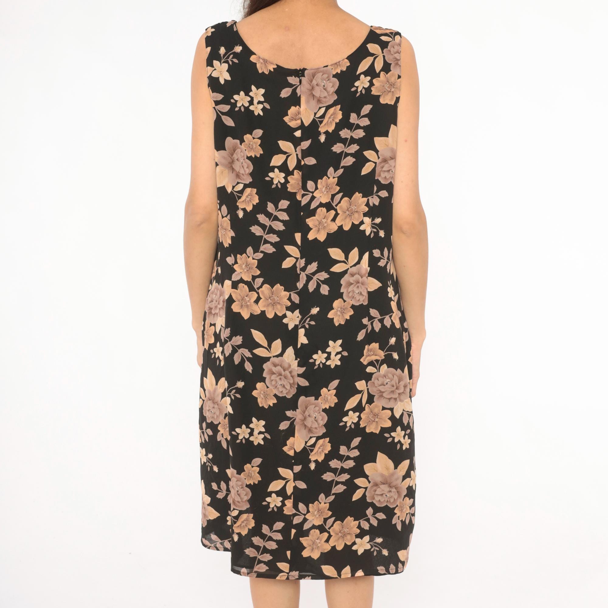 90s black tank dress from Laura Scott with tan, taupe, and brown rose floral print throughout. Scoop neckline on both front and back, with a zip closure at the upper back. Straight shift silhouette with a knee-length hem and sleeveless cut.