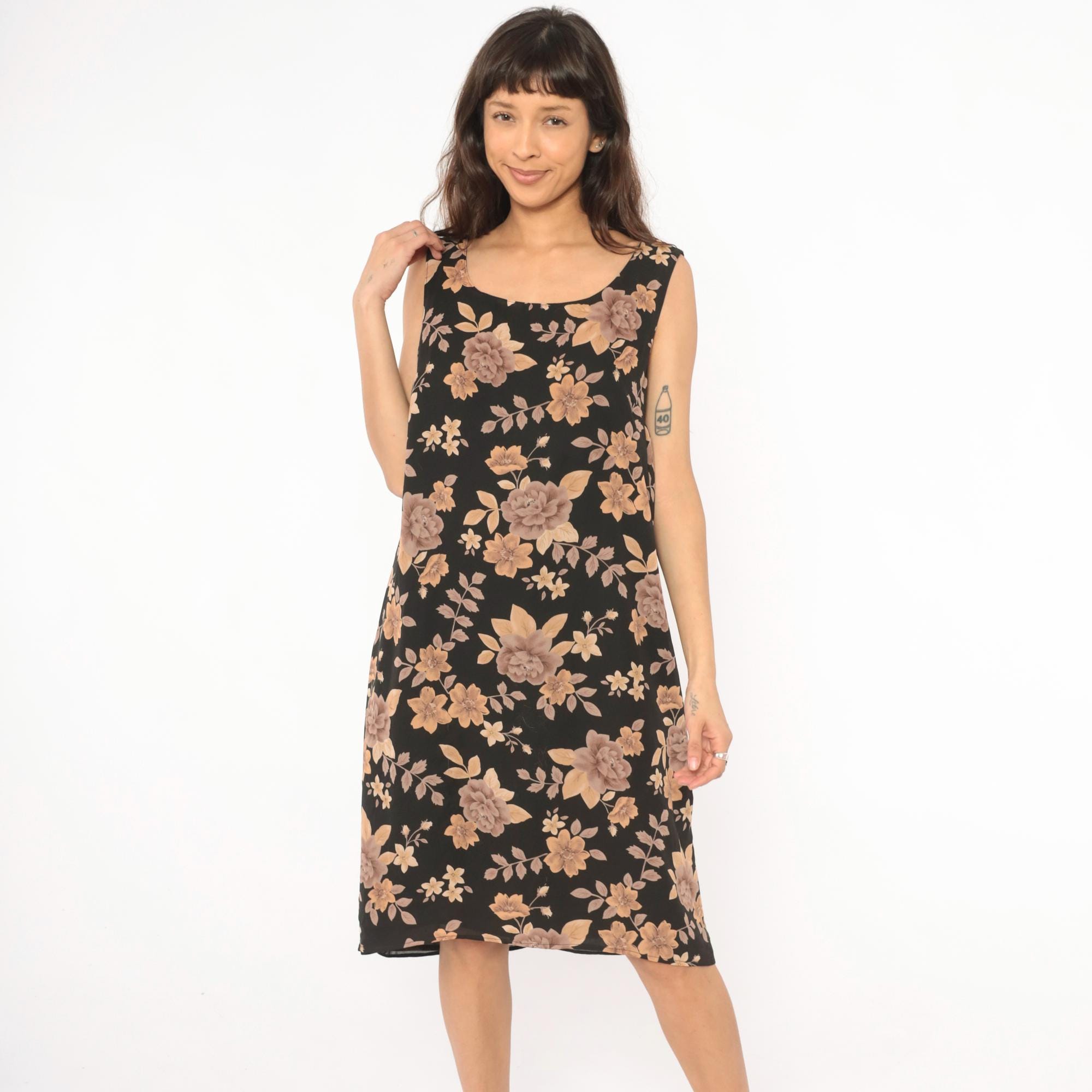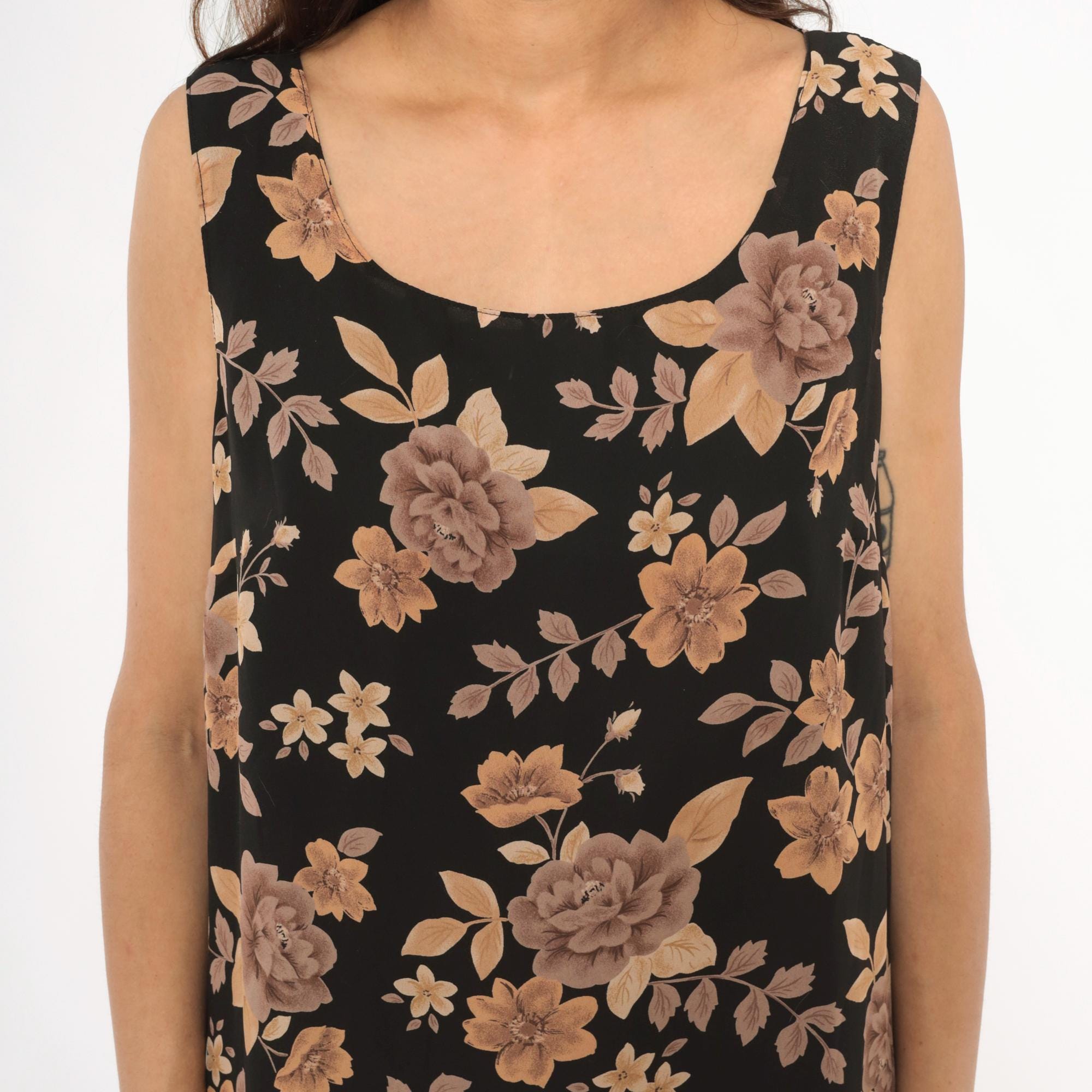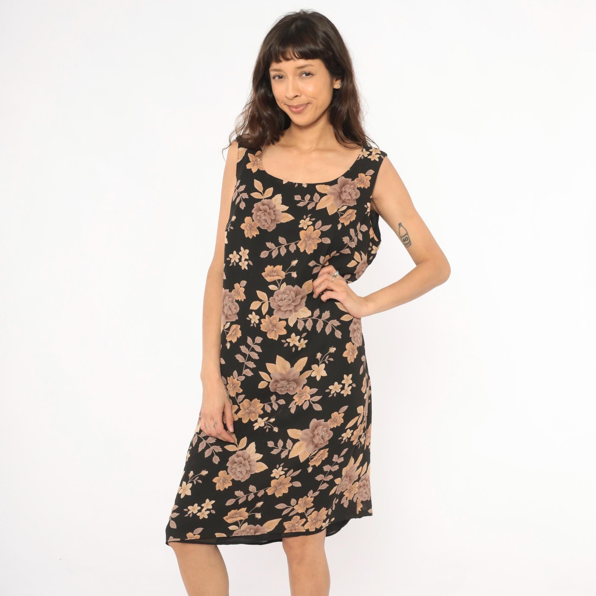 90s black tank dress from Laura Scott with tan, taupe, and brown rose floral print throughout. Scoop neckline on both front and back, with a zip closure at the upper back. Straight shift silhouette with a knee-length hem and sleeveless cut.