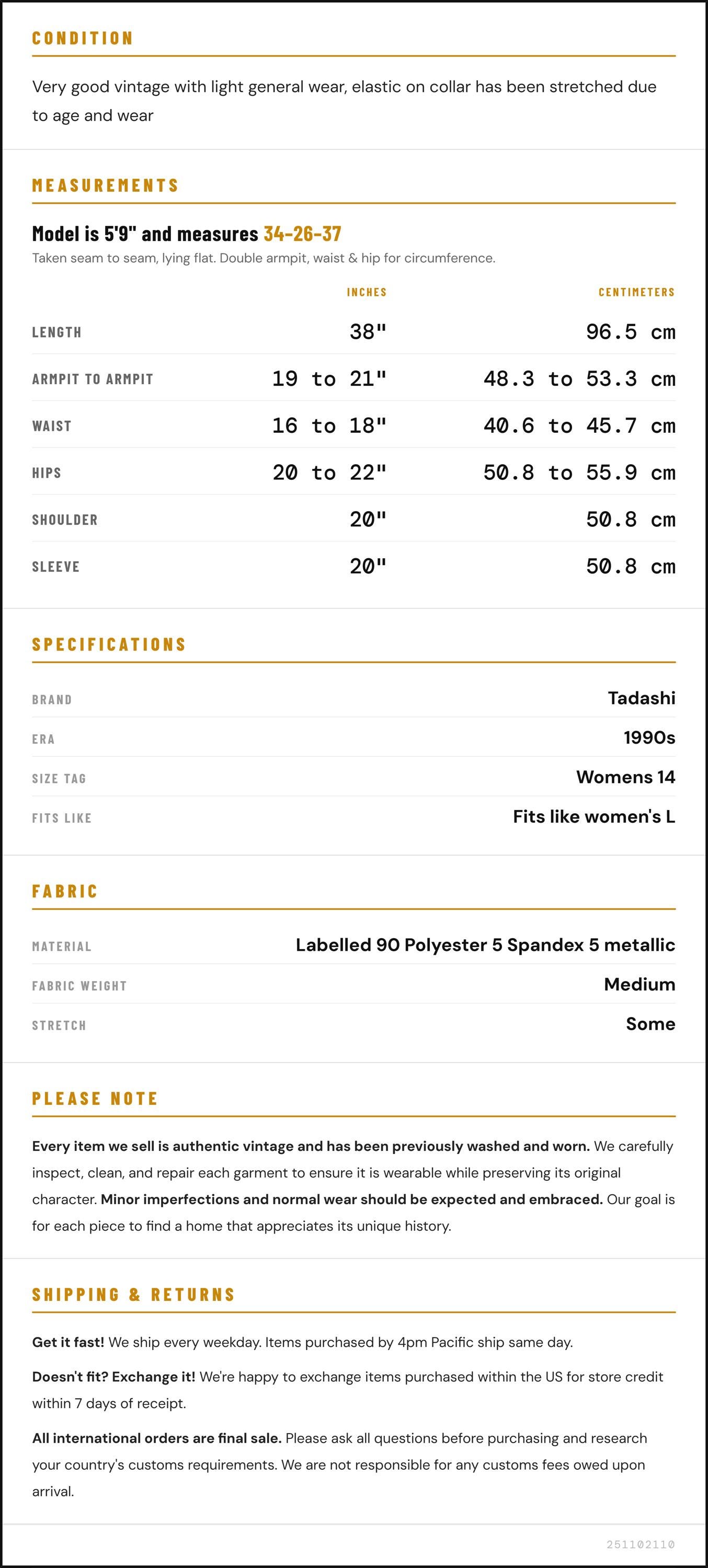 Material: Labelled 90 Polyester 5 Spandex 5 metallic