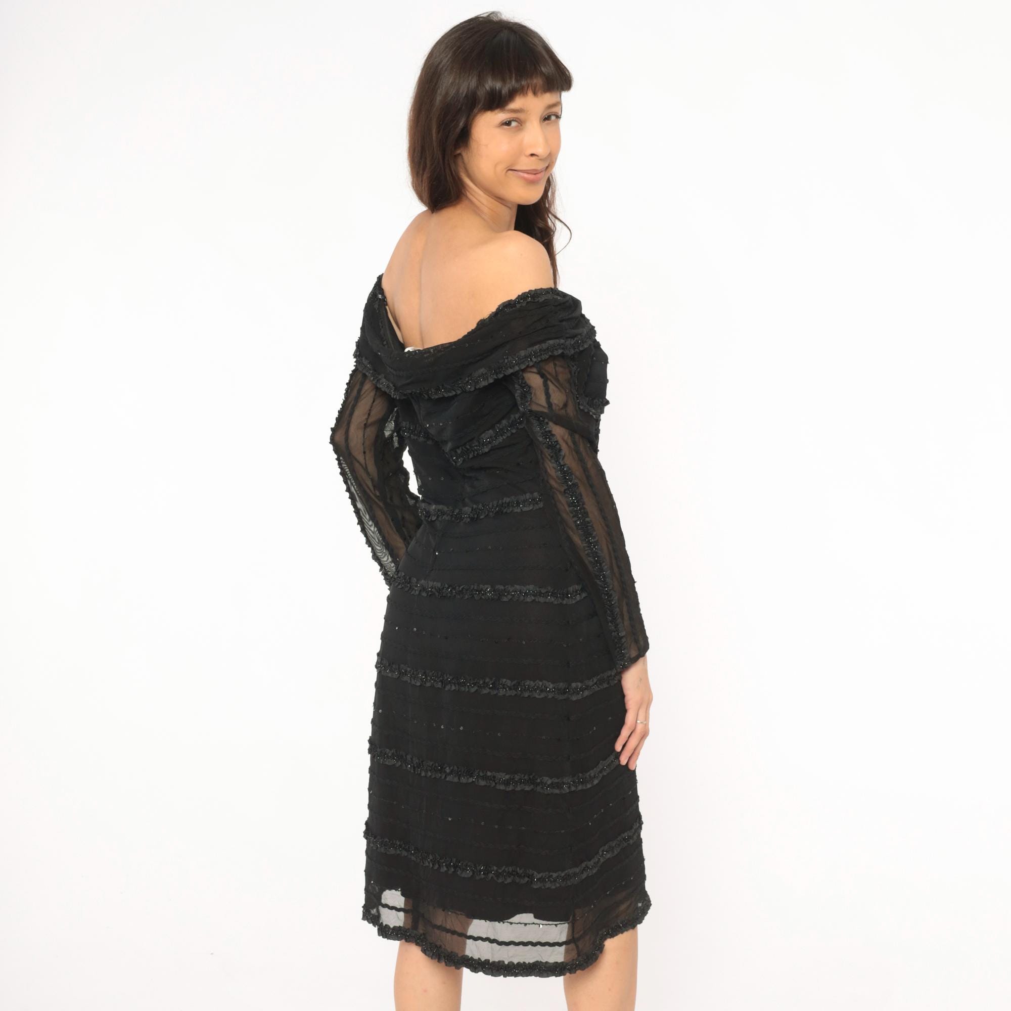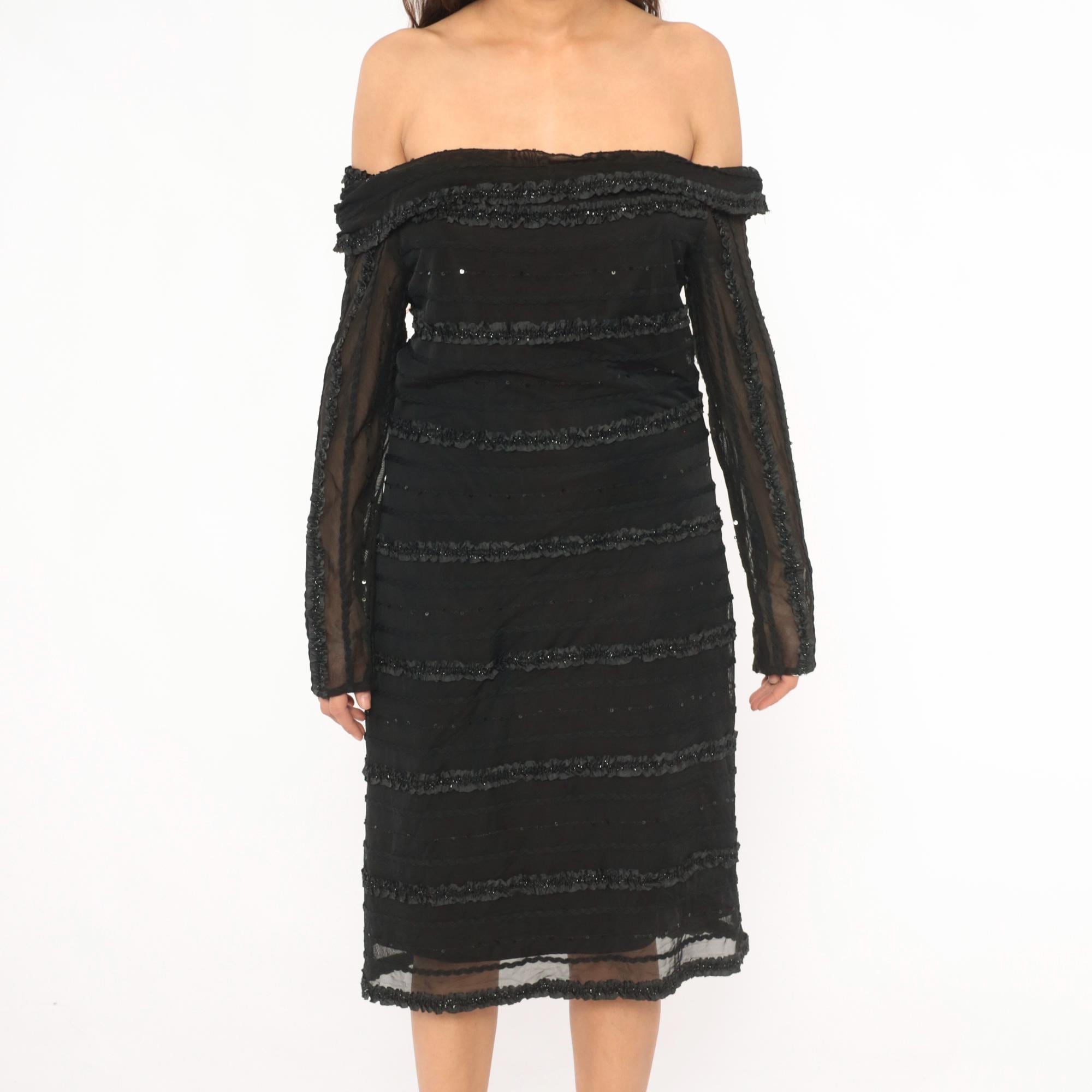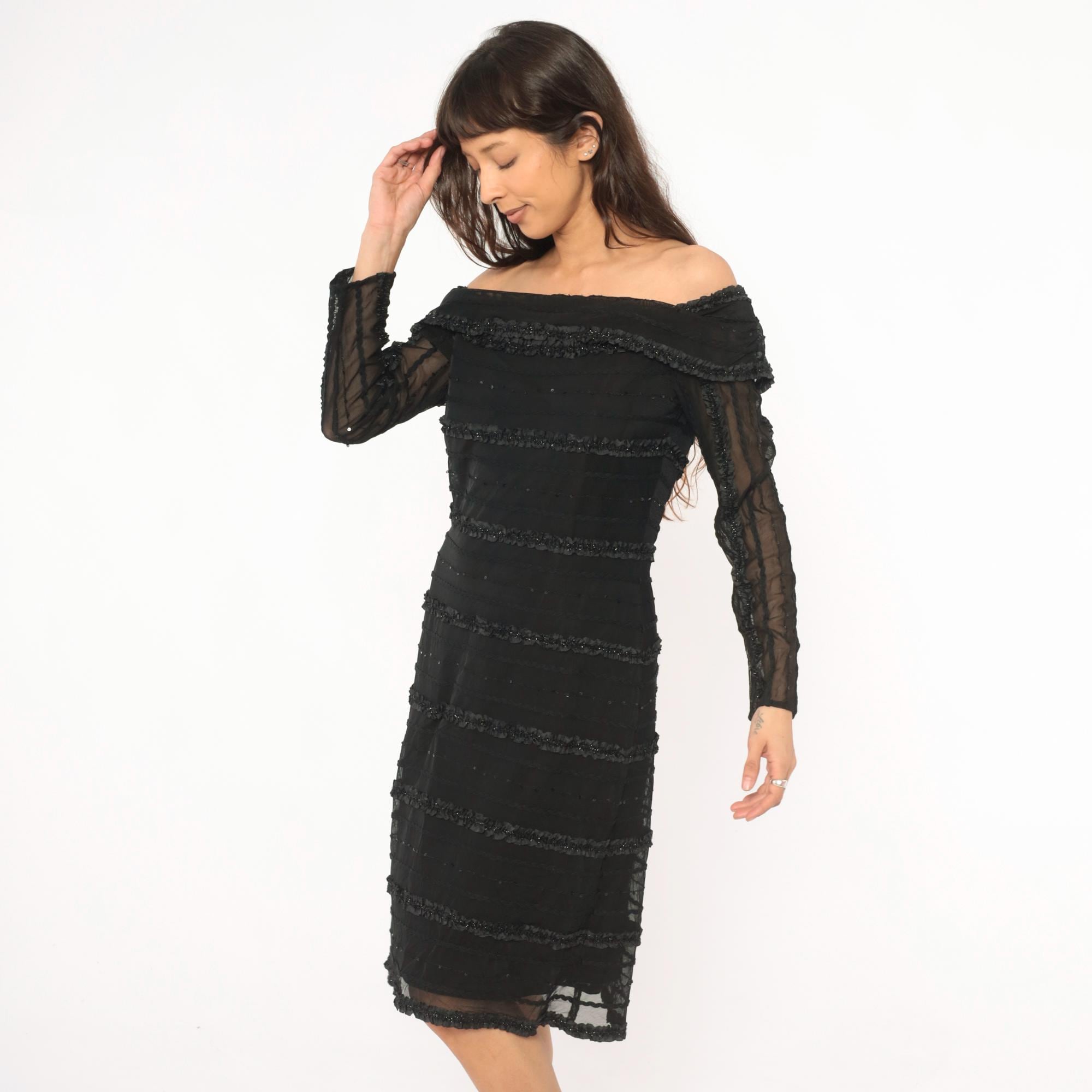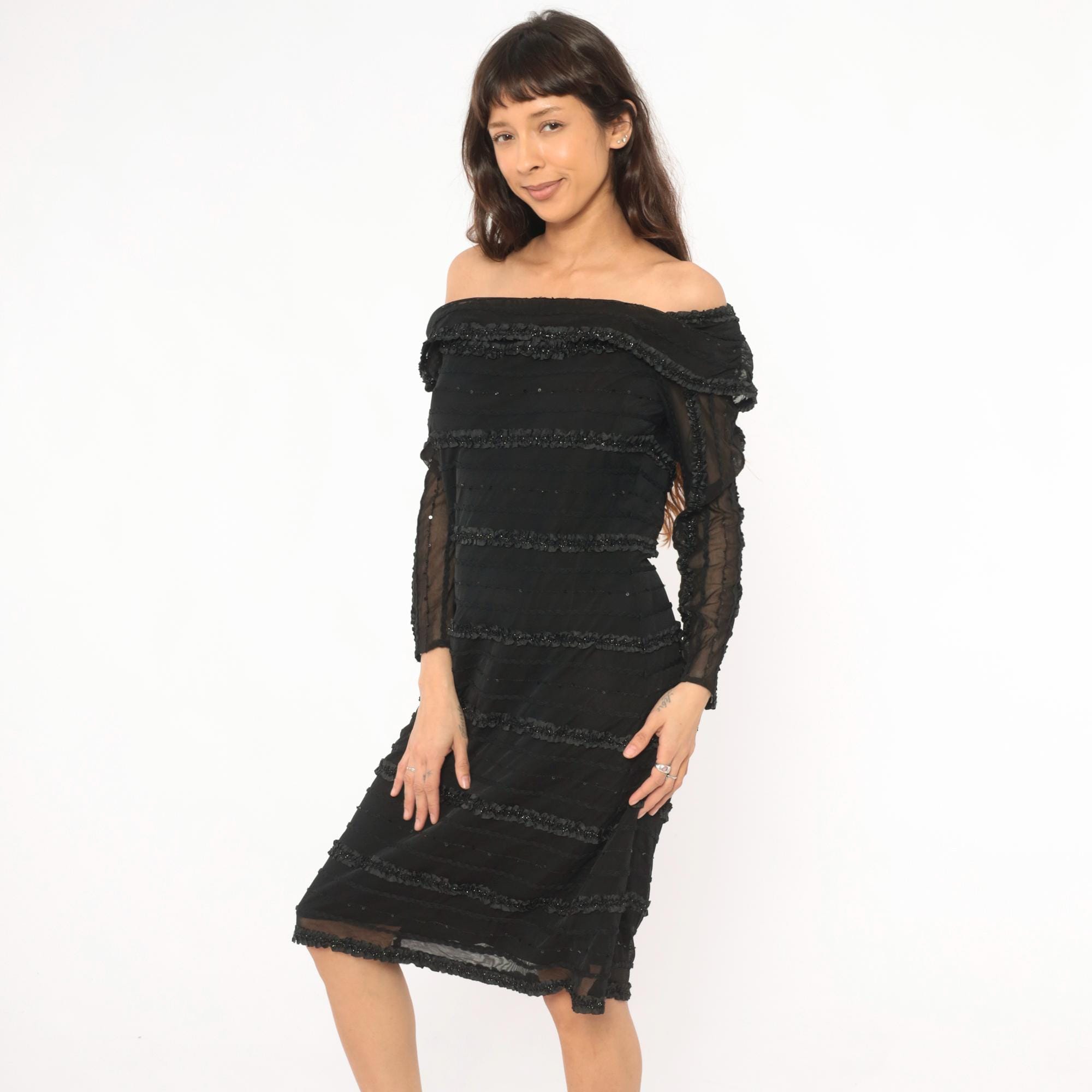 90s off-shoulder cocktail dress from Tadashi in black with horizontal beaded ruffle trim bands across the entire body and sheer mesh long sleeves. Bardot neckline with a wide folded-over collar, fitted silhouette through the waist and hips, and knee-length hem with sheer mesh at the bottom edge.