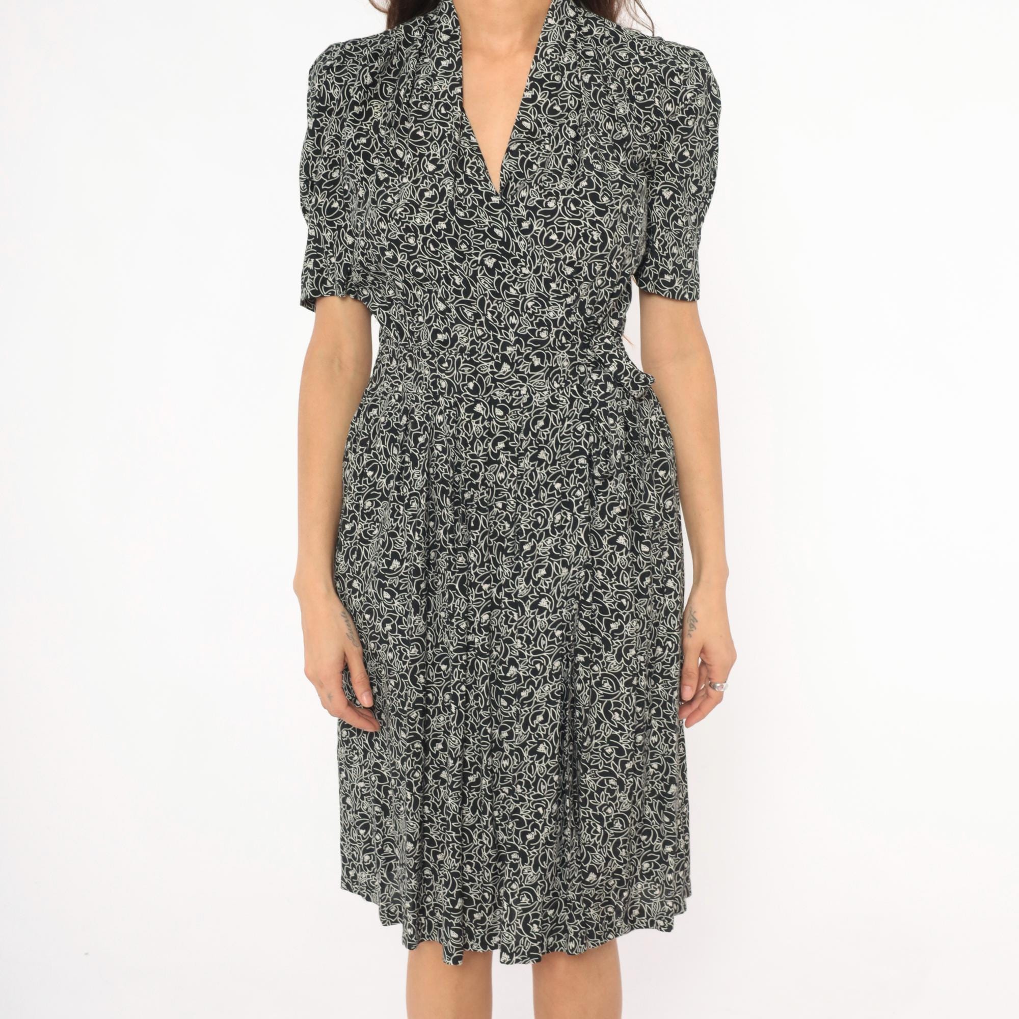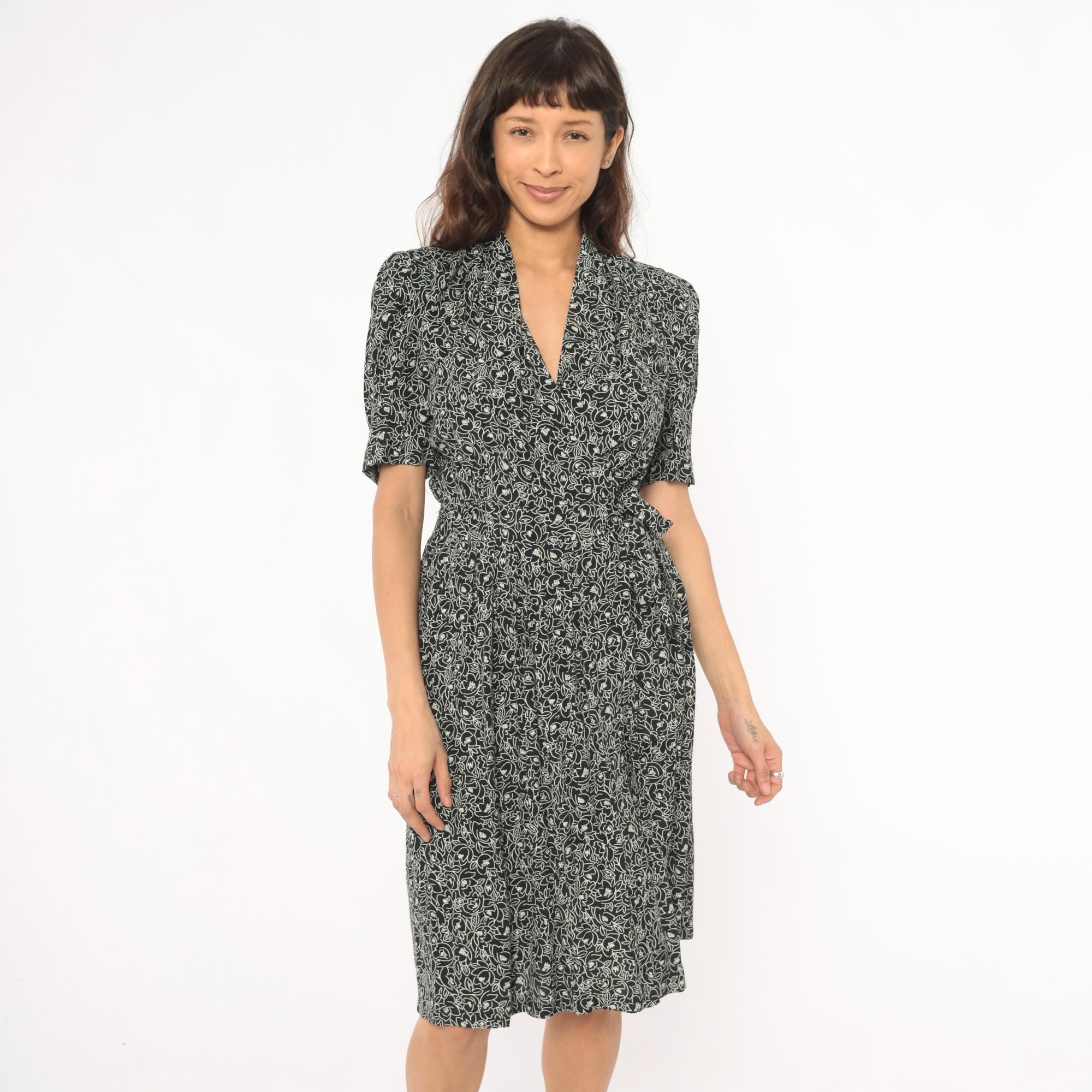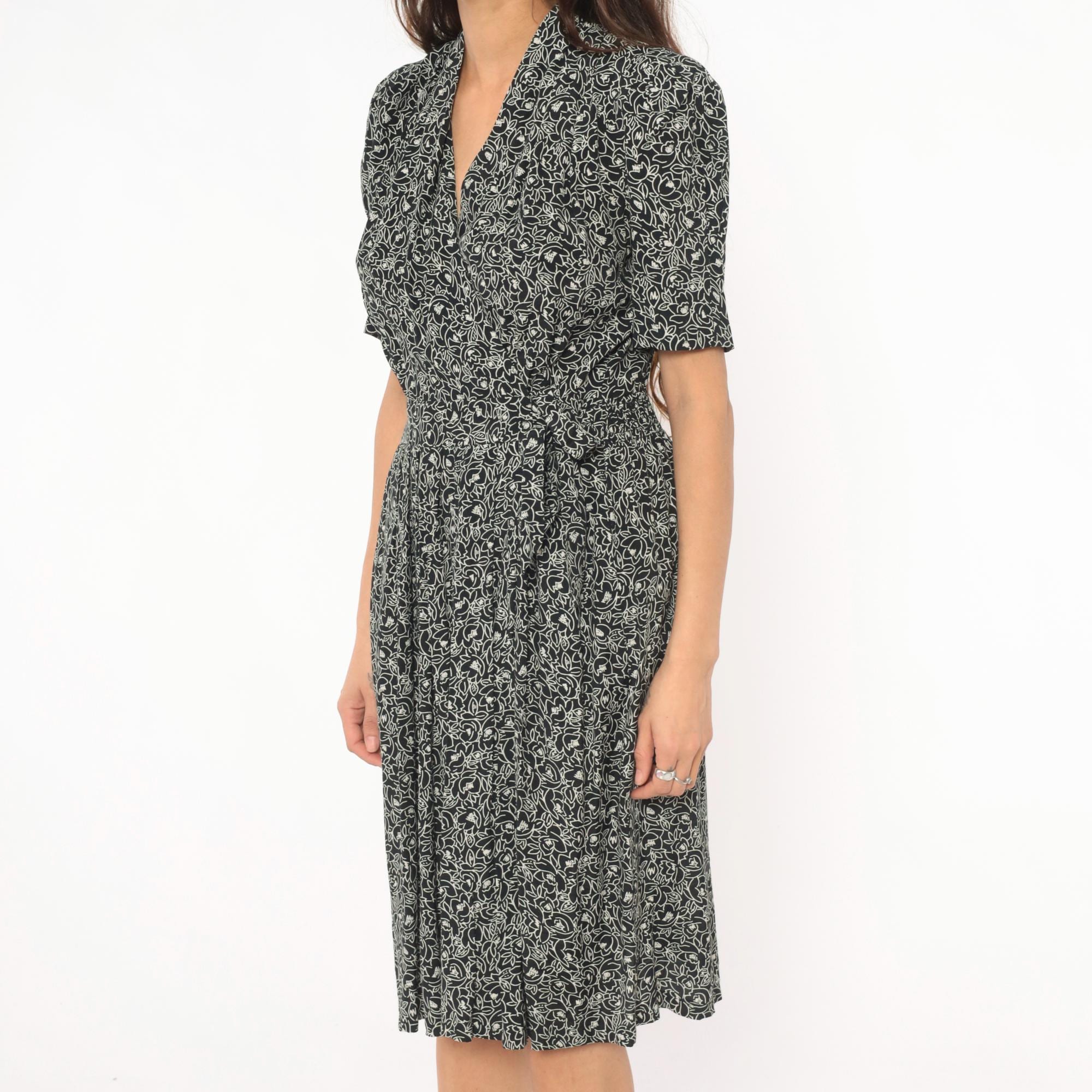 90s black and cream floral wrap dress from Karin Stevens with an allover abstract flower and leaf print. Shawl collar, V neckline, puff sleeves with elasticized cuffs, and a fitted bodice with smocked elastic panel at the back waist.
