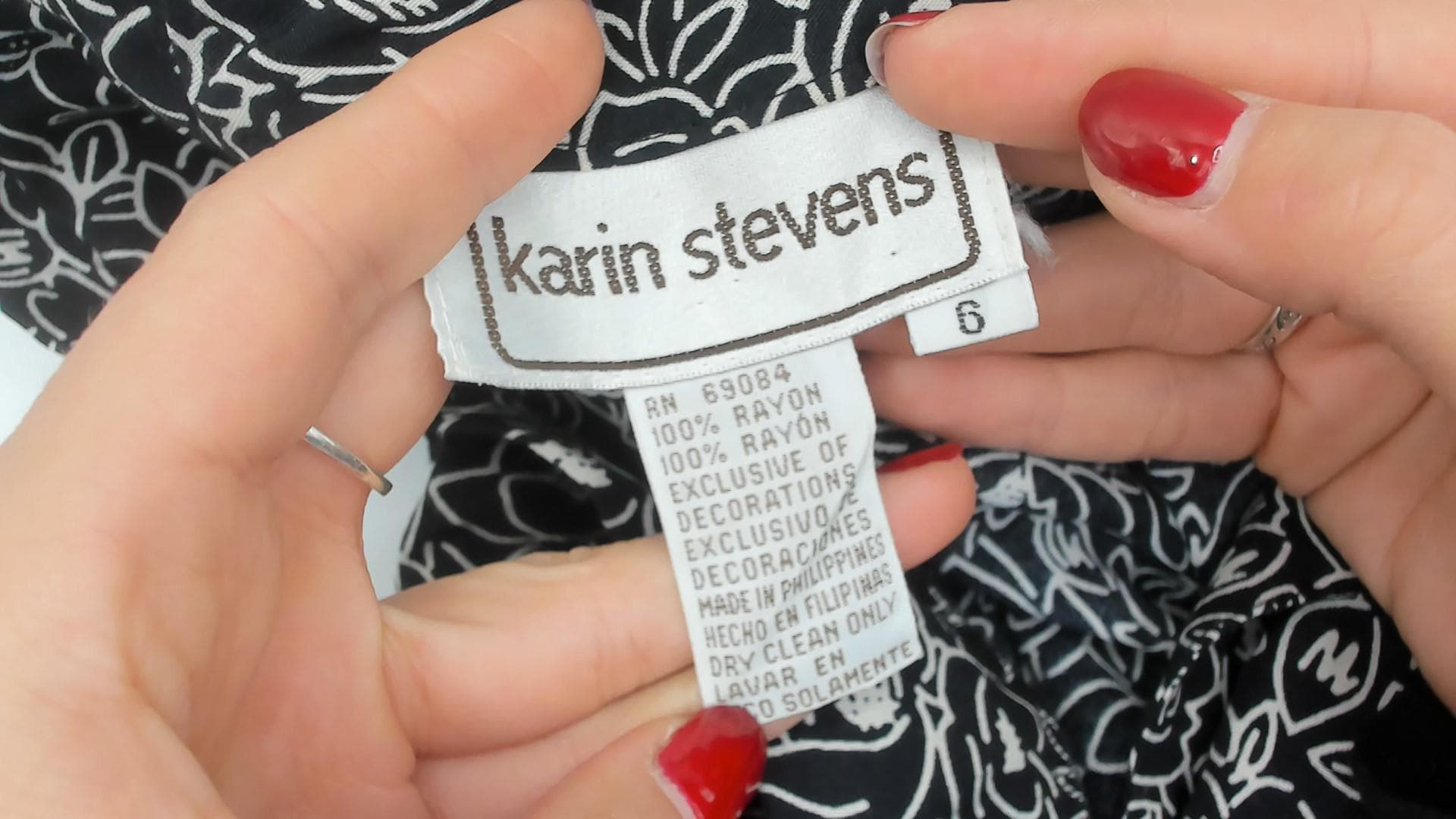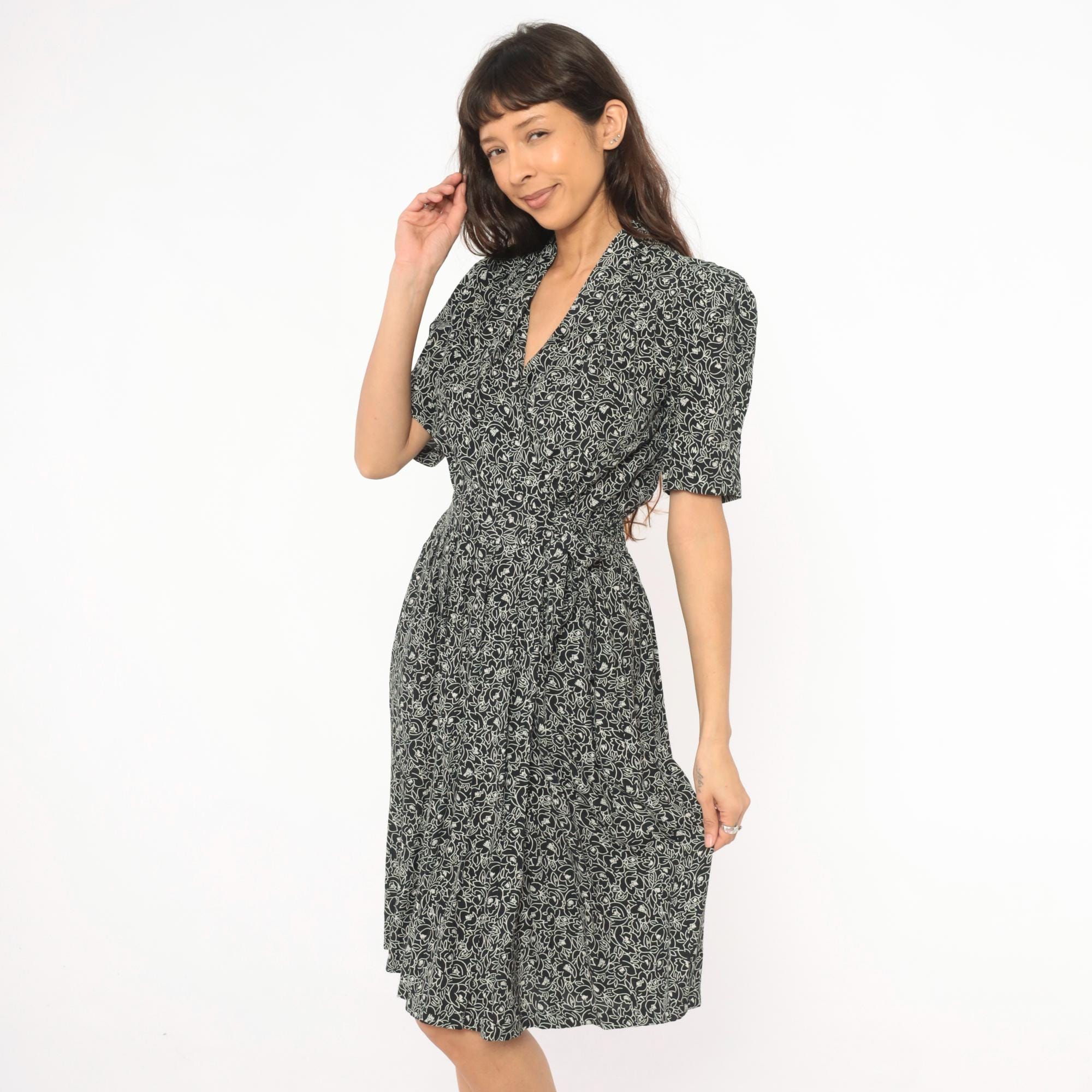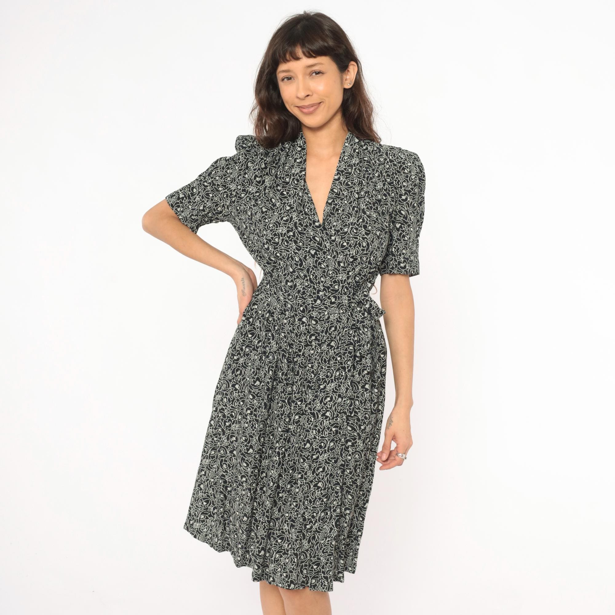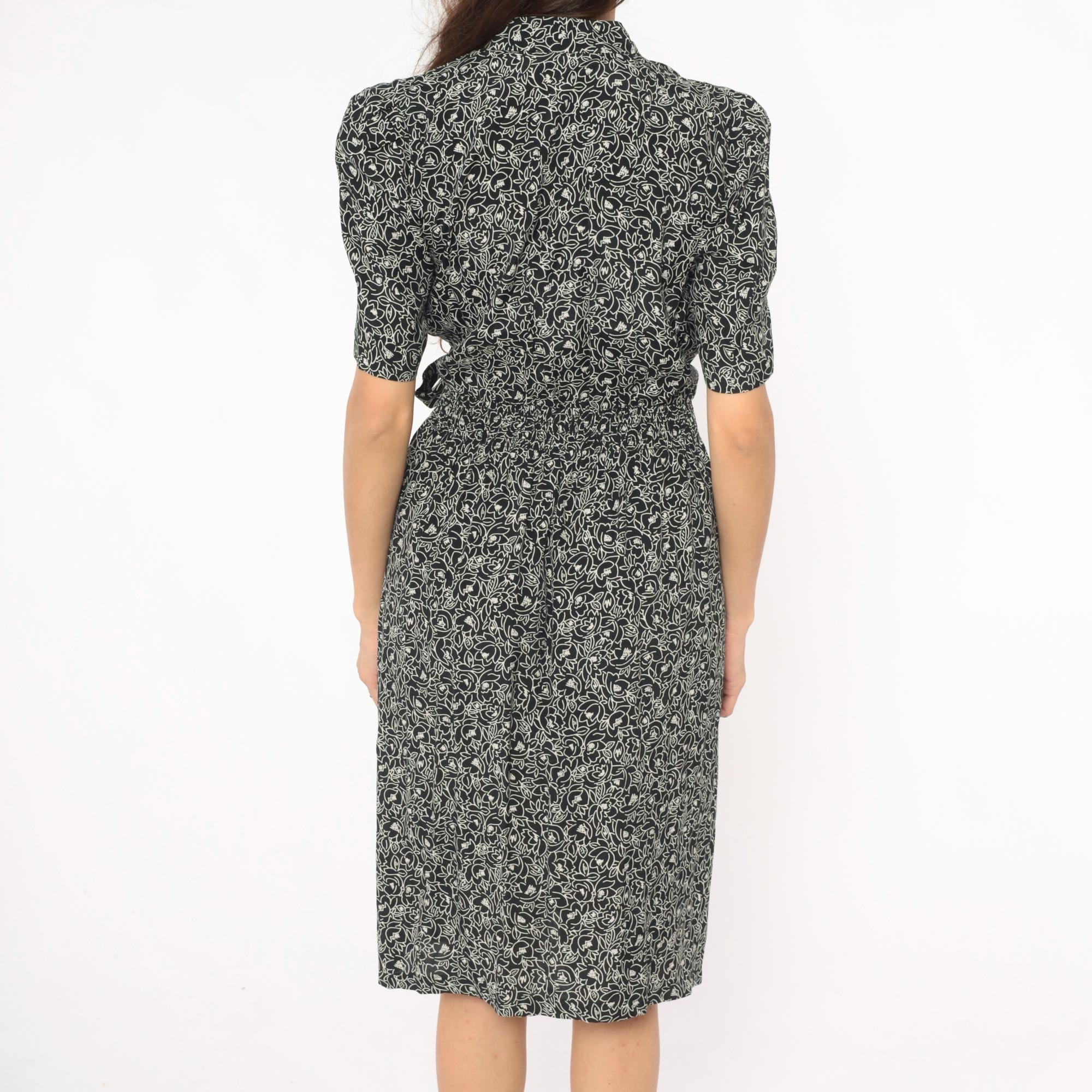 90s black and cream floral wrap dress from Karin Stevens with an allover abstract flower and leaf print. Shawl collar, V neckline, puff sleeves with elasticized cuffs, and a fitted bodice with smocked elastic panel at the back waist.