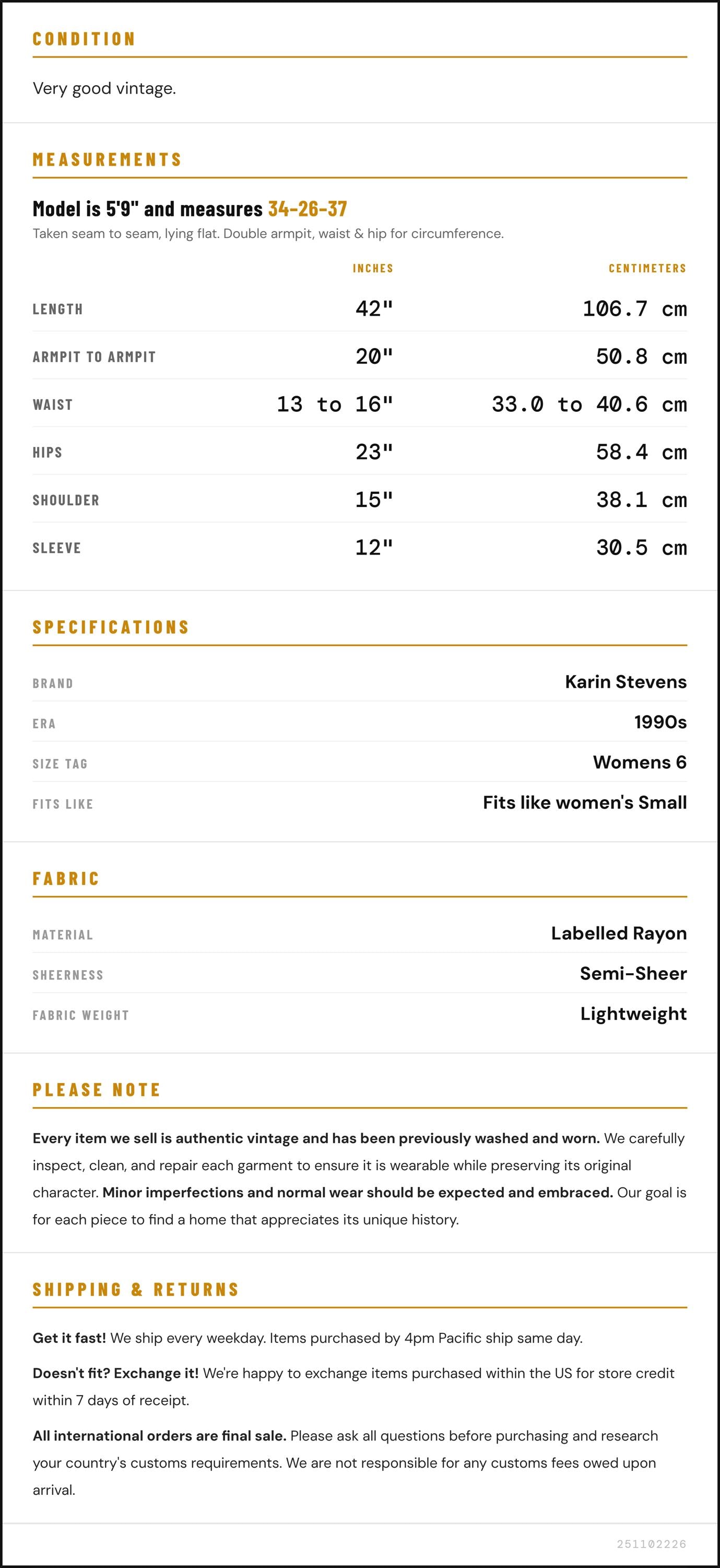 Taken from seam to seam while the garment is lying flat. Double the armpit, waist, and hip measurements.