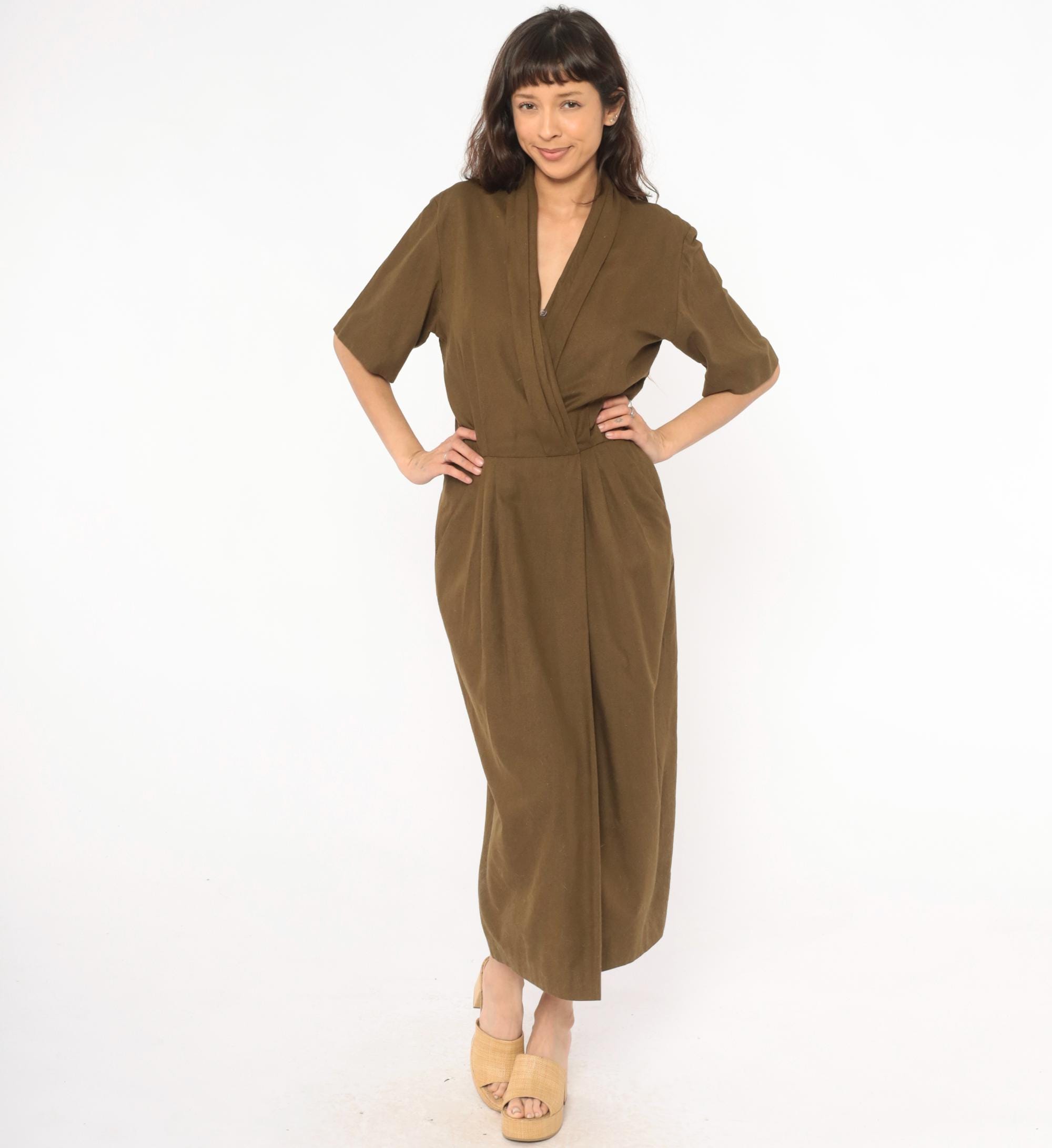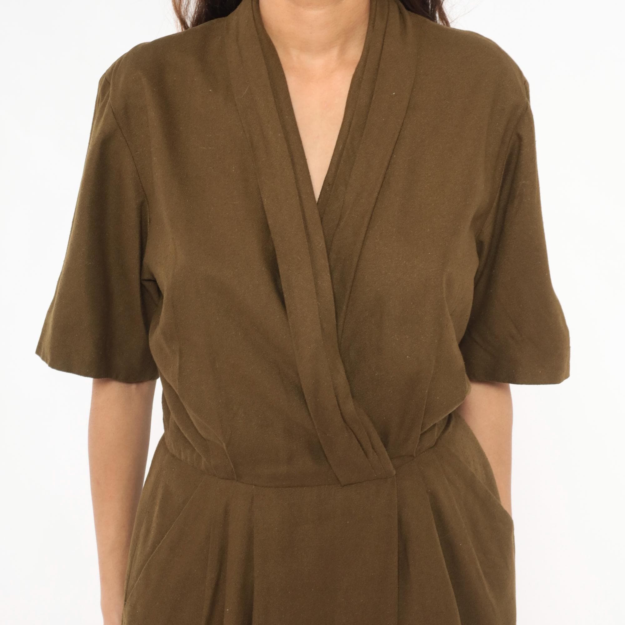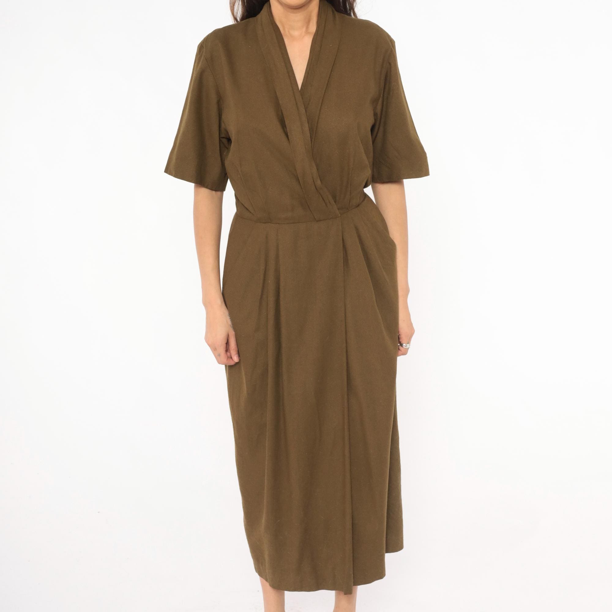 80s olive wrap-style dress from Liz Claiborne with a deep surplice neckline and shawl collar. Short sleeves with a defined waist and front pleating into a straight skirt with side seam pockets. Army green tone with a knubby texture throughout.