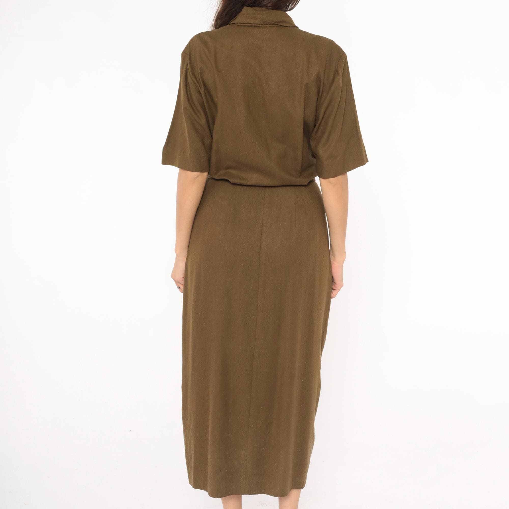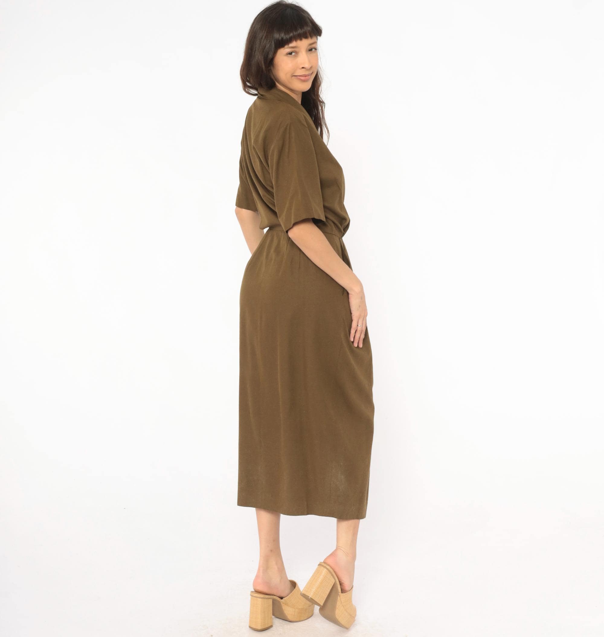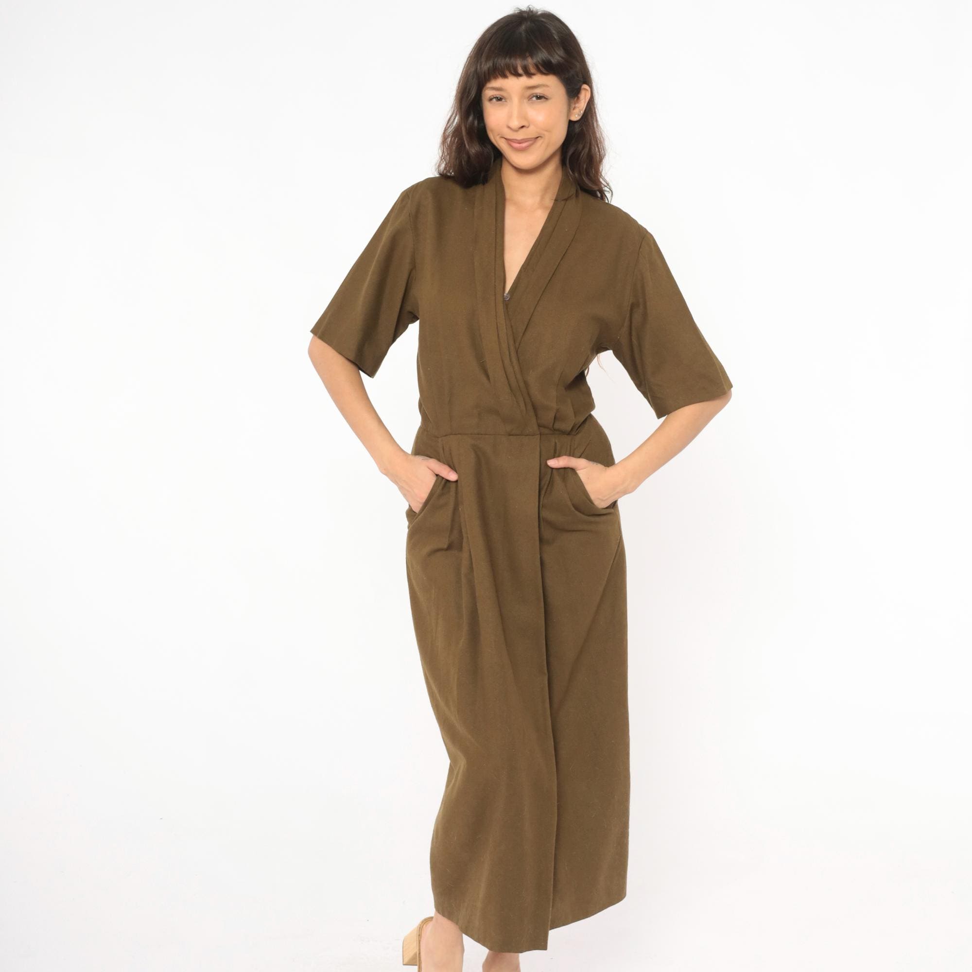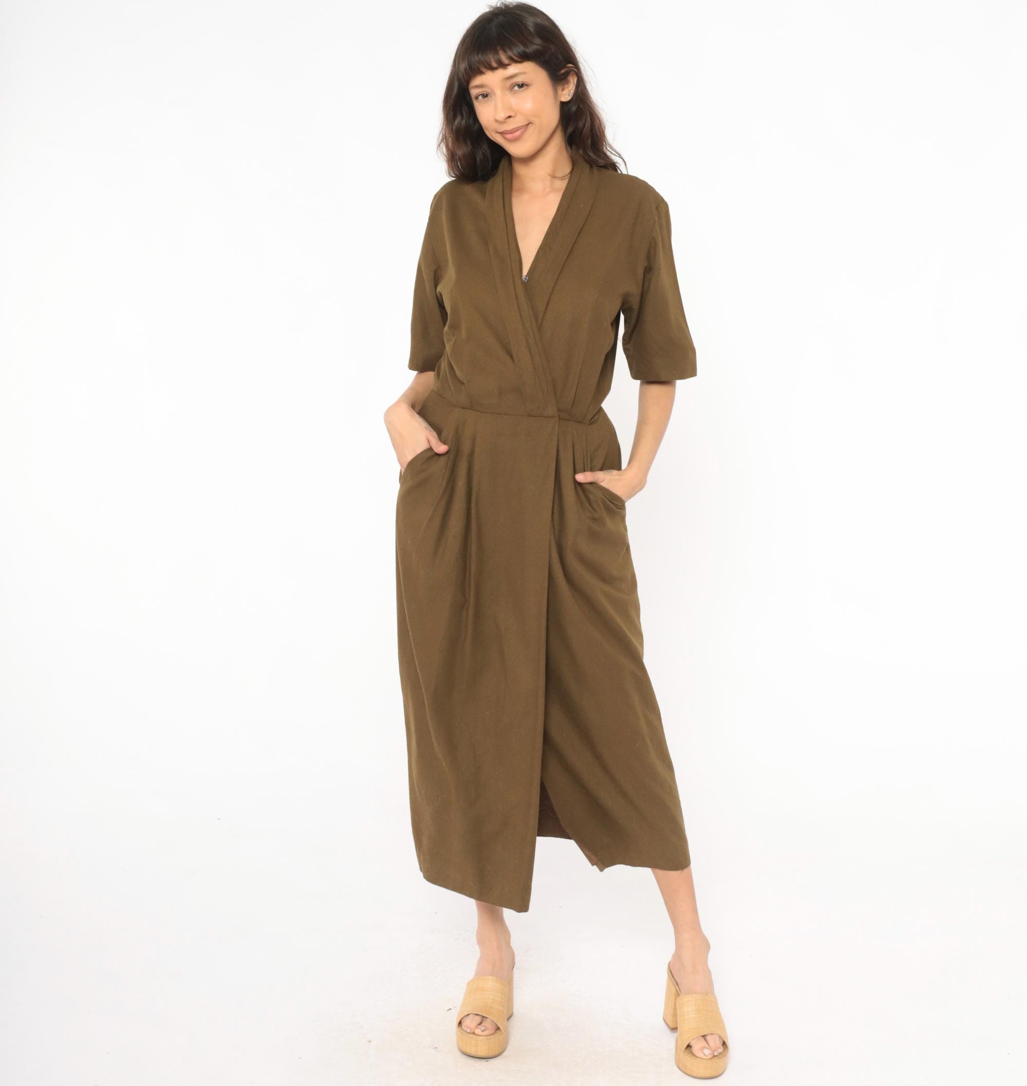 80s olive wrap-style dress from Liz Claiborne with a deep surplice neckline and shawl collar. Short sleeves with a defined waist and front pleating into a straight skirt with side seam pockets. Army green tone with a knubby texture throughout.