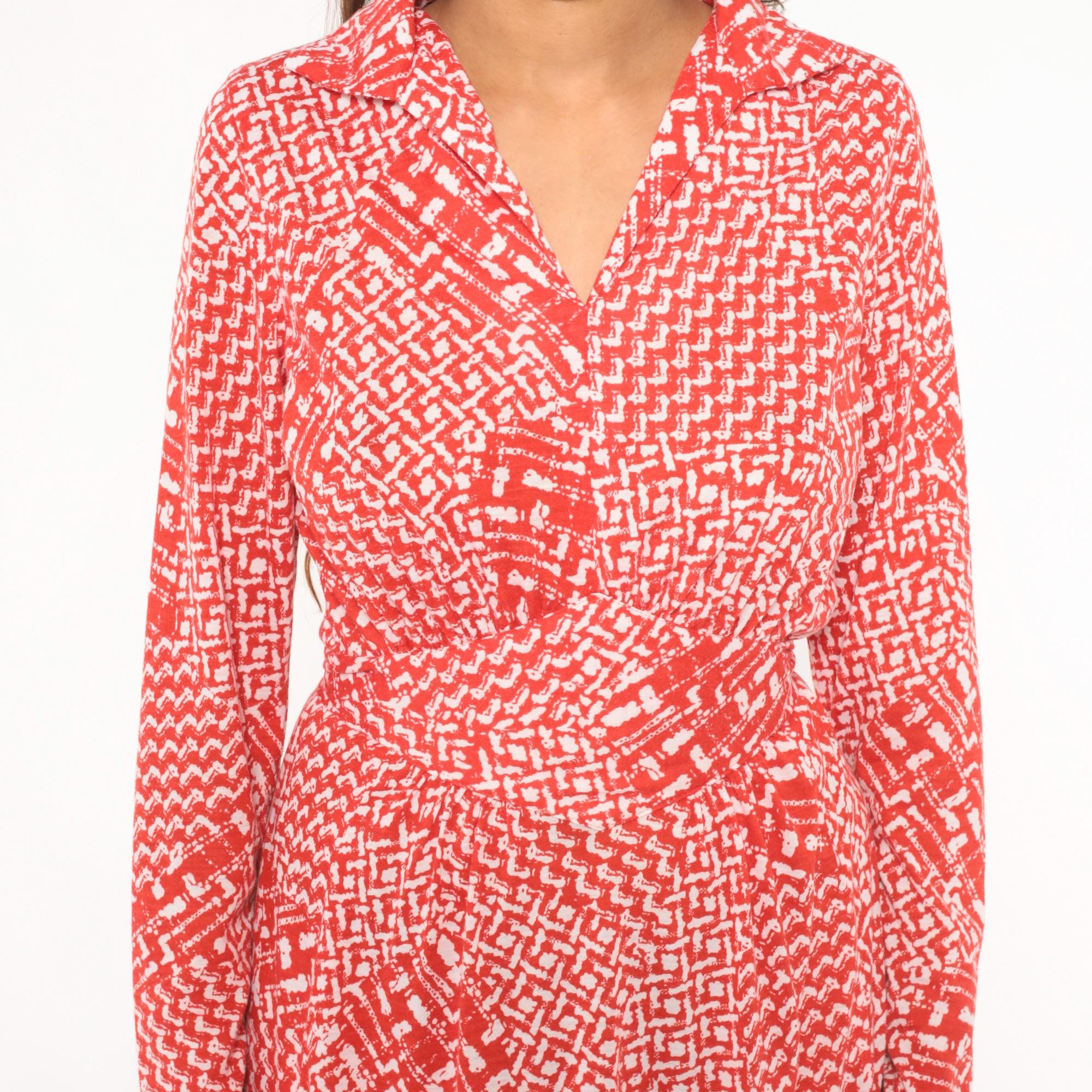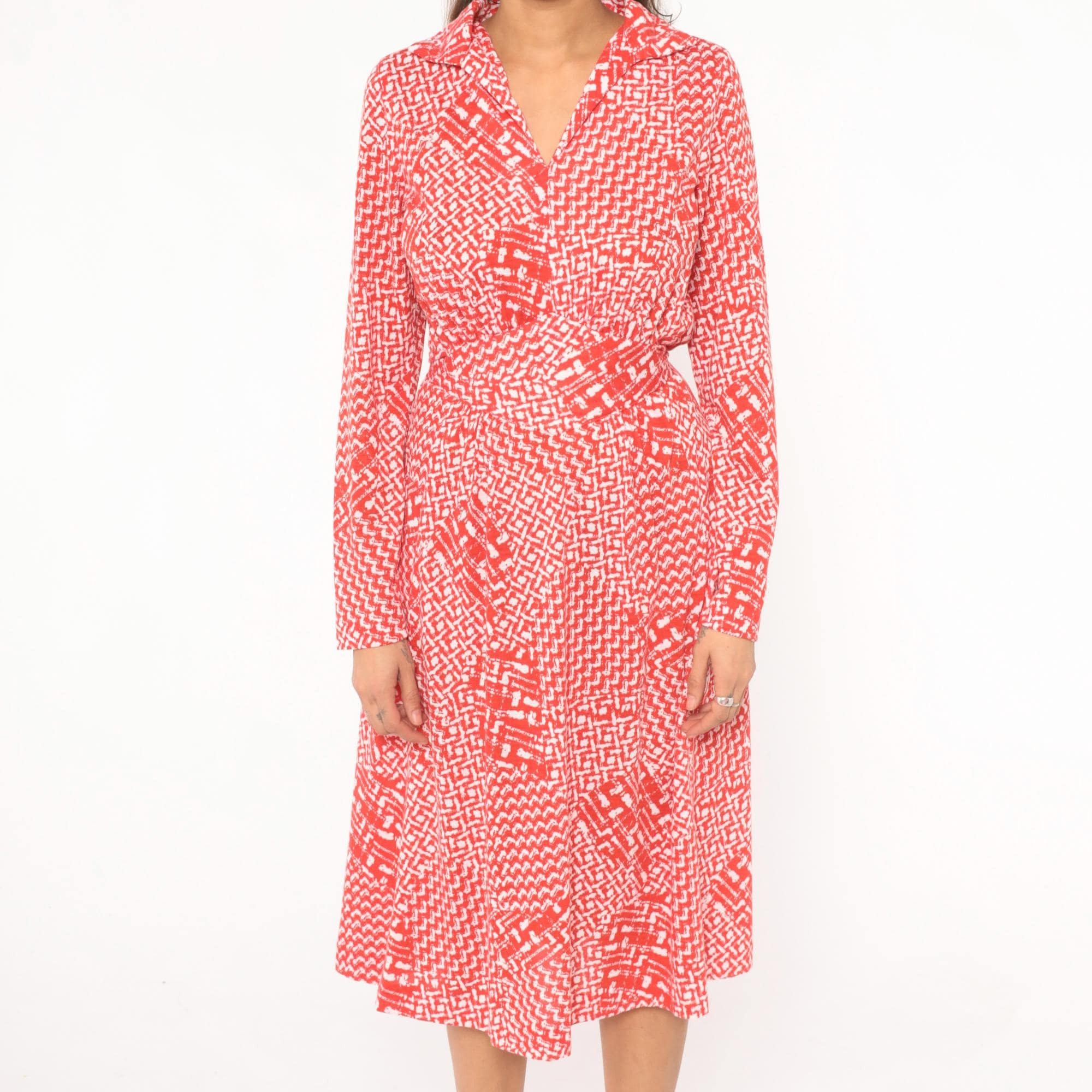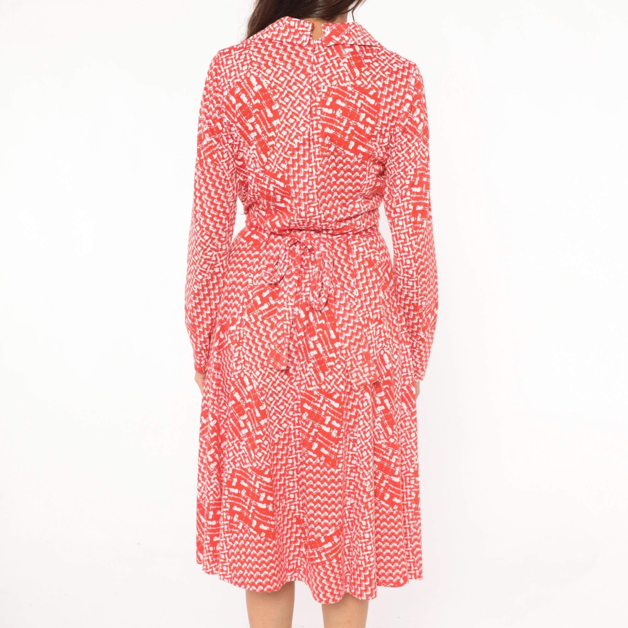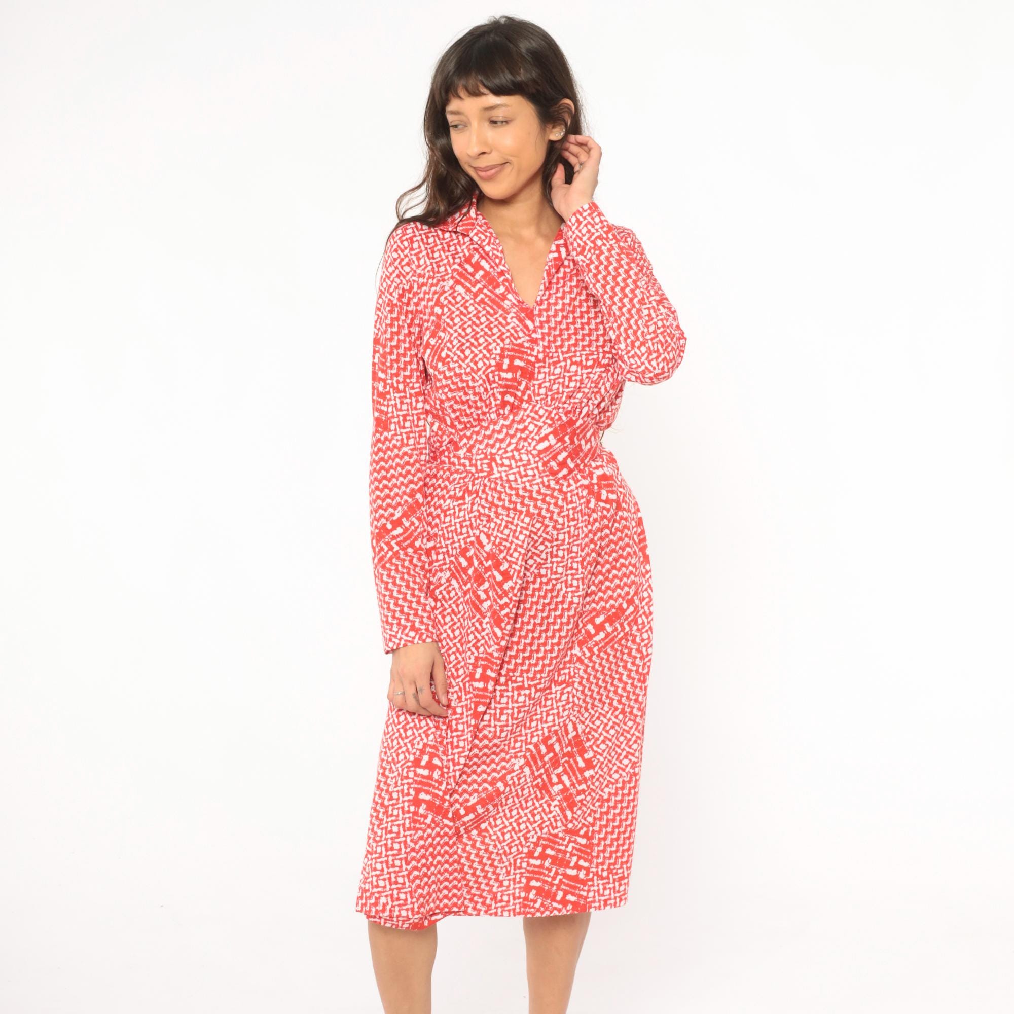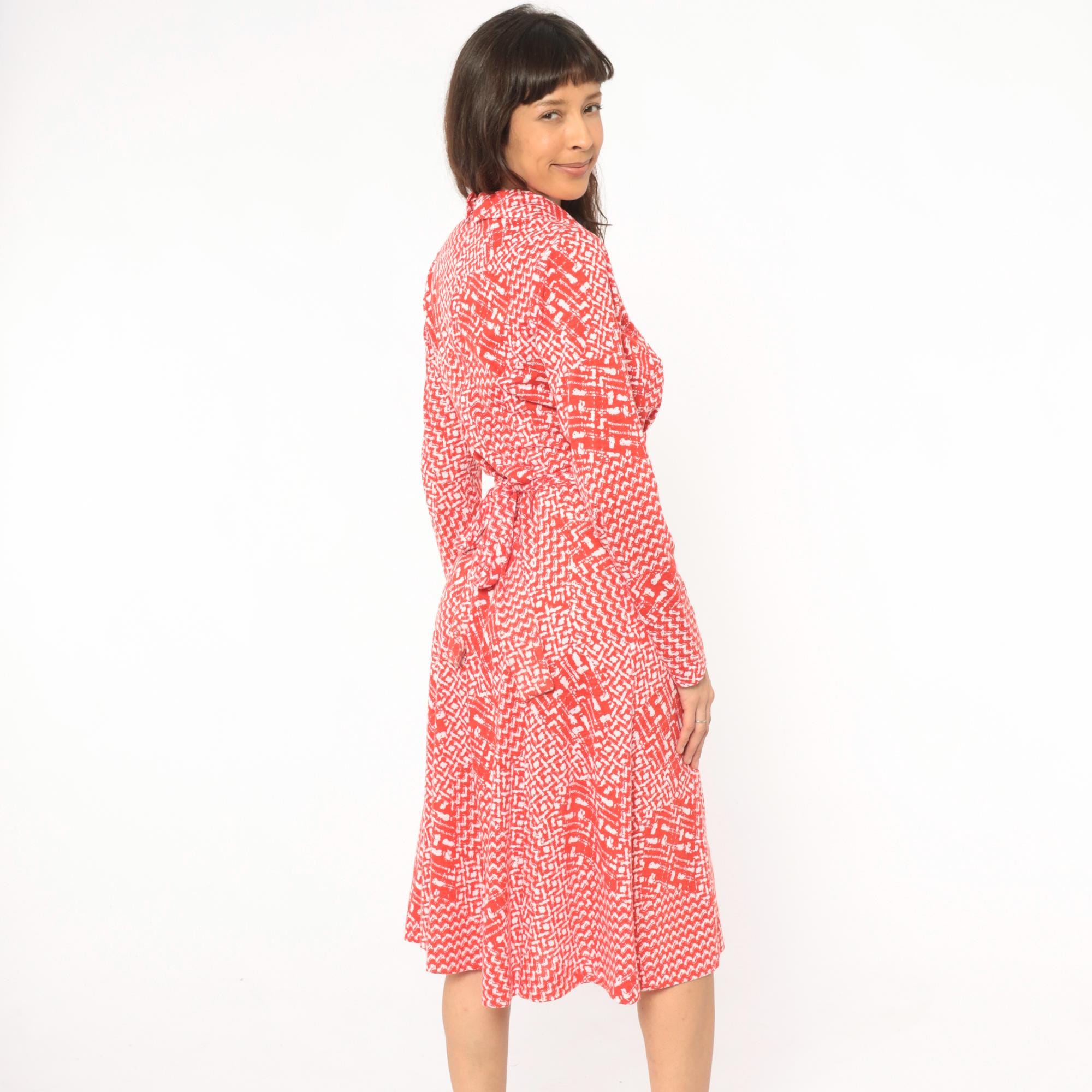 80s red and white wrap dress from Tall Shop with an abstract geometric print throughout. Notched collar, V neckline, long sleeves, and a self-tie belt at the waist. Wrap front bodice with a flared A-line skirt falling to knee length.