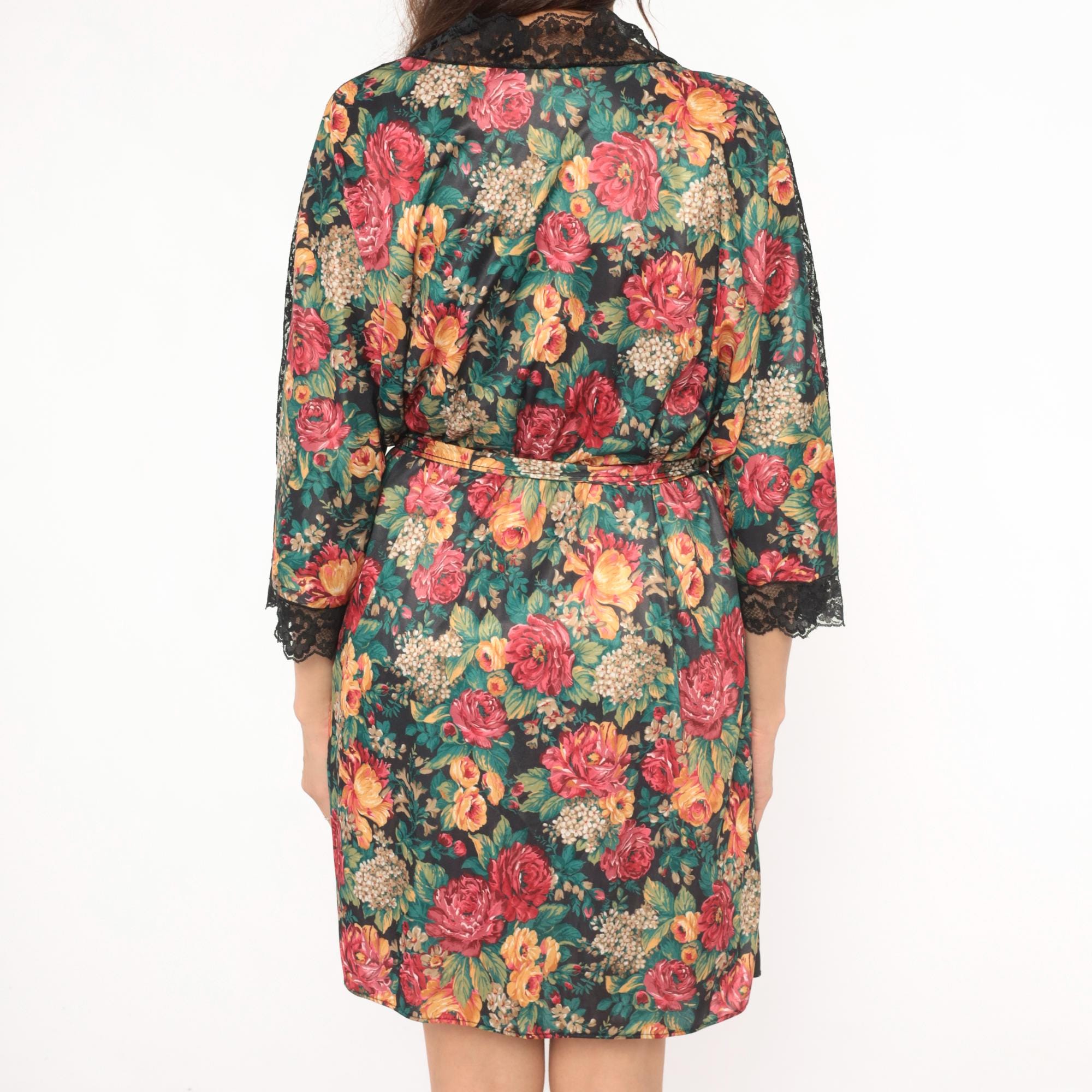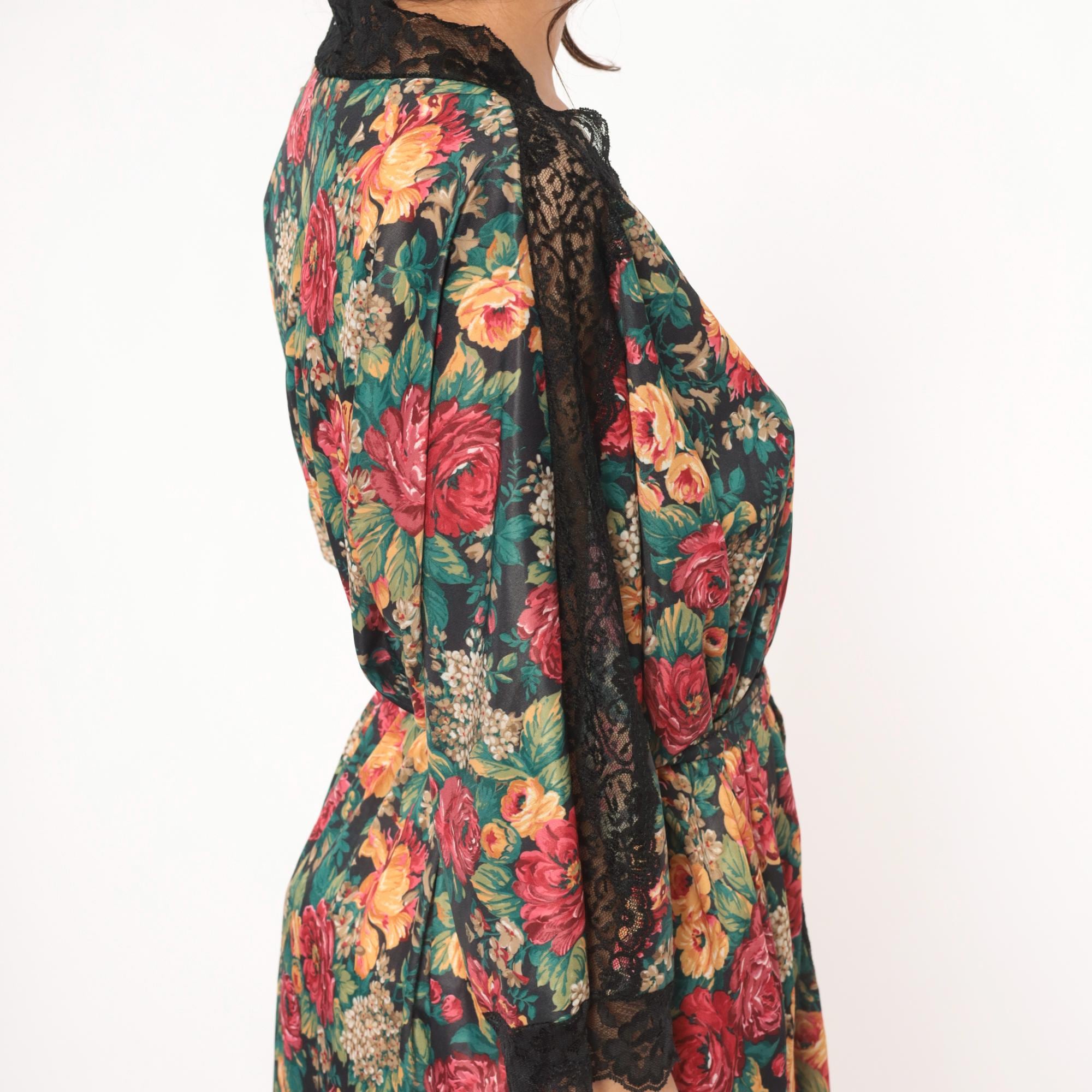 90s floral wrap robe from Sopre Lingerie with a dark background and large rose print in red, pink, gold, and green. Black lace panels along the V-neckline, center front, shoulder seams, and three-quarter sleeve cuffs with scalloped edges.