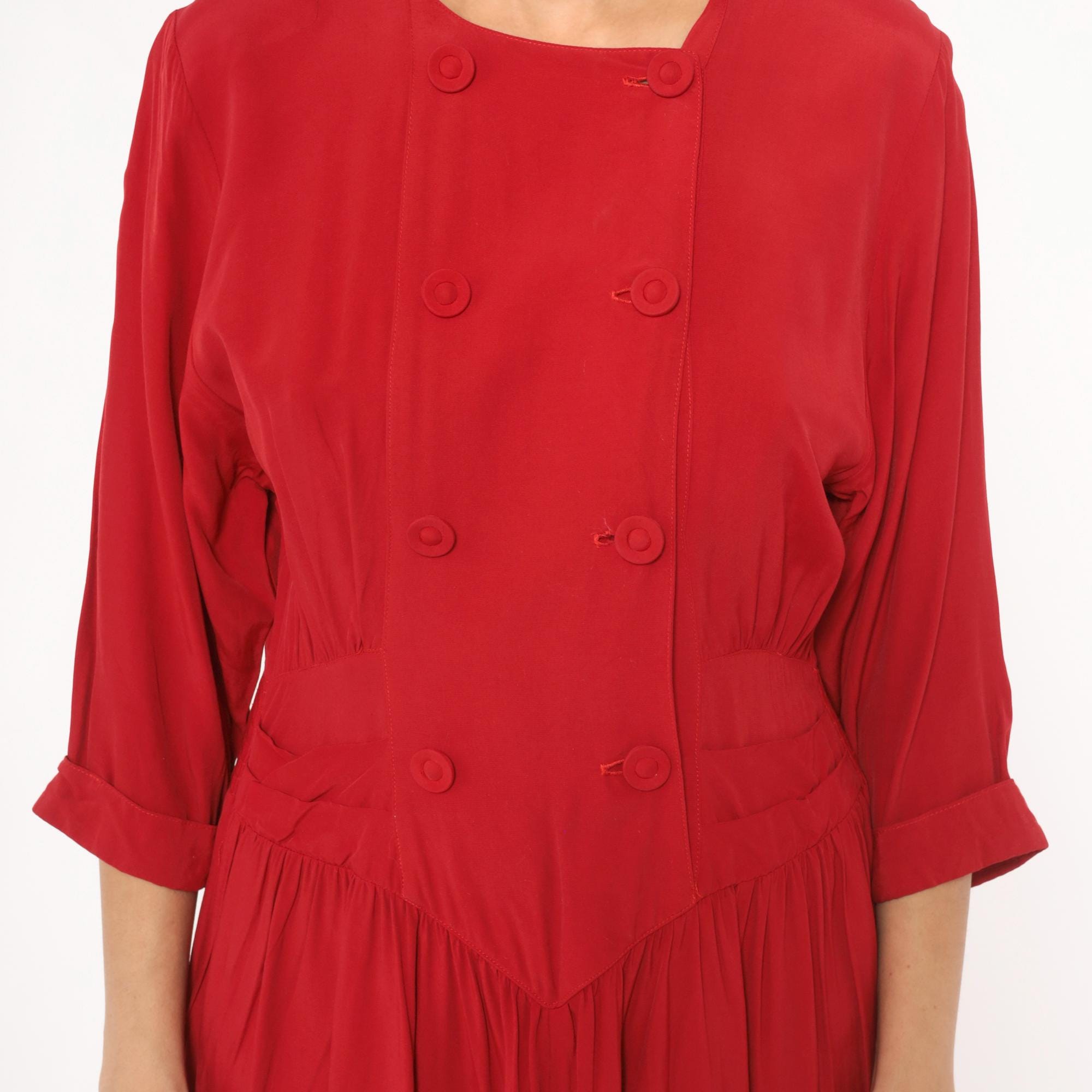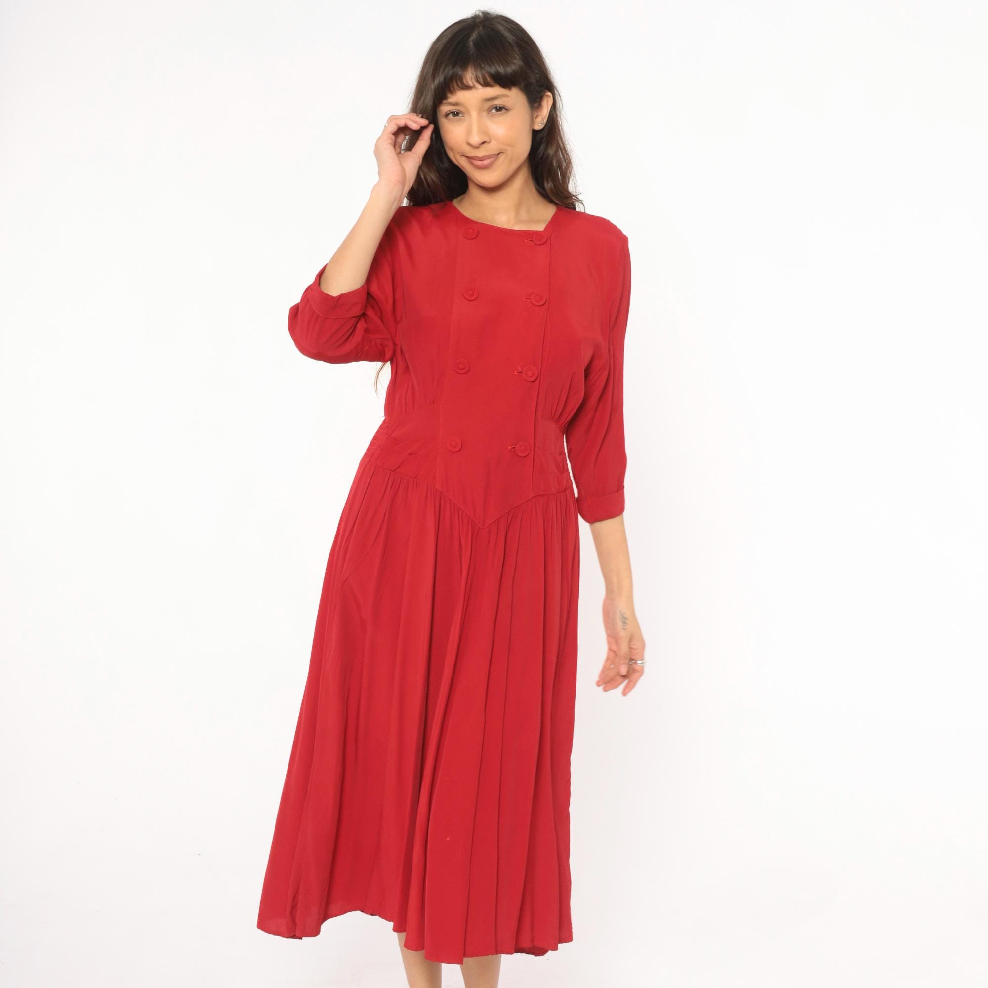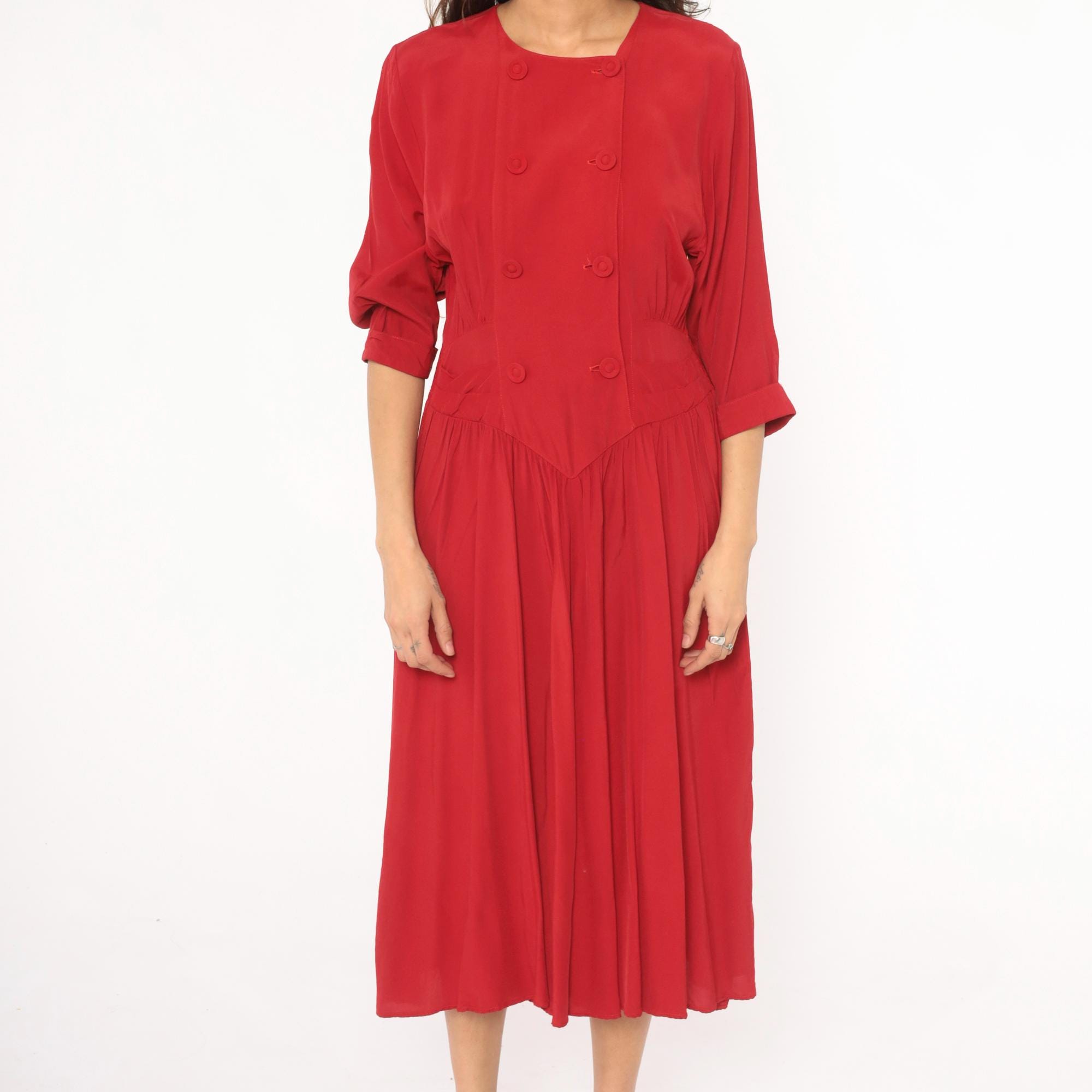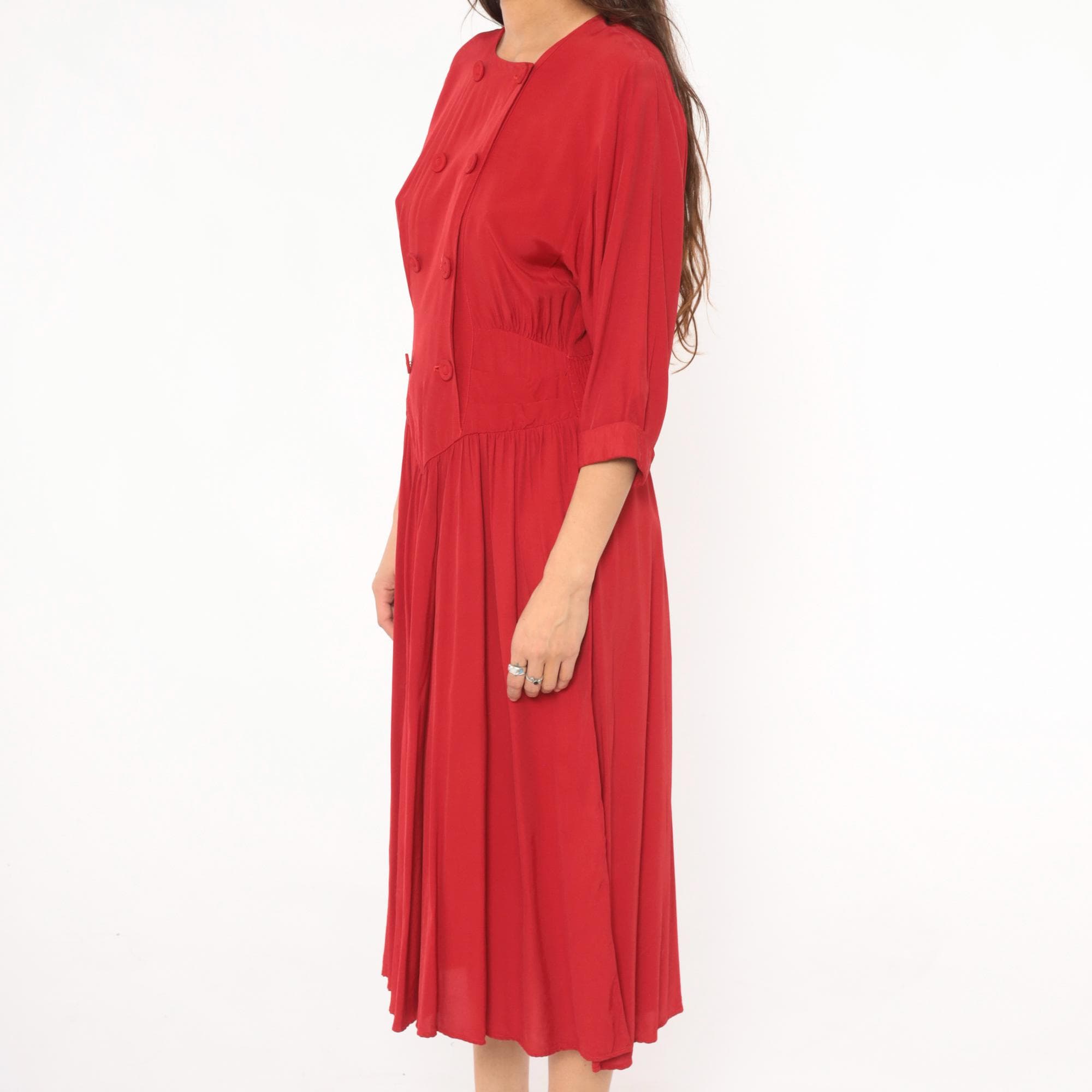 80s crimson double breasted dress from Piccolino Petites with round collarless neckline and two rows of fabric-covered buttons down the front. Fitted bodice with a pointed chevron waistline, smocked elastic back waist, and gathered full skirt falling to mid-calf.